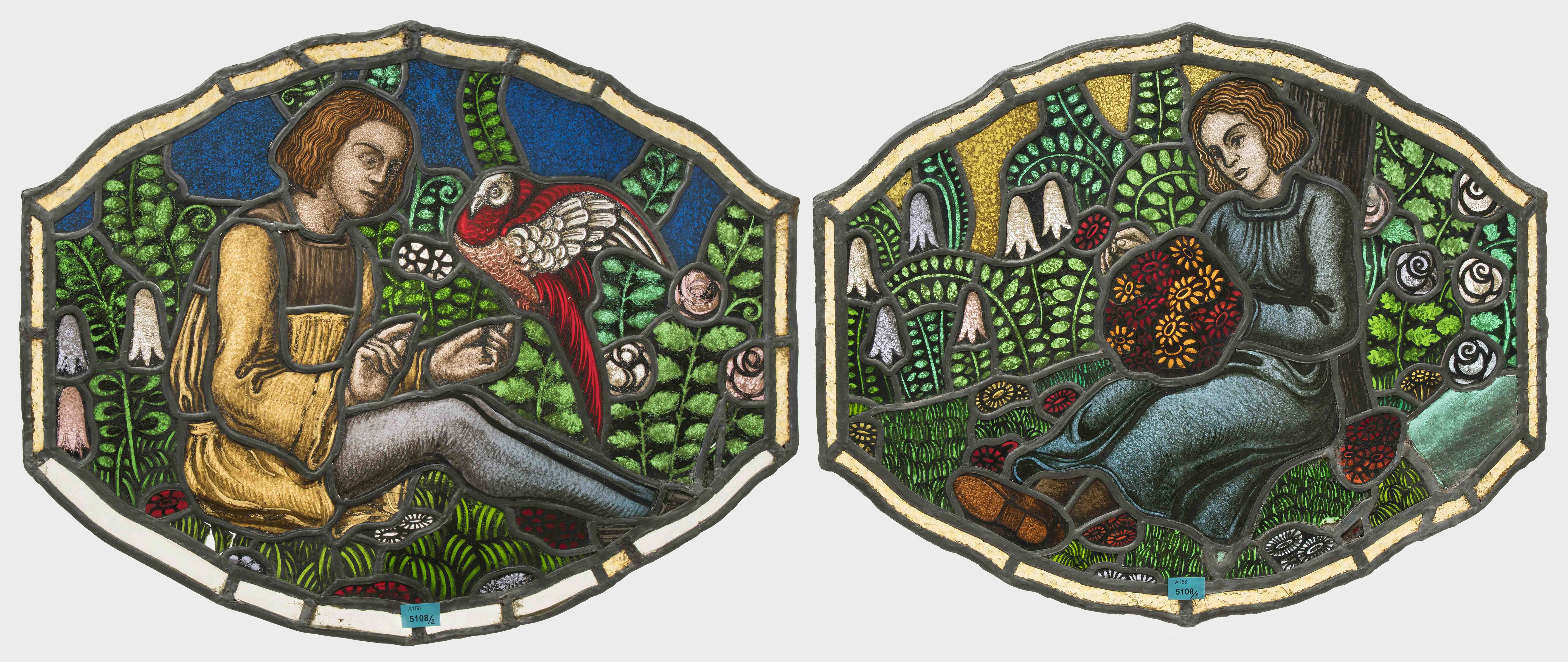 Hans Sandreuter (1850–1901), zugeschrieben. Glas polychrom bemalt und geätzt. In Bleifassung. Darstellung eines Mädchens mit Blumenstrauss bzw. eines Jungen mit Vogel. 49,5x40 cm.