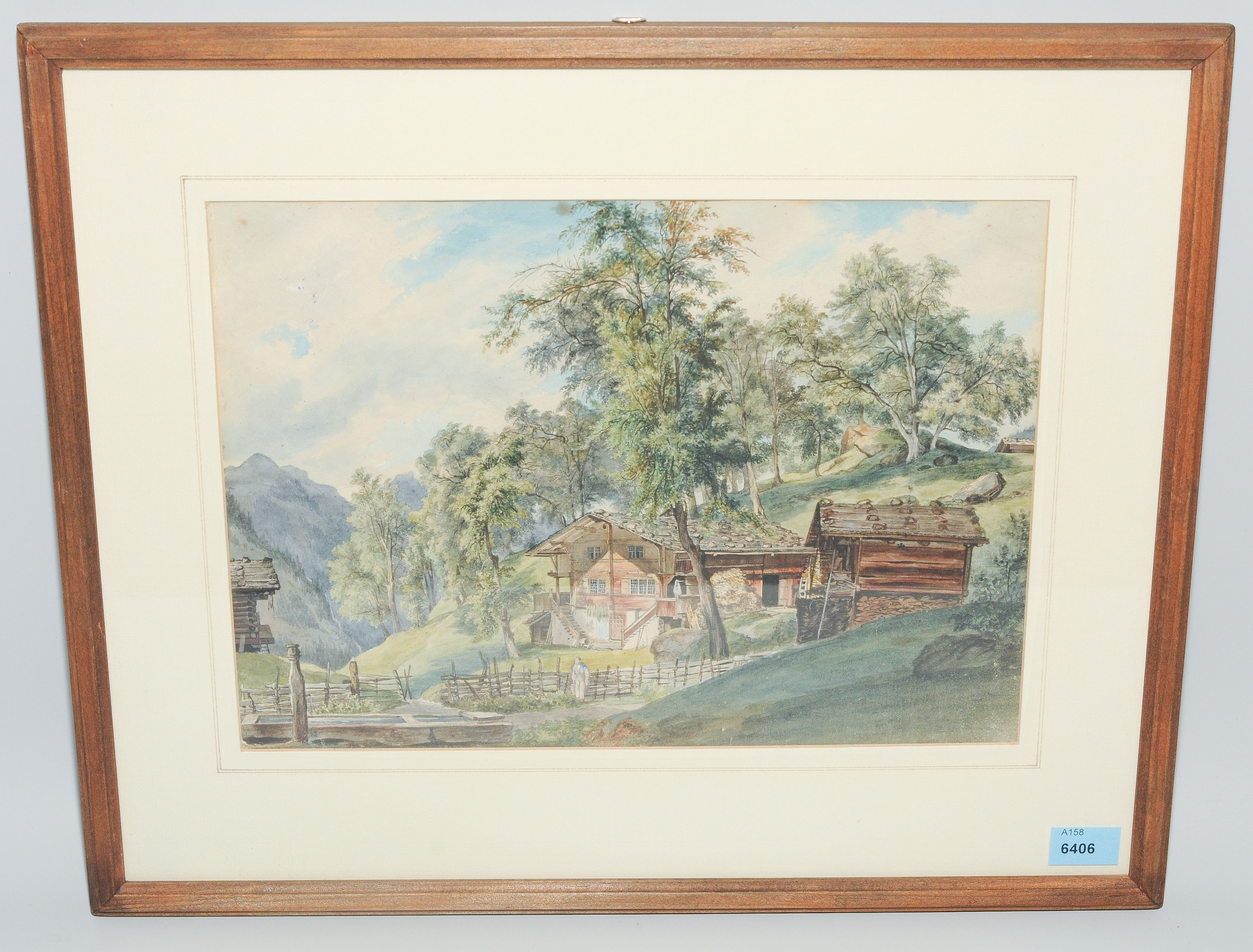 Landschaft bei Wengen. Aquarell von Johann Jakob Falkeisen, um 1830. 19,2x27 cm. Gerahmt.