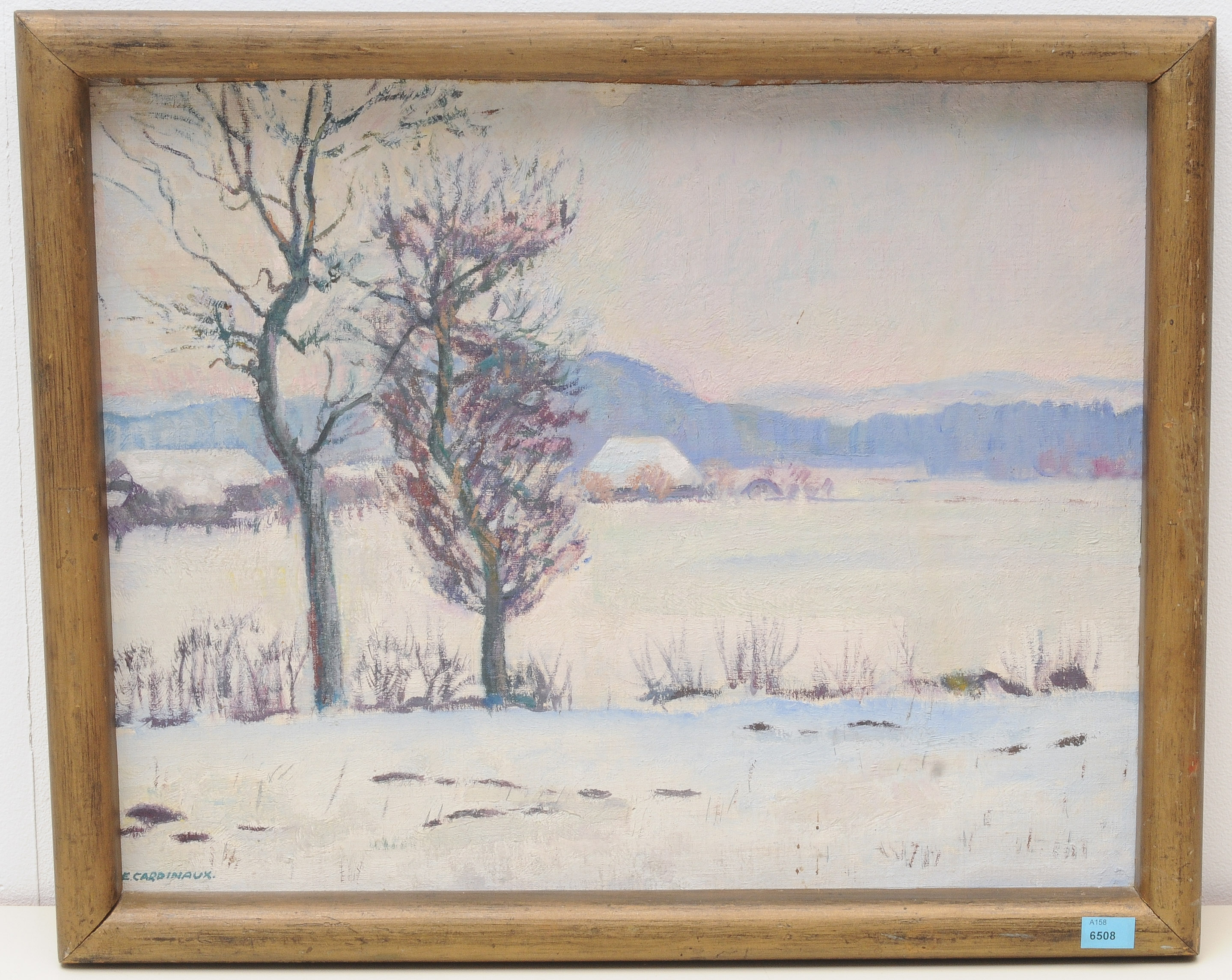 "Kleine Schneelandschaft". Öl auf Leinwand über Karton. Unten links signiert, verso auf Ausstellungsetikett bezeichnet. 39x49,5 cm.