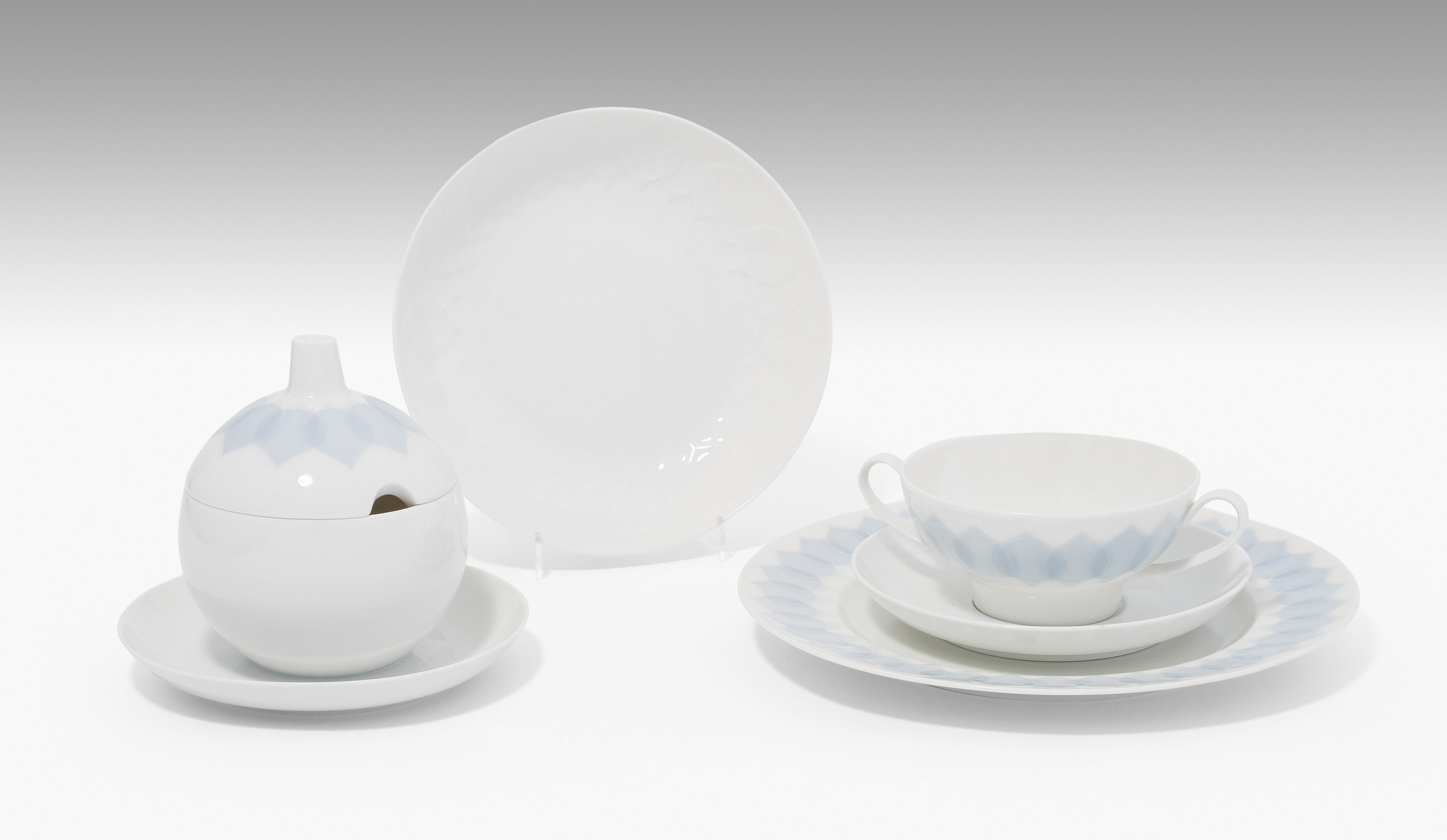 Studio-Linie. Entwurf: Björn Wiinblad. Ausformung seit 1968. Porzellan, Form "Lotus", hellblaue Unterglasurbemalung. Bezeichnet. Bestand: 12 Fleischteller (D 25 cm), 12 Suppentassen mit U'tassen, 12 Suppenteller weiss (D 20 cm), 12 Dessertteller (D 19 cm), 1 Schüssel, 1 runde Platte, 3 ovale Platten. Total ca. 53 Teile.