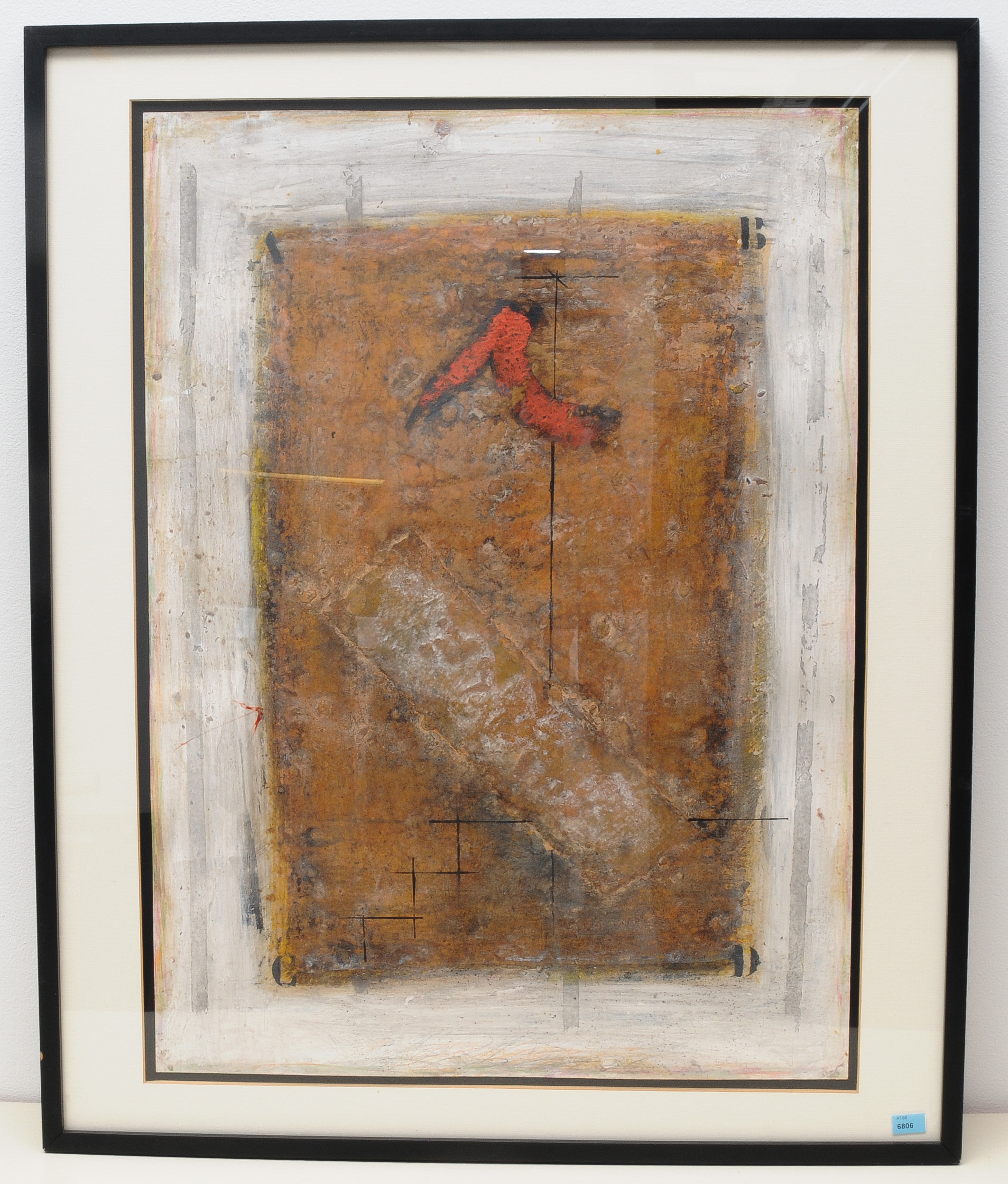 "Le signe rouge". Mischtechnik auf Papier. Unten links signiert. Blattgrösse 72x52 cm. Gerahmt.