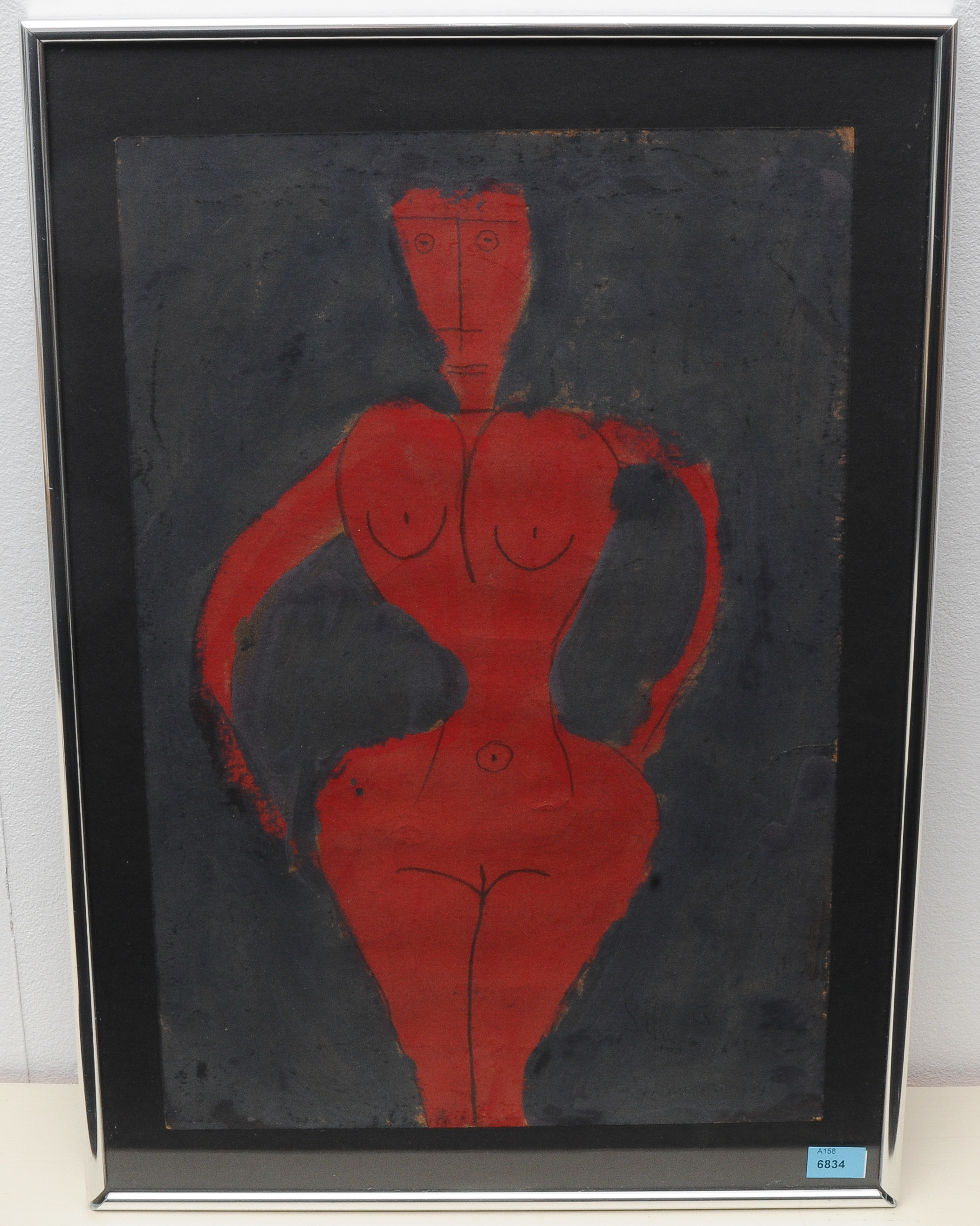 Weiblicher Akt in Rot. 1969. Aquarell und Bleistift auf Papier. Unten rechts signiert und datiert. Blattgrösse 42,2x28,5 cm. Gerahmt.