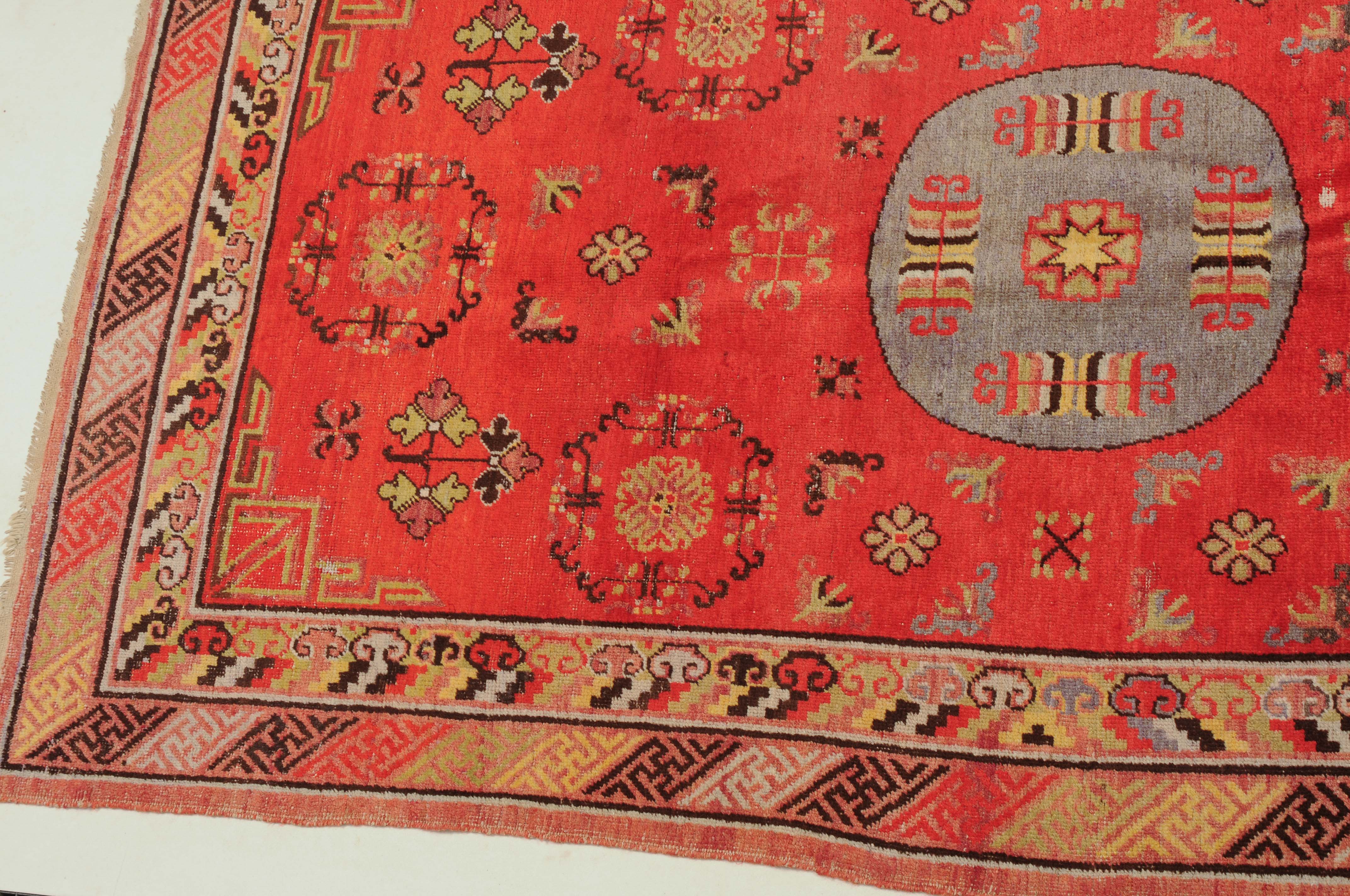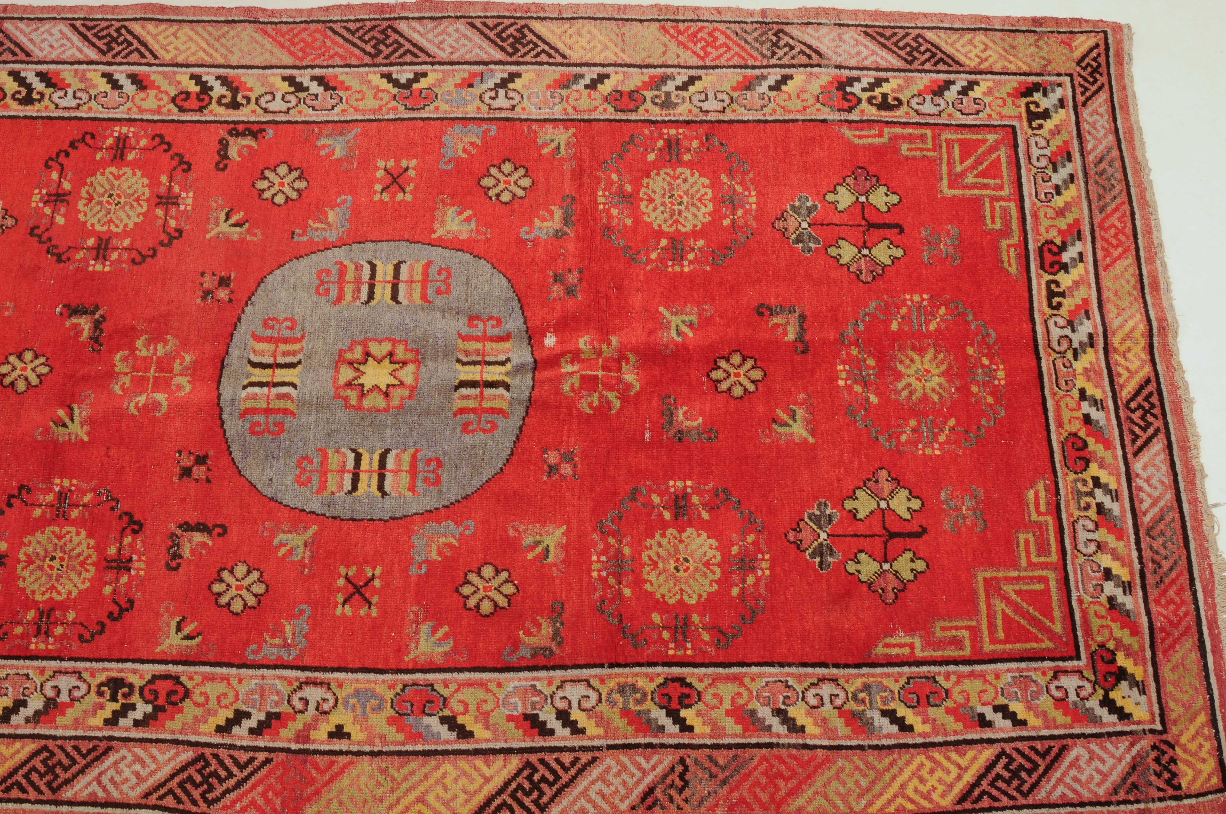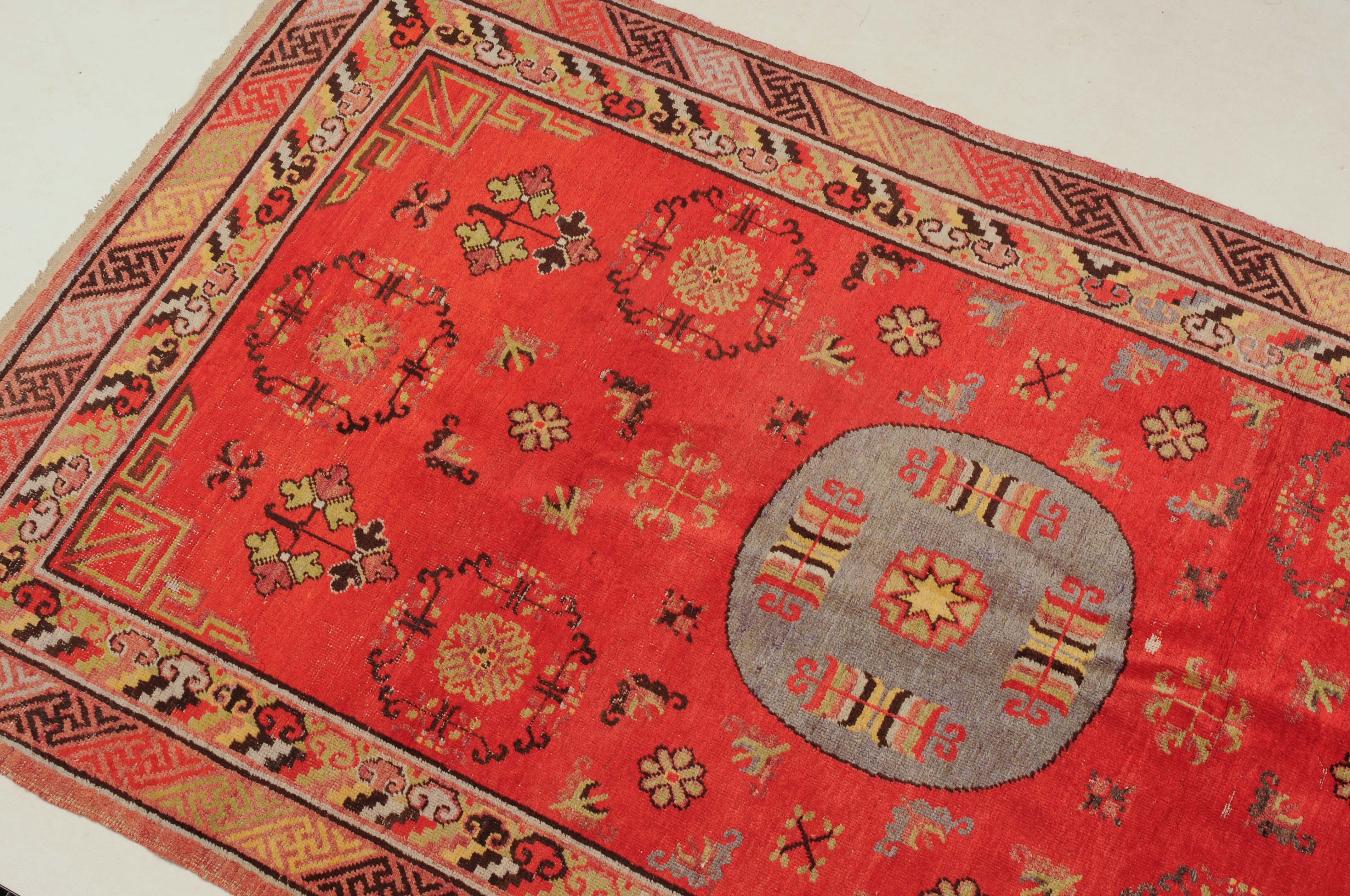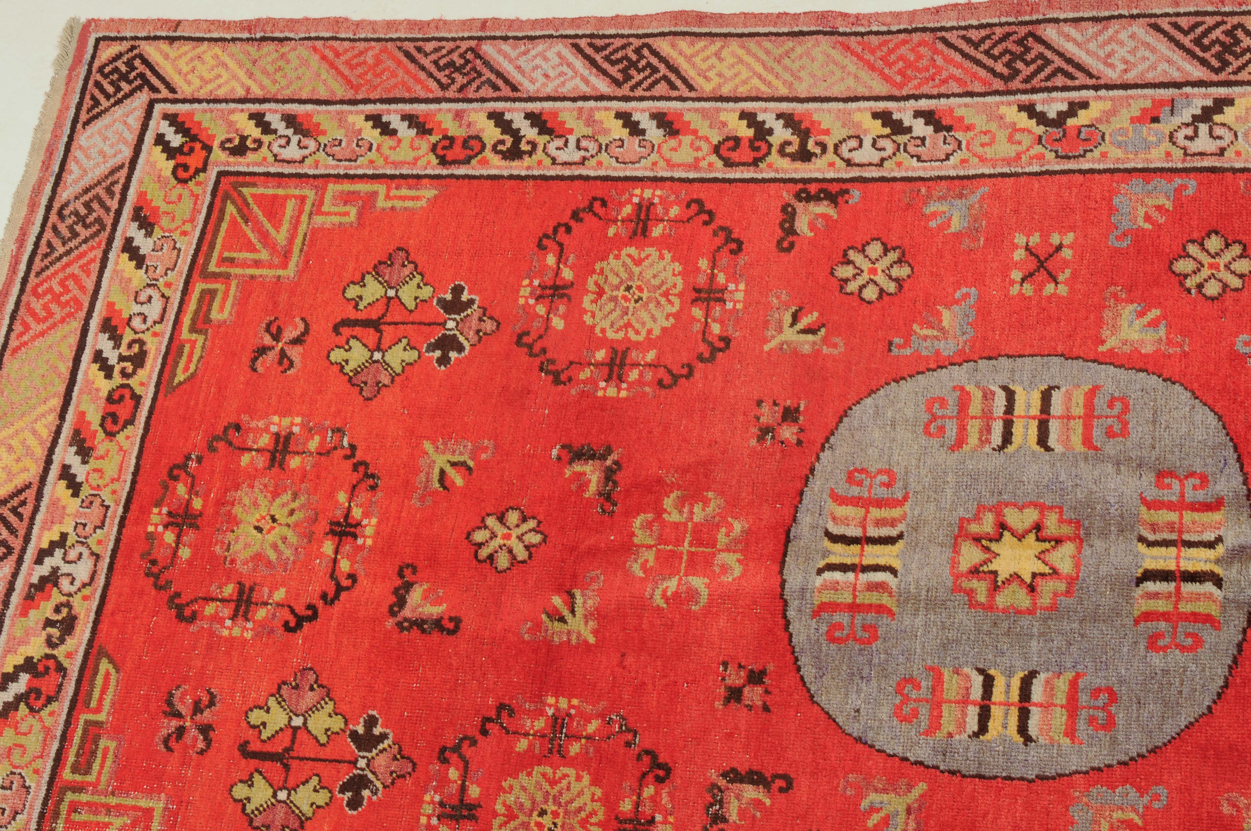 O-Turkestan, um 1930. Im orangen Mittelfeld liegt ein charakteristisches Khotan-Rund-Medaillon, flankiert von 6 sekundären Medaillons, Blüten, Ranken sowie dekorativen Mäander-Eckzwickeln. Eine Wellenmotiv-Innenbordüre in alternierenden Farben grenzt an die diagonal angelegte Swastika-Bordüre. Gebrauchsspuren. 142x260 cm (ft. 4.7x8.6).