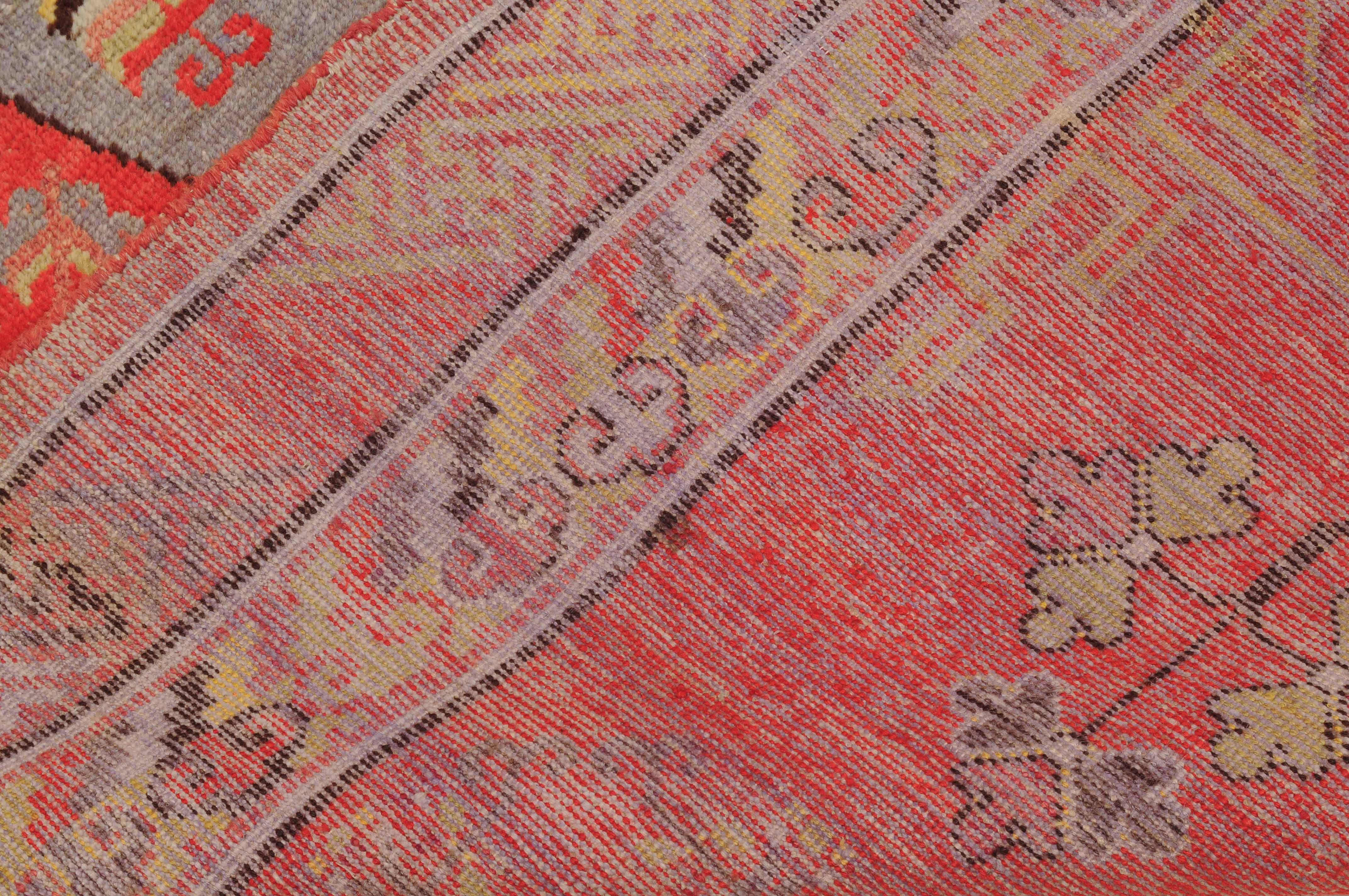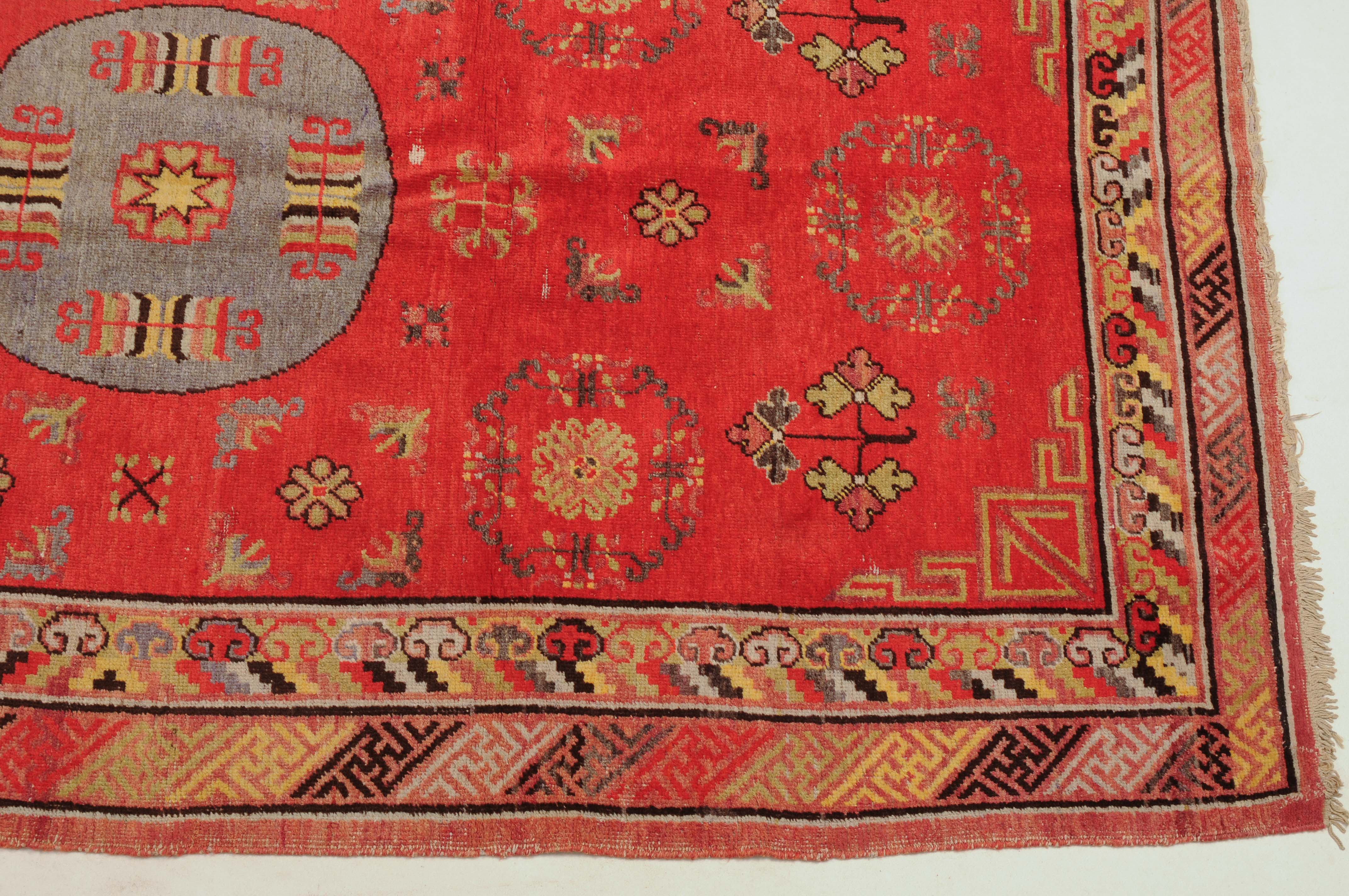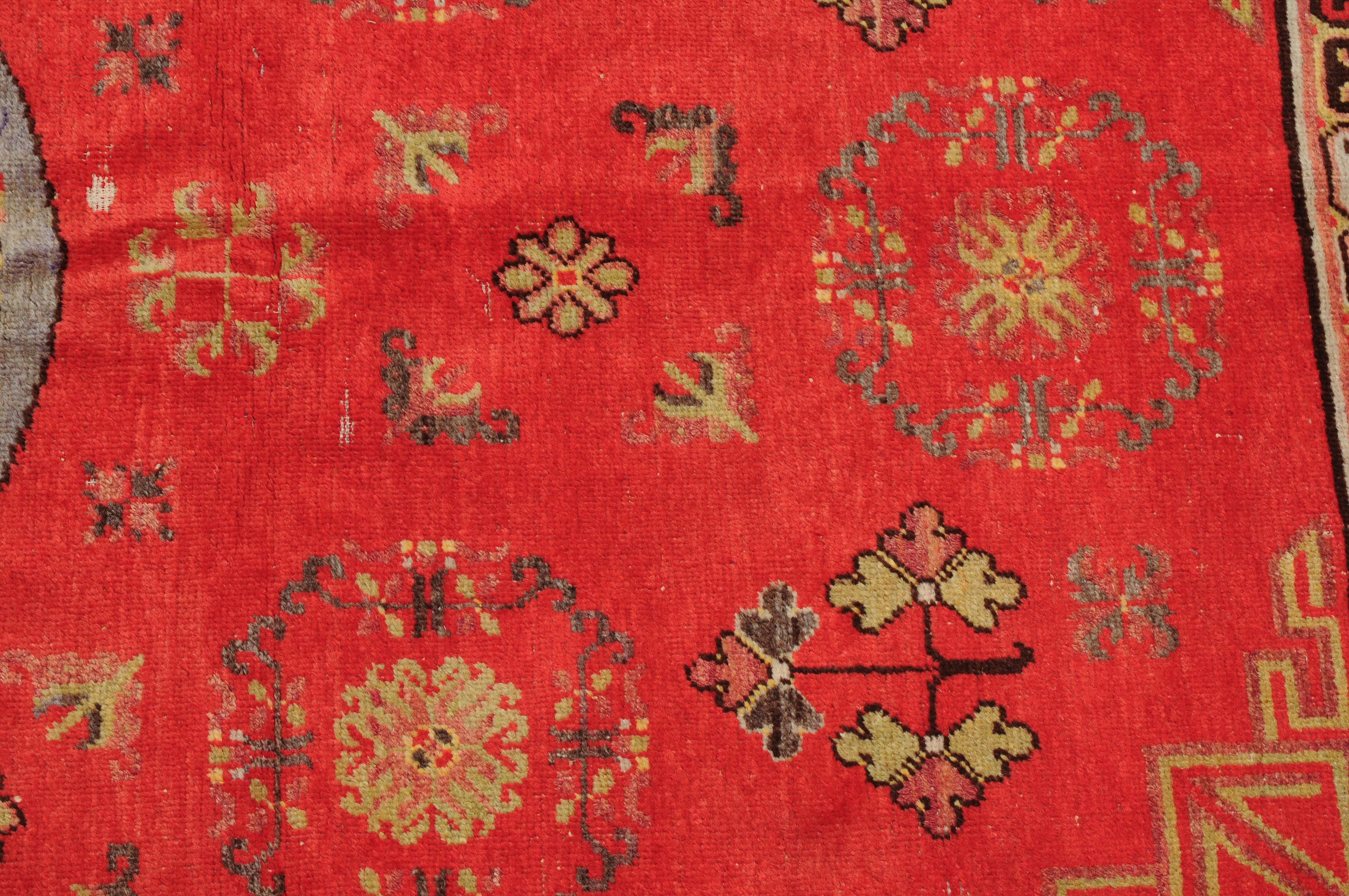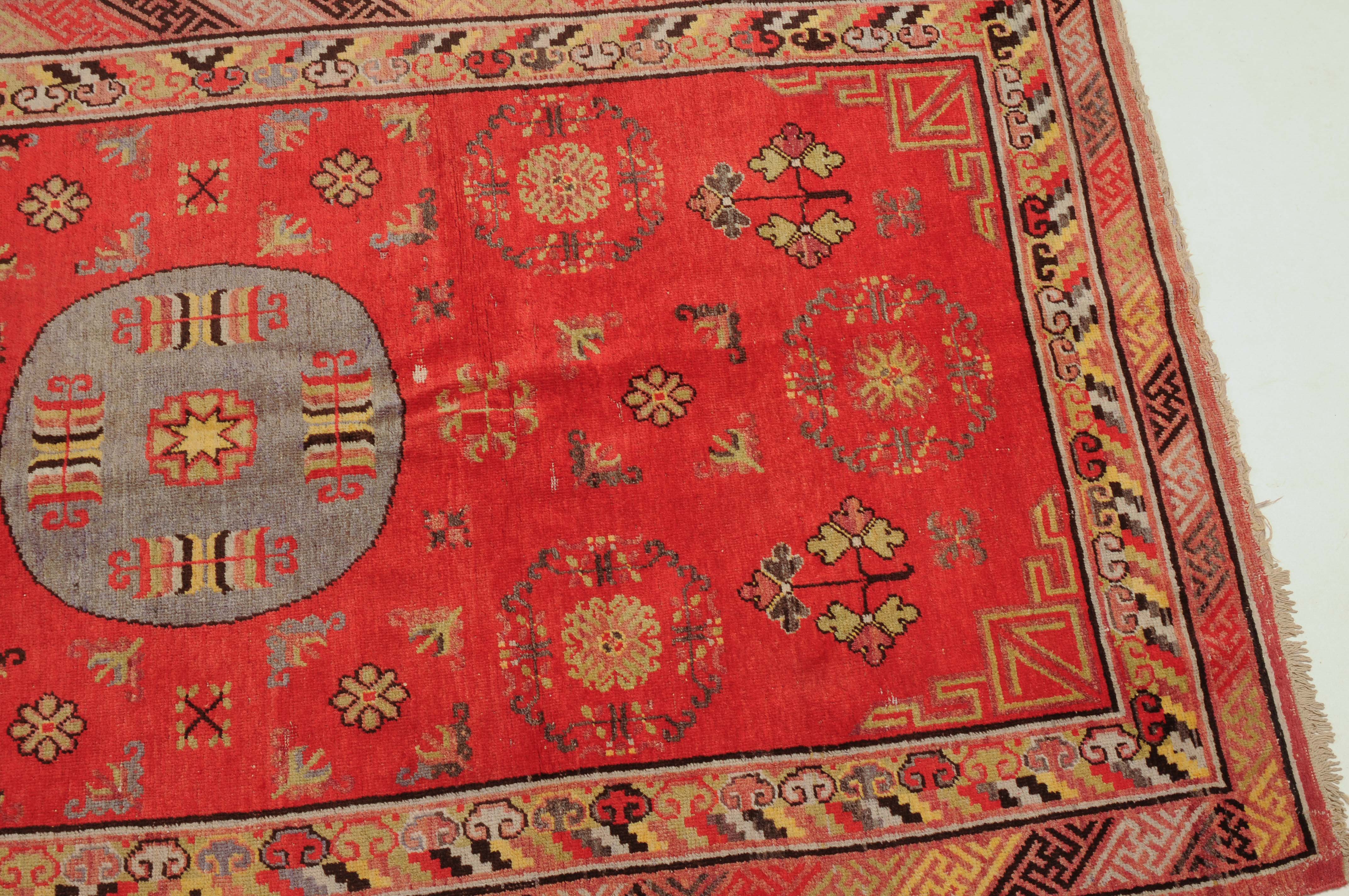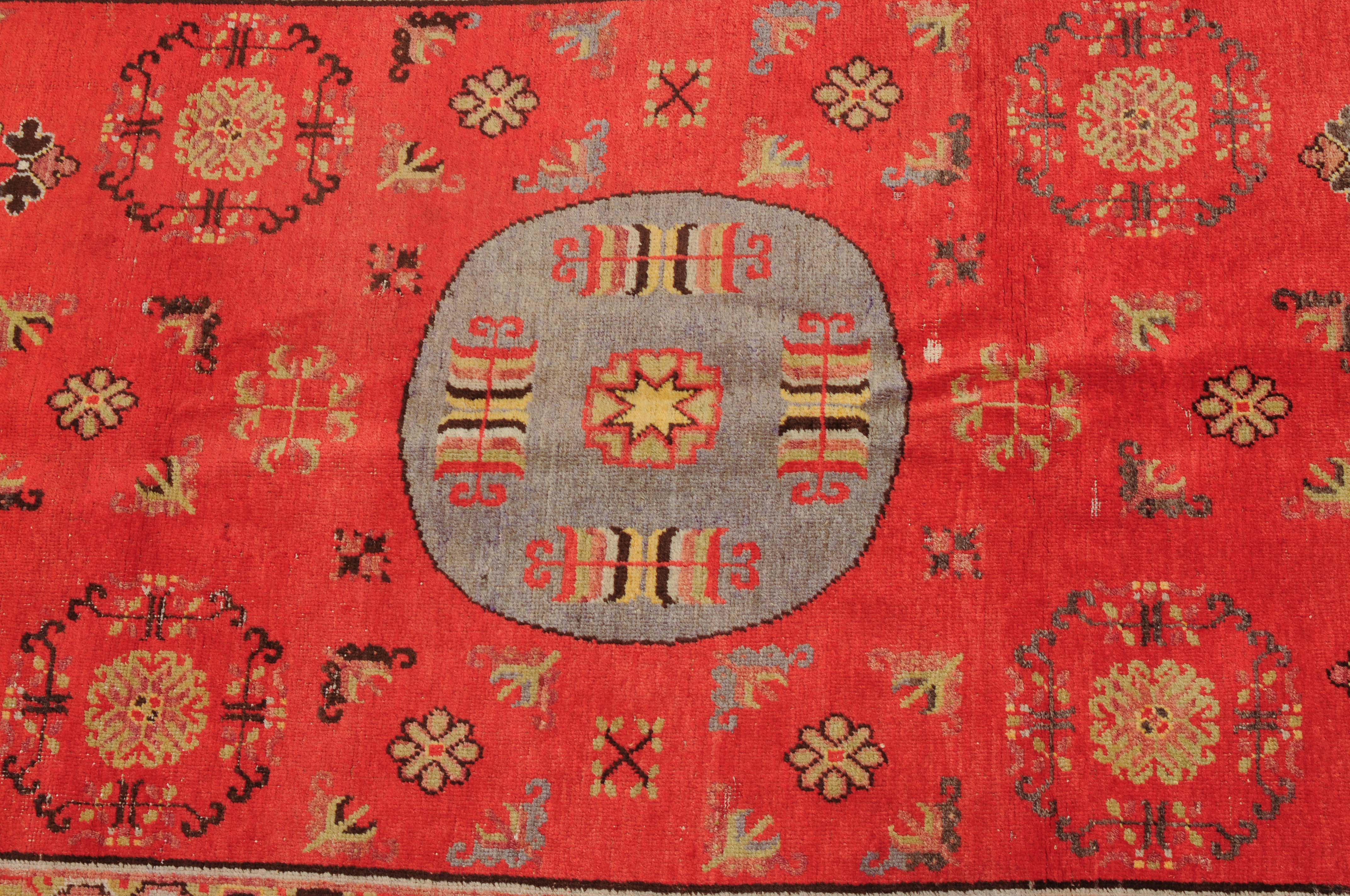O-Turkestan, um 1930. Im orangen Mittelfeld liegt ein charakteristisches Khotan-Rund-Medaillon, flankiert von 6 sekundären Medaillons, Blüten, Ranken sowie dekorativen Mäander-Eckzwickeln. Eine Wellenmotiv-Innenbordüre in alternierenden Farben grenzt an die diagonal angelegte Swastika-Bordüre. Gebrauchsspuren. 142x260 cm (ft. 4.7x8.6).