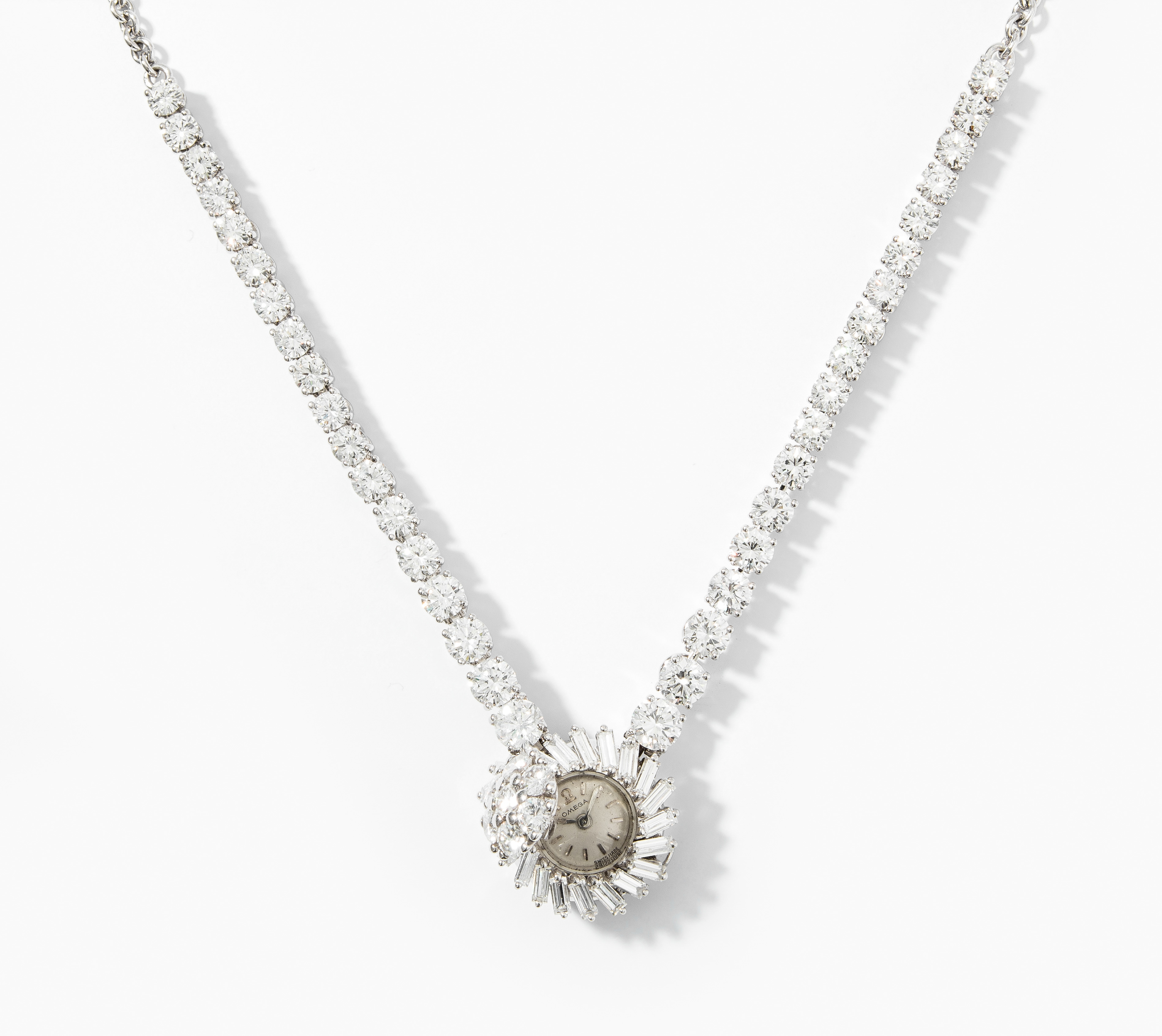 750 Weissgold. Runde Omega Backwind Handaufzug Cal. 440, Werk Nr. 14783335. Gehäuse Nr. 11376735, funktionstüchtig. Versilbertes Zifferblatt mit applizierten Strichindizes, Lunette mit 20 Baguetten ca. 0.80 ct, Uhrendeckel mit 7 Brillanten ca. 1.05 ct. Collier mit 36 Brillanten ca. 7 ct. L 45 cm, 31,5 g.