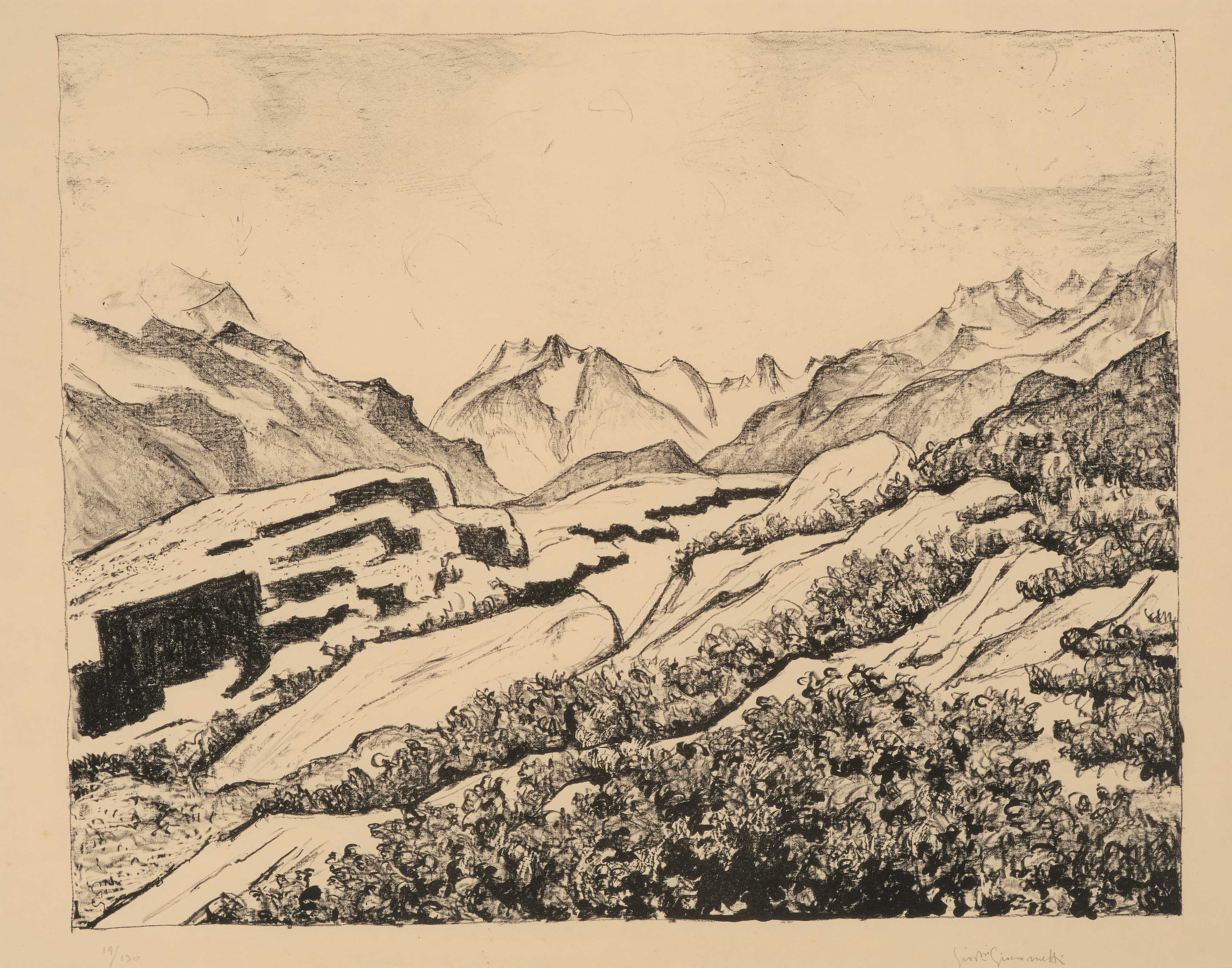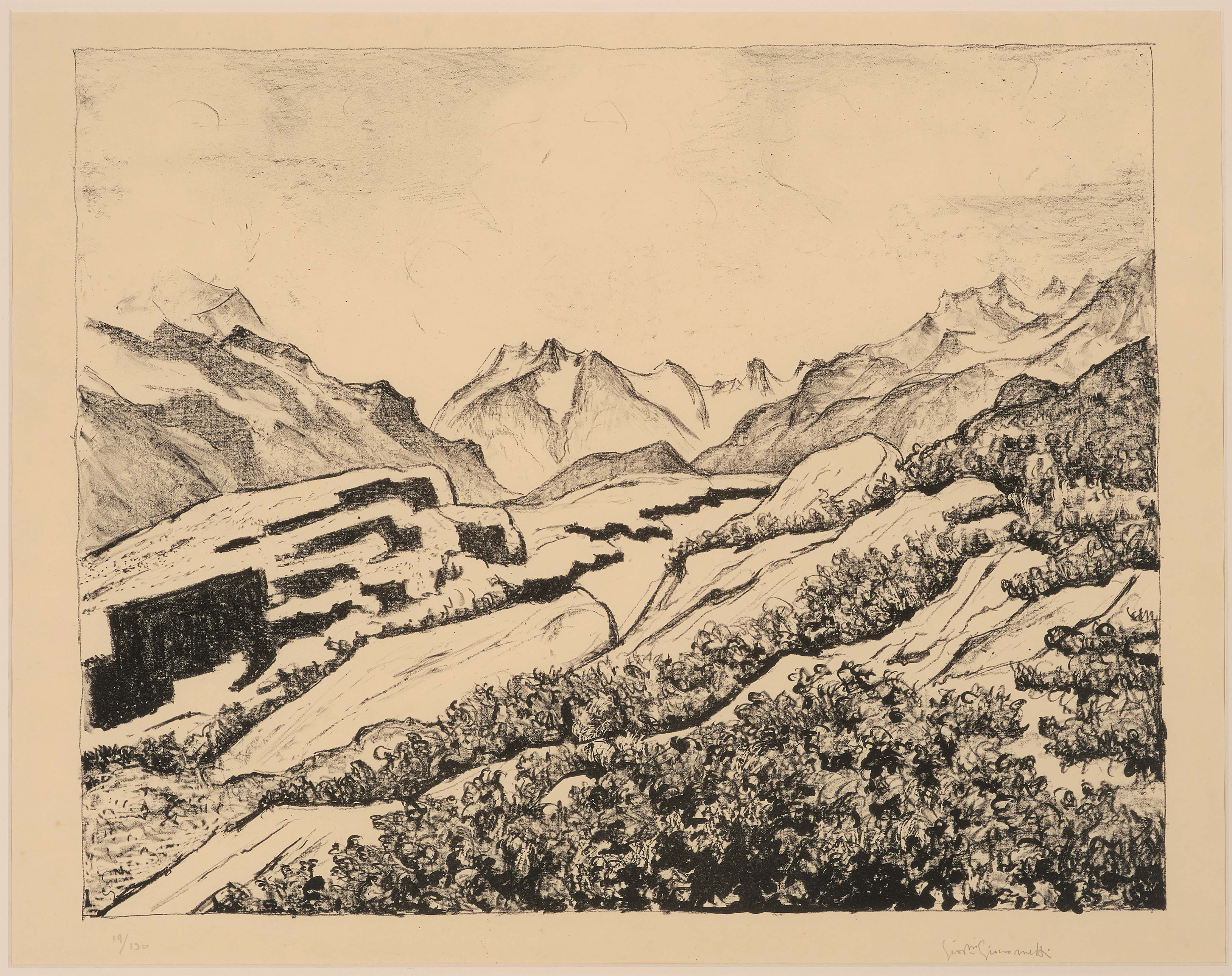 "Frühling in den Engadiner Bergen. - Blick ins Fornotal bei Maloja". 1931. Lithographie. 19/130. Unten rechts in Bleistift signiert. Blattgrösse 50,5x63 cm. Gerahmt. -Blatt leicht gebräunt und wenig fleckig. Minimst dunkler Lichtrand. Knitter. Verso am oberen Rand an Rückkarton montiert.