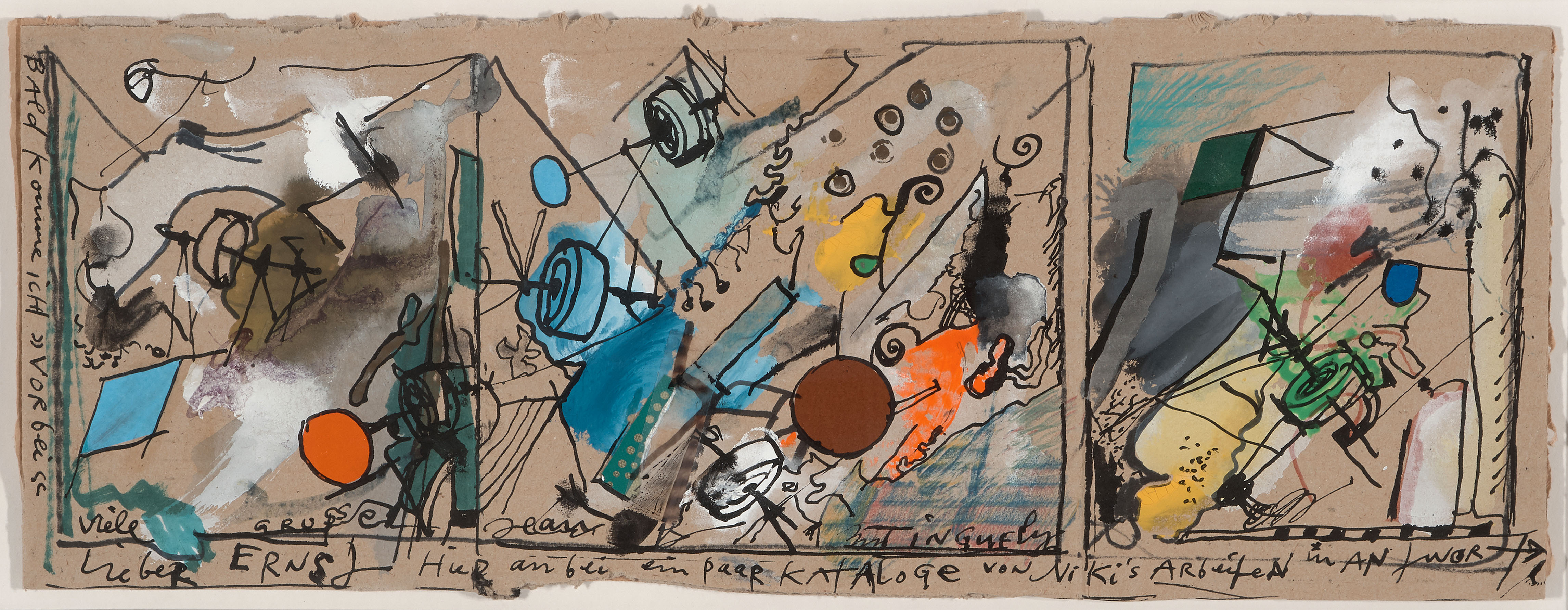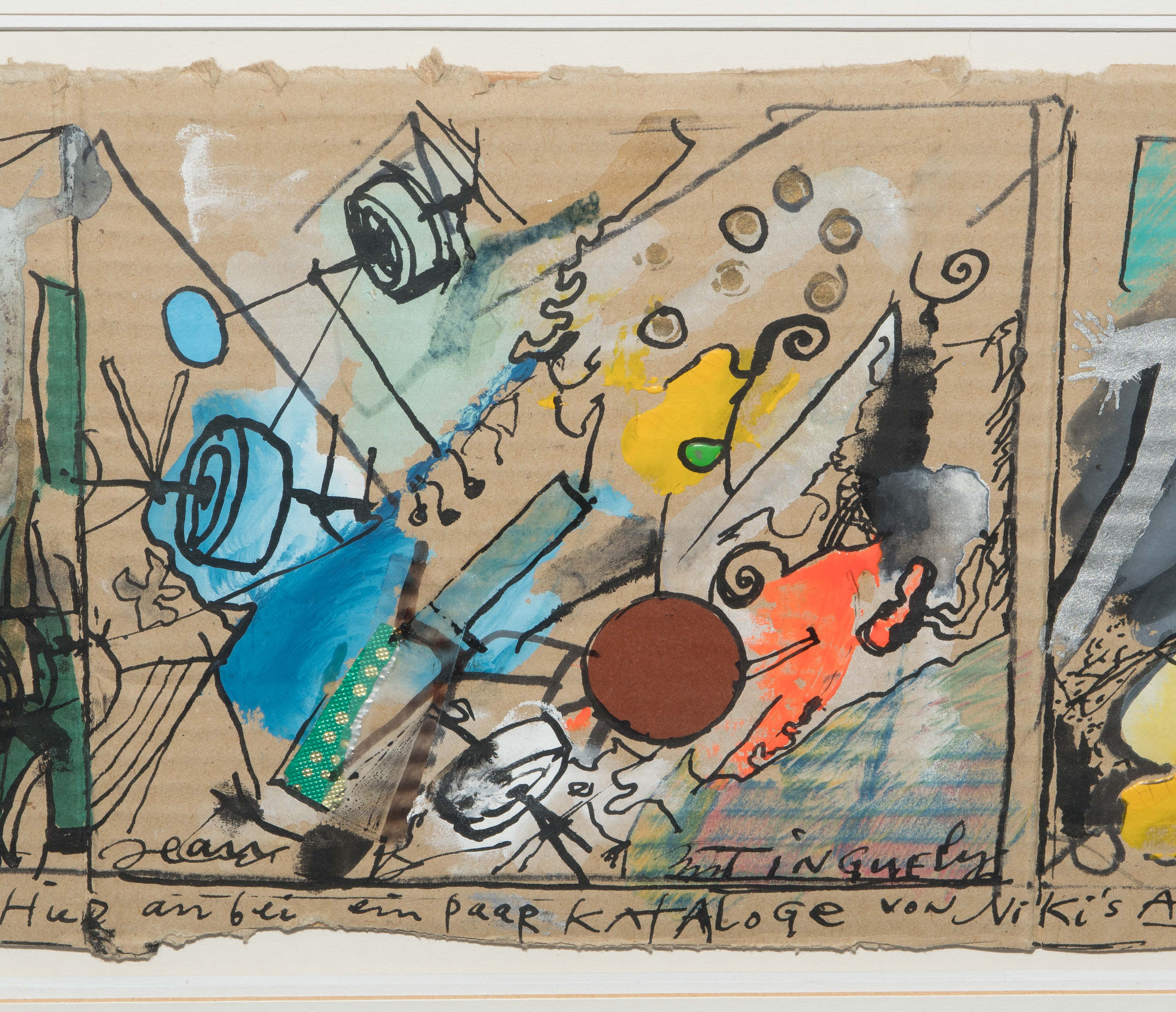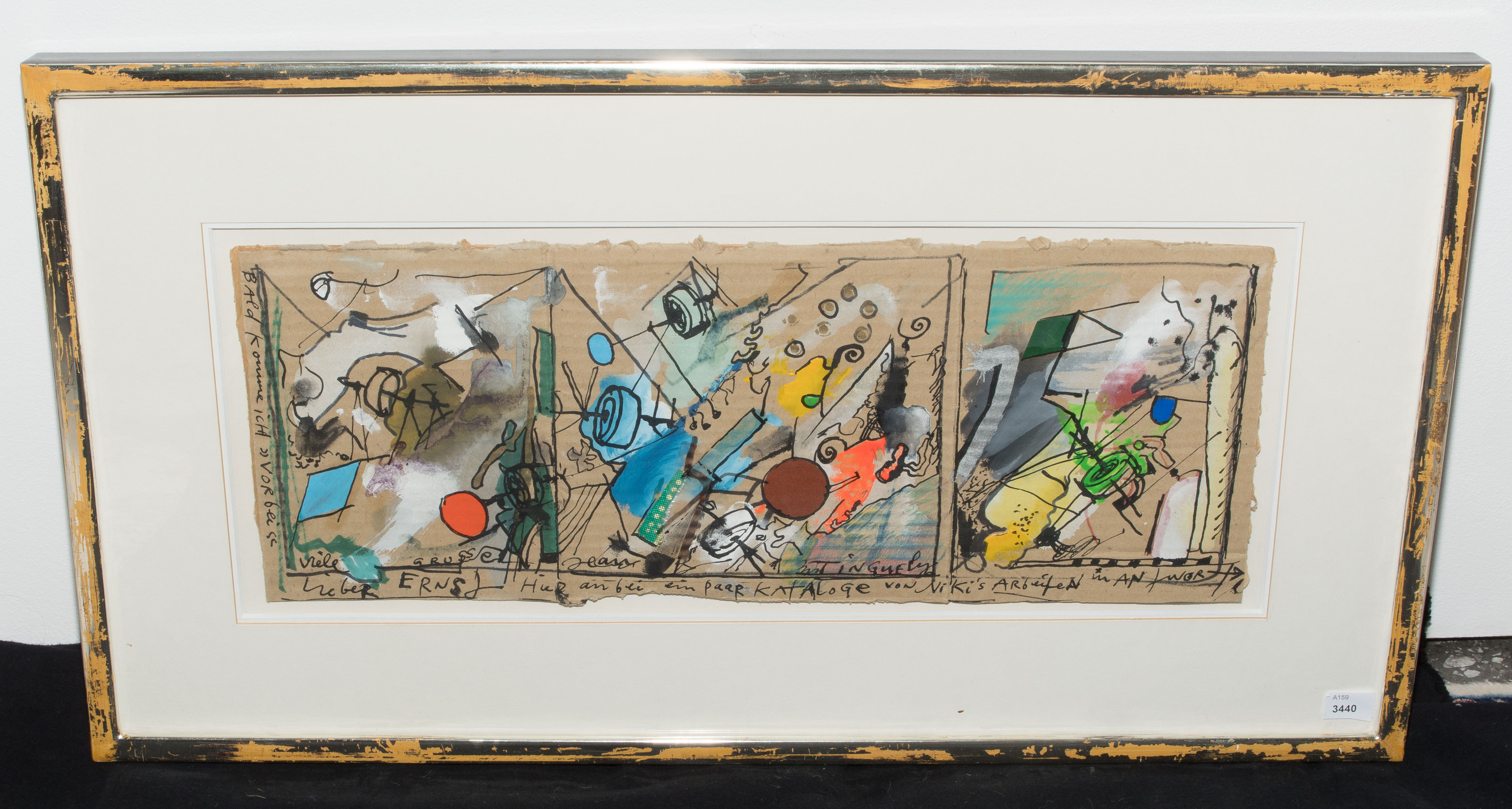 Ohne Titel. Mischtechnik mit Collage auf Karton. Unten mittig in Tusche signiert. Auf dem Karton bezeichnet: "Bald komme ich vorbei viele Grüsse Jean", "Lieber Ernst Hier anbei ein paar Kataloge von Niki's Arbeiten". Verso bezeichnet. Kartongrösse 18,8x48 cm. Gerahmt. -Ränder des Kartons unregelmässig beschnitten. Verso partiell an Rückkarton montiert.