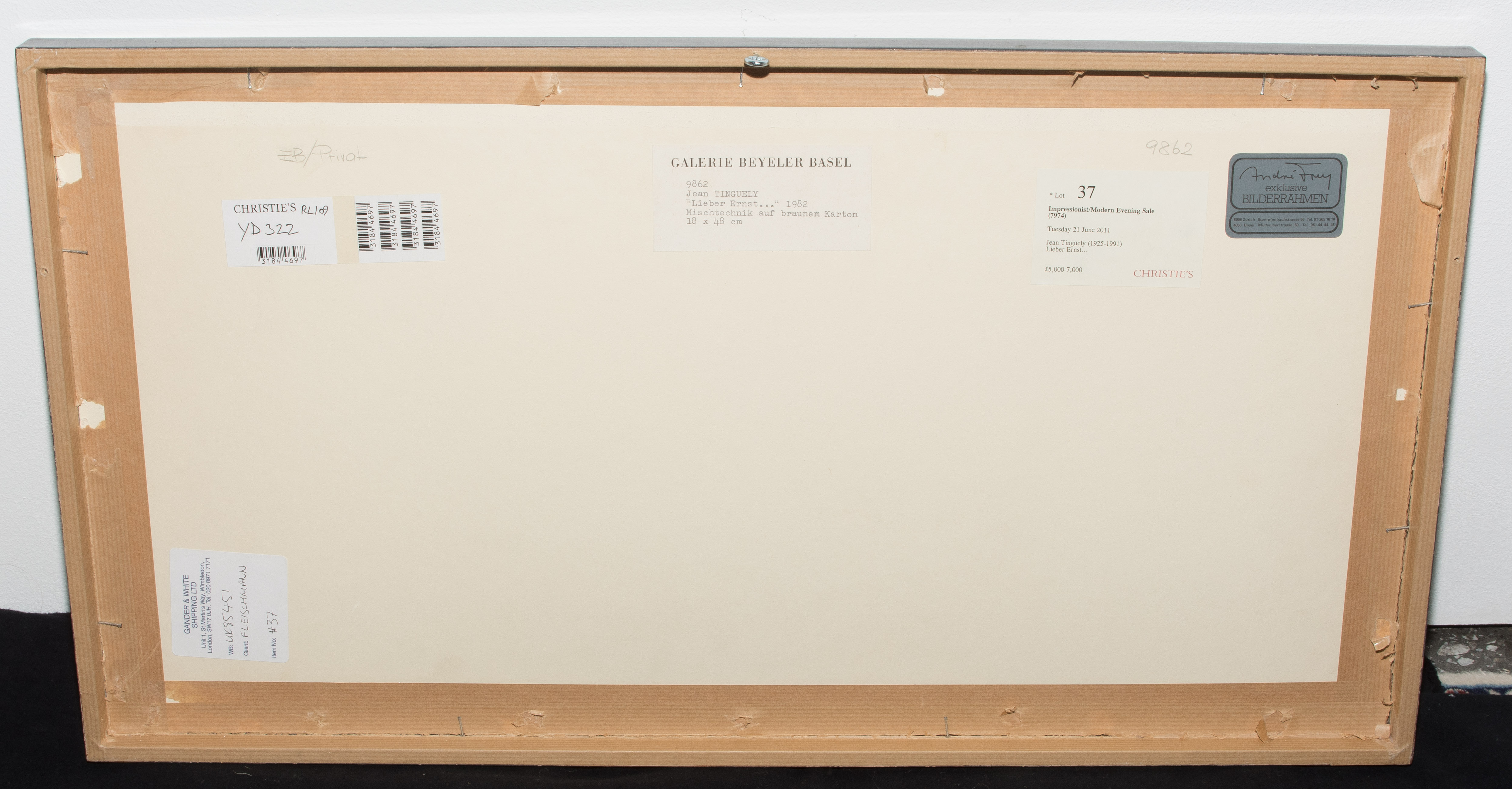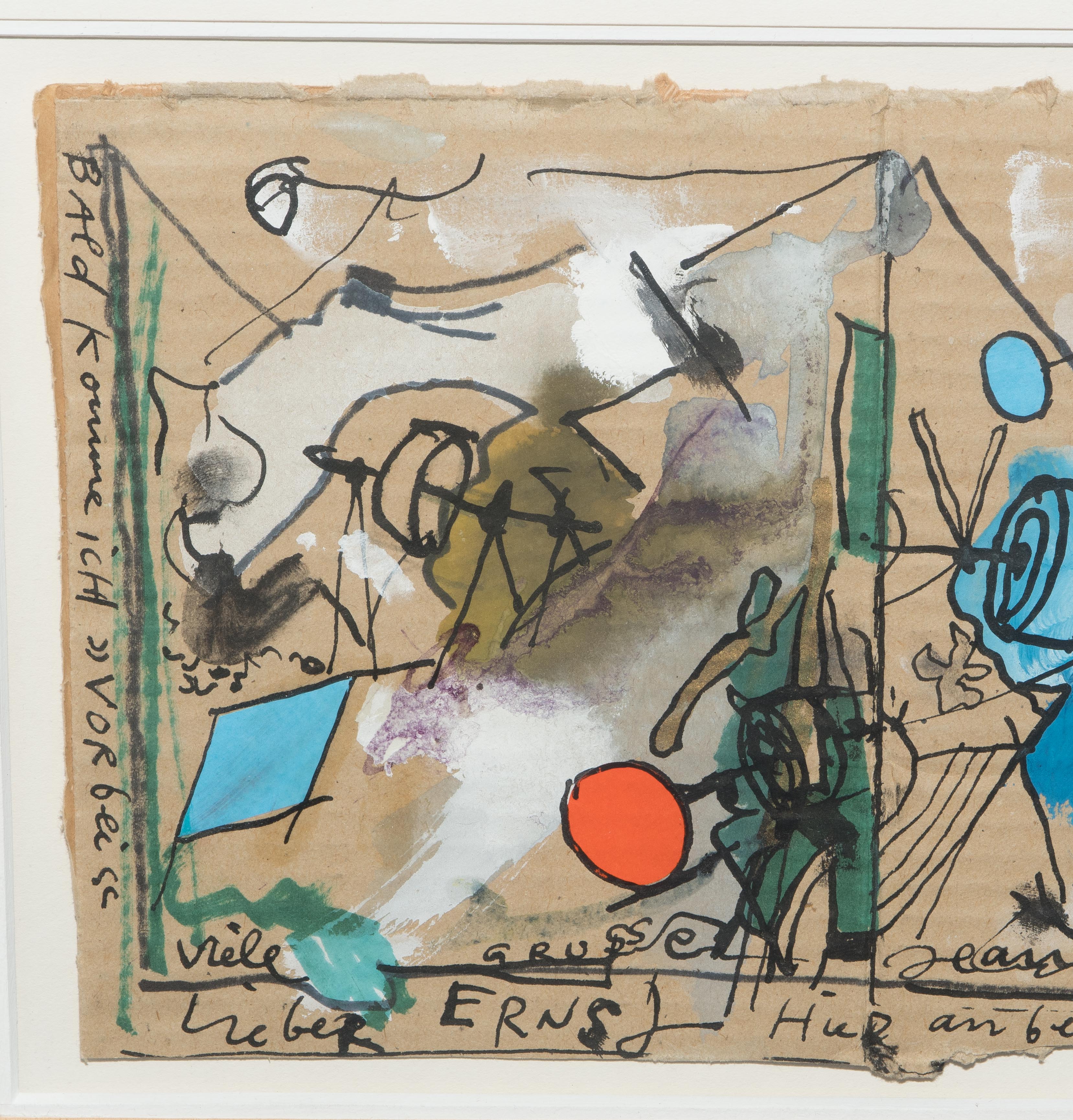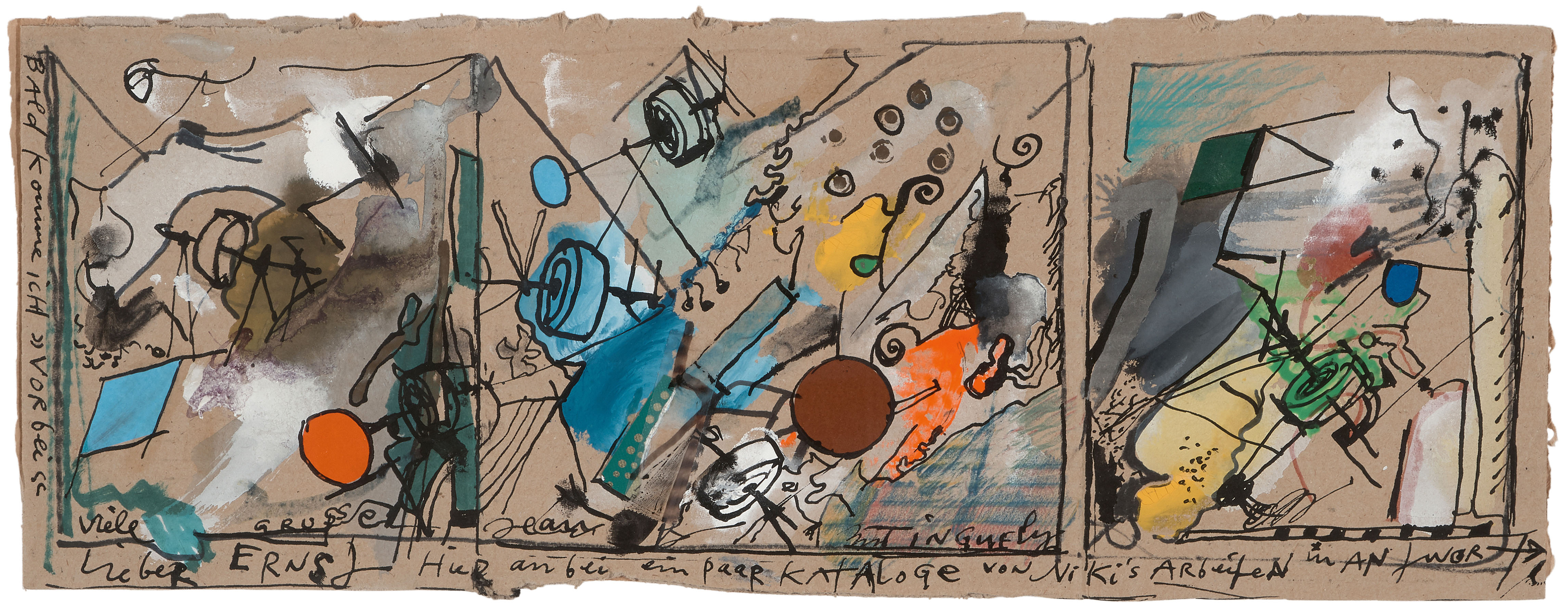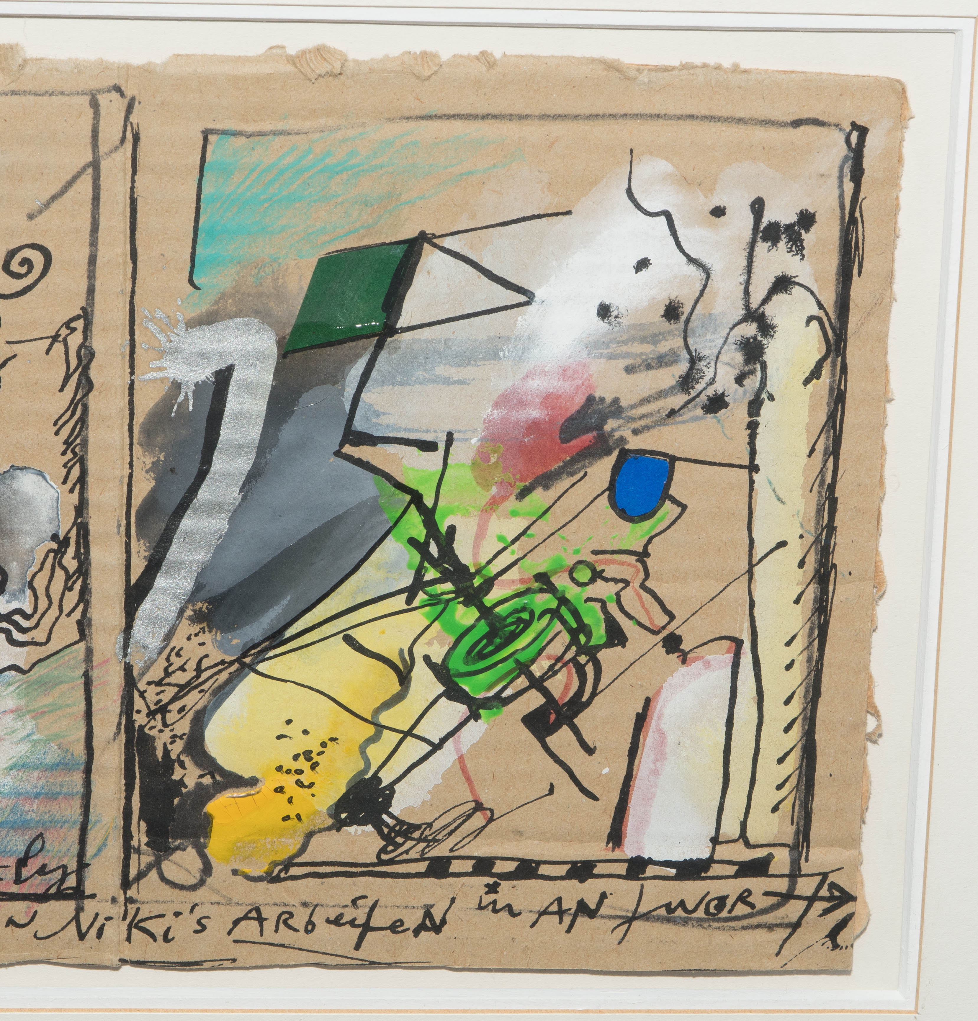 Ohne Titel. Mischtechnik mit Collage auf Karton. Unten mittig in Tusche signiert. Auf dem Karton bezeichnet: "Bald komme ich vorbei viele Grüsse Jean", "Lieber Ernst Hier anbei ein paar Kataloge von Niki's Arbeiten". Verso bezeichnet. Kartongrösse 18,8x48 cm. Gerahmt. -Ränder des Kartons unregelmässig beschnitten. Verso partiell an Rückkarton montiert.