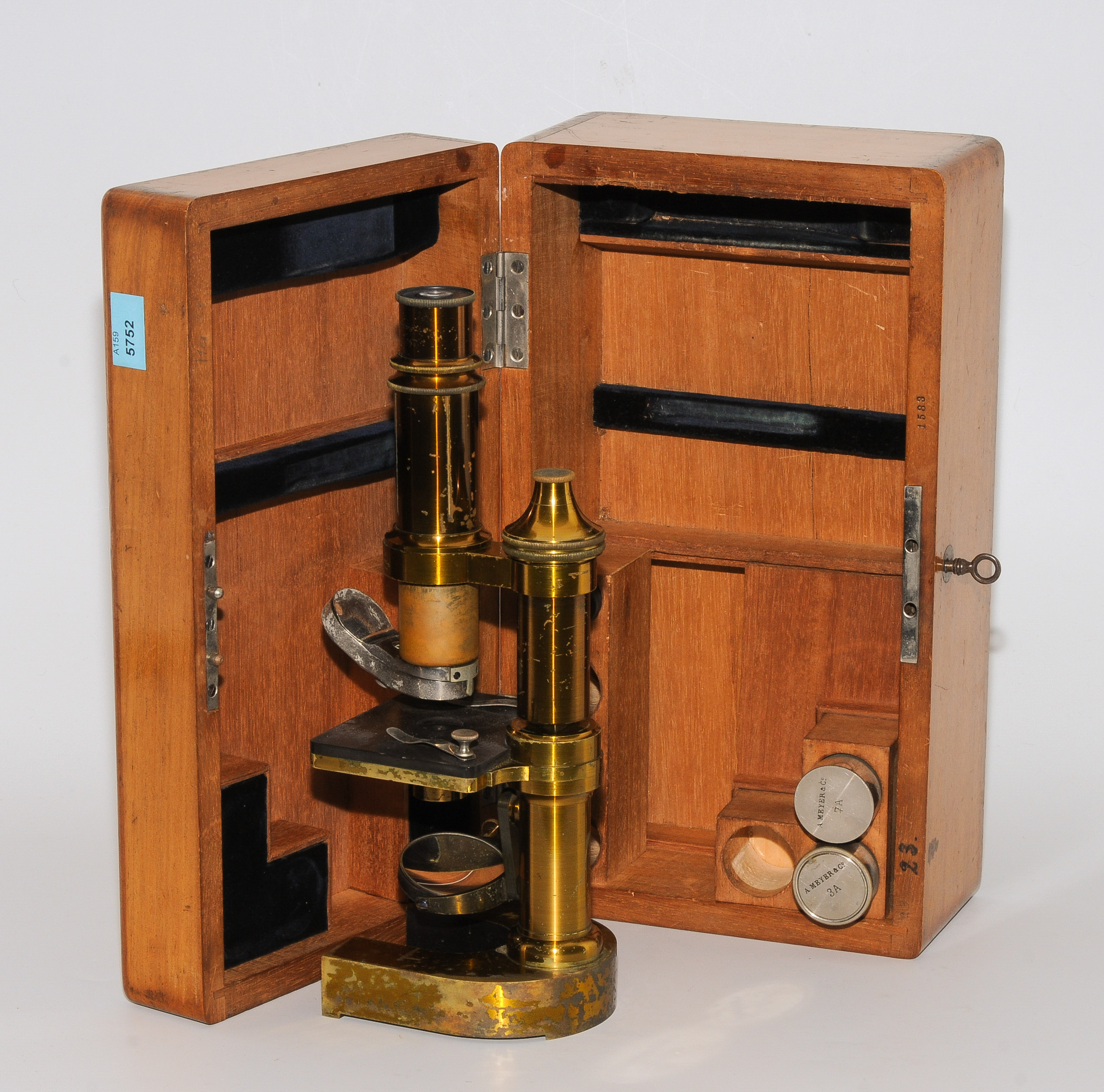 Schweiz, um 1920. Bezeichnet: "A. MEYER & Co, ENGE-ZÜRICH". Monokular-Mikroskop mit hufeisenförmigem Fuss aus Messing. In Original-Holzkasten mit Zubehör. H 25 cm (Mikroskop).
