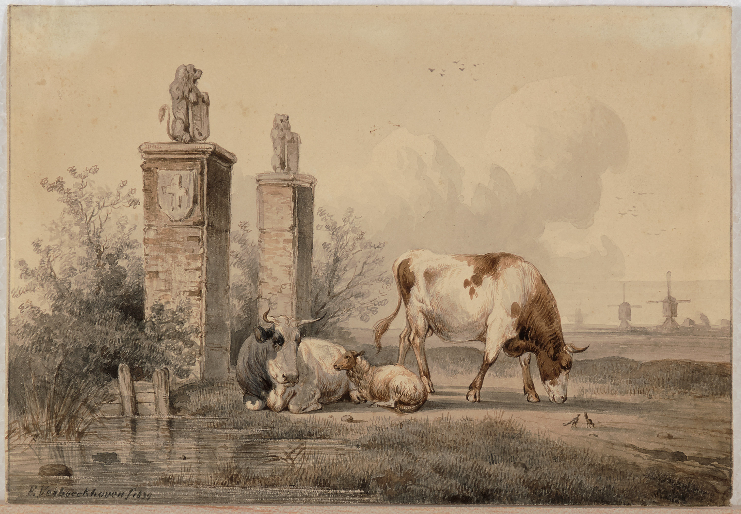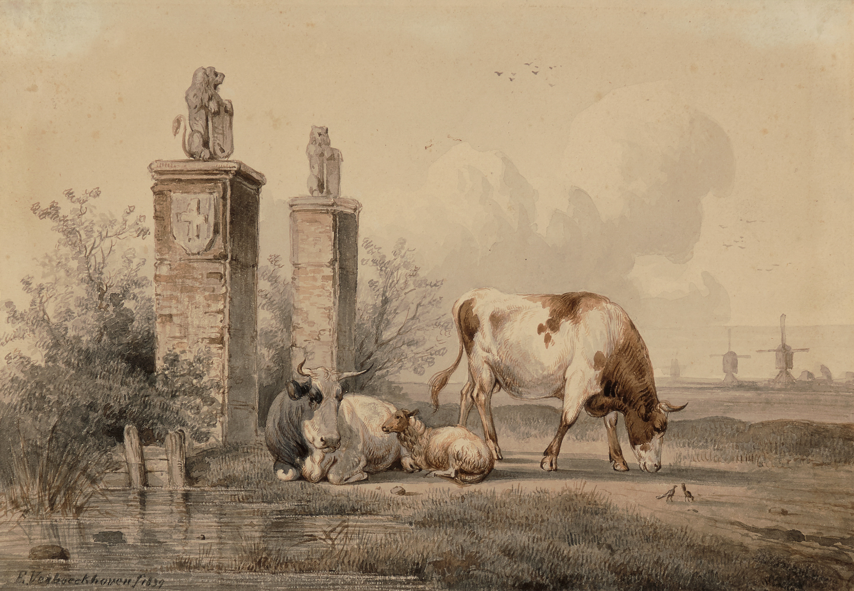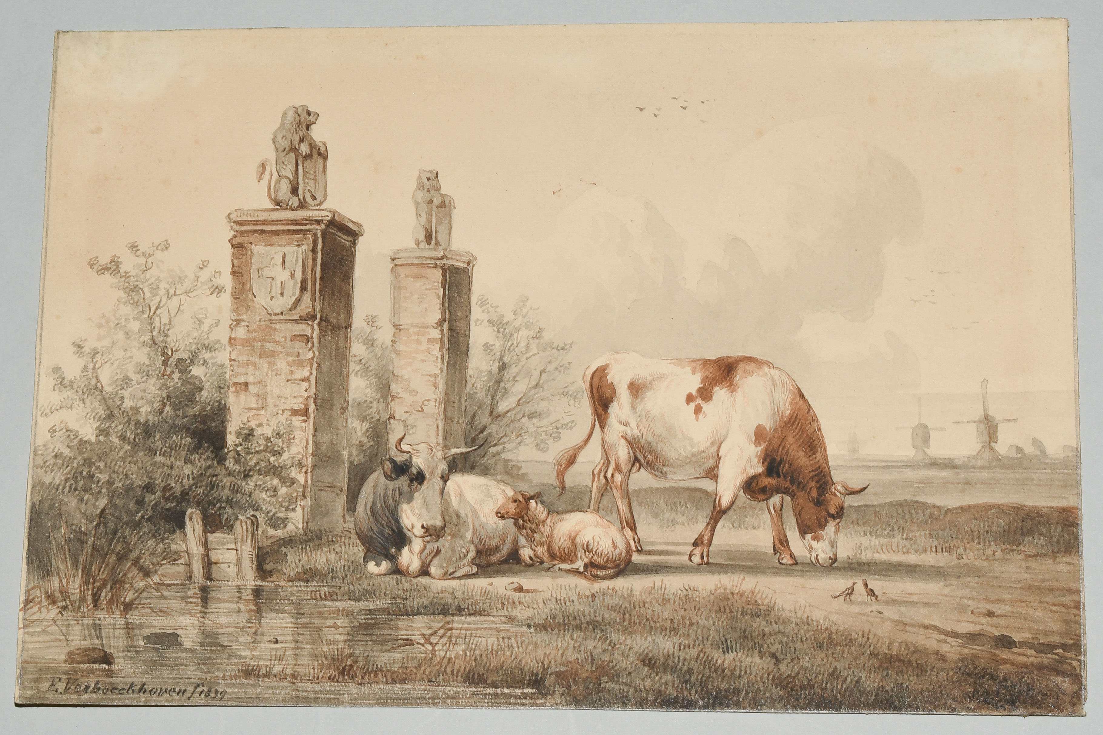 Kühe und Schaf auf der Weide. Aquarell, 1839. Unten links signiert und datiert. 16,8x24,6 cm.