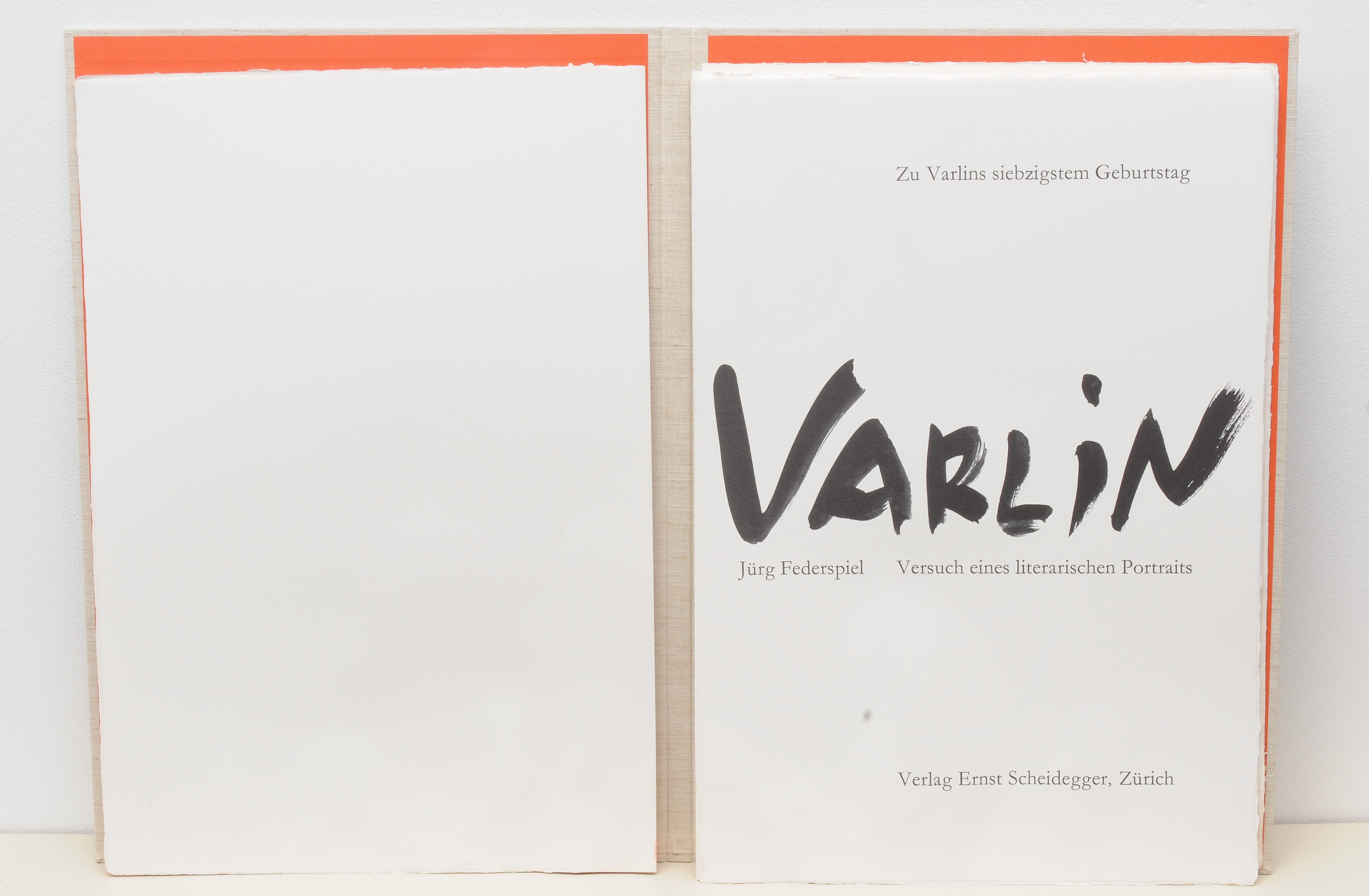 Jürg Federspiel. Versuch eines literarischen Portraits zu Varlins siebzigstem Geburtstag. Verlag Ernst Scheidegger, Zürich, 1970. Exemplar 43 (von 112). Vom Künstler und Verleger signiert. 40 Seiten. In Leinwandmappe und -schuber. 61,5x42,5 cm.