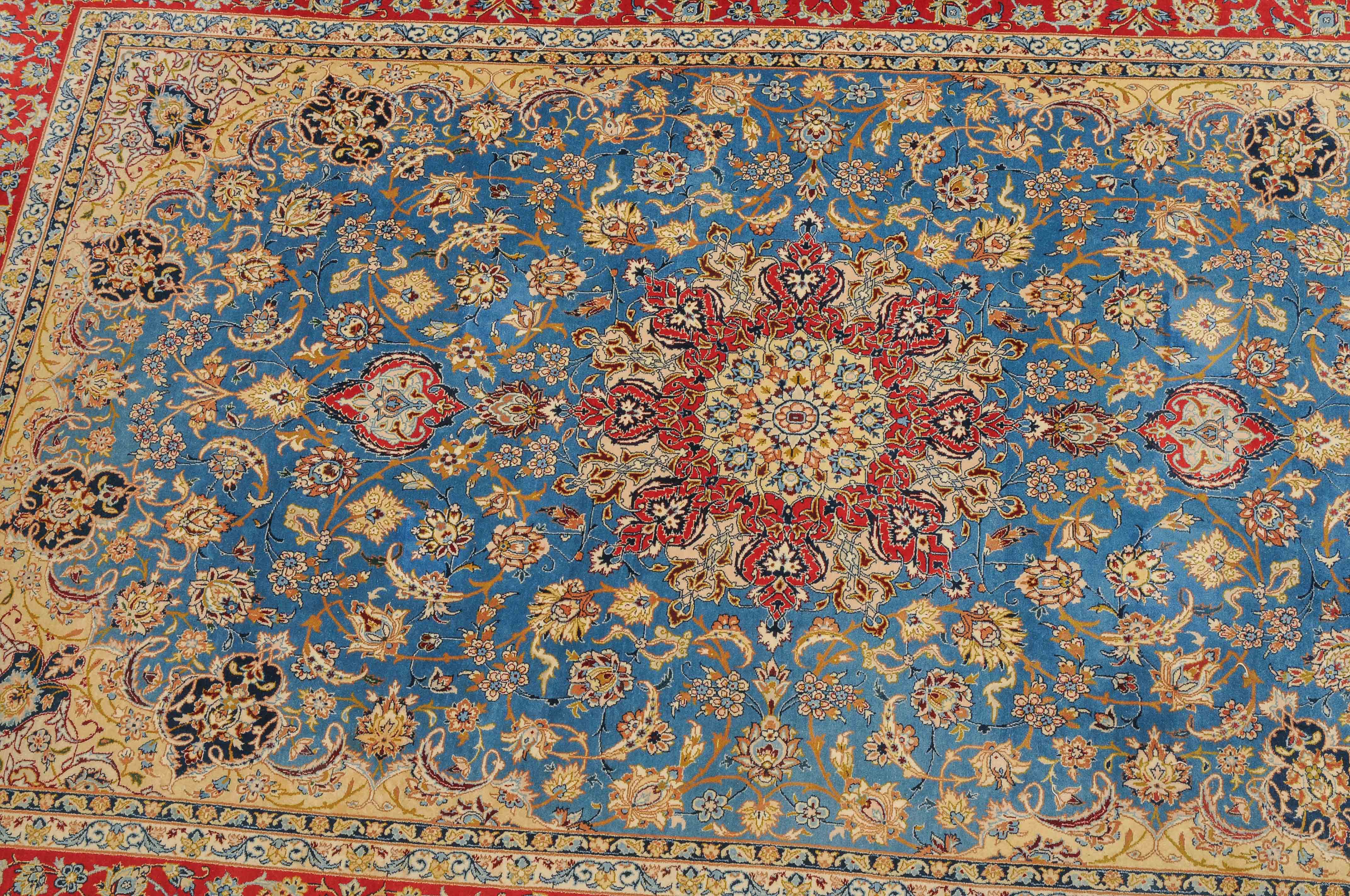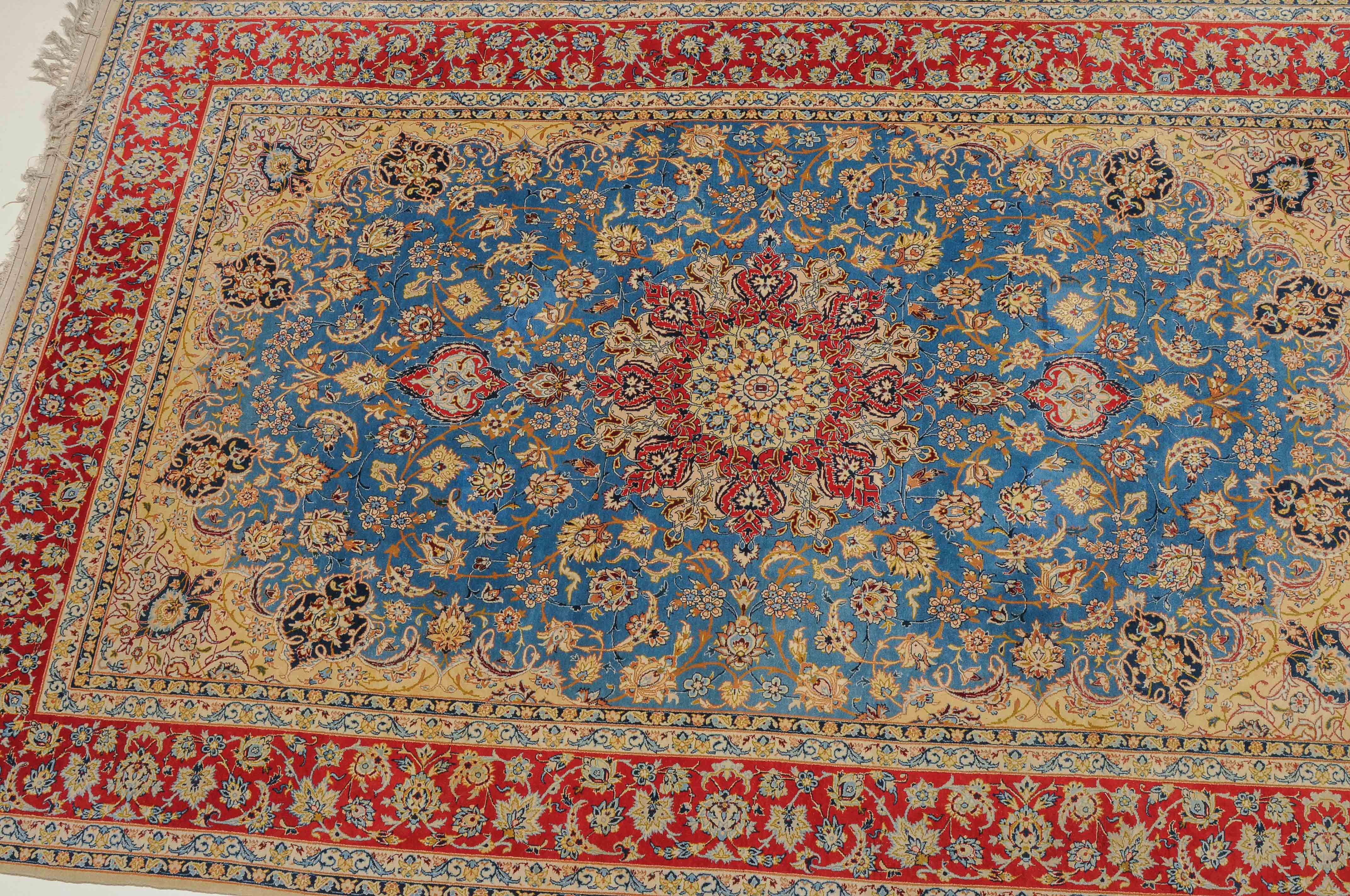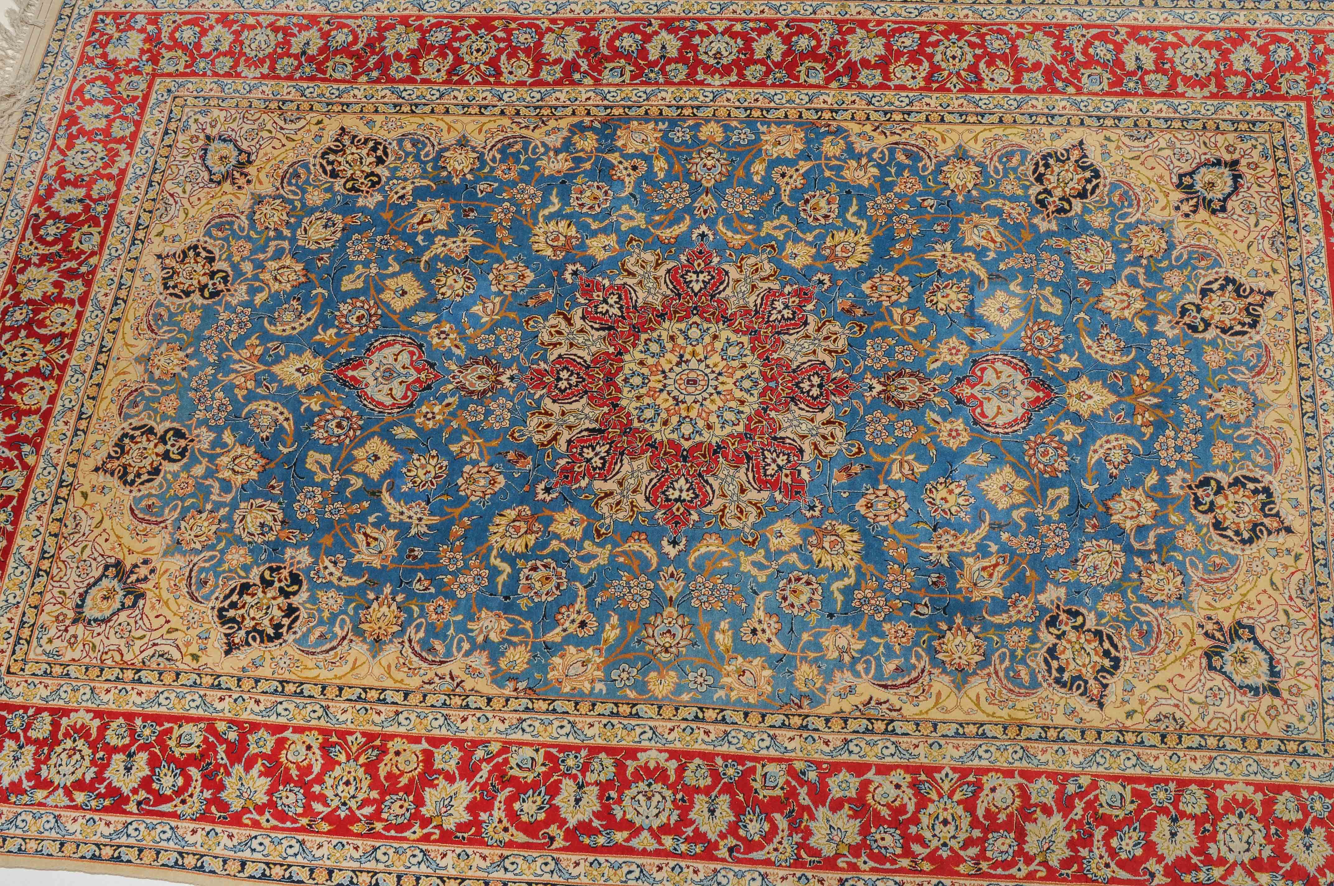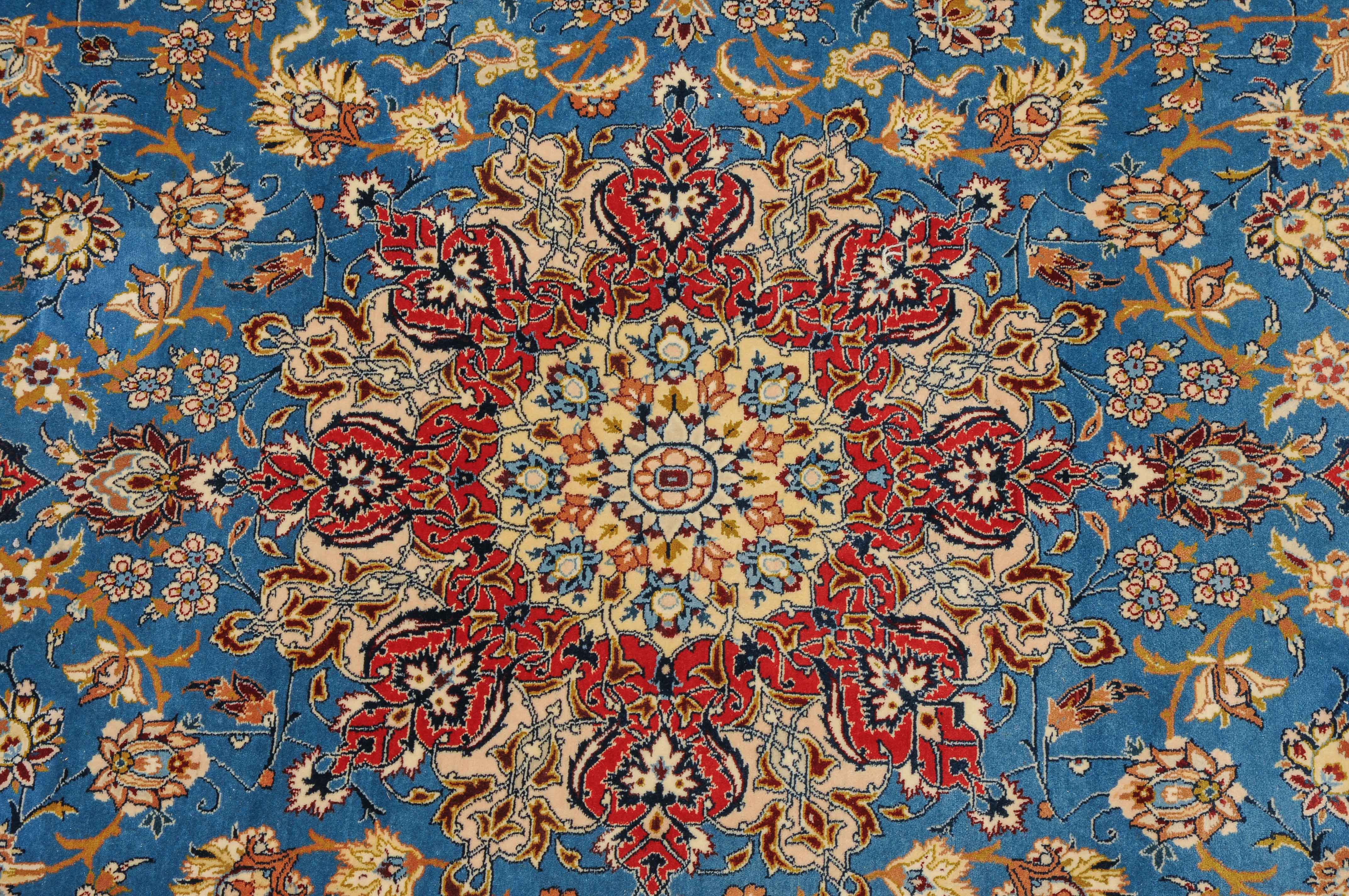 Z-Persien, um 1960. Flormaterial Korkwolle, Kette aus Seide. Unten in der Mitte signiert mit "Isfahan, Iran, Asatchi". Im dekorativen hellblauen Feld ruht ein 8-Pass-Sternmedaillon mit Ausläufern, flankiert von Blütenketten, Blattranken und 4 hellen, miteinander verbundenen Eckzwickeln. 4 floral geschmückte Nebenbordüren umfassen die mit girlandenartig verbundenen Blütenkompositionen belegte rote Bordüre. Gute Erhaltung. 145x218 cm (ft. 4.8x7.2).