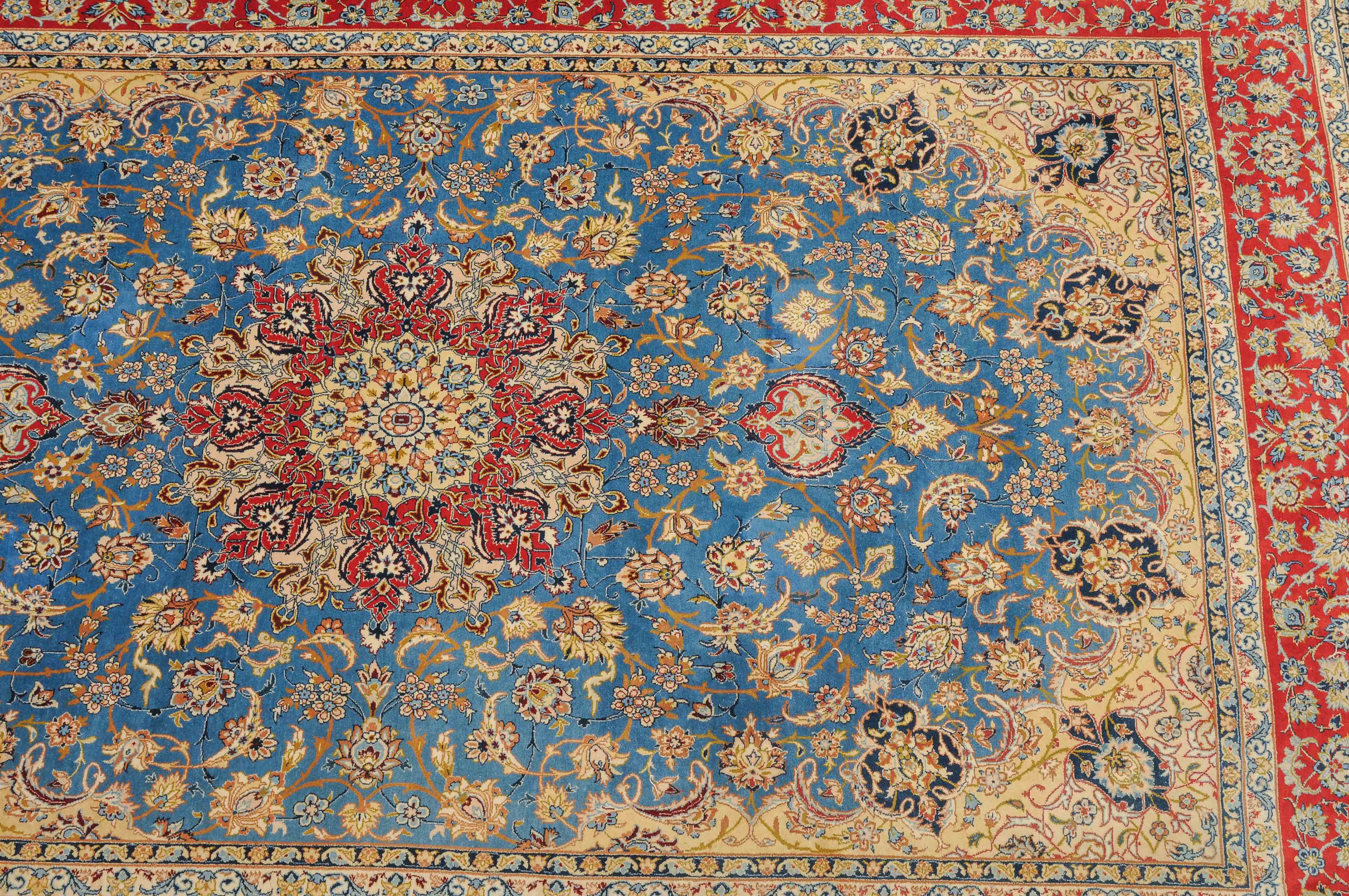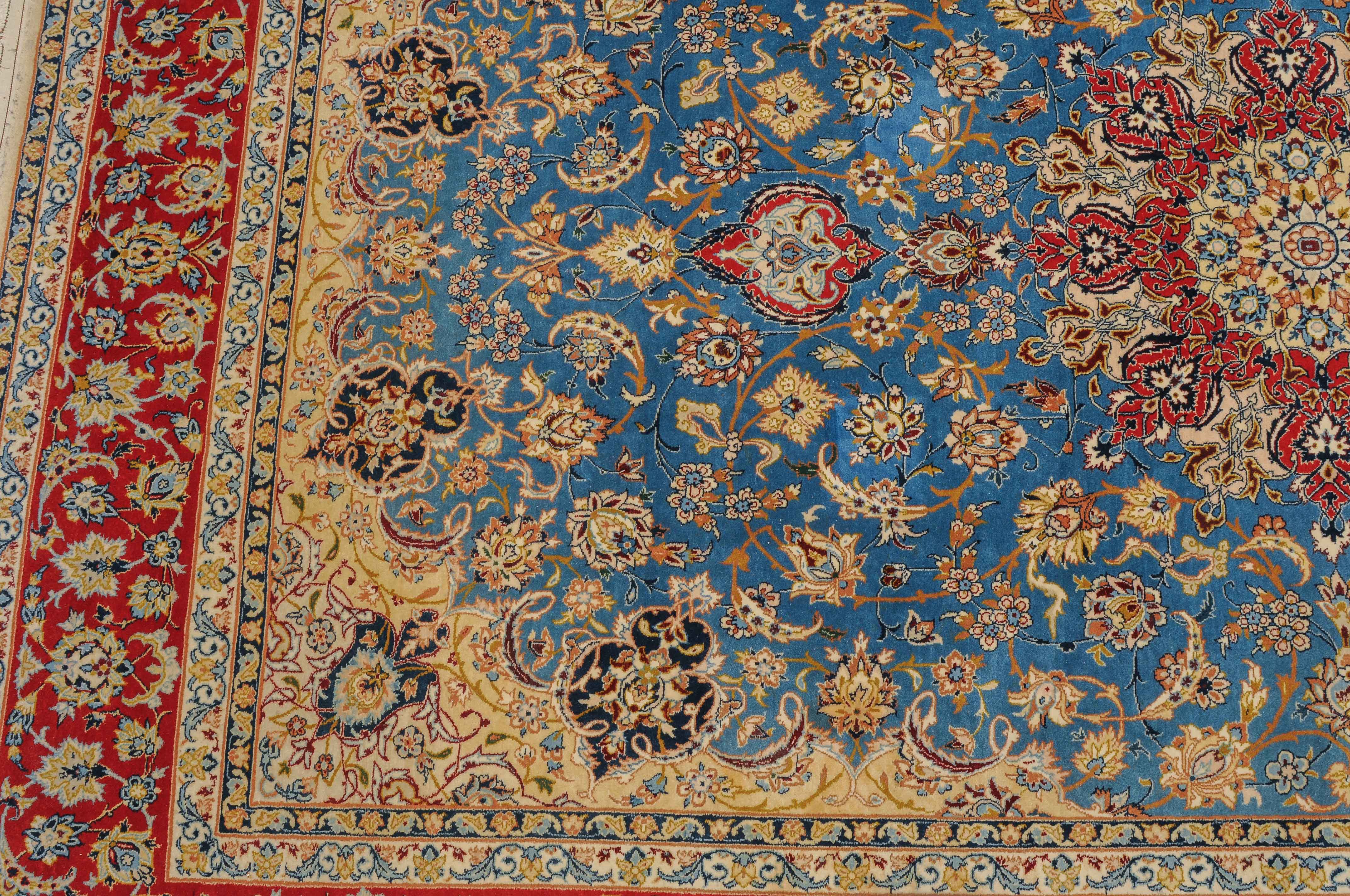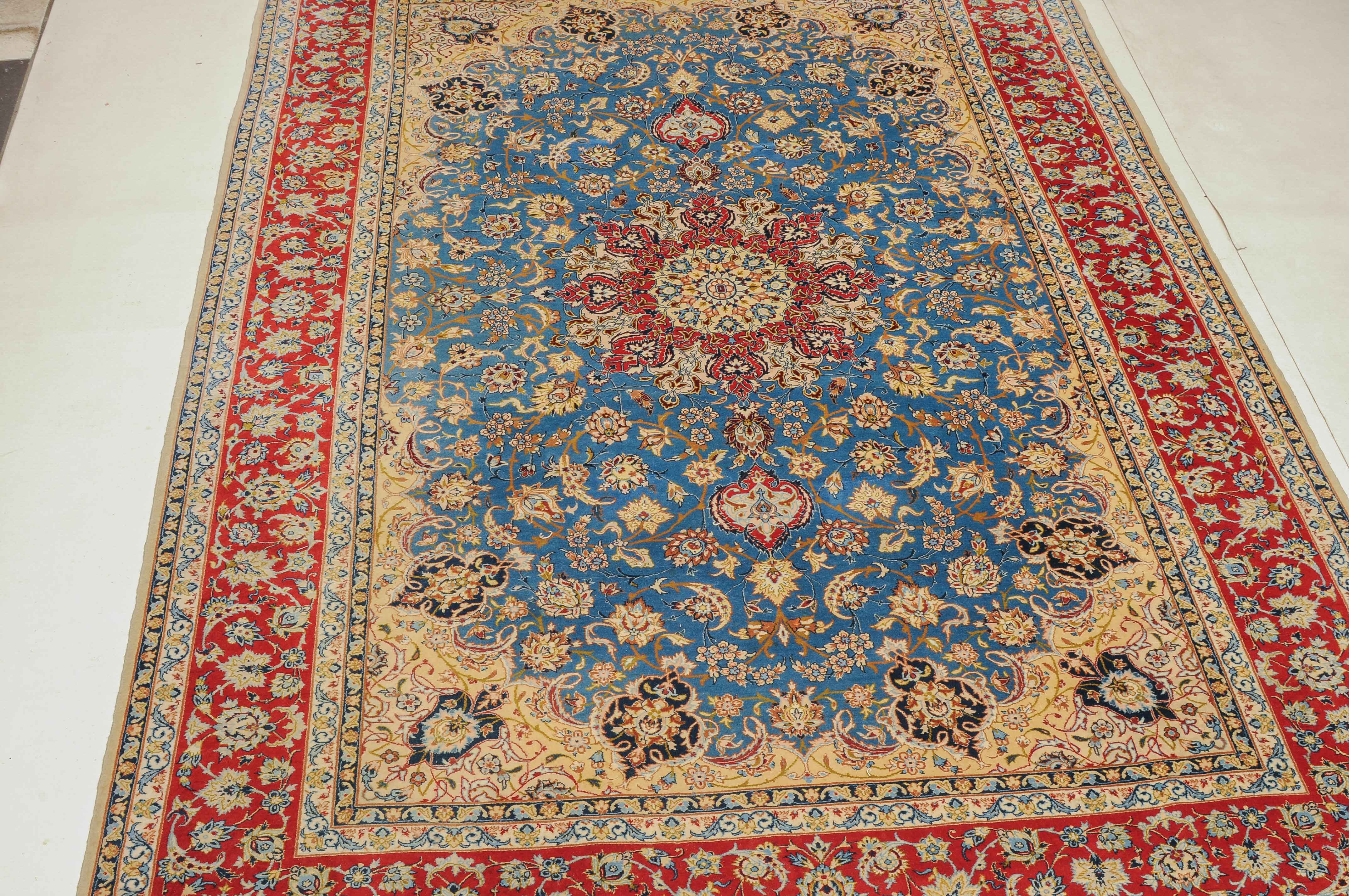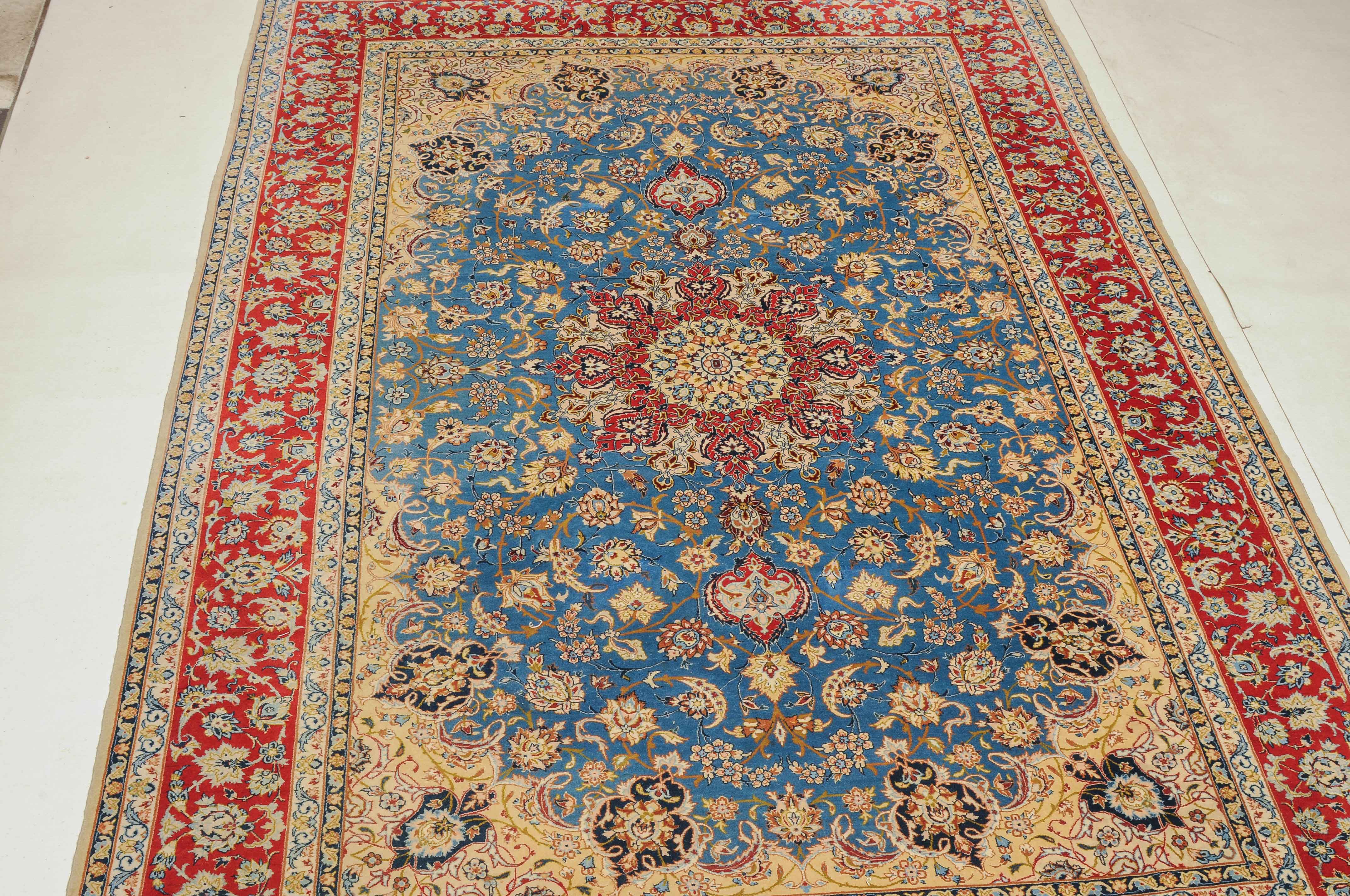Z-Persien, um 1960. Flormaterial Korkwolle, Kette aus Seide. Unten in der Mitte signiert mit "Isfahan, Iran, Asatchi". Im dekorativen hellblauen Feld ruht ein 8-Pass-Sternmedaillon mit Ausläufern, flankiert von Blütenketten, Blattranken und 4 hellen, miteinander verbundenen Eckzwickeln. 4 floral geschmückte Nebenbordüren umfassen die mit girlandenartig verbundenen Blütenkompositionen belegte rote Bordüre. Gute Erhaltung. 145x218 cm (ft. 4.8x7.2).