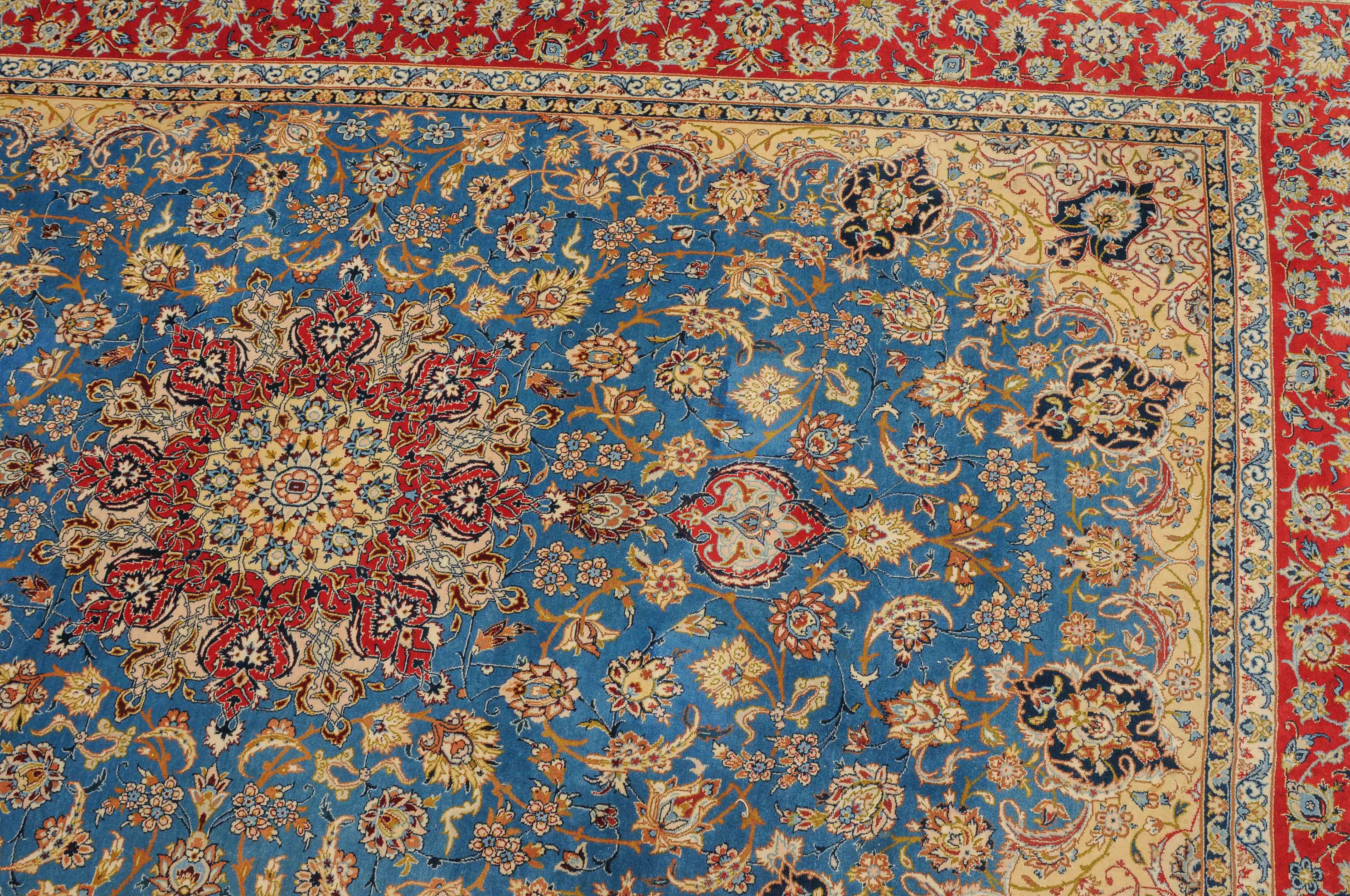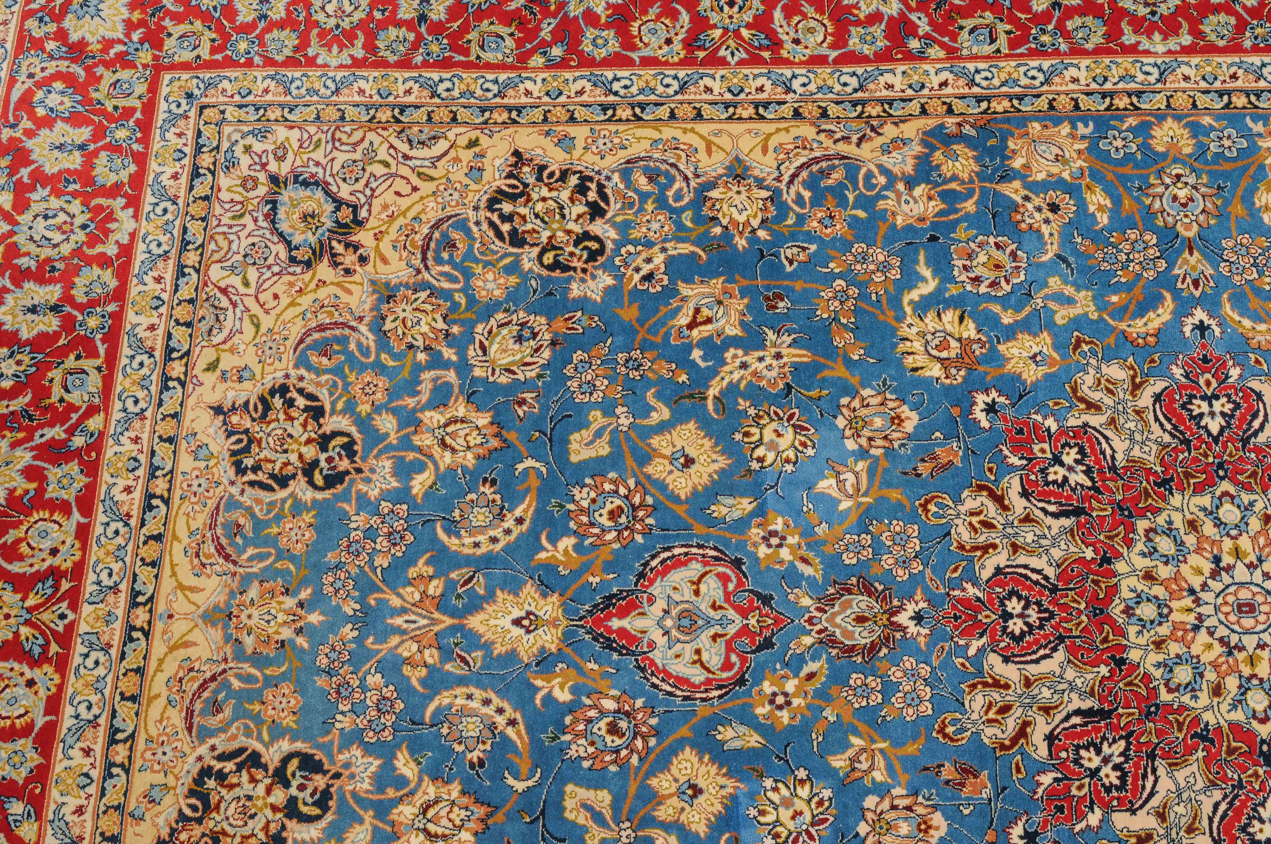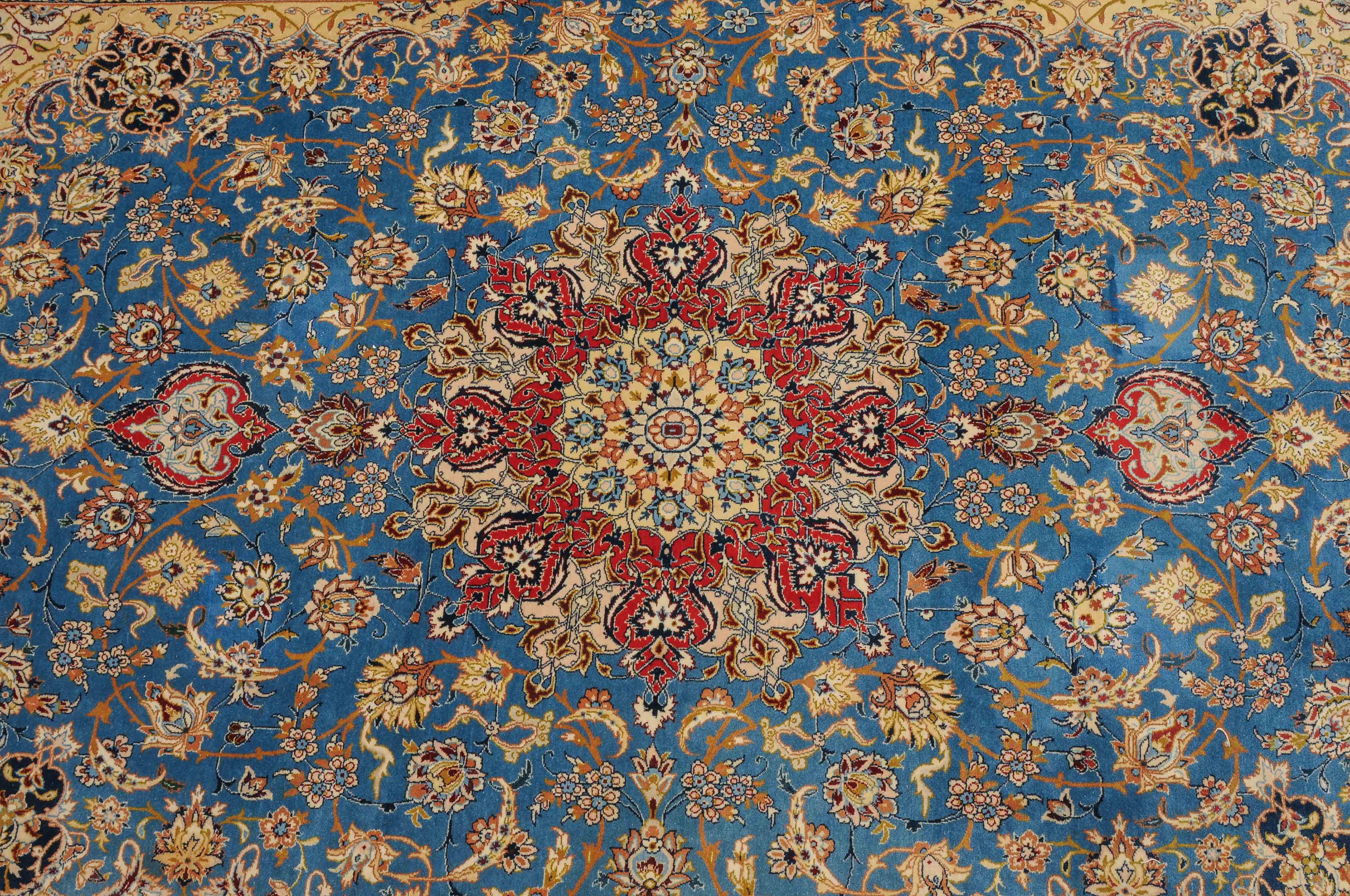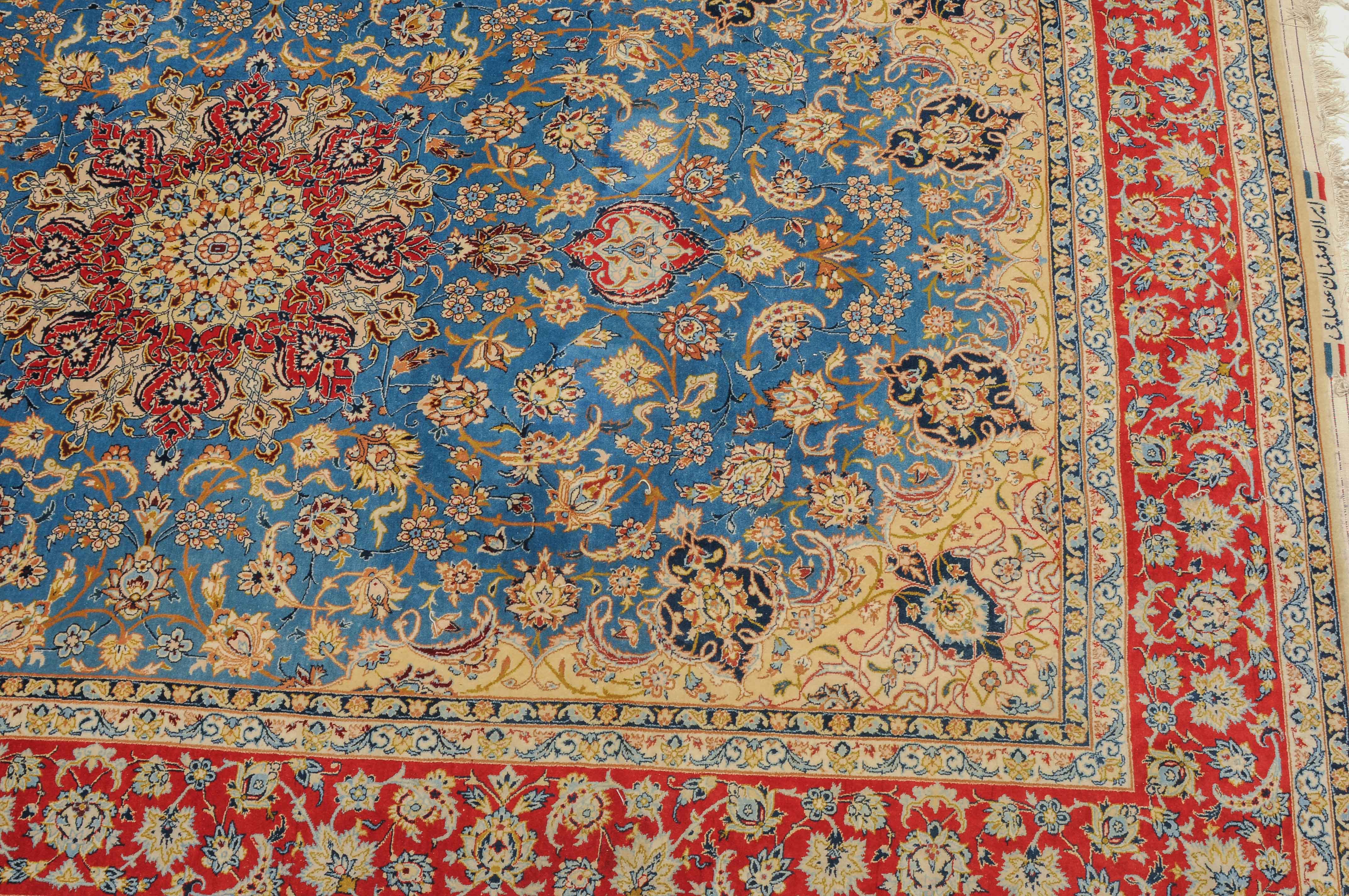 Z-Persien, um 1960. Flormaterial Korkwolle, Kette aus Seide. Unten in der Mitte signiert mit "Isfahan, Iran, Asatchi". Im dekorativen hellblauen Feld ruht ein 8-Pass-Sternmedaillon mit Ausläufern, flankiert von Blütenketten, Blattranken und 4 hellen, miteinander verbundenen Eckzwickeln. 4 floral geschmückte Nebenbordüren umfassen die mit girlandenartig verbundenen Blütenkompositionen belegte rote Bordüre. Gute Erhaltung. 145x218 cm (ft. 4.8x7.2).