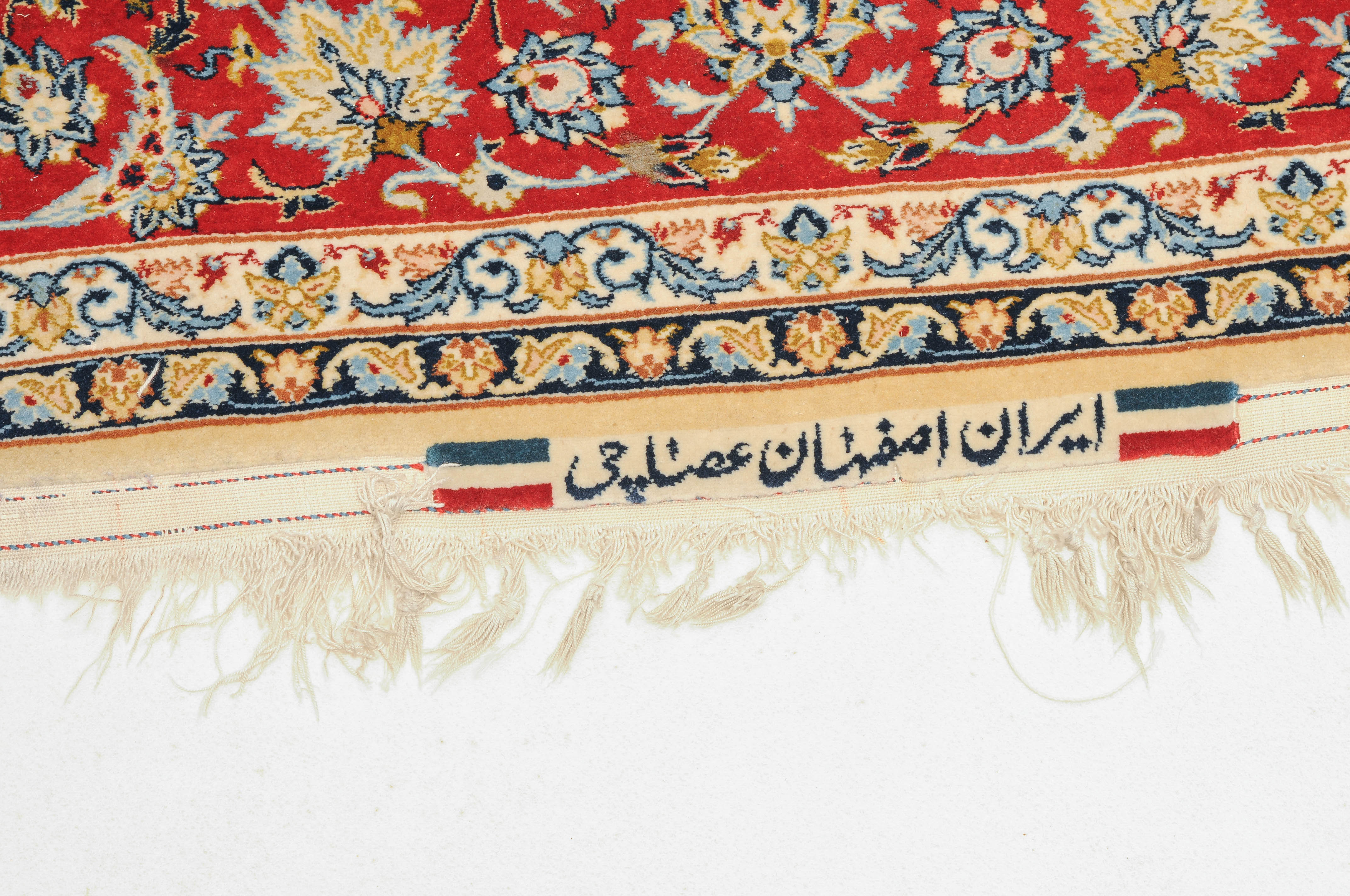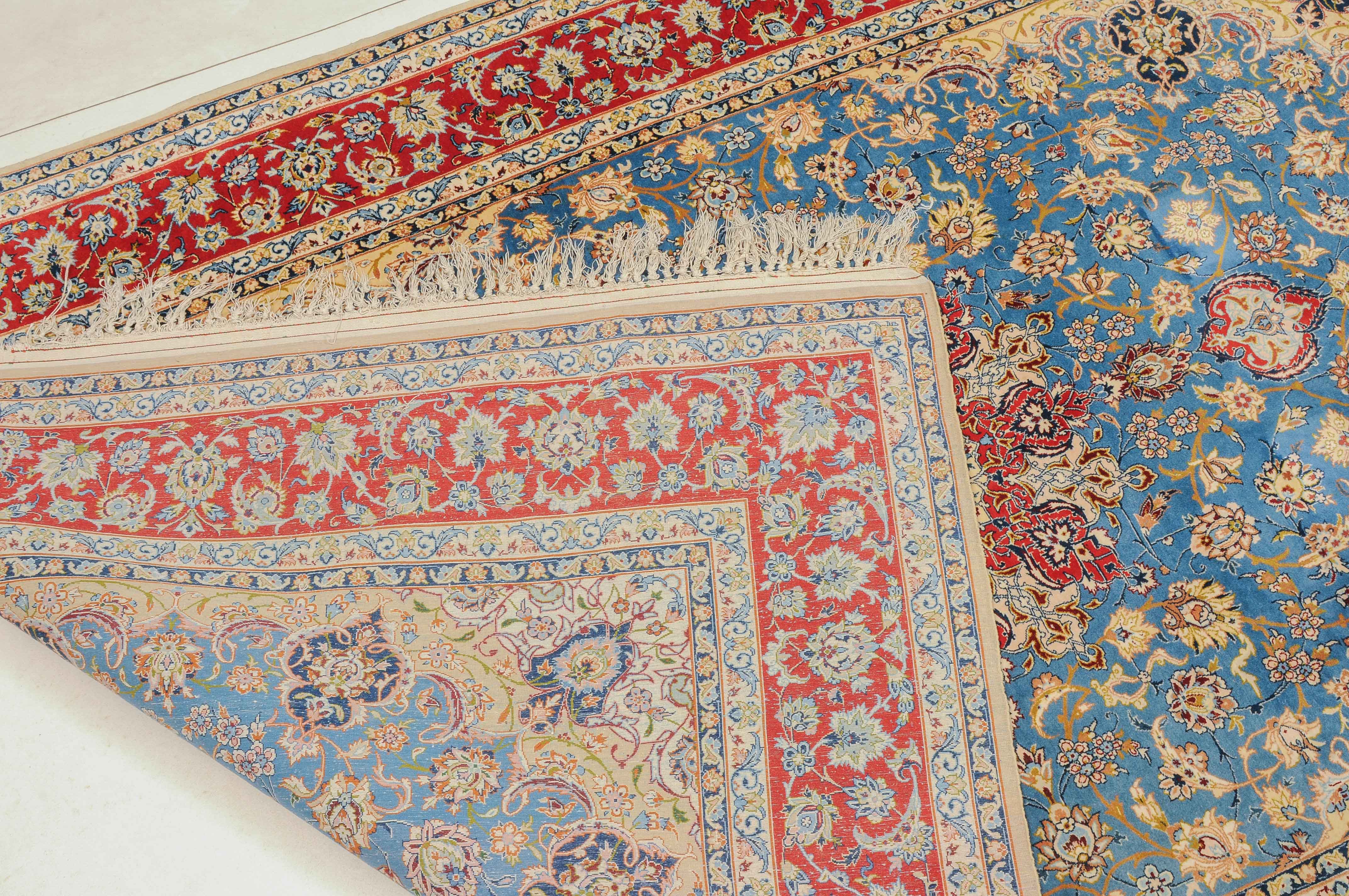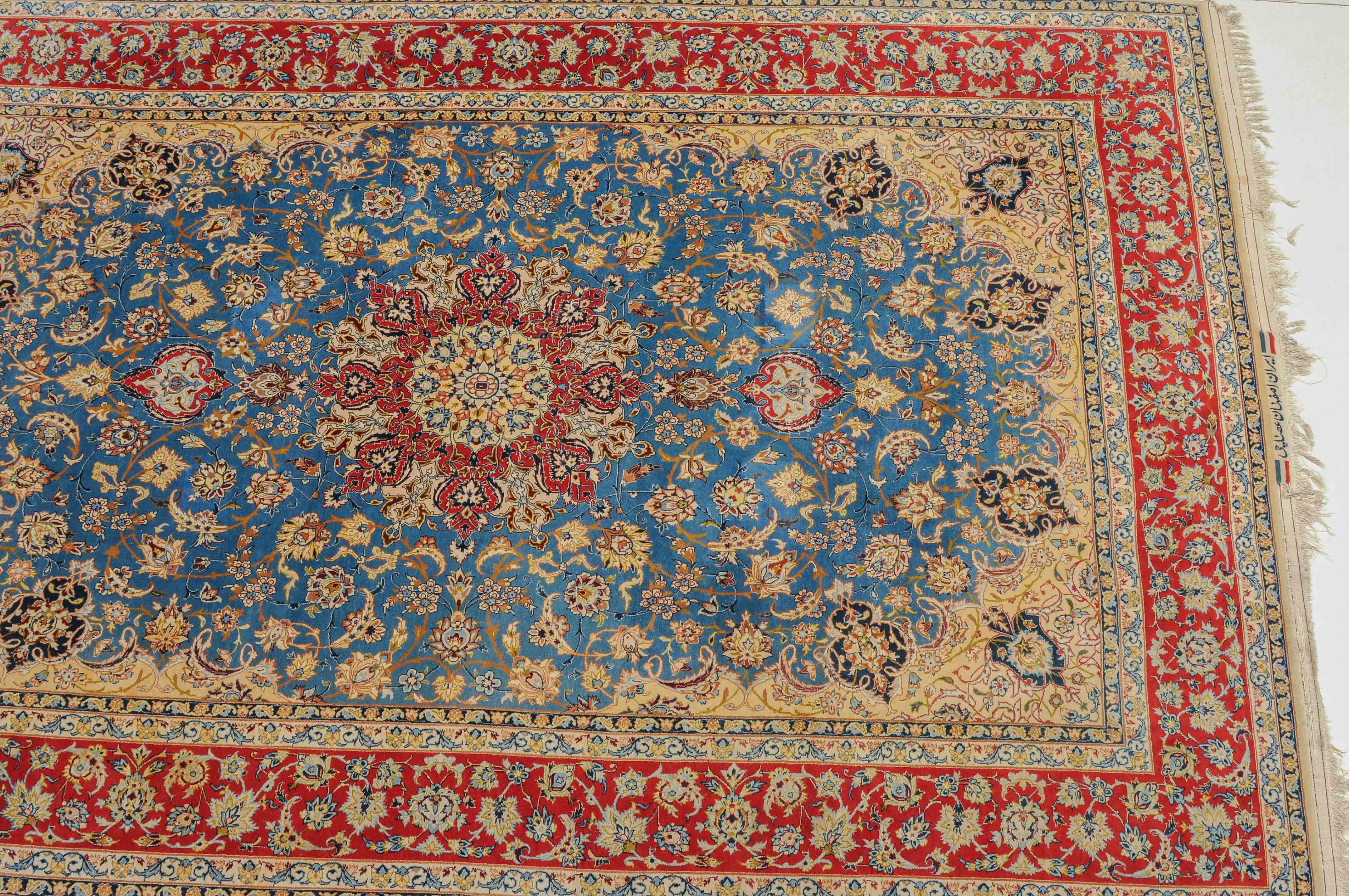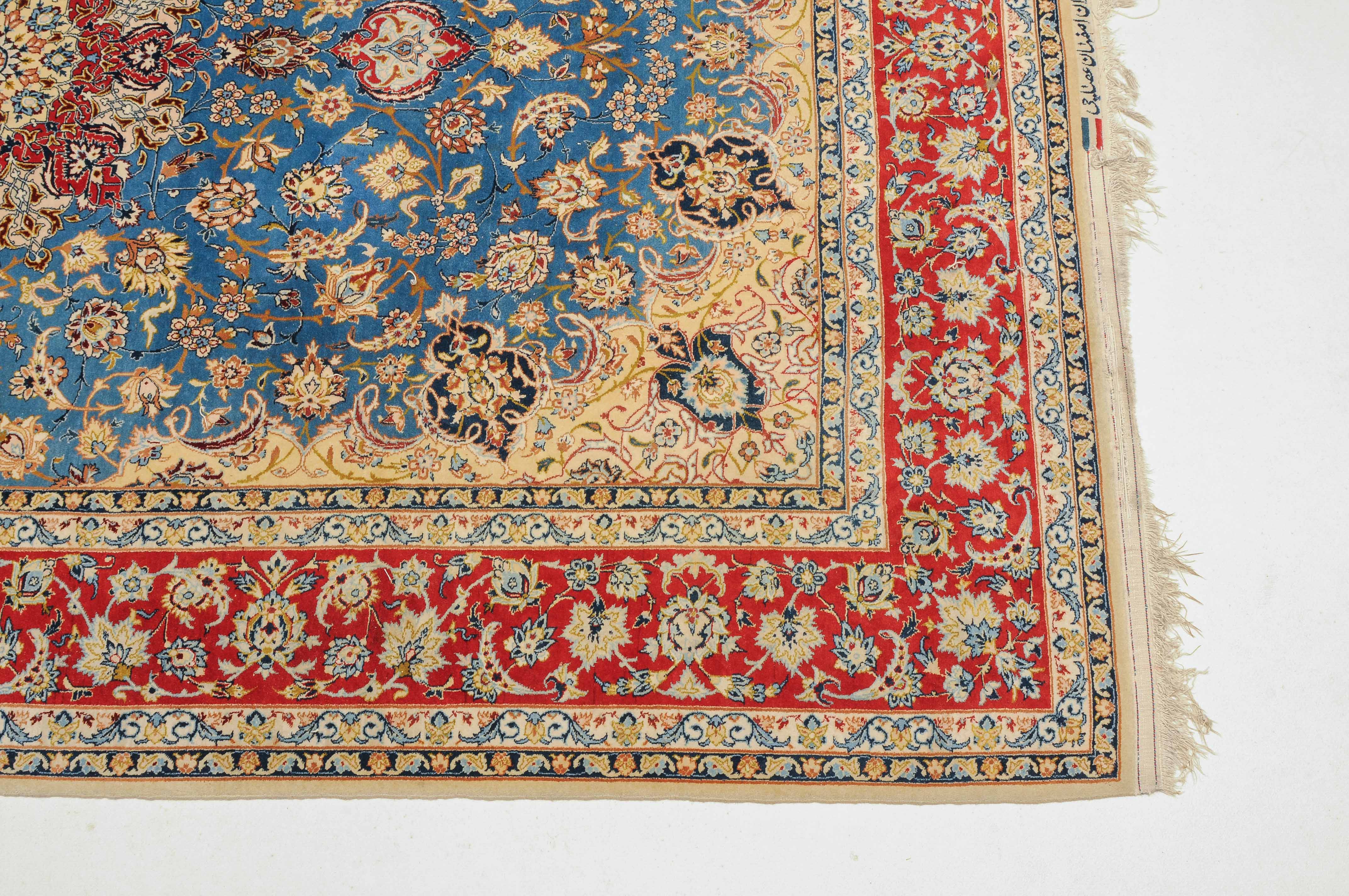 Z-Persien, um 1960. Flormaterial Korkwolle, Kette aus Seide. Unten in der Mitte signiert mit "Isfahan, Iran, Asatchi". Im dekorativen hellblauen Feld ruht ein 8-Pass-Sternmedaillon mit Ausläufern, flankiert von Blütenketten, Blattranken und 4 hellen, miteinander verbundenen Eckzwickeln. 4 floral geschmückte Nebenbordüren umfassen die mit girlandenartig verbundenen Blütenkompositionen belegte rote Bordüre. Gute Erhaltung. 145x218 cm (ft. 4.8x7.2).