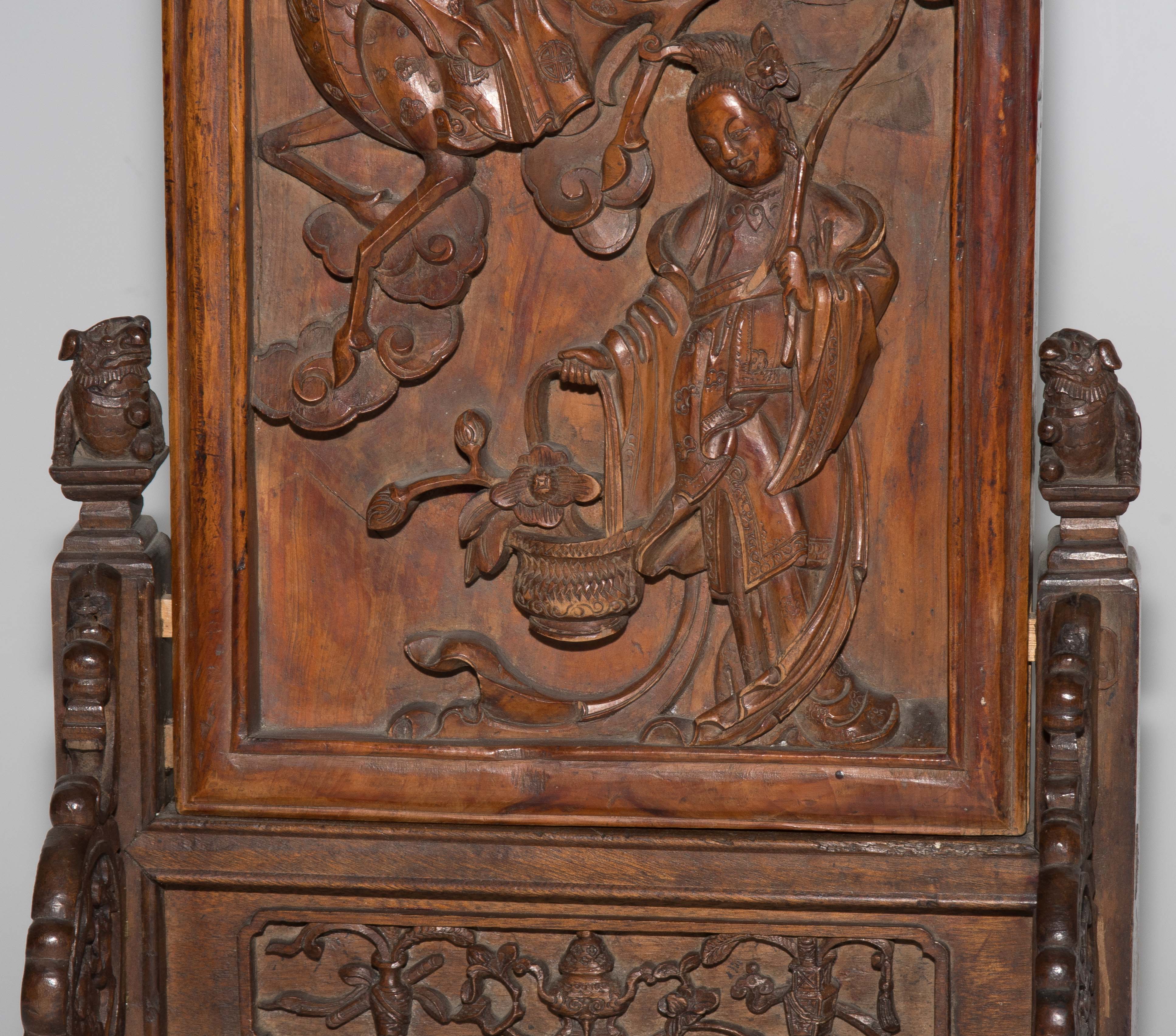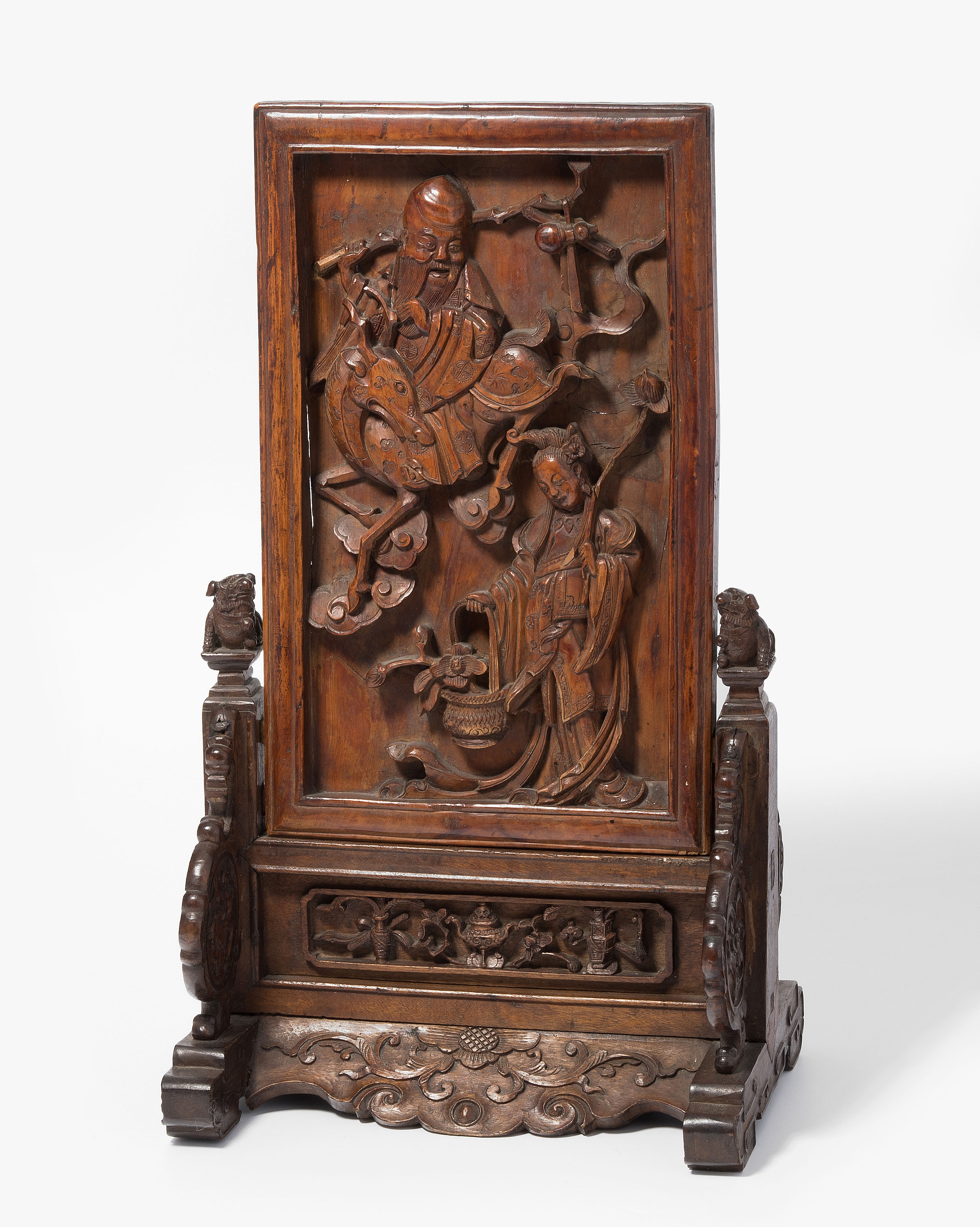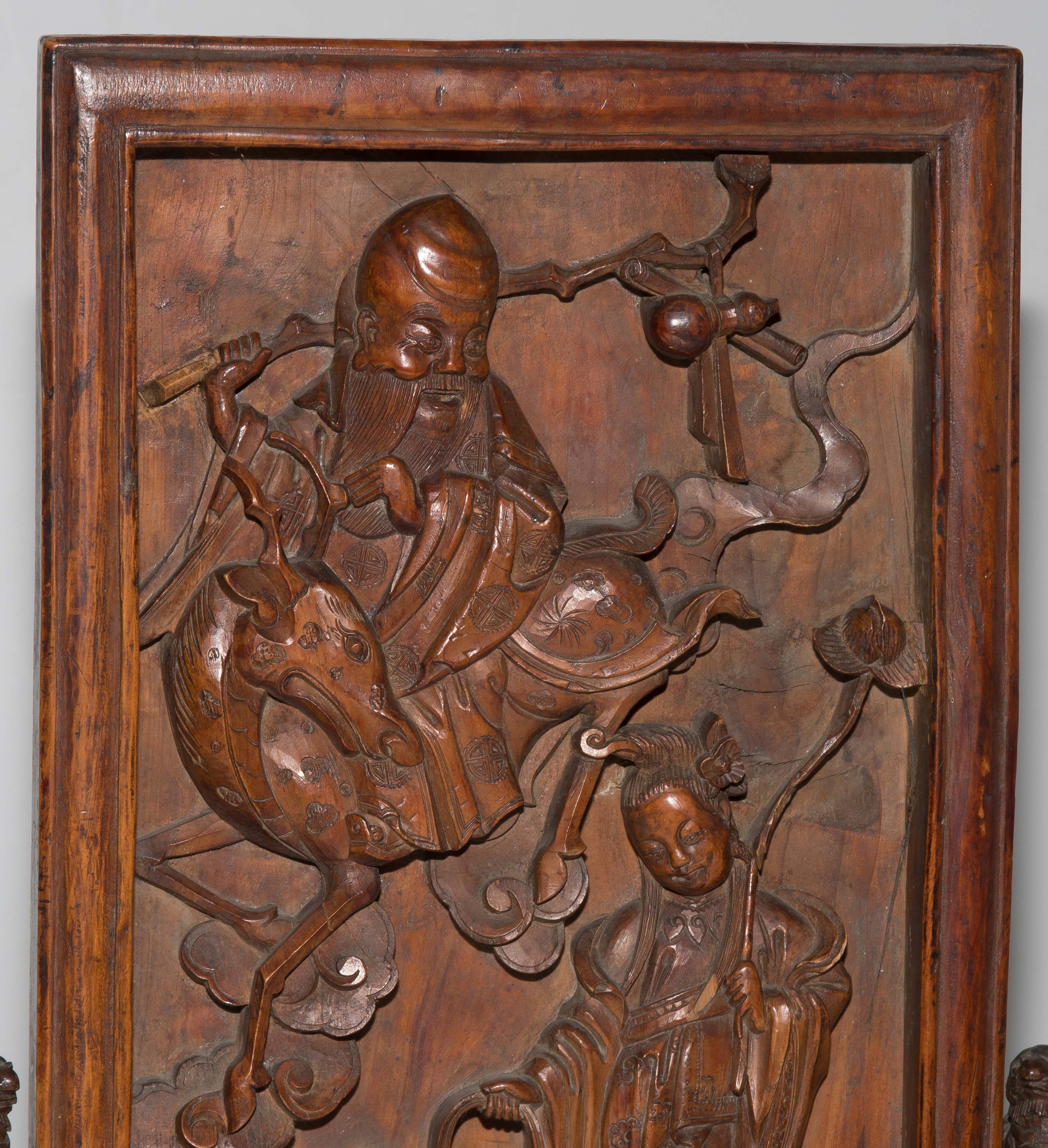 China, um 1900. Rechteckige Holztafel auf Holzstand. Reliefiert mit Shoulao und He Xiangu. 27x17 cm (Tafel). H 37,5, B 21 cm. - Fehlstellen und Risse.