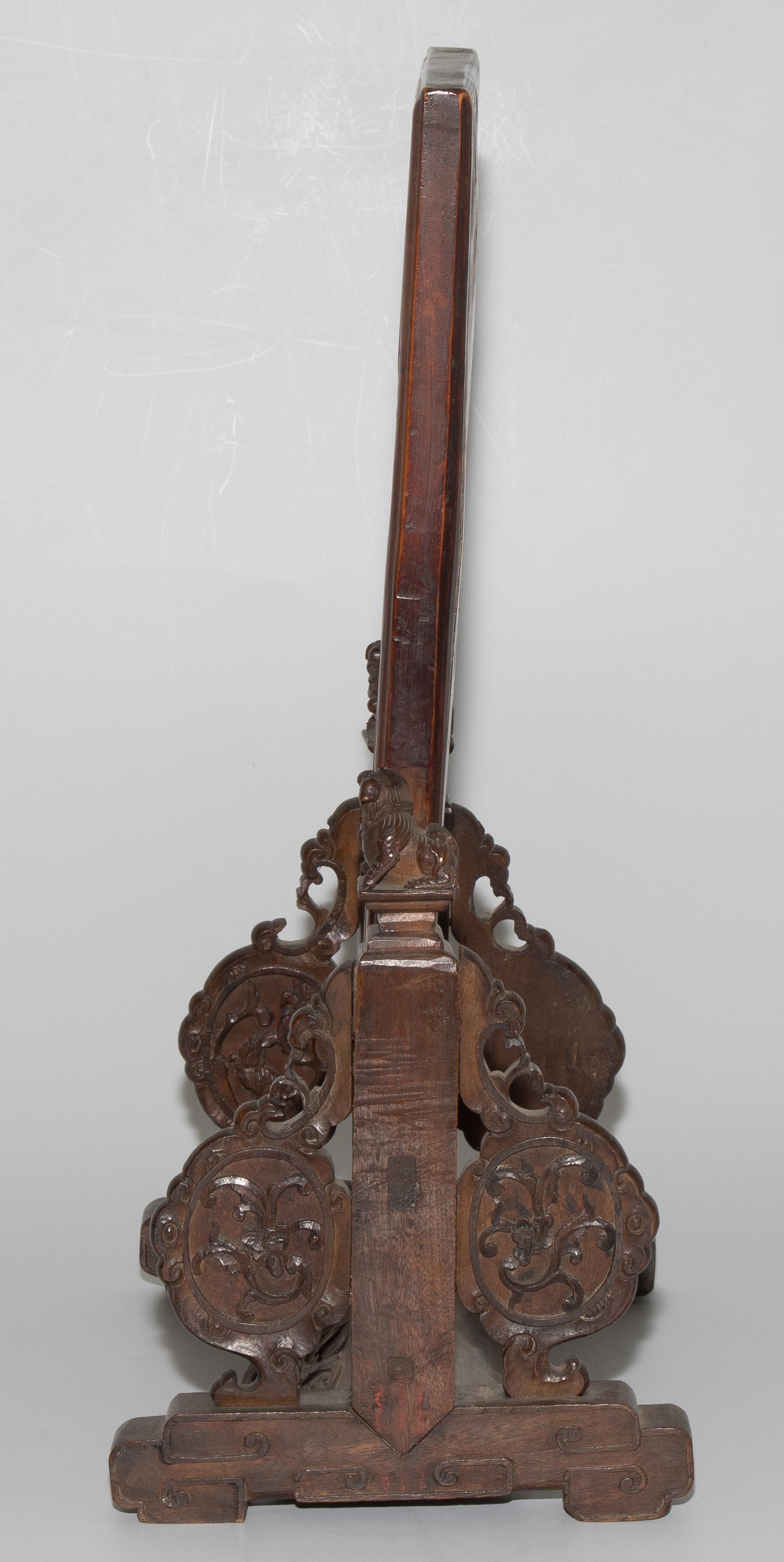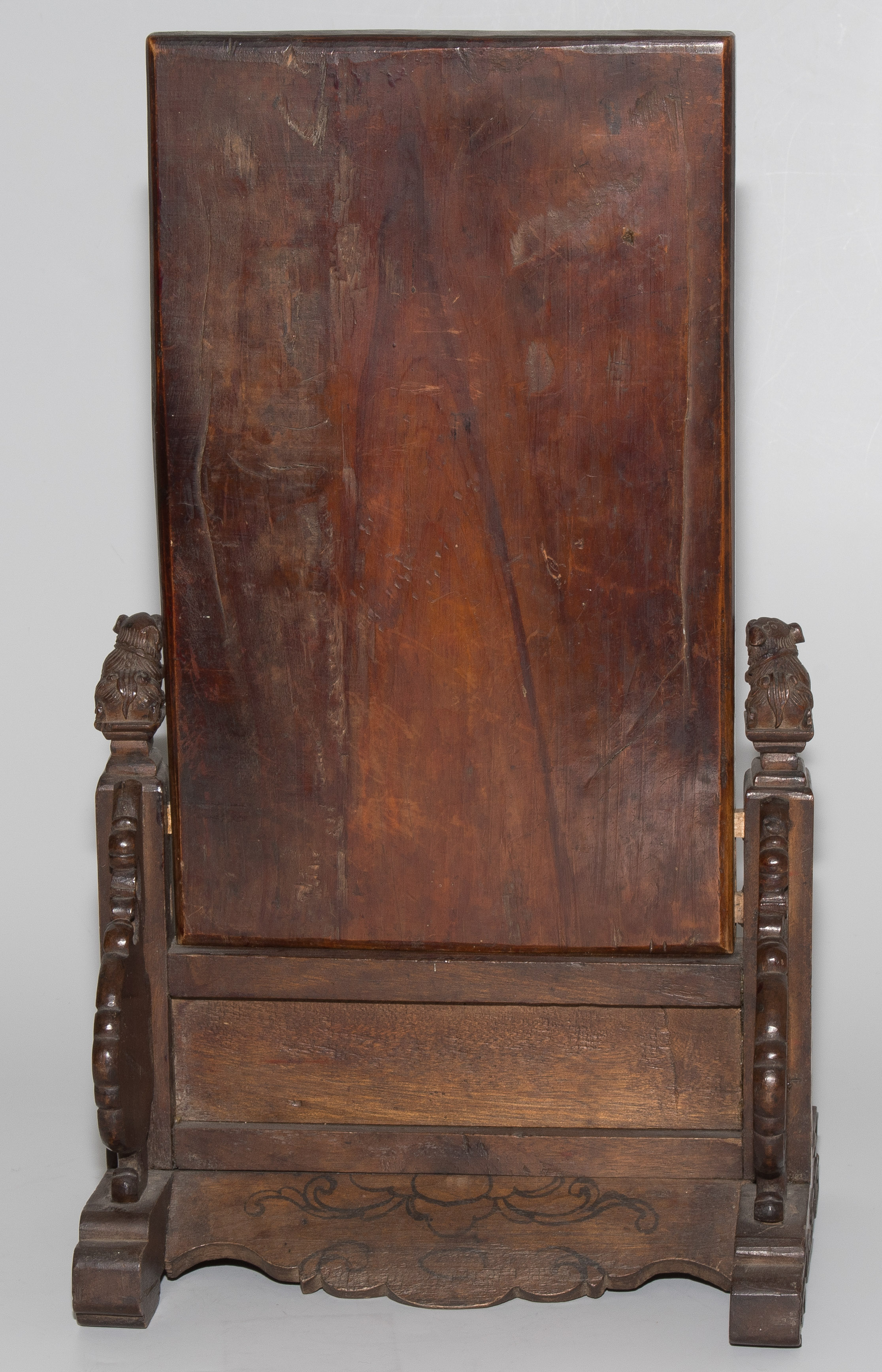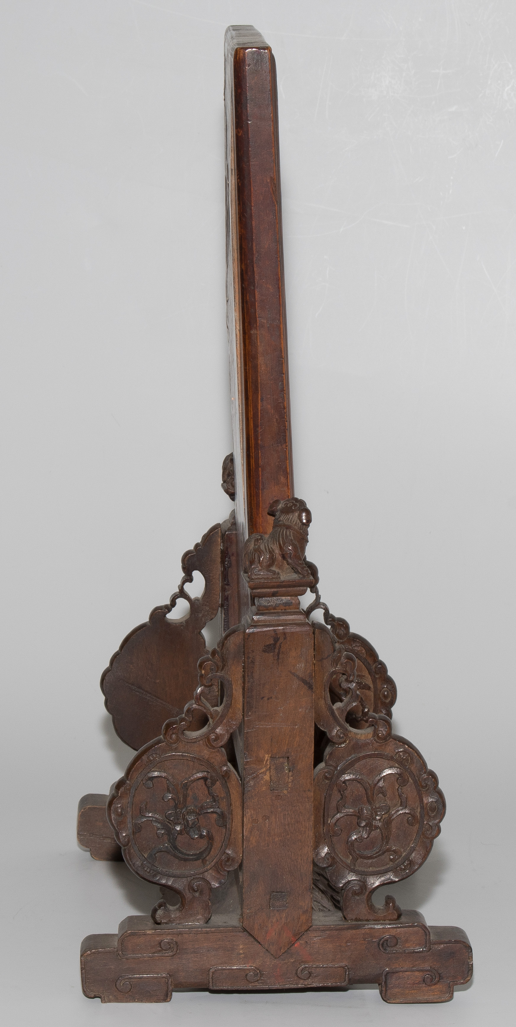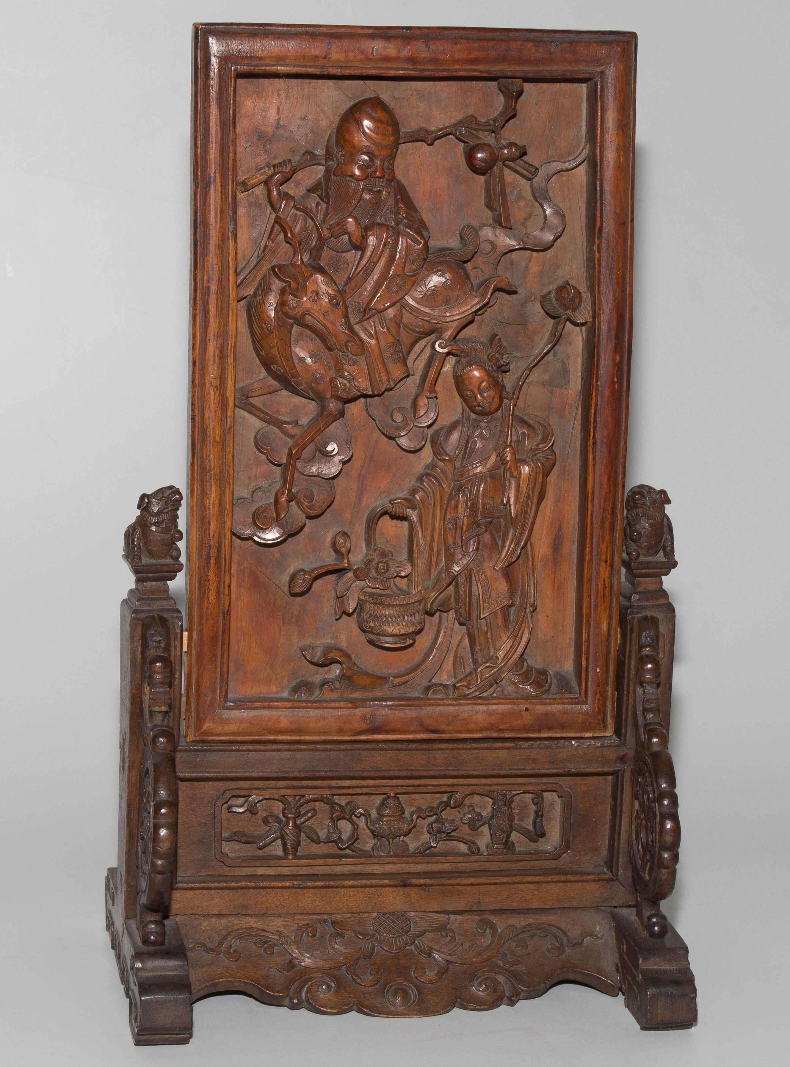 China, um 1900. Rechteckige Holztafel auf Holzstand. Reliefiert mit Shoulao und He Xiangu. 27x17 cm (Tafel). H 37,5, B 21 cm. - Fehlstellen und Risse.