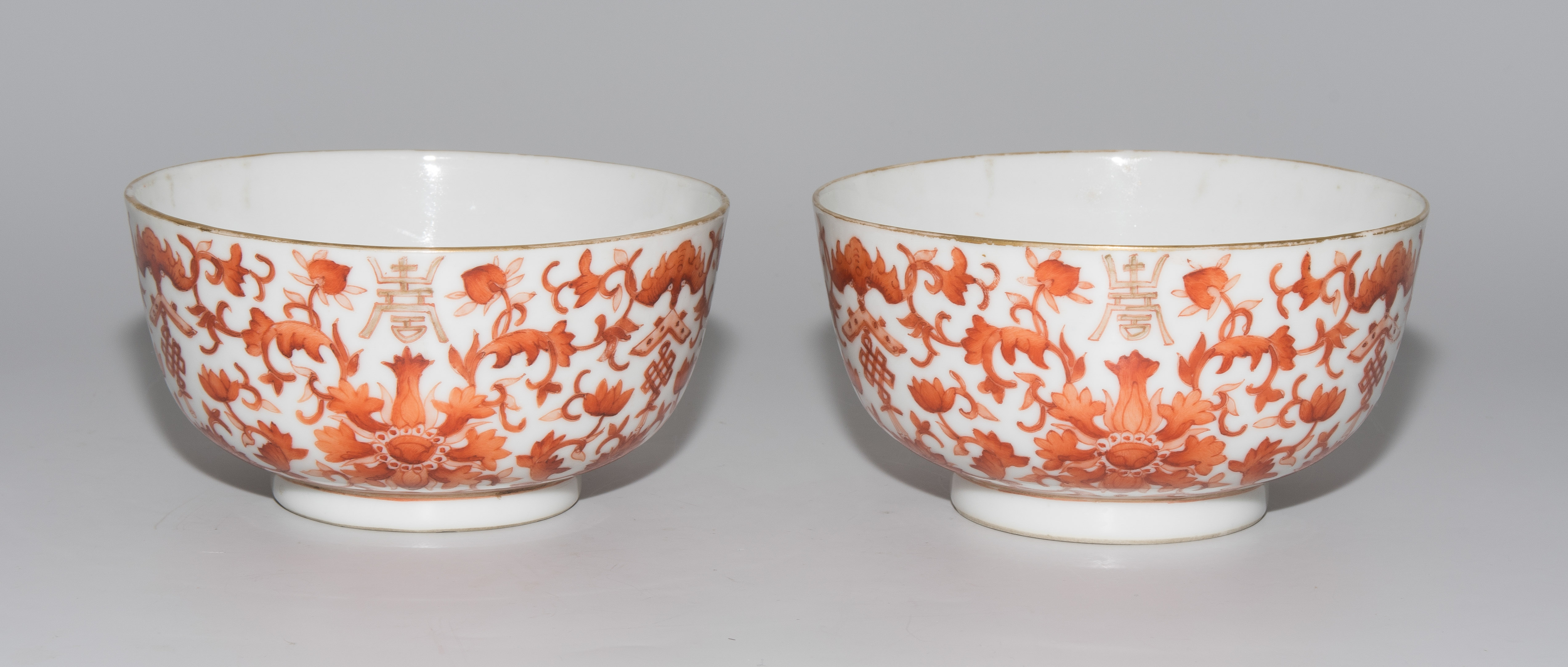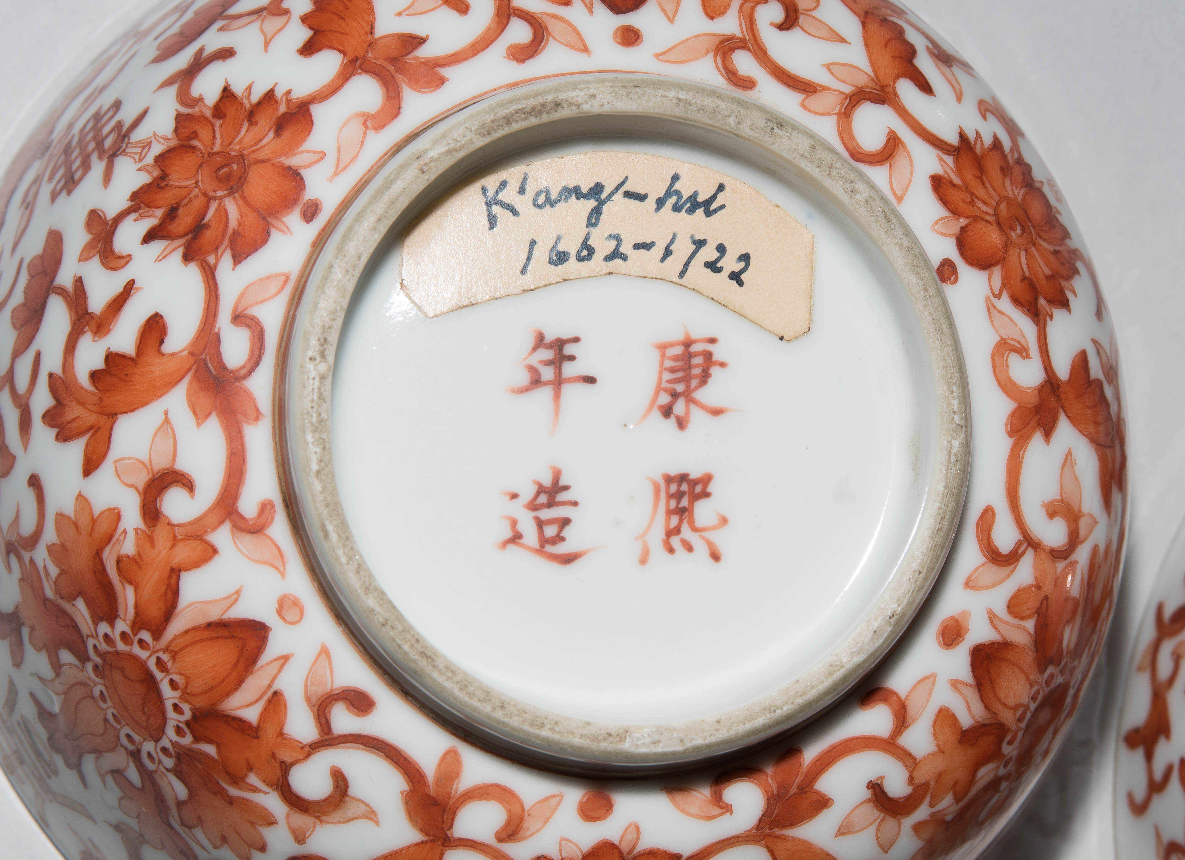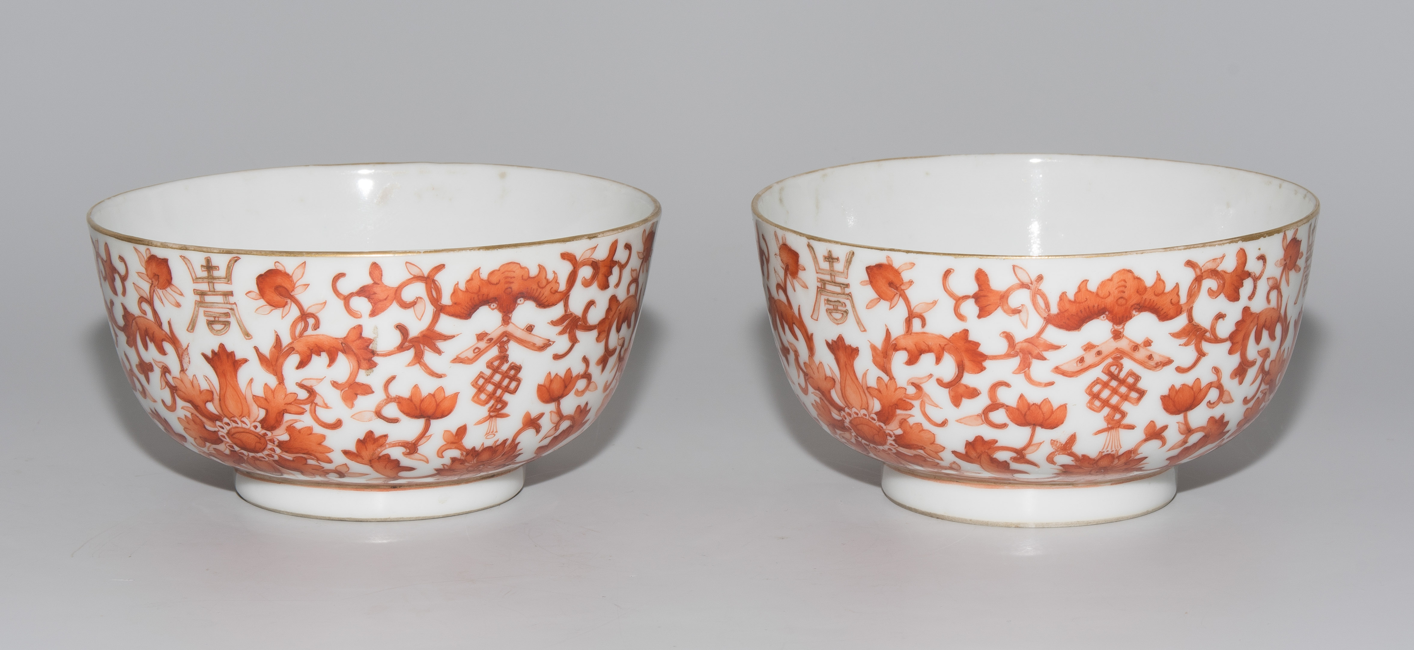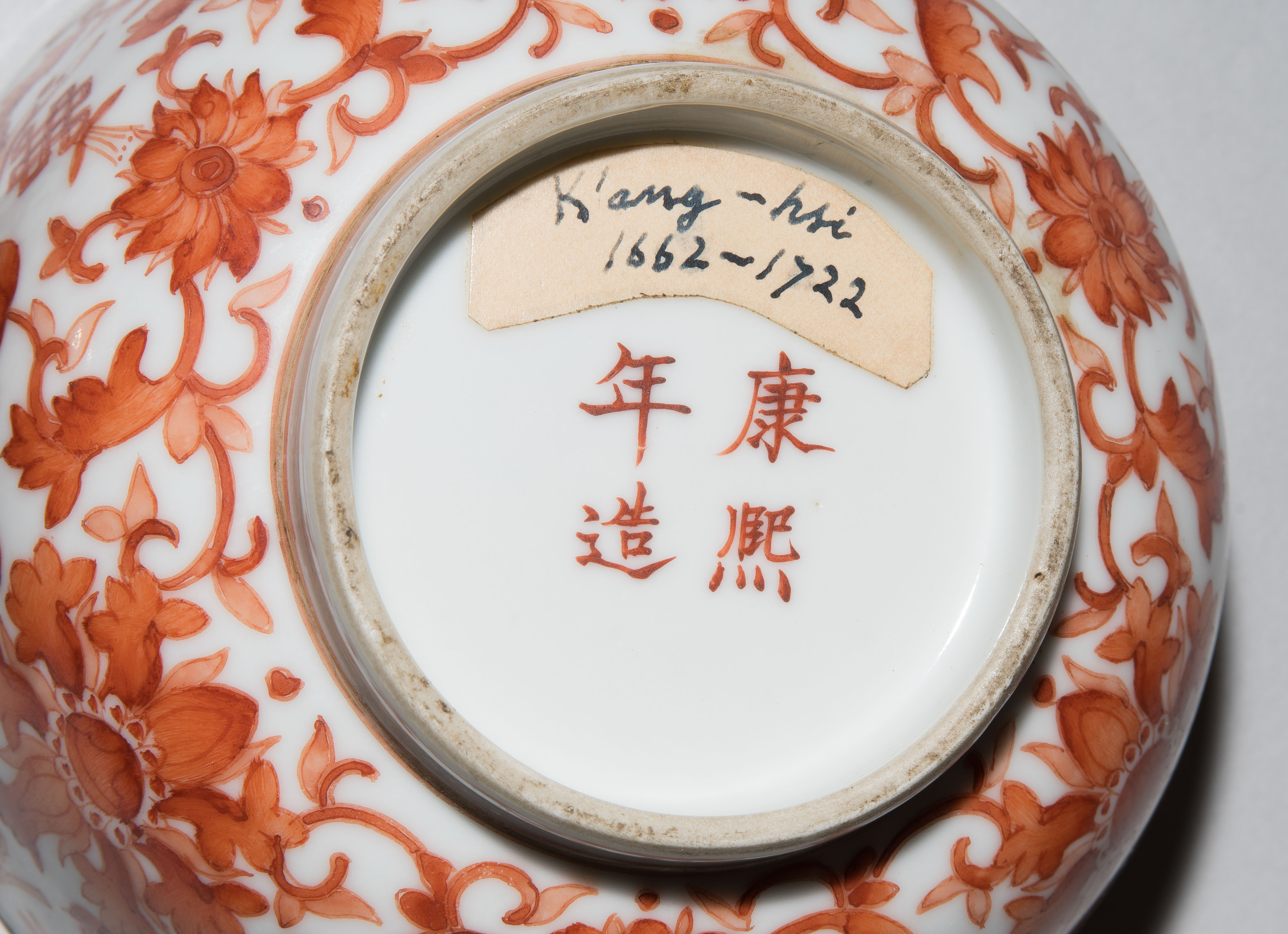 China, 18./19.Jh. Singiert Kangxi nianzao in Eisenrot. Eisenroter Lotosblumenrankendekor mit Fledermaus und Shou-Schriftzeichen in Gold. Rand dünn vergoldet. H 6, D 12 cm.