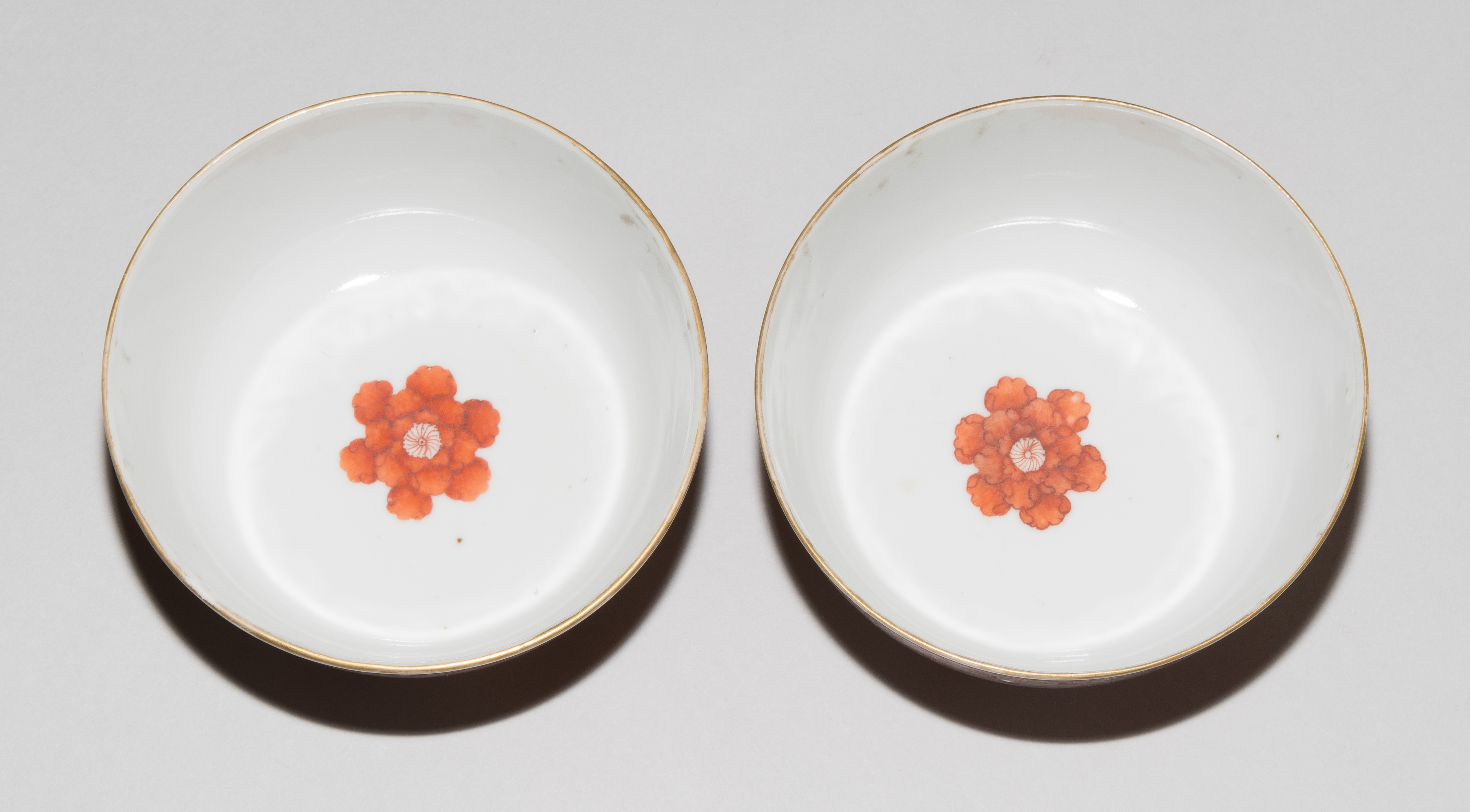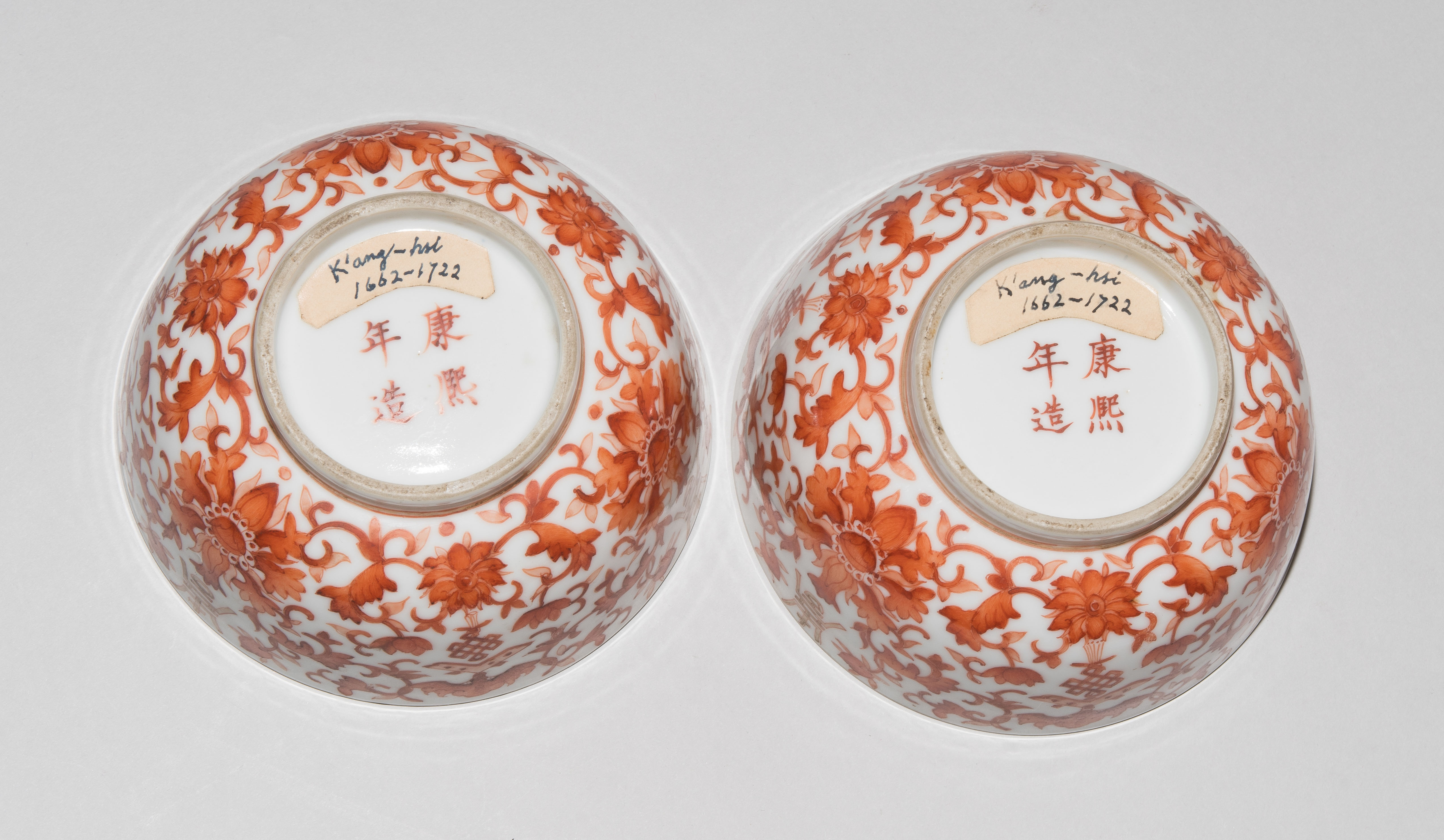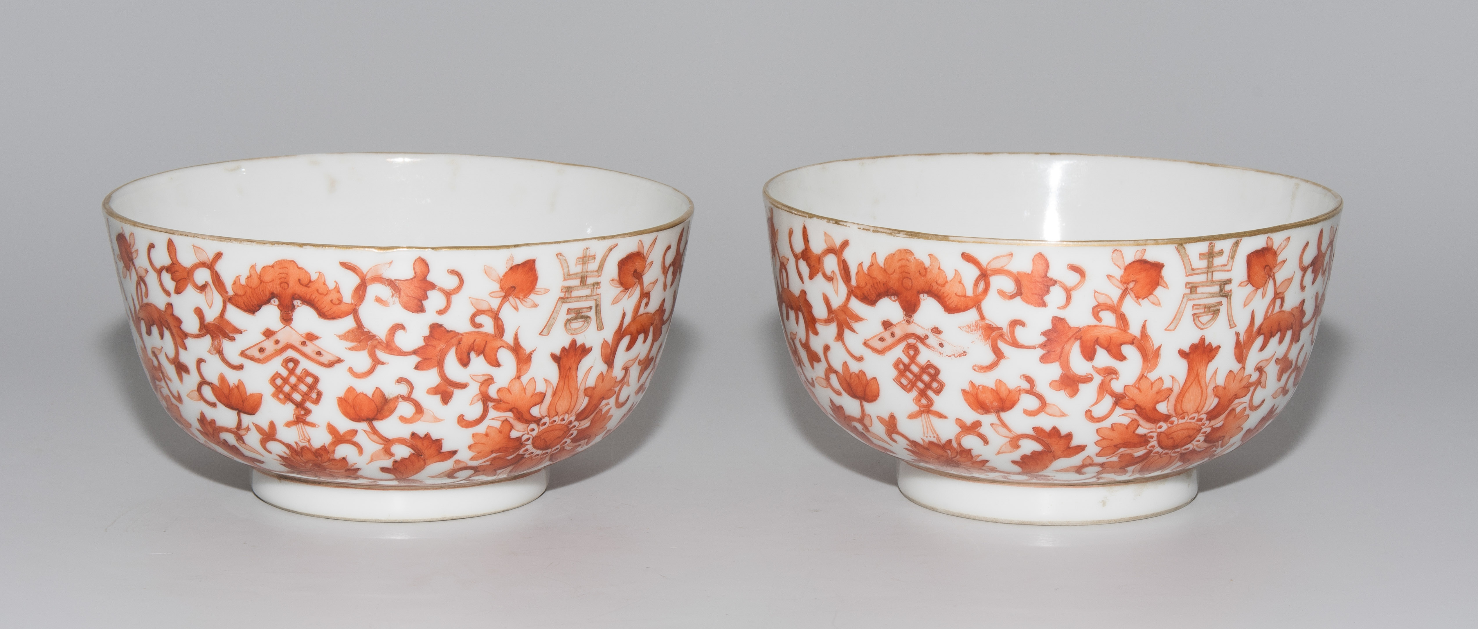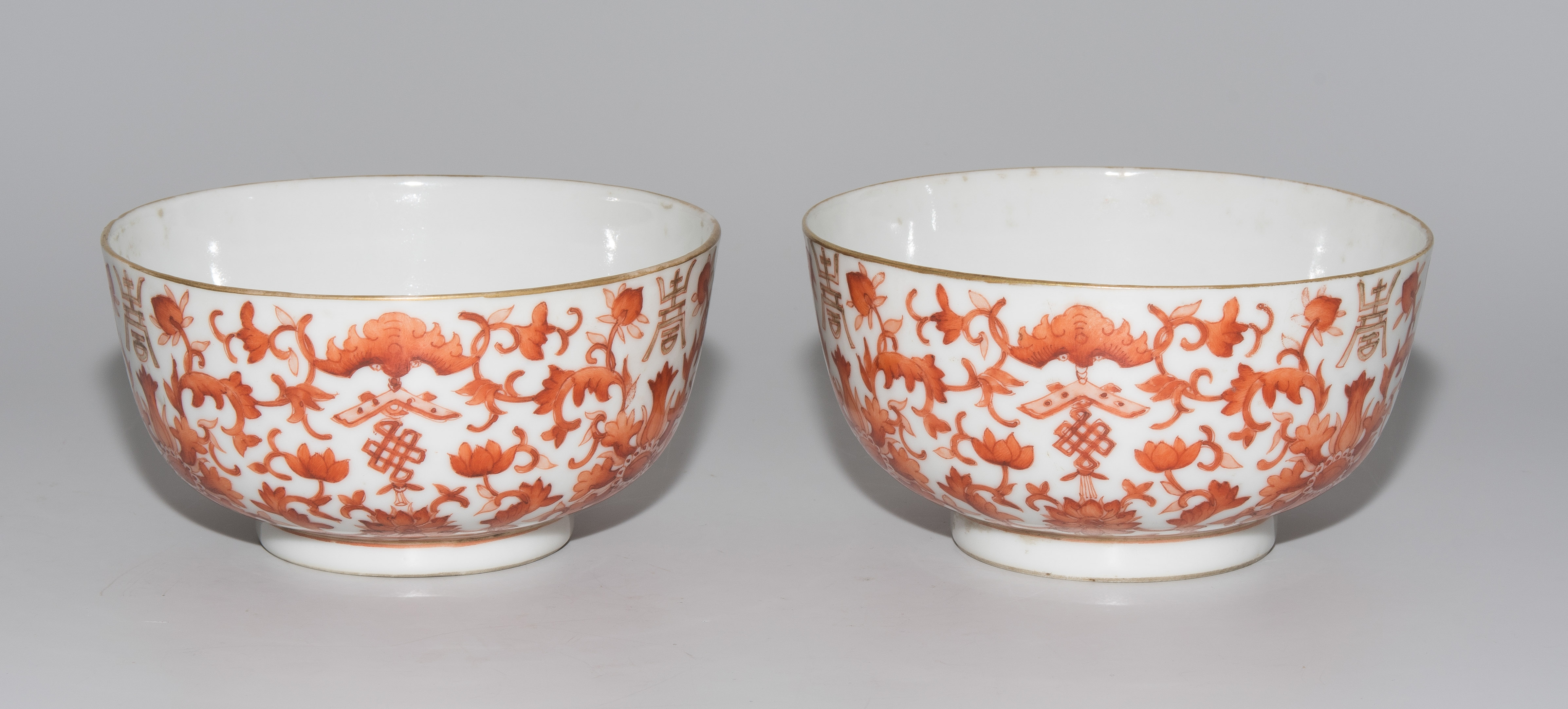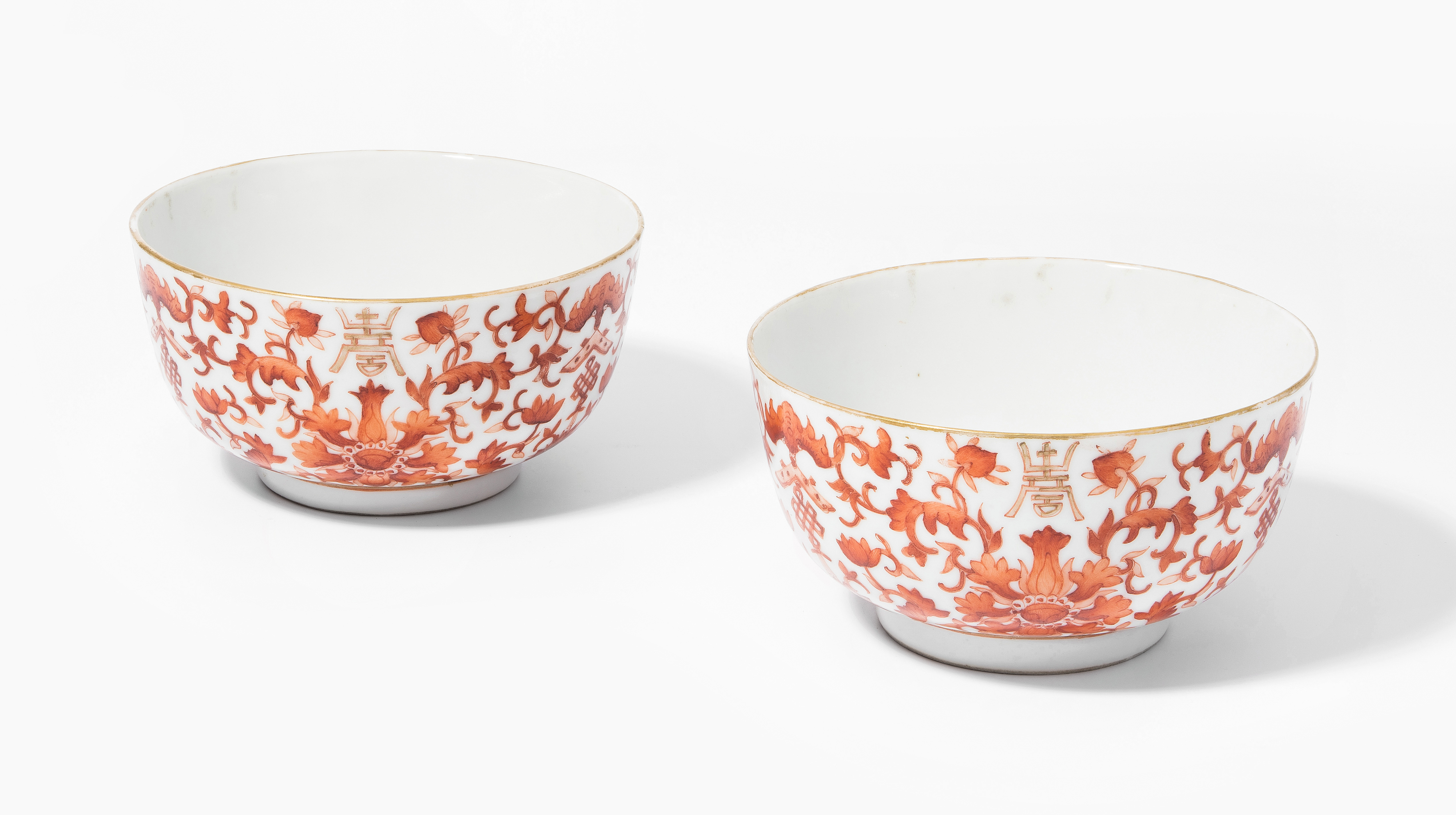 China, 18./19.Jh. Singiert Kangxi nianzao in Eisenrot. Eisenroter Lotosblumenrankendekor mit Fledermaus und Shou-Schriftzeichen in Gold. Rand dünn vergoldet. H 6, D 12 cm.