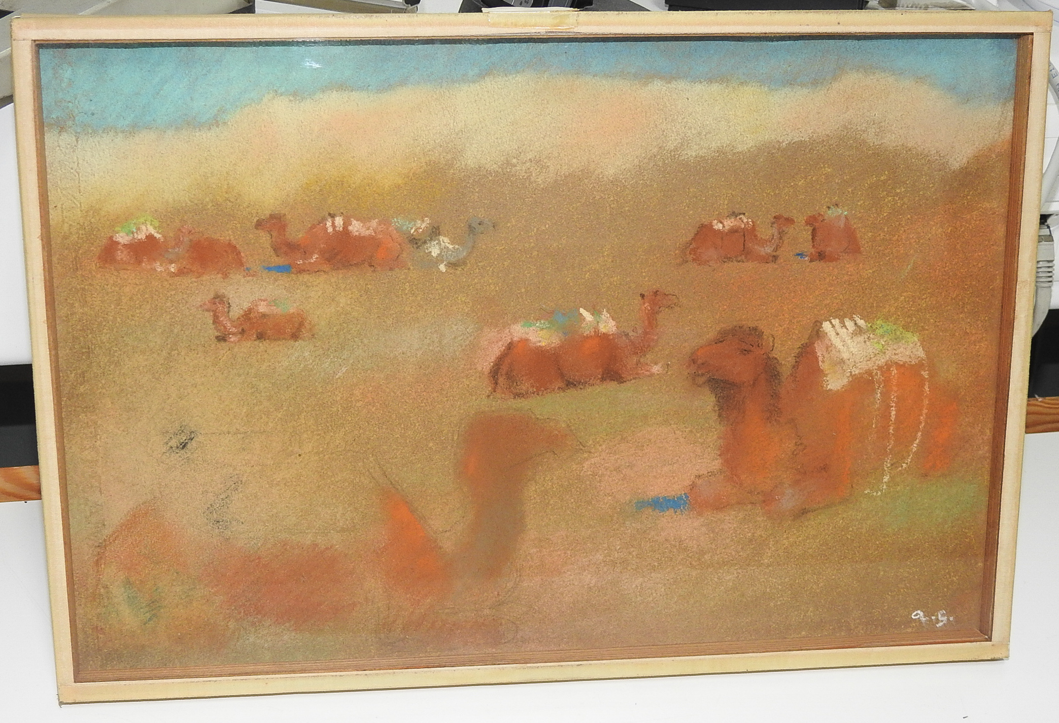 Kamele bei der Rast. Pastell auf Papier. Unten rechts monogrammiert. Lichtmass 23,2x35 cm. Gerahmt. -Dieses Werk wurde nicht ausgerahmt.