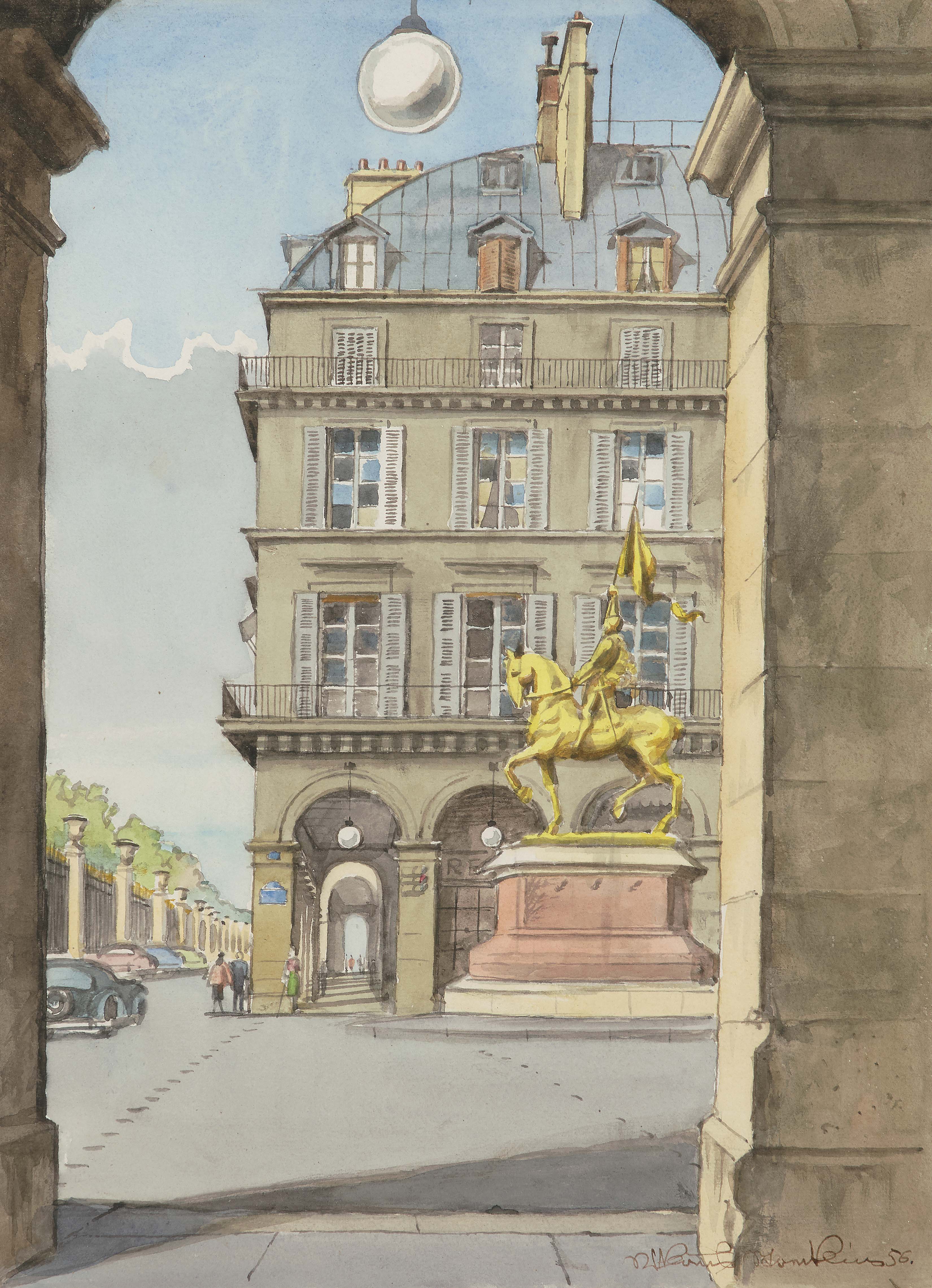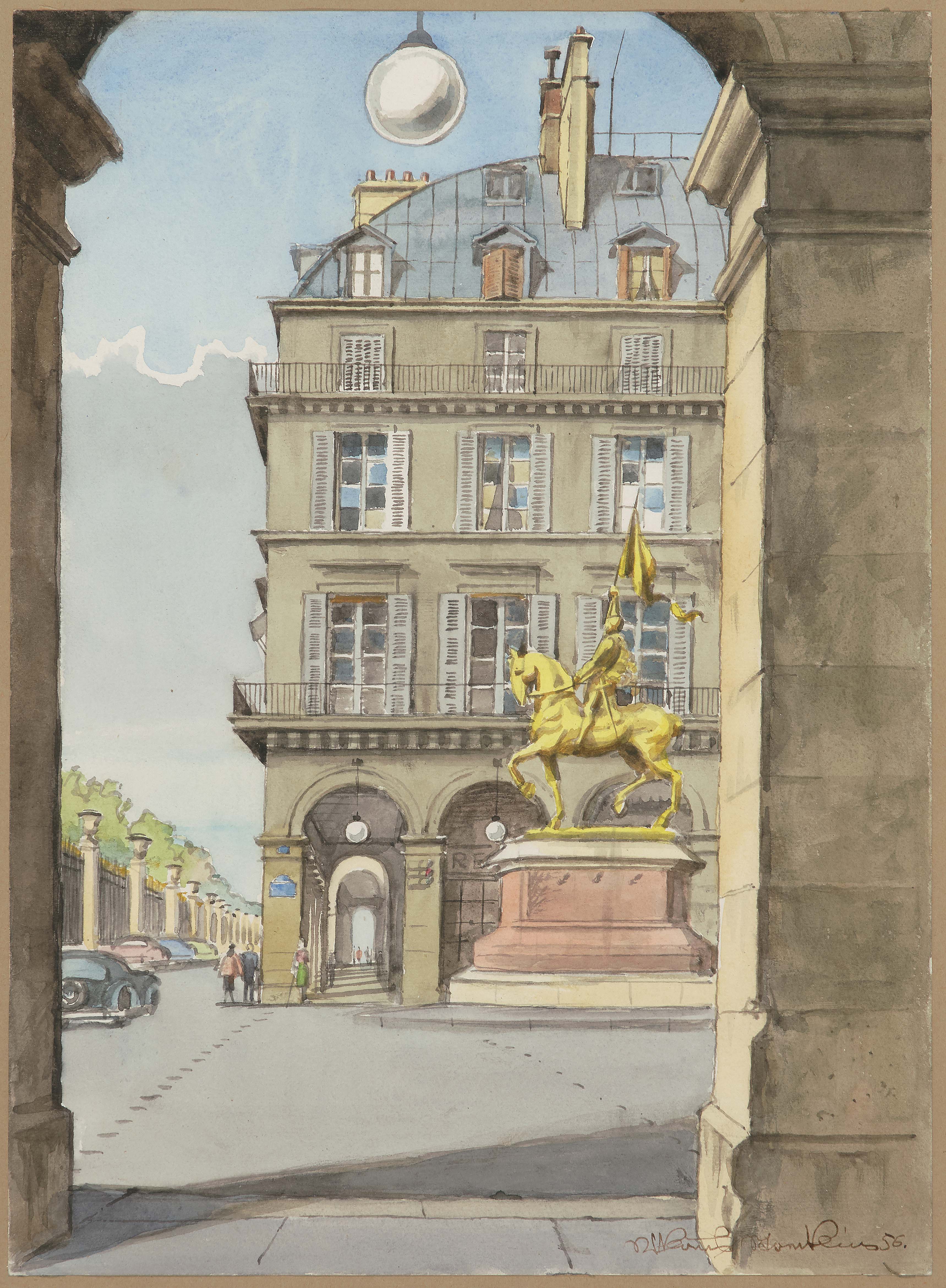 Place des Pyramides, Ecke Rue de Rivoli, Arcade de l'Hôtel Regina, Jeanne d'Arc. 1956. Aquarell auf Papier. Unten rechts in Tusche signiert und datiert. Blattgrösse 36,8x26,9 cm. Gerahmt. -Blatt minimst gebräunt. Ränder und Ecken minimst bestossen. Verso am oberen Rand an Rückkarton montiert. Verso mit Klebspurresten.