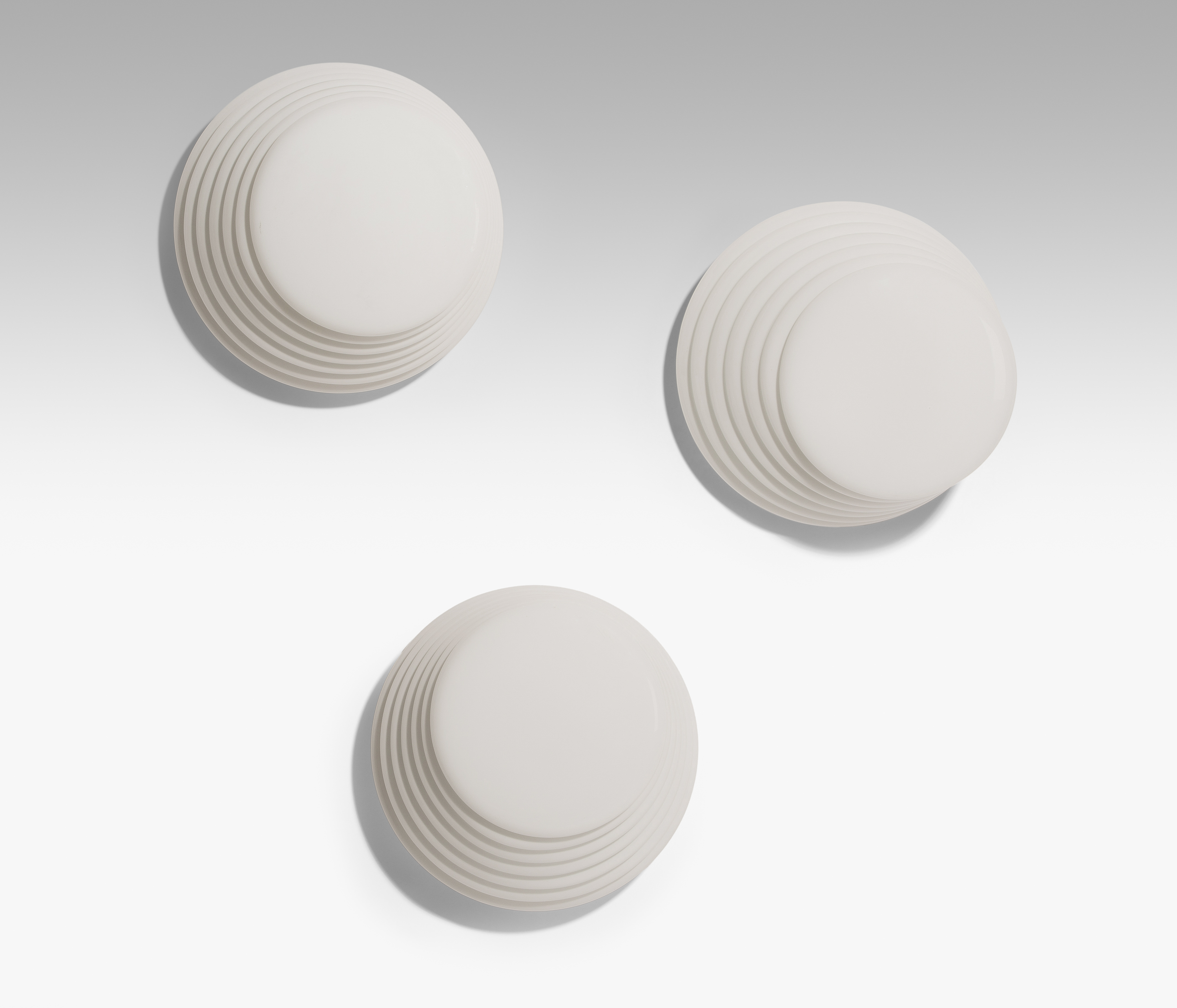 5 Decken- bzw. Wandlampen "Coba". Entwurf: Roberto Pamio & Renato Toso. Ausführung Glas: vetri murano, 1980er Jahre. Weiss überfangenes Glas, schrägoptisch, Kunststoff. 26x27x13 cm.