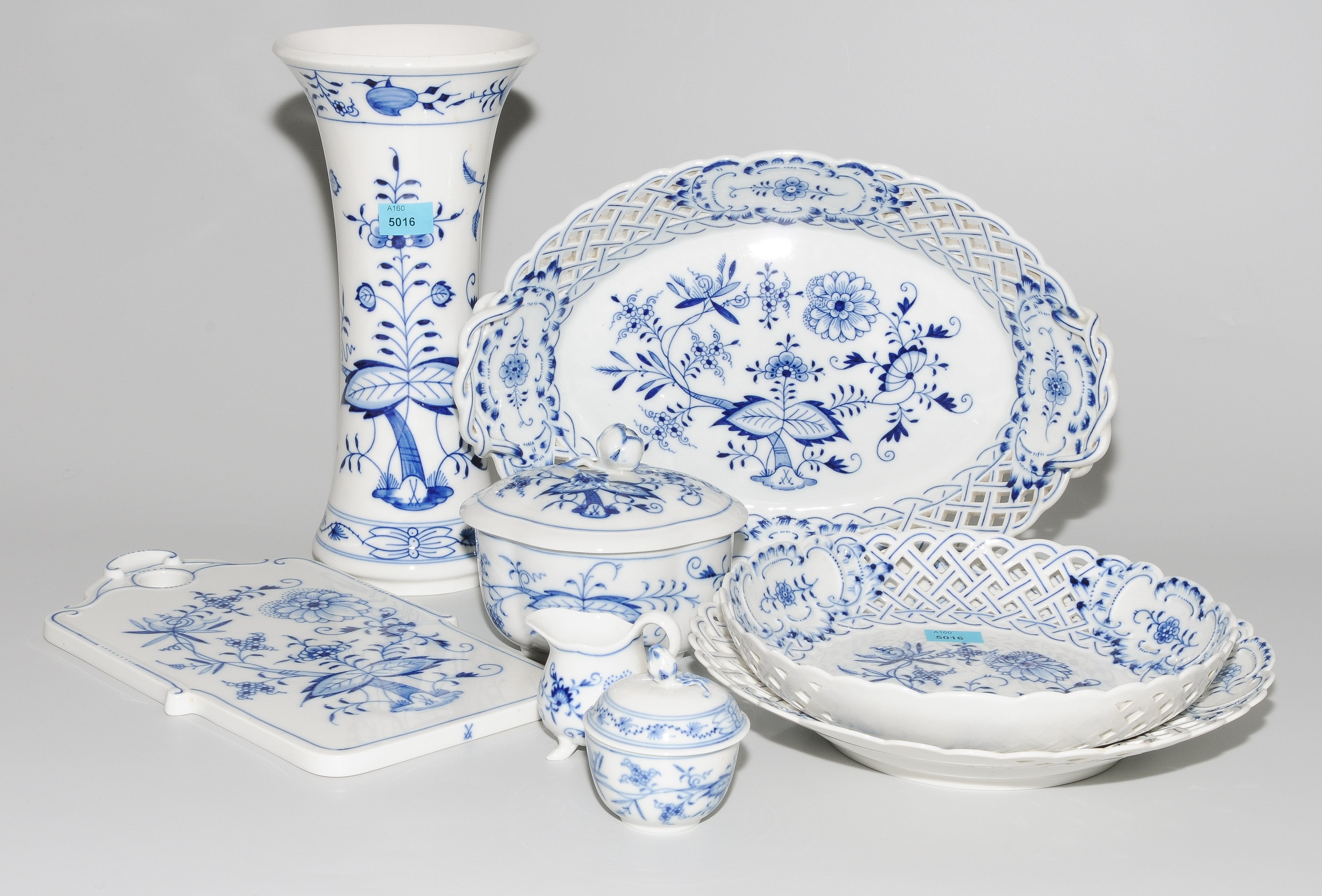 Lot Serviceteile "Zwiebelmuster". Ausführung 20.Jh. Porzellan. Bezeichnet: Schwertermarke (1. u. 2. Wahl). Bestand: 1 runde Schale mit Gitterrand (D 21 cm; 2. Wahl), 1 runder Teller mit Gitterrand (D 24,5 cm; 2. Wahl), 1 ovale Schale mit Gitterrand (L 30 cm; 1. Wahl), 1 vierpassförmige Bonbonniere (1. Wahl), 1 kleines Cremier mit Zuckerdose (1. Wahl), 1 Butterplättchen, 1 Vase (H 25,5; 2. Wahl).