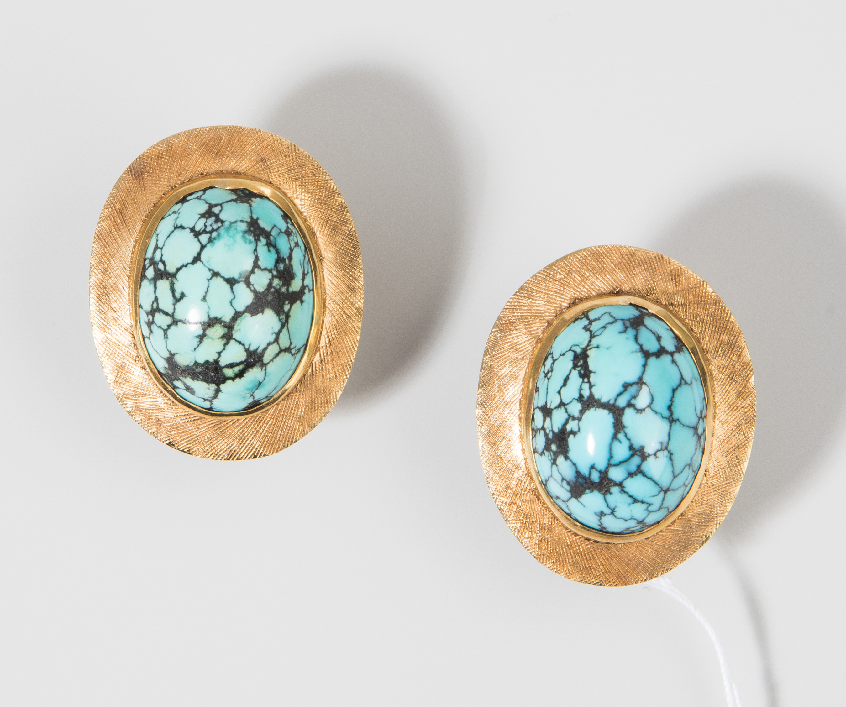 585 Gelbgold. Je mit einem wohl Arizona-Türkis Cabochon ca. 18 ct. 2,3x18,5 cm, 11,4 g.