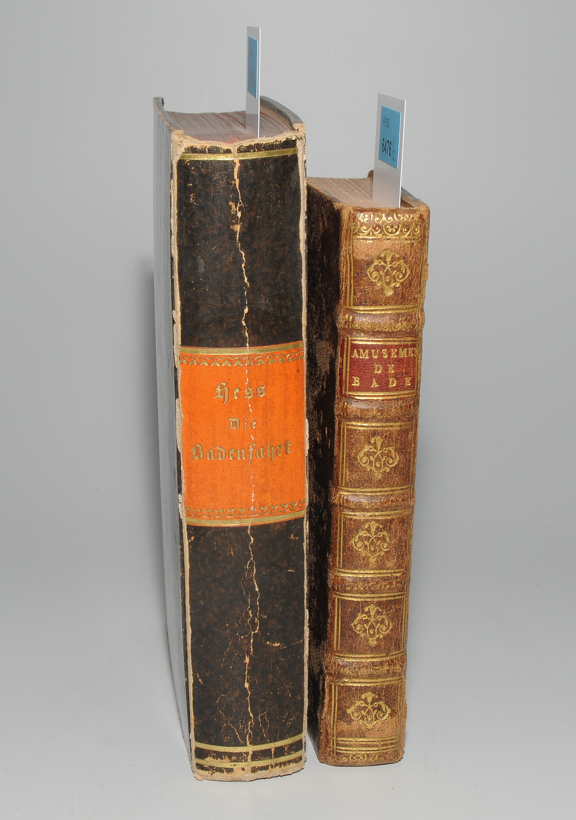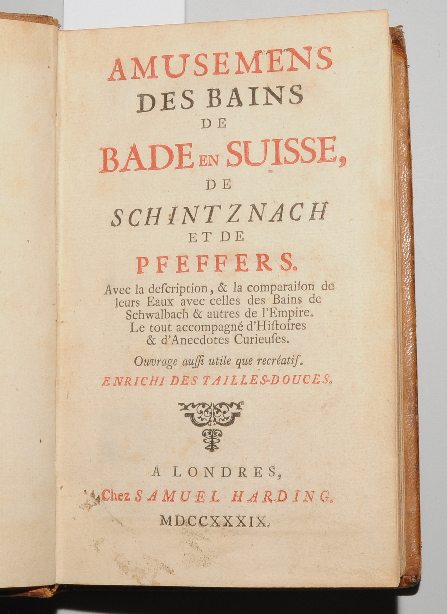 Amusemens des bains de Bade en Suisse, de Schintznach et de Pfeffers. Mit 1 gestoch., ausklappb. Karte der Schweiz und 5 Kupferstich- Ansichten. London, Harding 1739. Lederband mit Rückengoldprägung. Schöne Erhaltung.