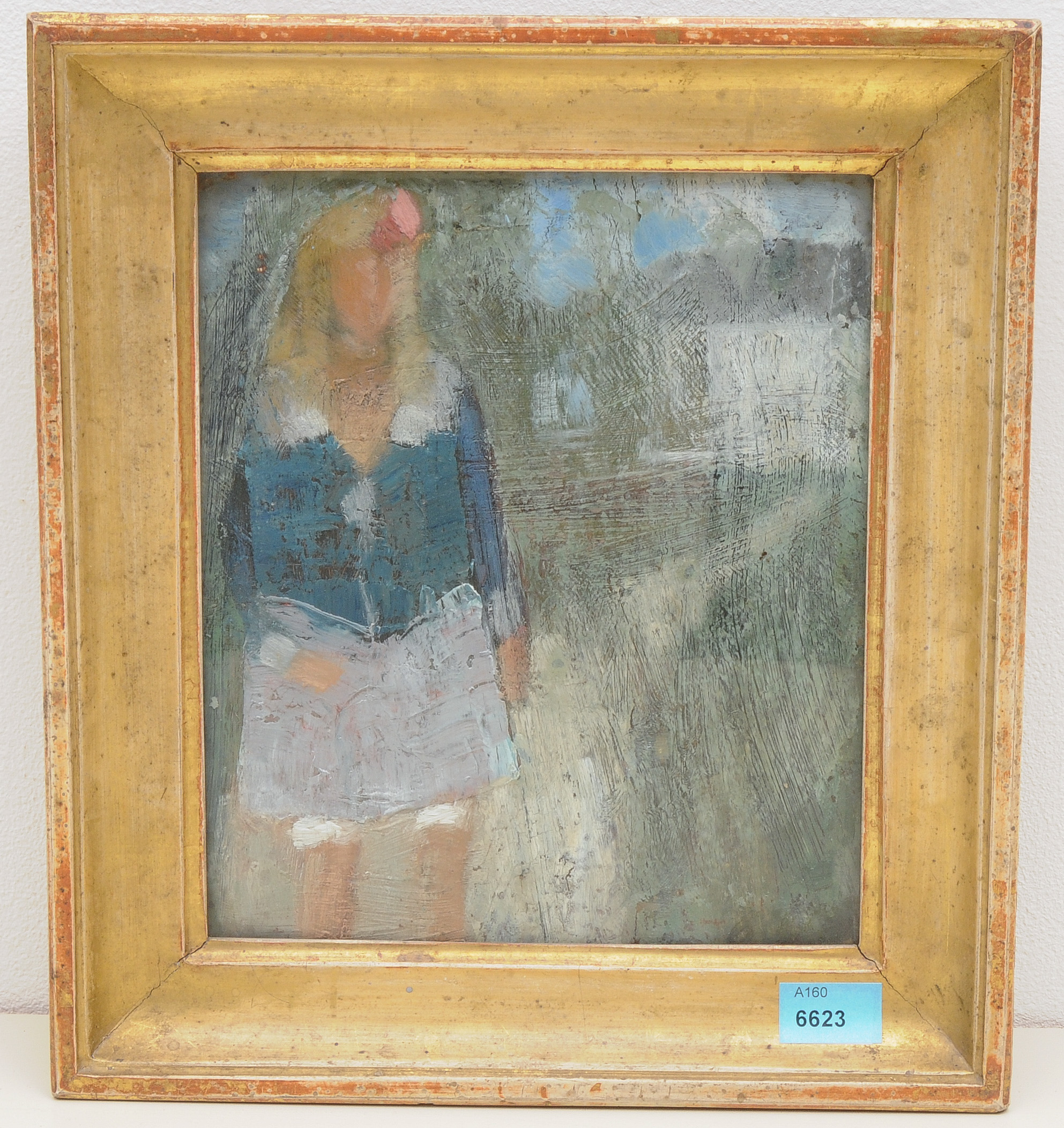 Studie eines Mädchens mit rosa Haarschleife. Öl auf Leinwand. 20x17 cm.