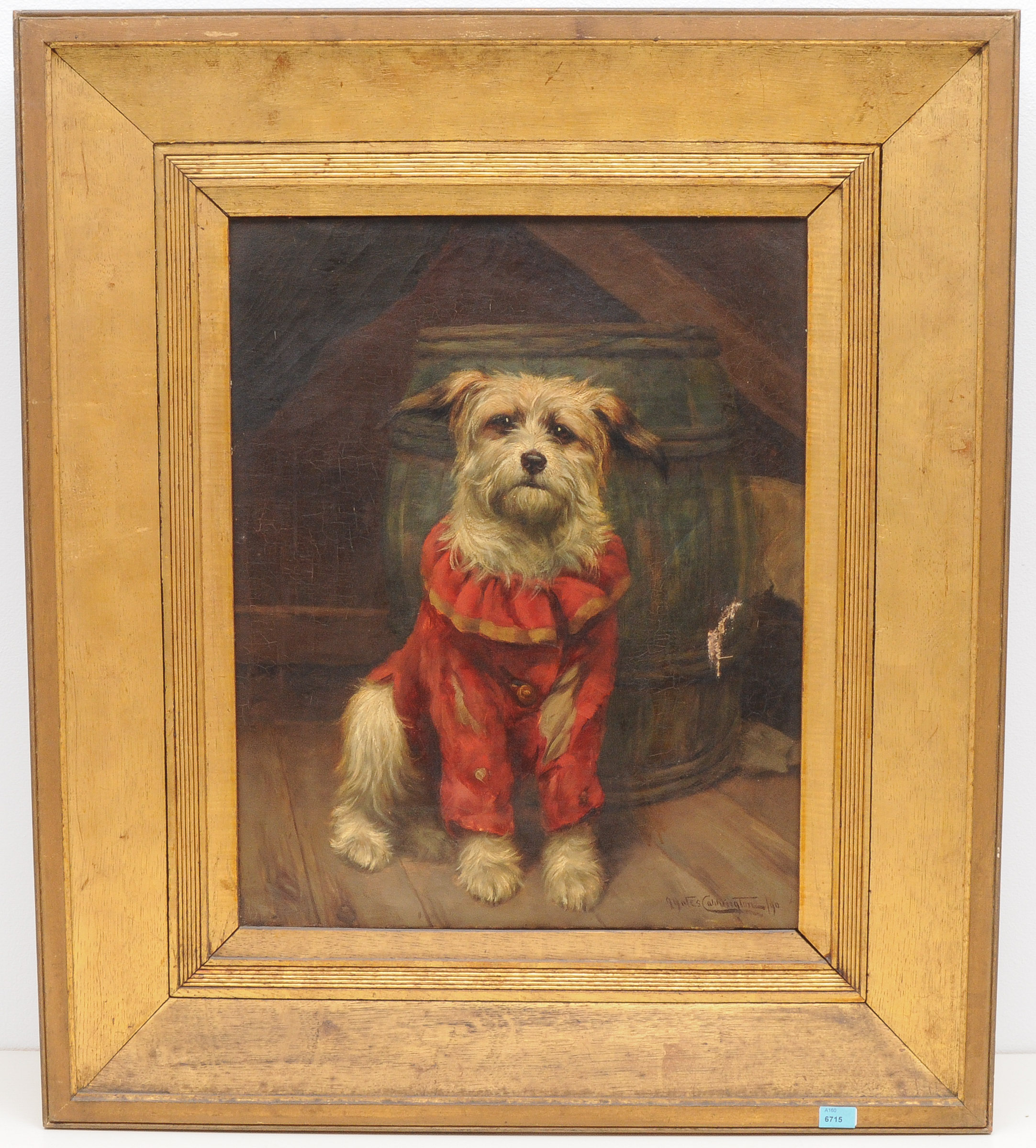 Hund im roten Kostüm. 1890. Öl auf Leinwand. Unten rechts signiert und datiert. 50,5x40,5 cm.