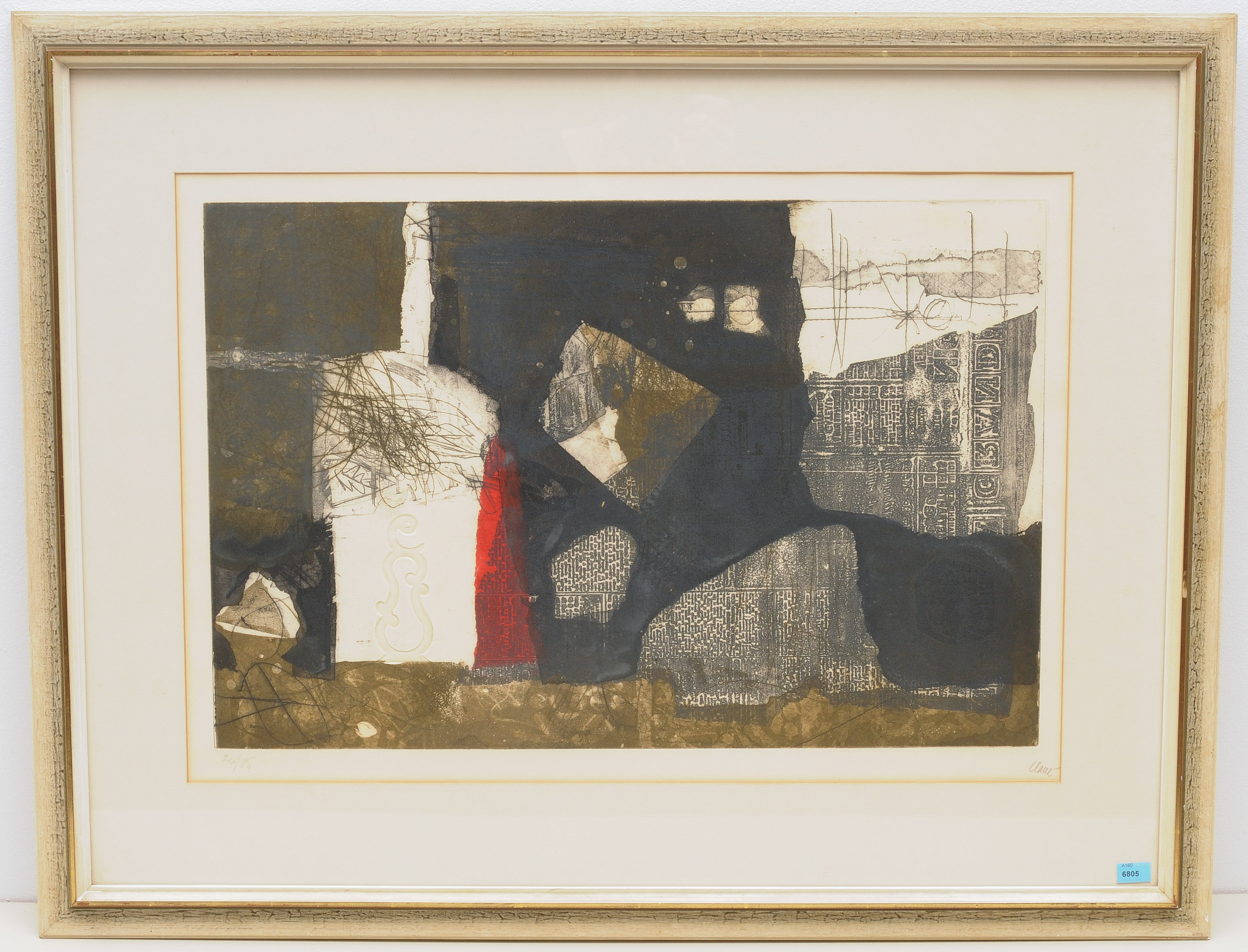 Ohne Titel. Farbaquatintaradierung mit Prägedruck. 26/85. Unten rechts signiert. Lichtmass 43,5x63 cm. Gerahmt.
