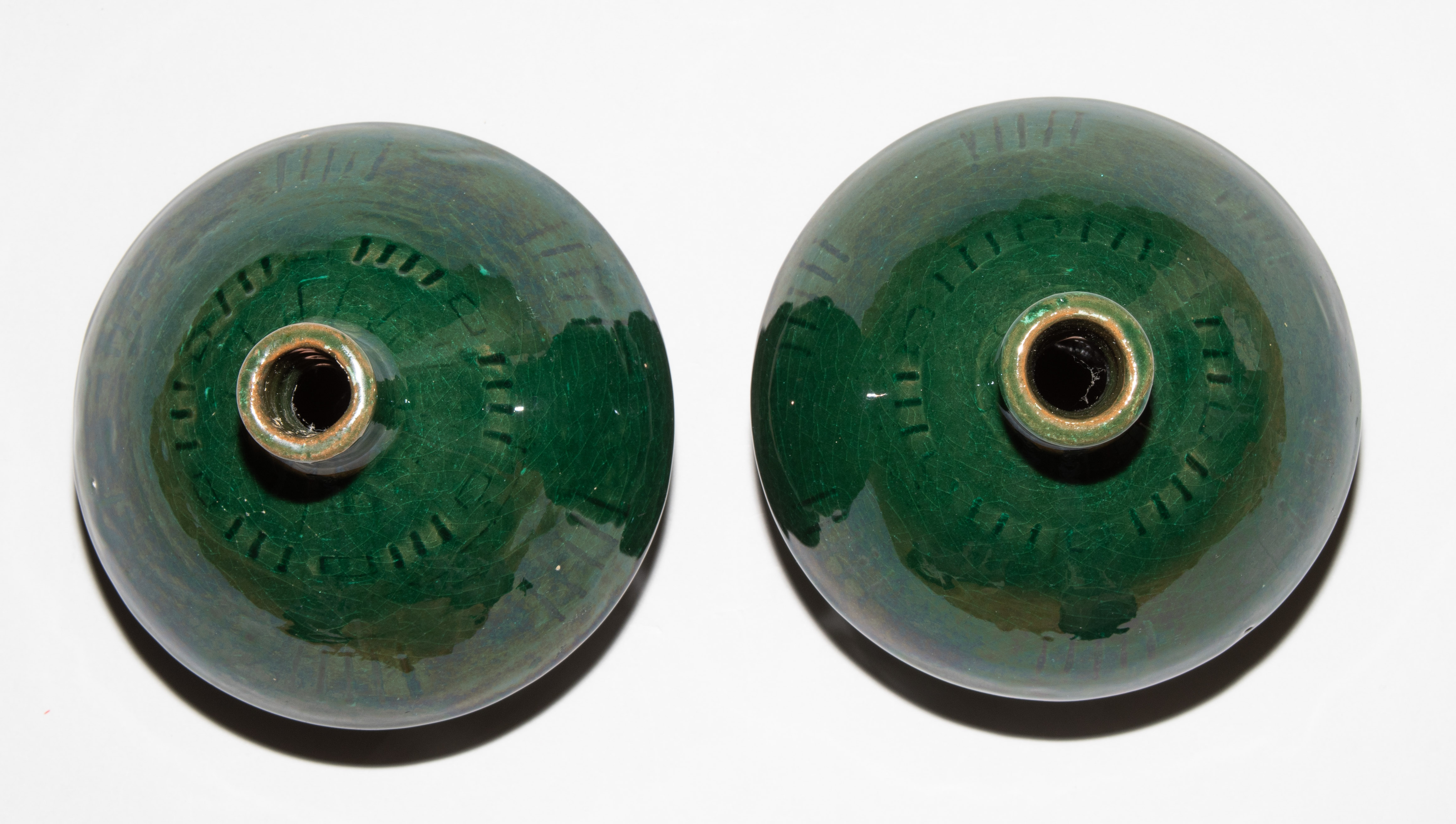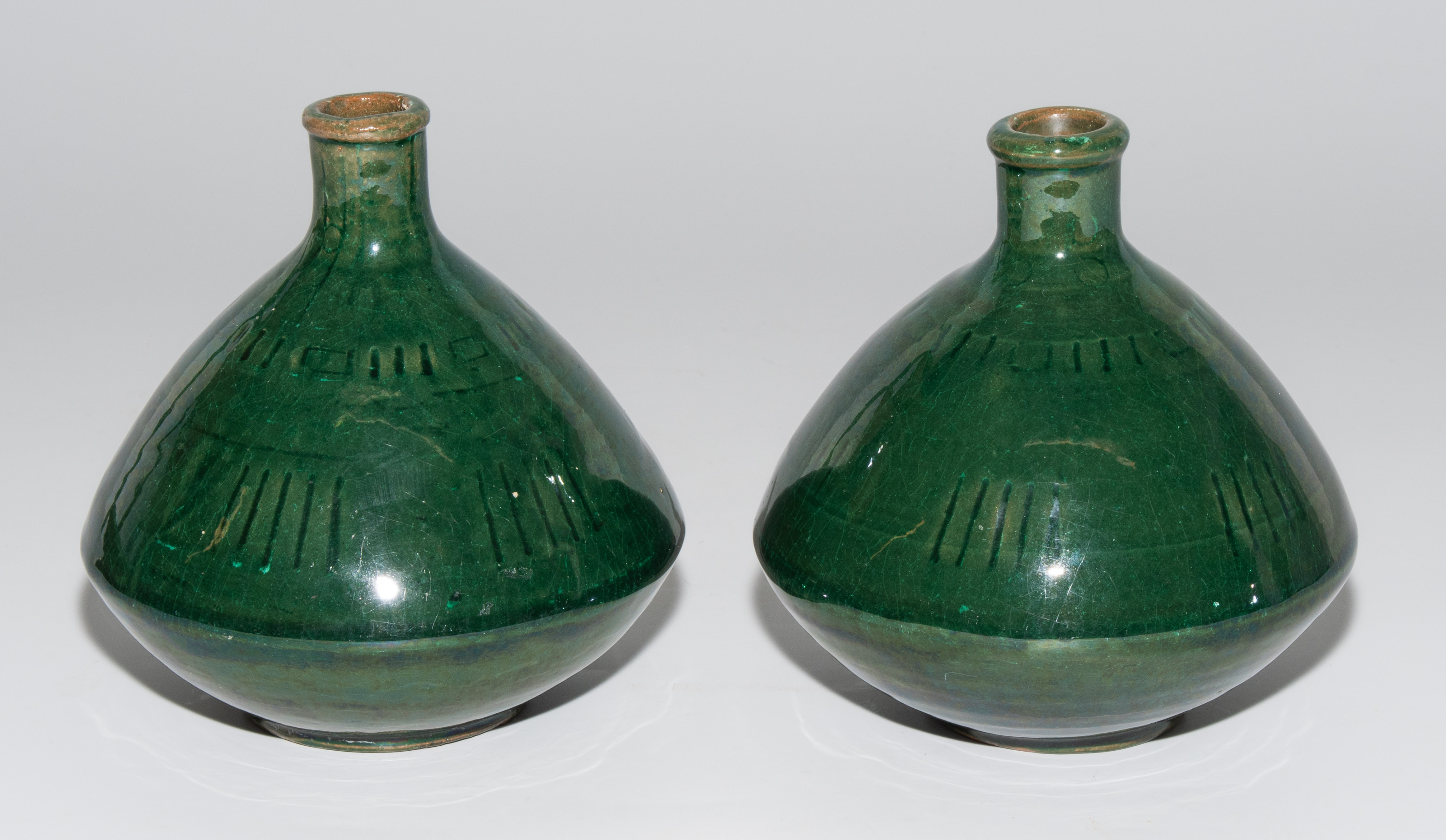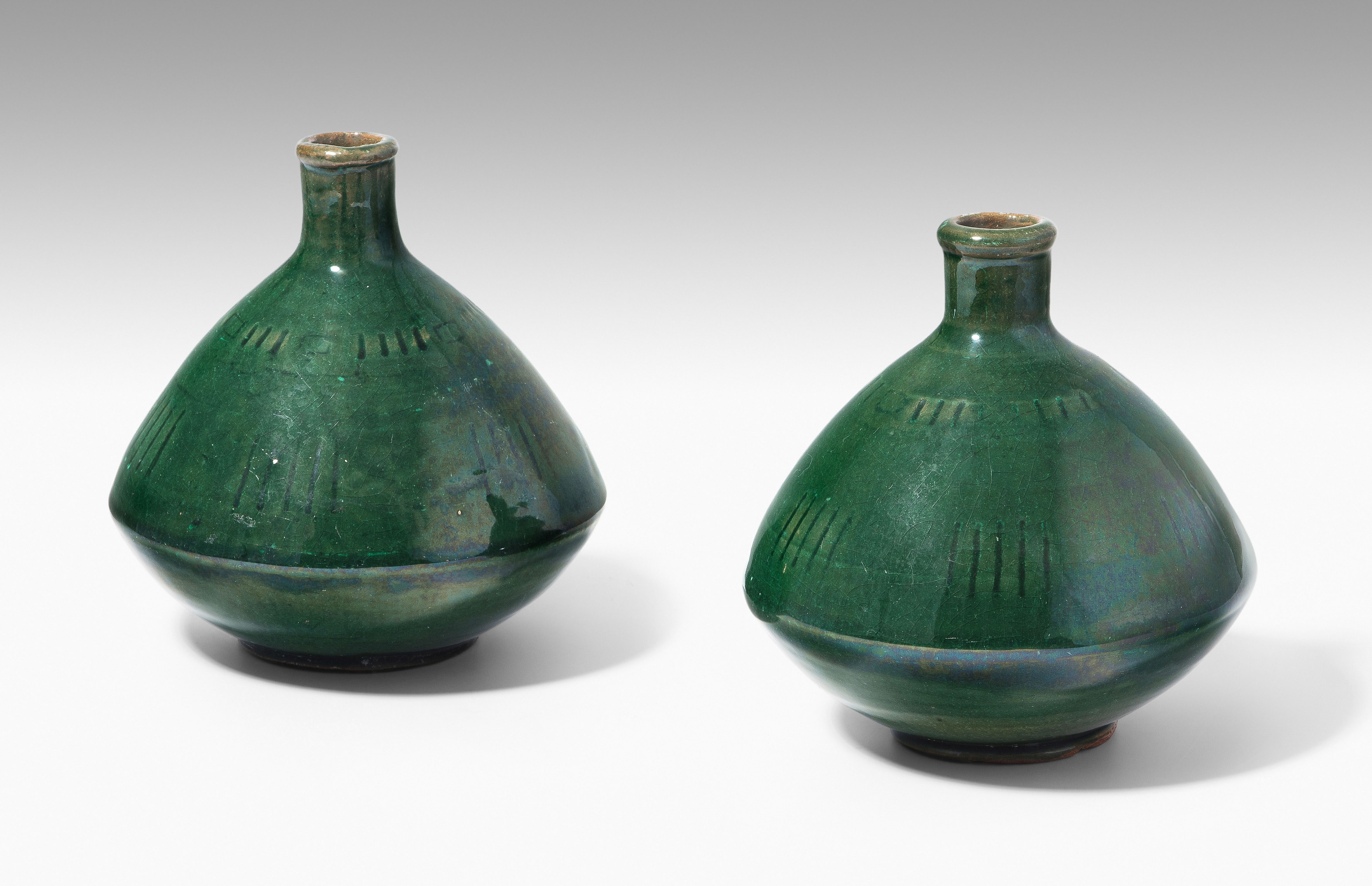 1 Paar kleine Vasen. Periode Christiaan J. van der Hoef, 1894–1903. Keramik, grüne Glasur mit Strichornamentik. Bezeichnet: Manufakturmarke, Beizeichen. H 12,5 cm.