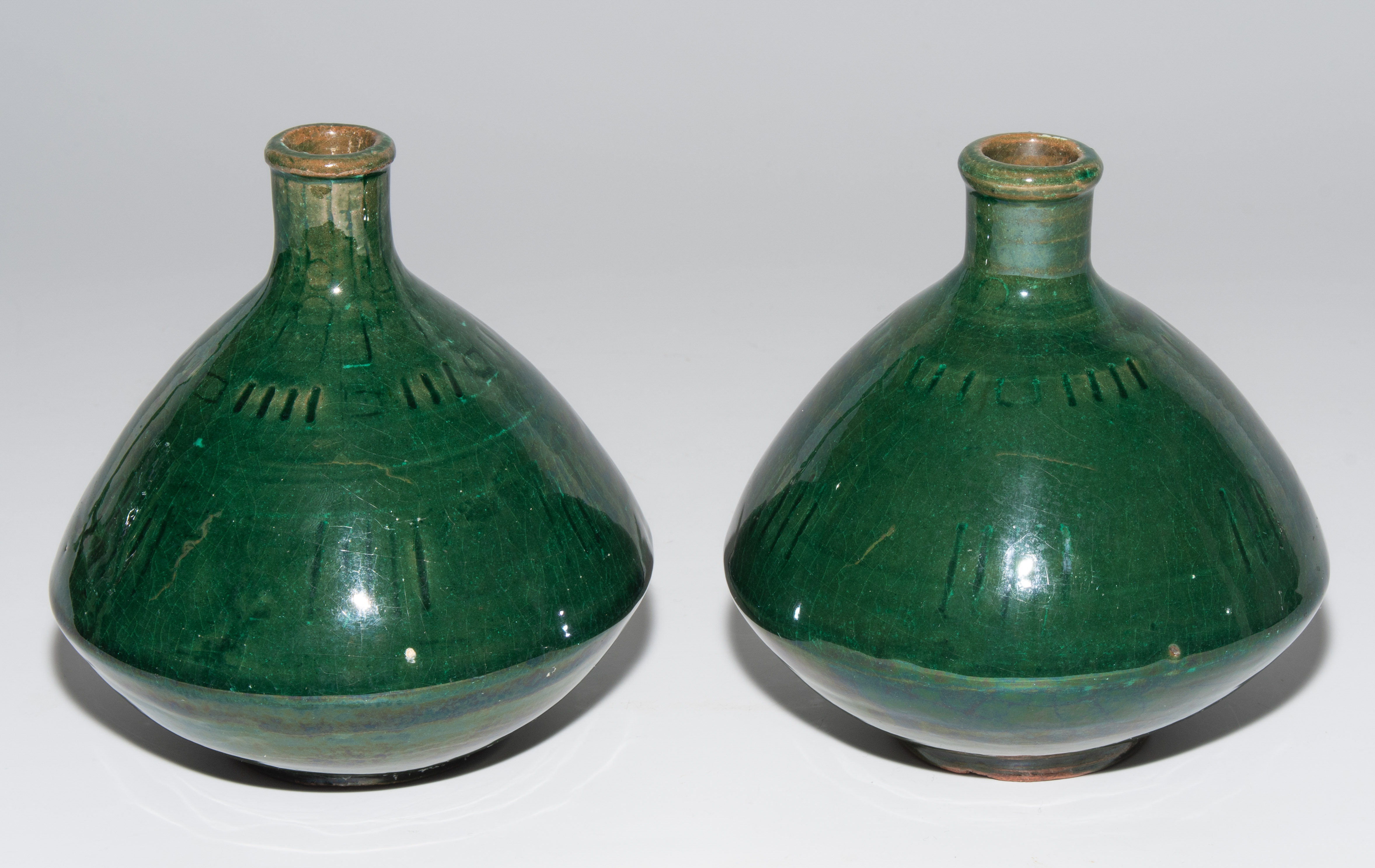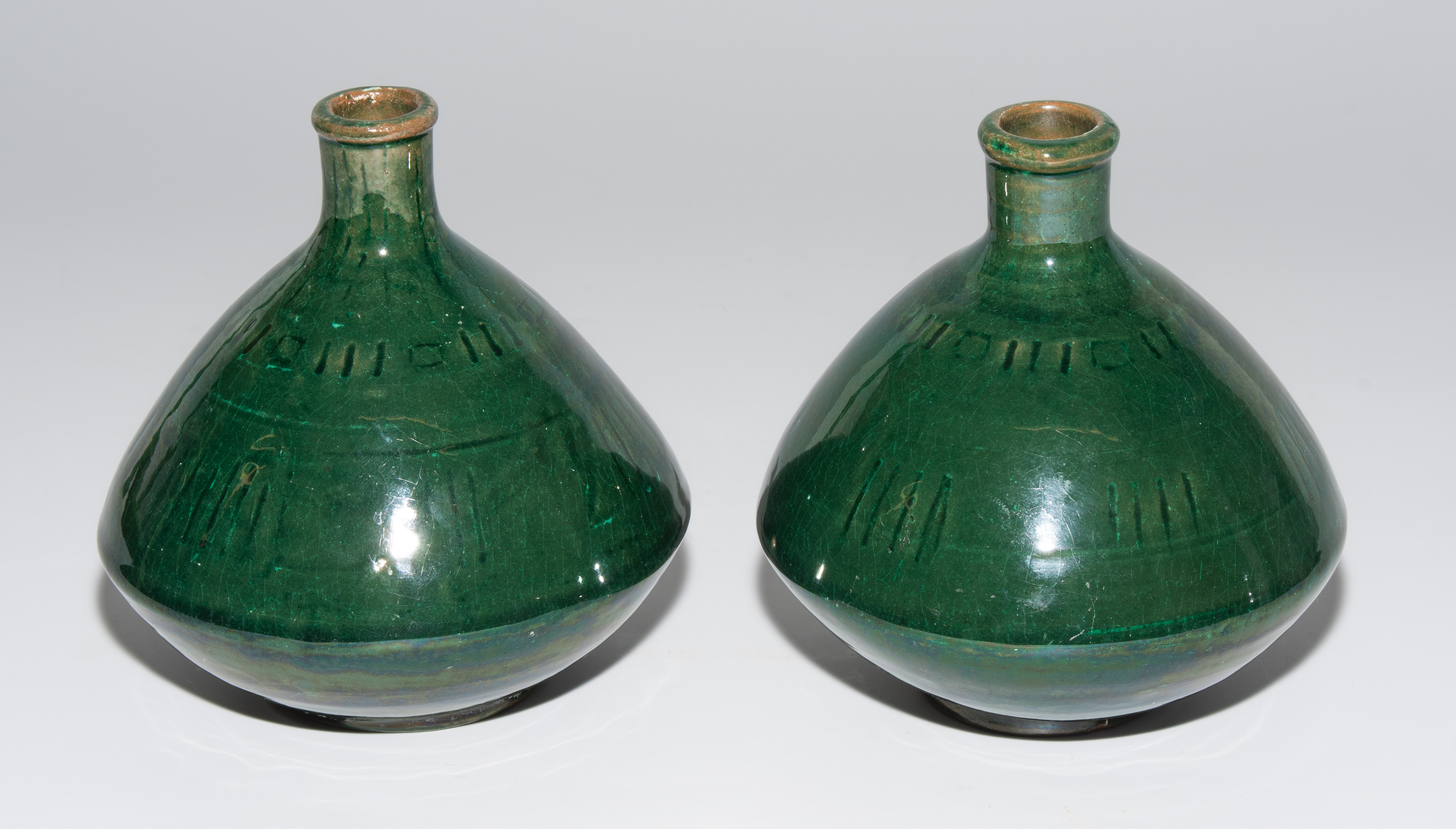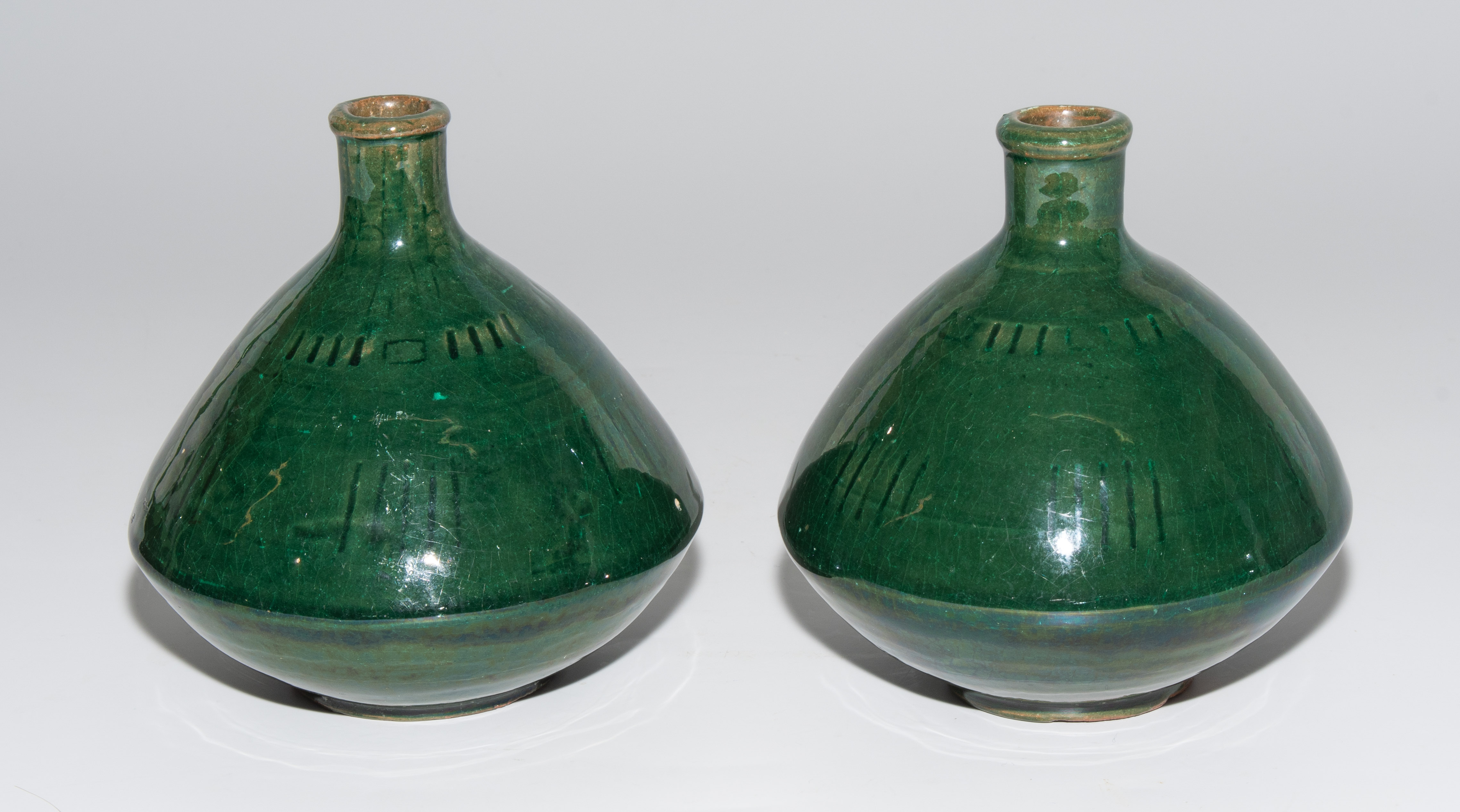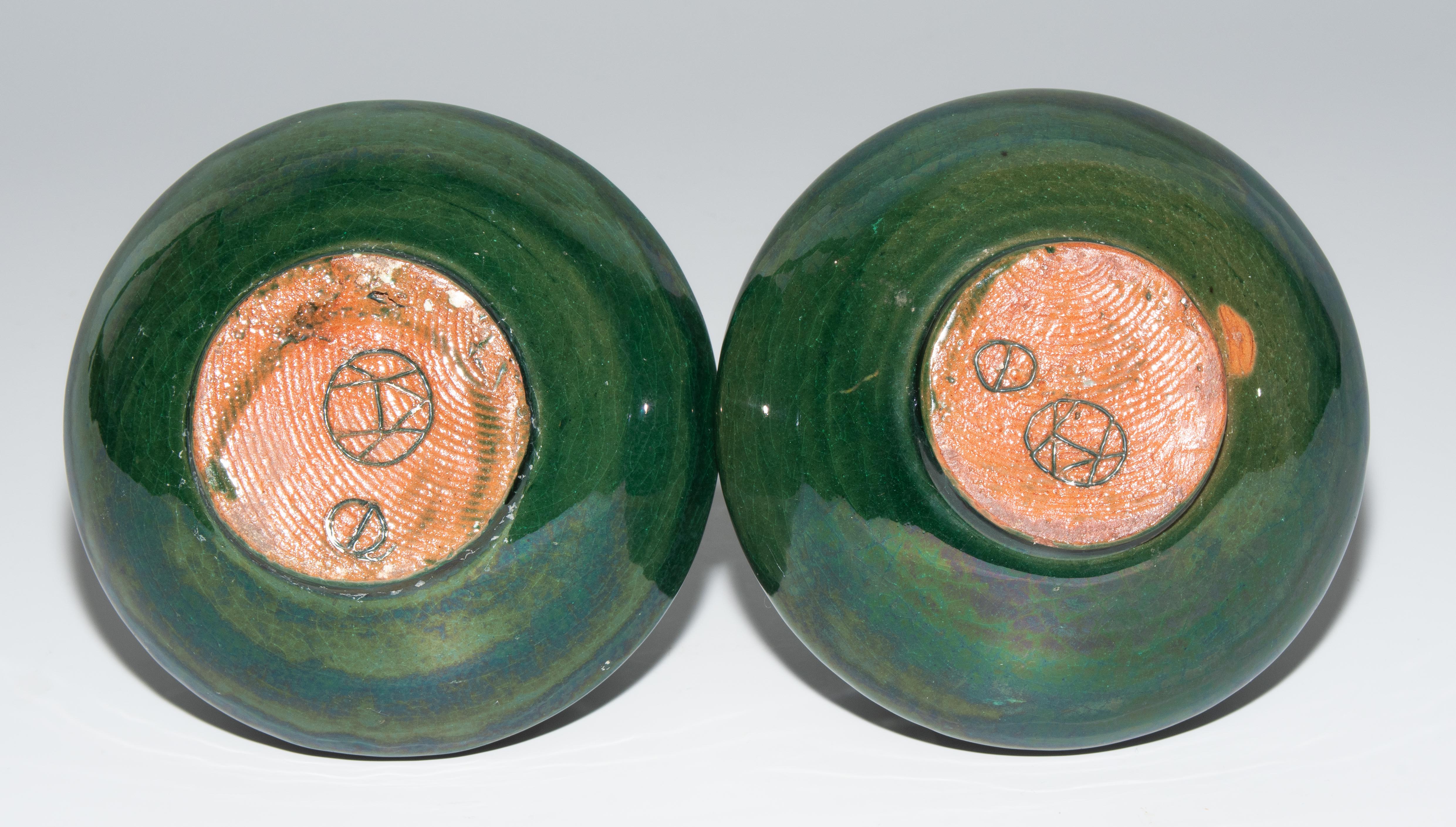 1 Paar kleine Vasen. Periode Christiaan J. van der Hoef, 1894–1903. Keramik, grüne Glasur mit Strichornamentik. Bezeichnet: Manufakturmarke, Beizeichen. H 12,5 cm.