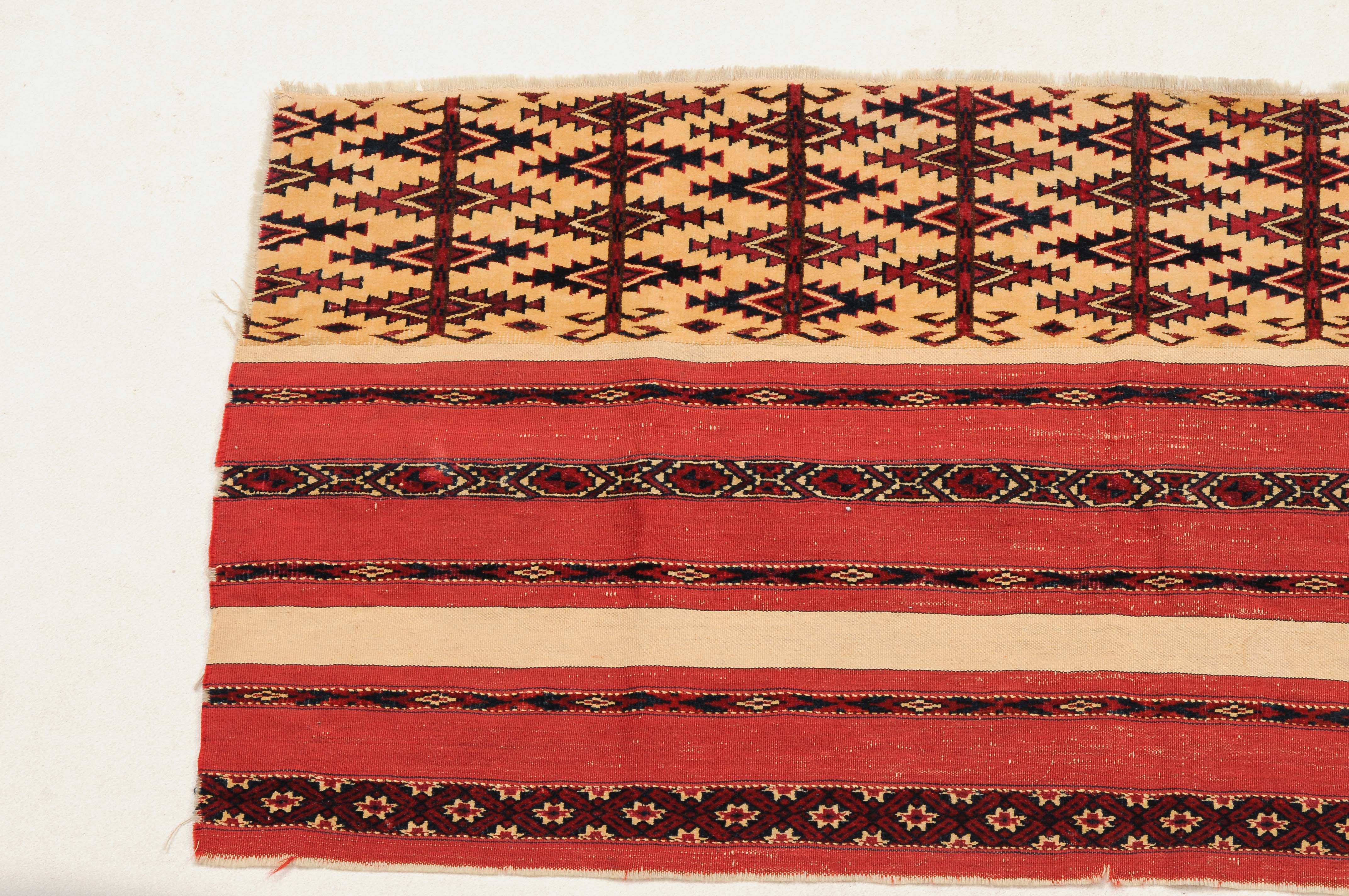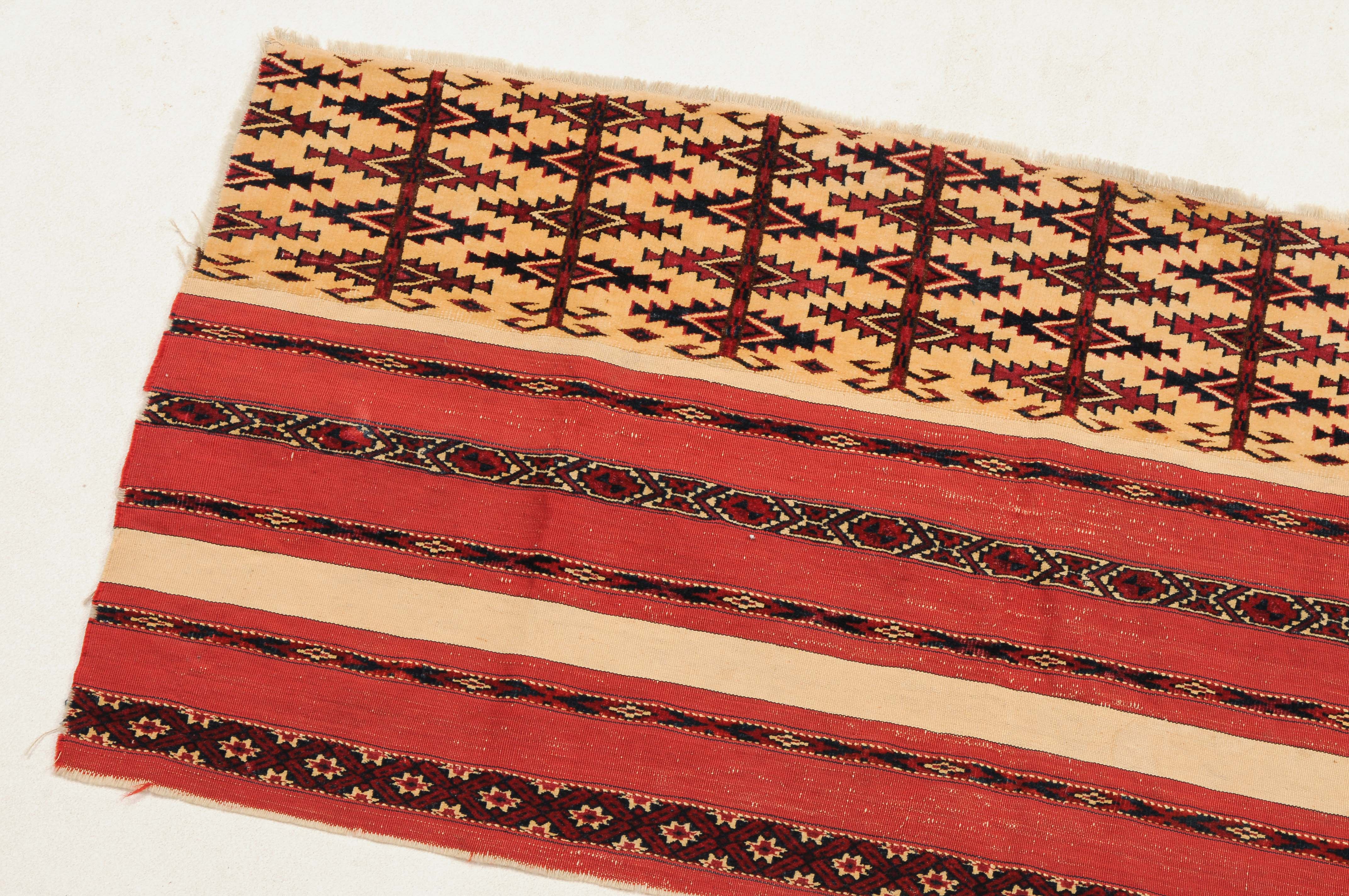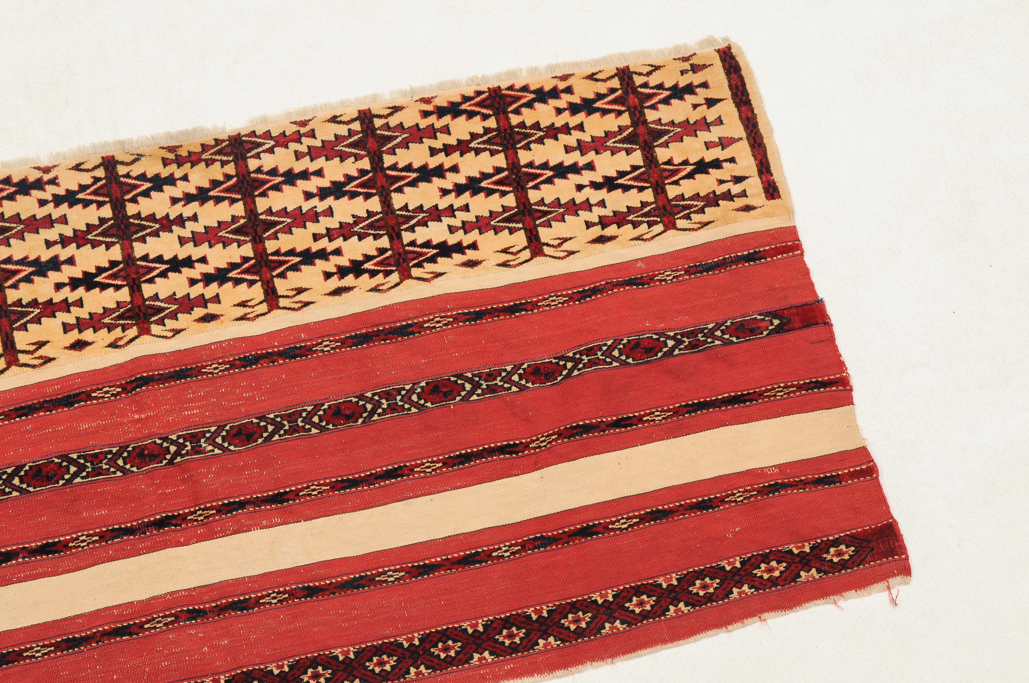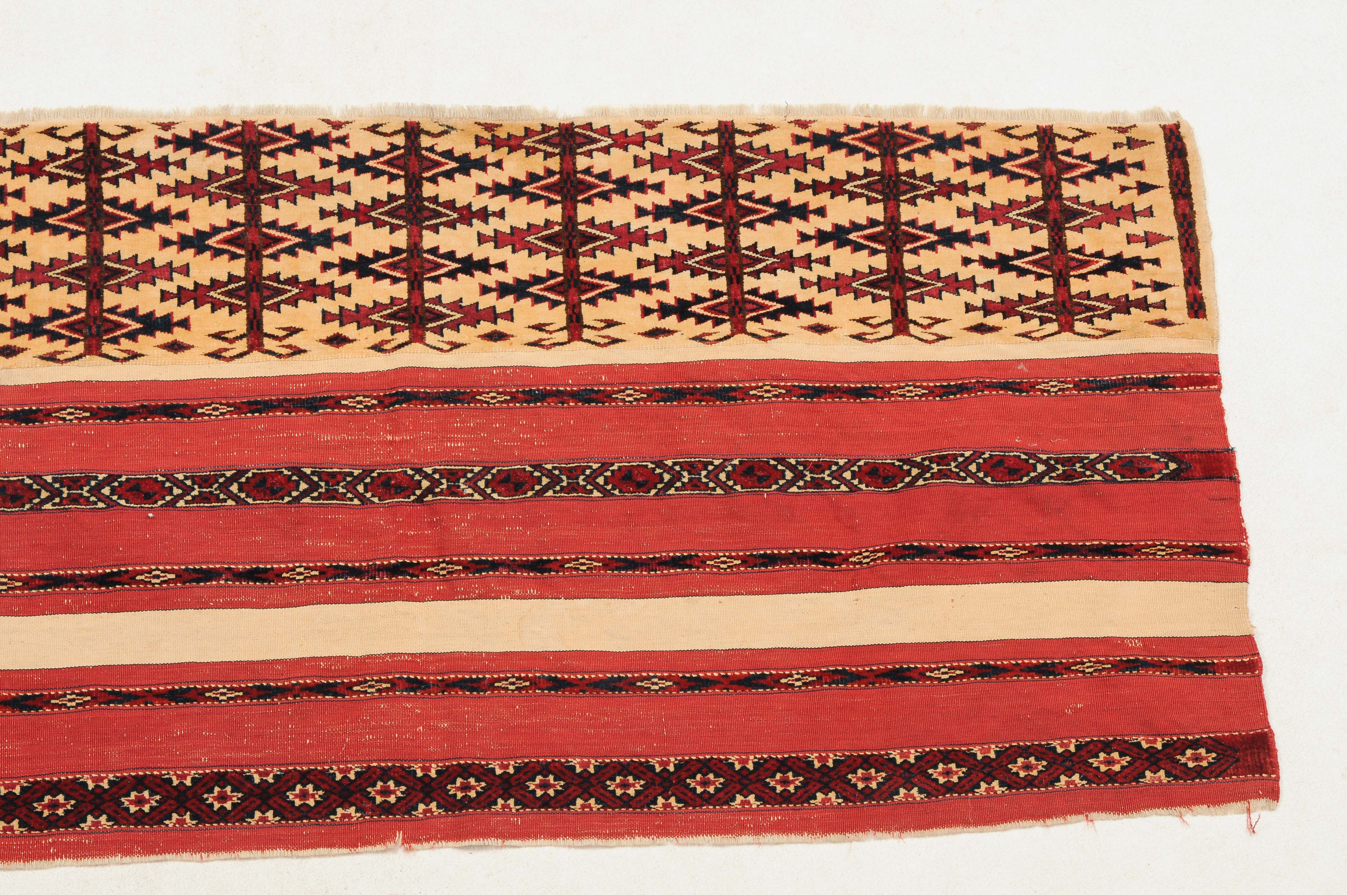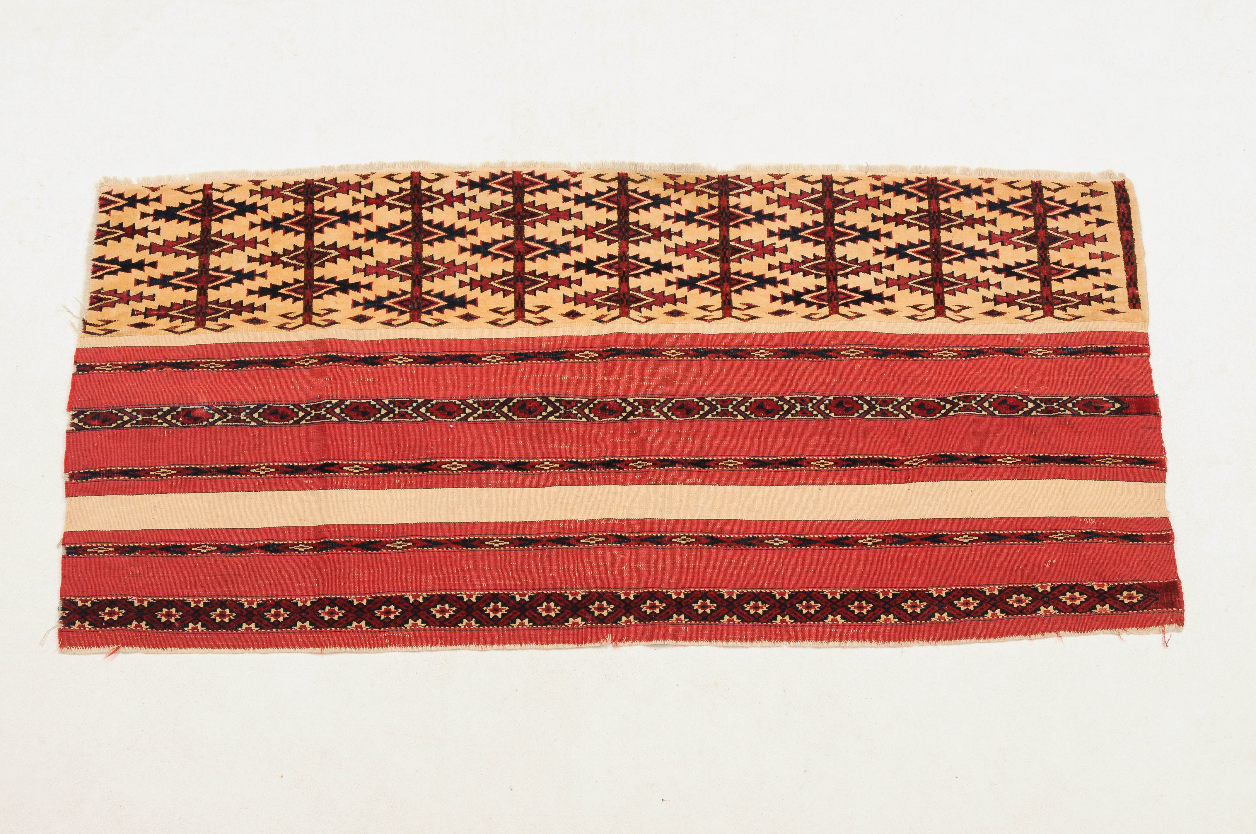 Turkmenistan, um 1900. Sehr feine Knüpfung. Gewobene und geknüpfte Streifen wechseln sich auf wirkungsvolle Weise ab. Der obere breite weisse Teil (Ak) ist mit Reihen von Ashigh-Bäumen dekorativ belegt, im unteren Teil zeigt sich eine stilvolle Tekke-Musterung. Sehr gute Erhaltung. 45x100 cm (ft. 1.5x3.3).
