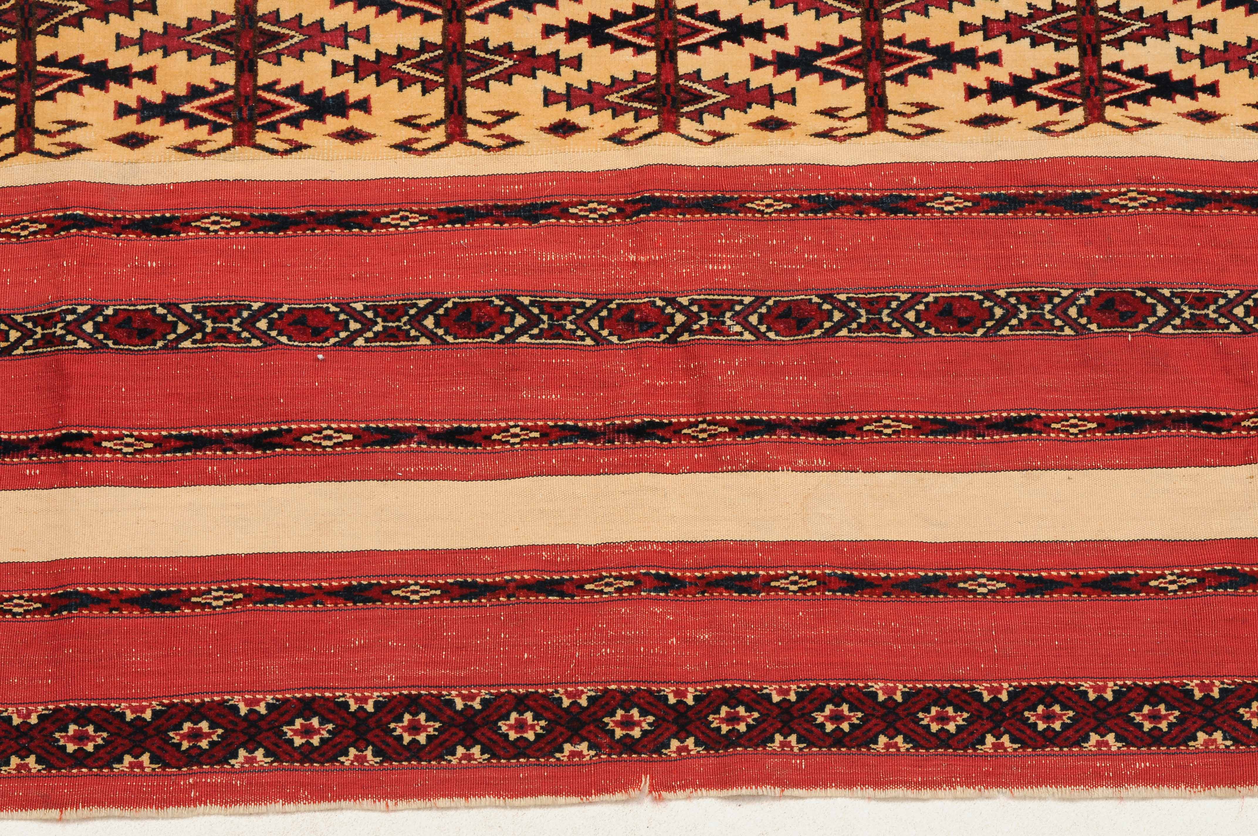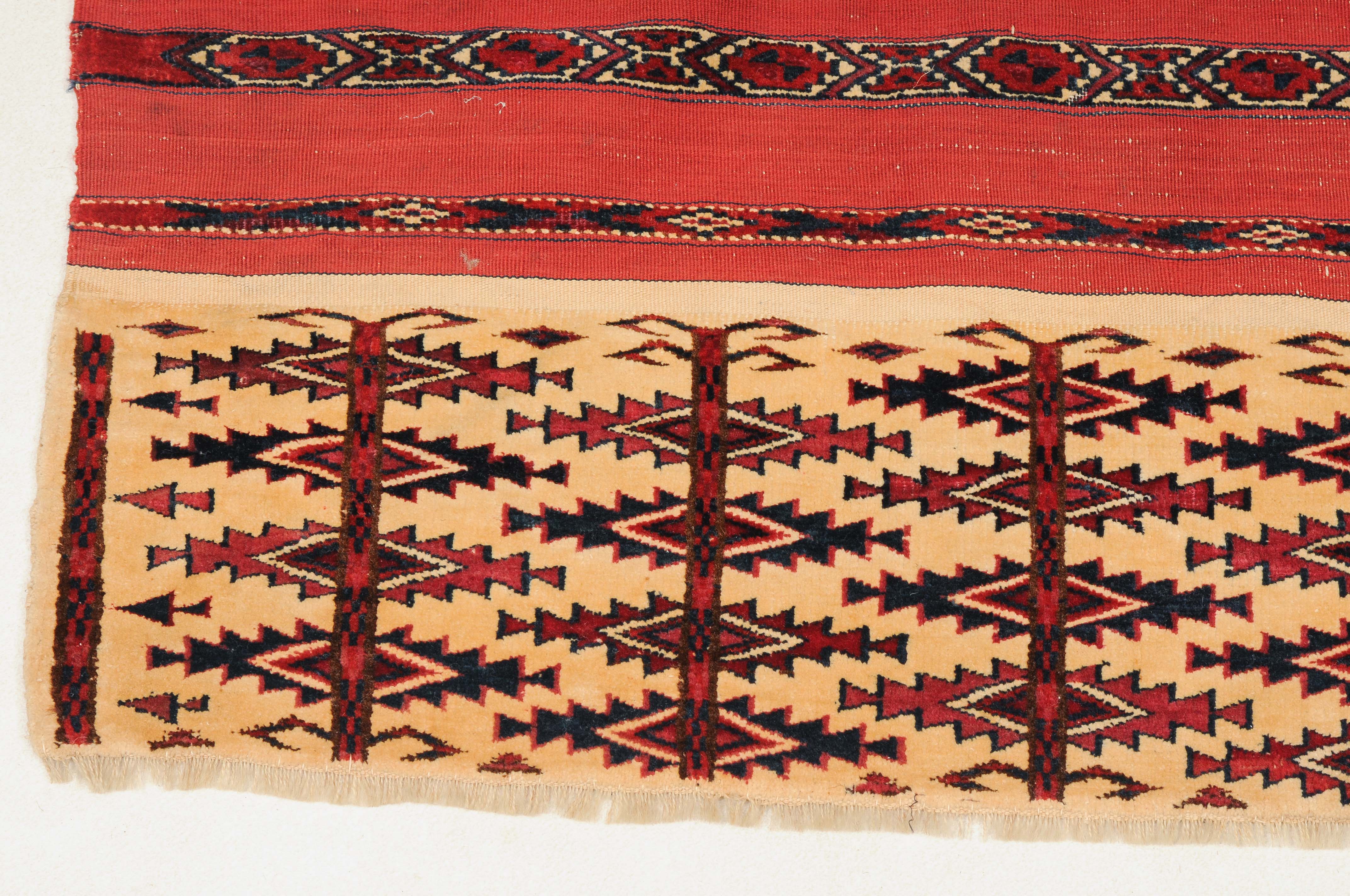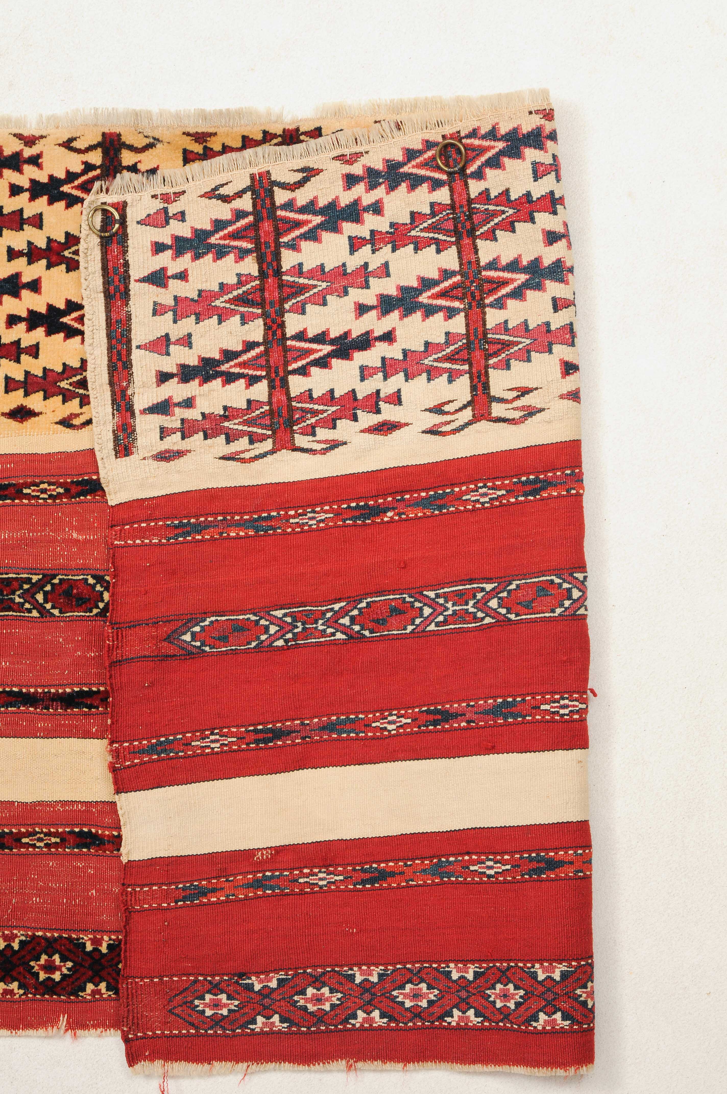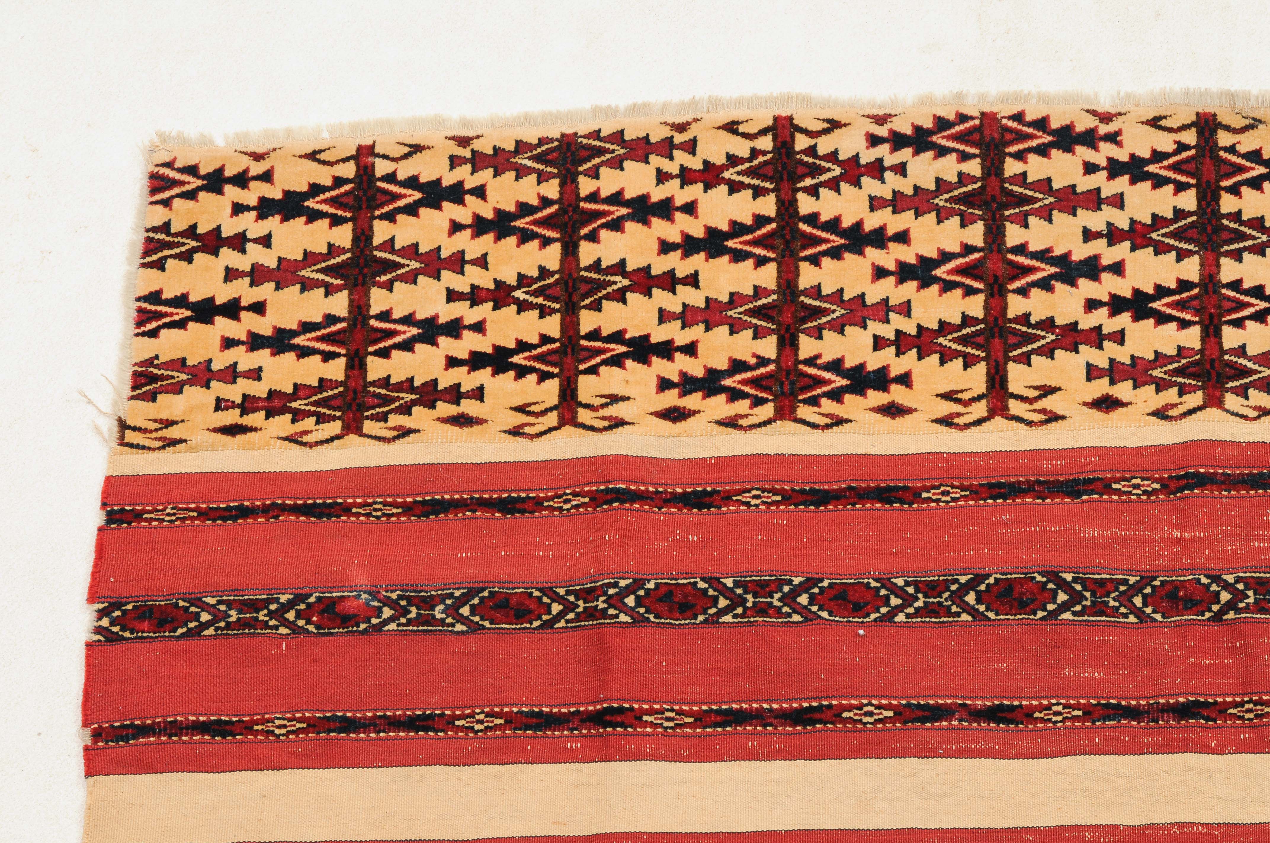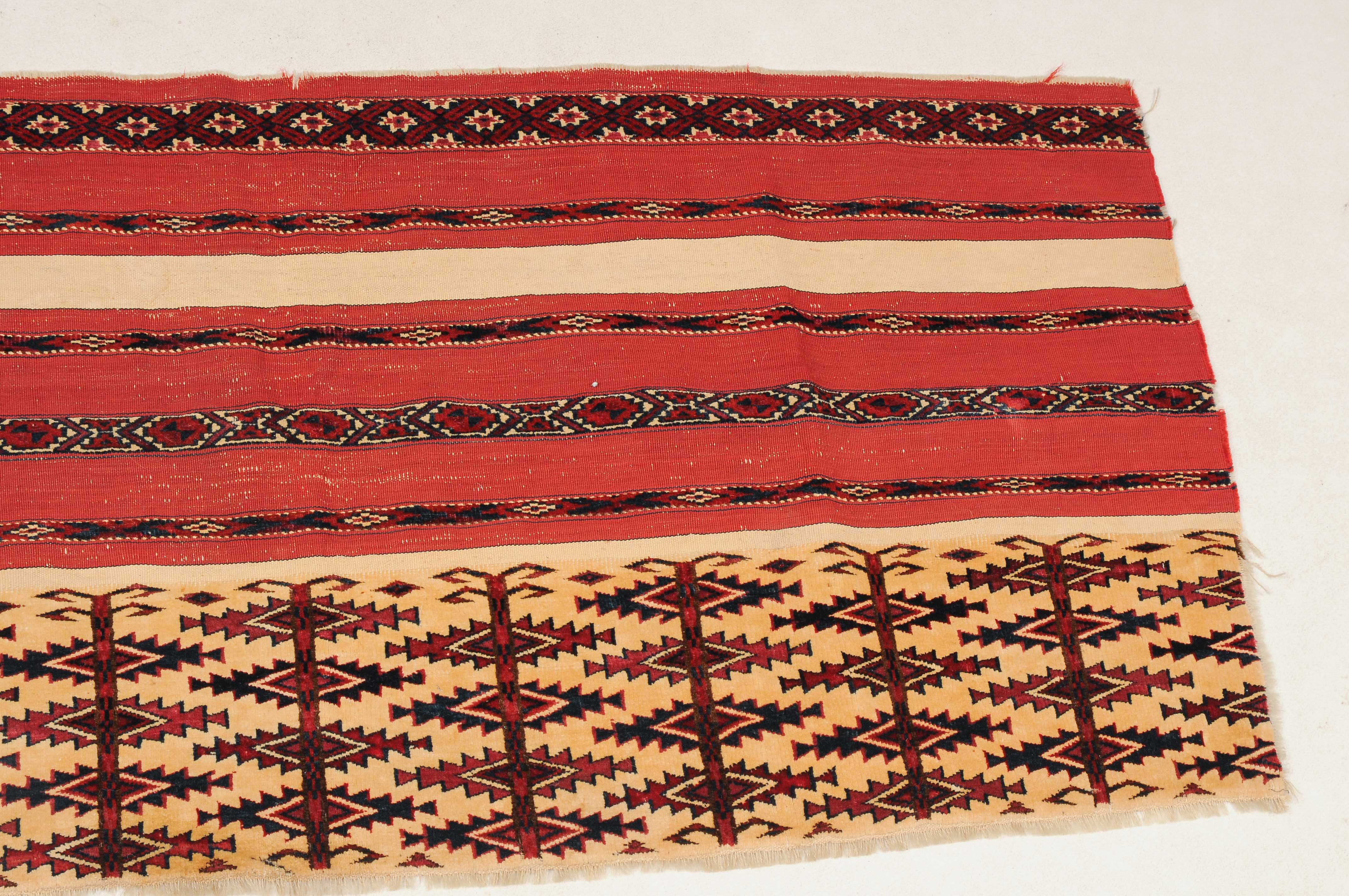 Turkmenistan, um 1900. Sehr feine Knüpfung. Gewobene und geknüpfte Streifen wechseln sich auf wirkungsvolle Weise ab. Der obere breite weisse Teil (Ak) ist mit Reihen von Ashigh-Bäumen dekorativ belegt, im unteren Teil zeigt sich eine stilvolle Tekke-Musterung. Sehr gute Erhaltung. 45x100 cm (ft. 1.5x3.3).