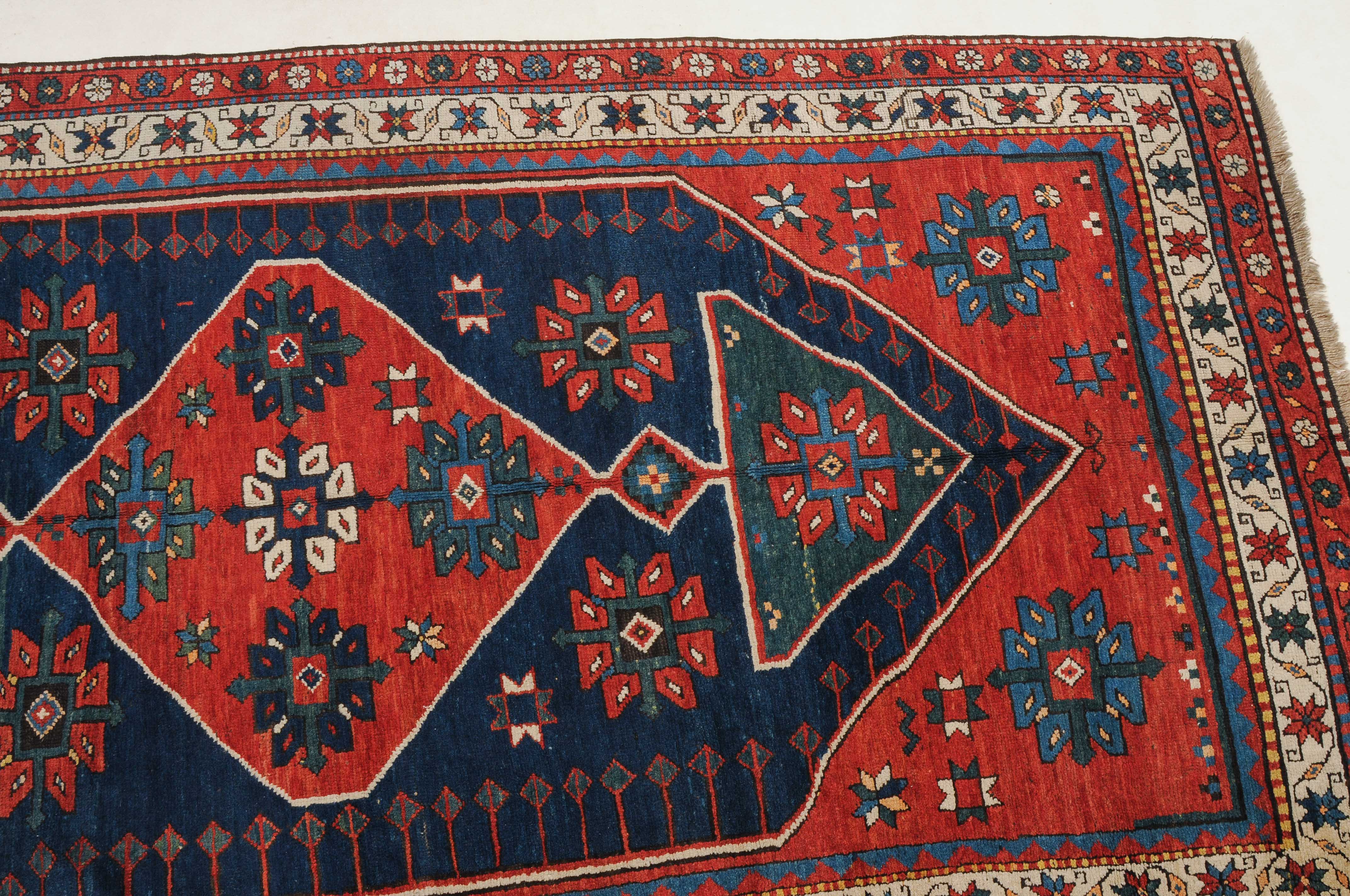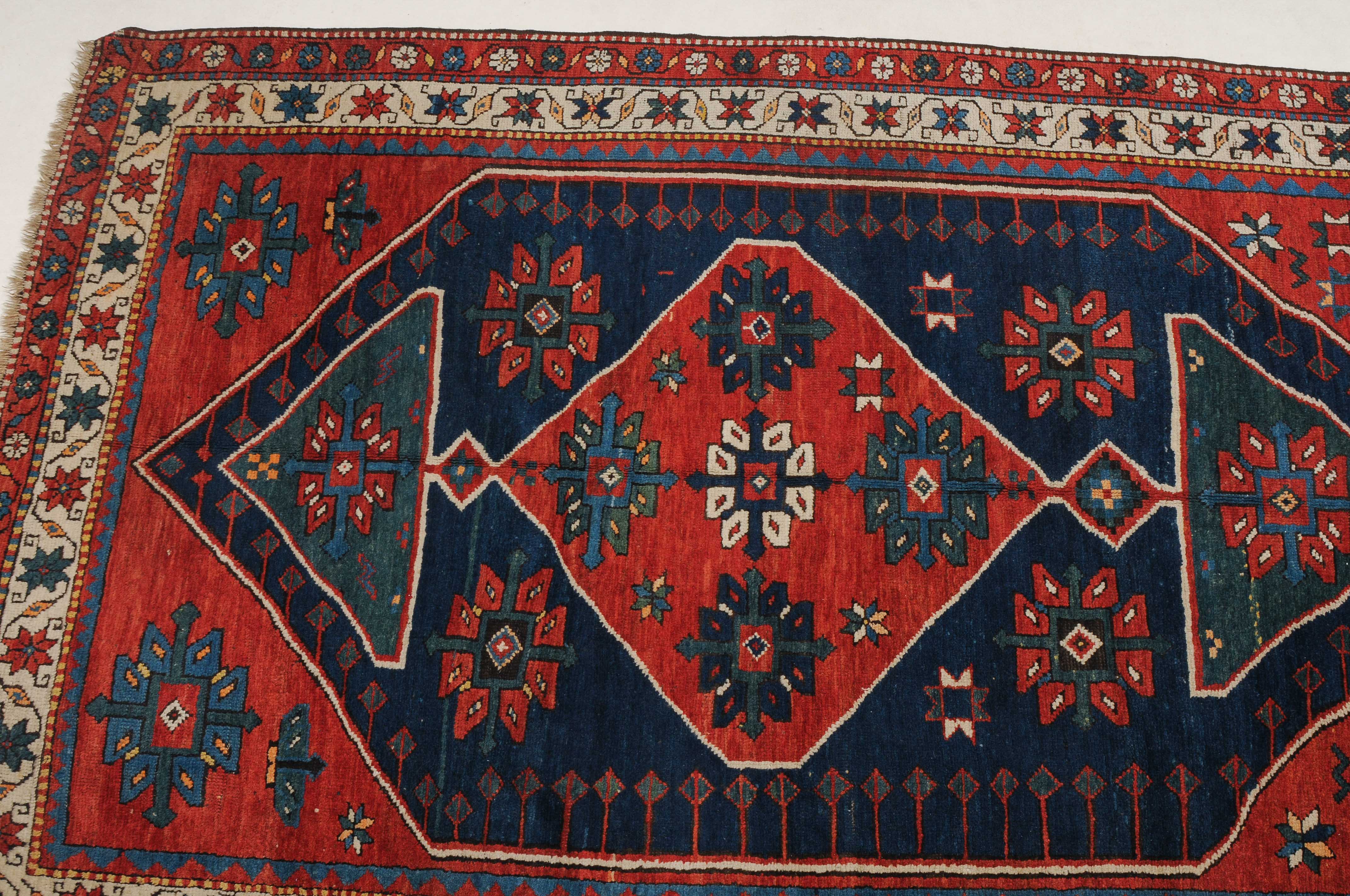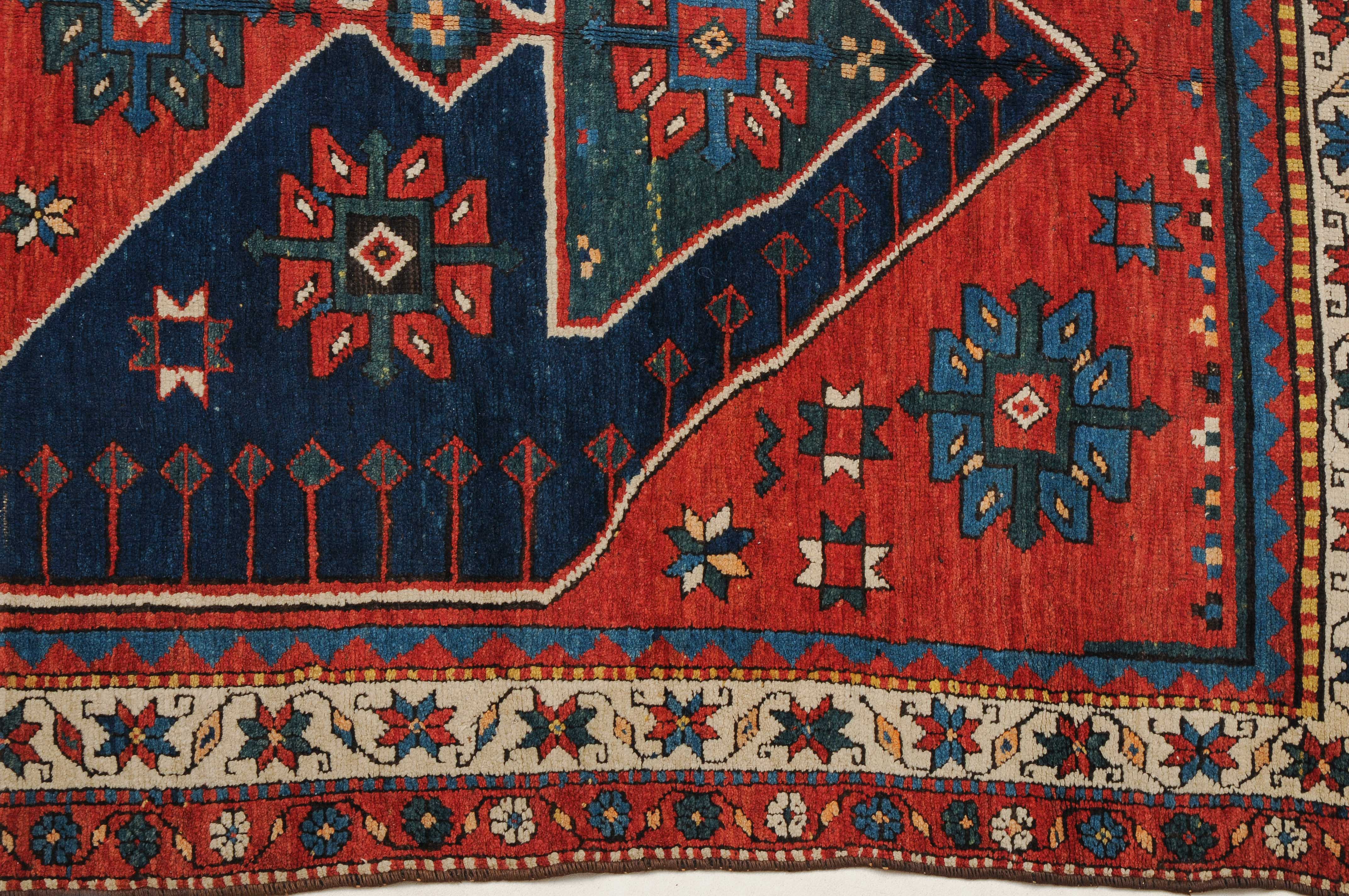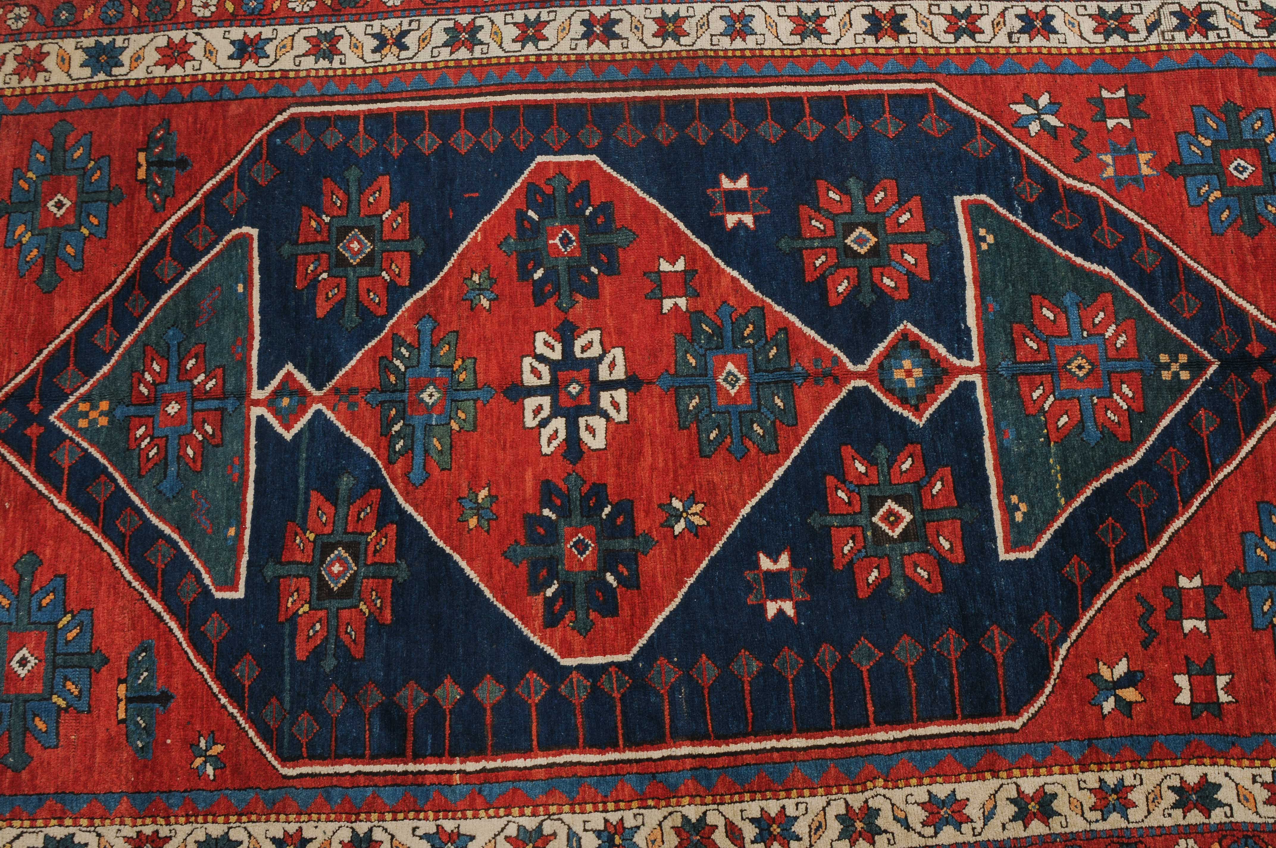 W-Kaukasus, um 1910. Im hexagonalen blauen Mittelfeld ruht ein rotes Rautenmedaillon mit 2 grosszügig angelegten türkisen Halbrauten-Anhängern, umgeben von geometrisch gehaltenen Blüten, seitlich ins Feld ragenden Pfeilspitzen sowie roten, miteinander verbundenen Eckzwickeln. Die weisse Sternblütenbordüre bildet einen schönen farblichen Kontrast zum Feld. Gebrauchsspuren. 154x286 cm (ft. 5.1x9.4).