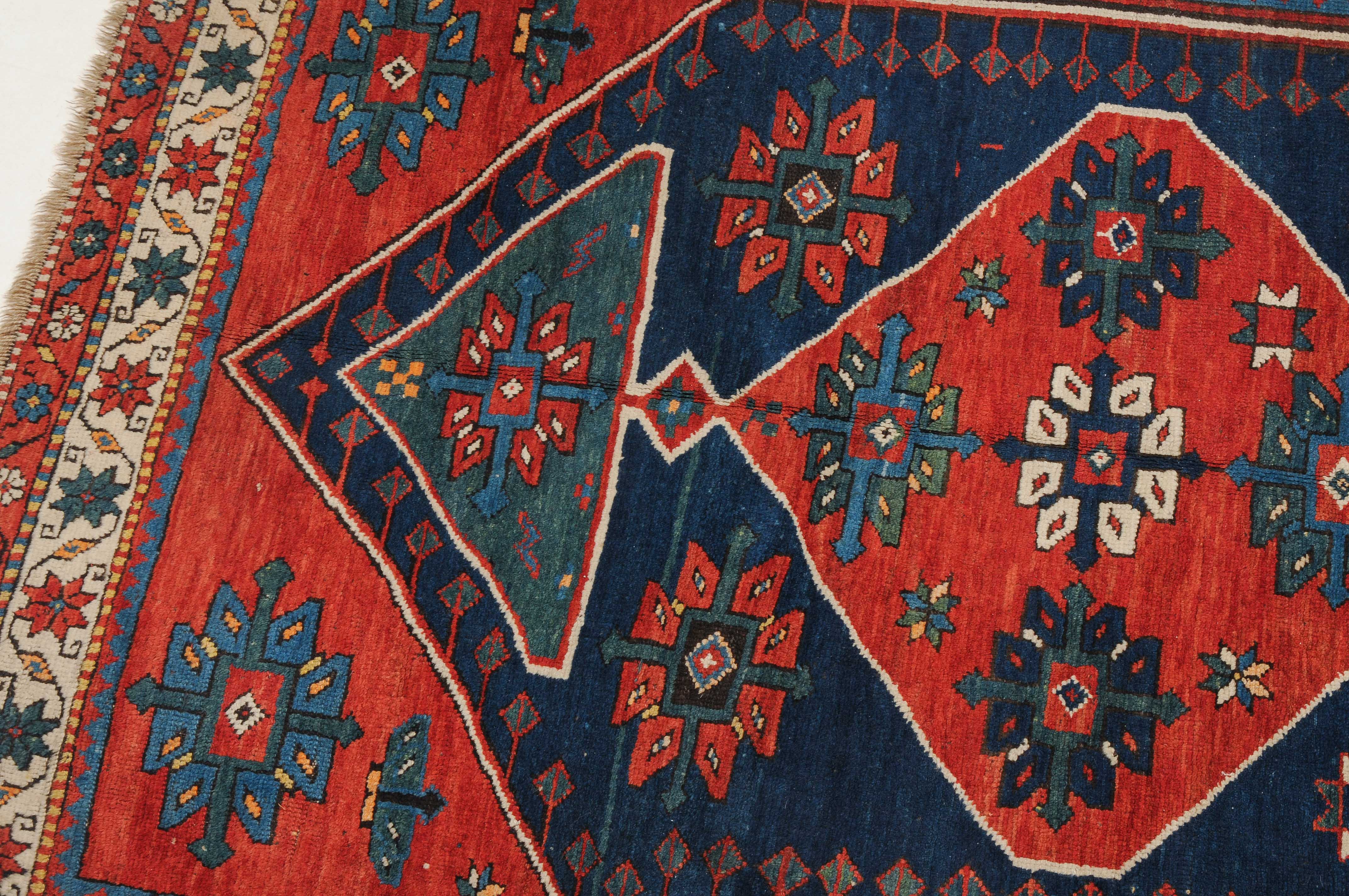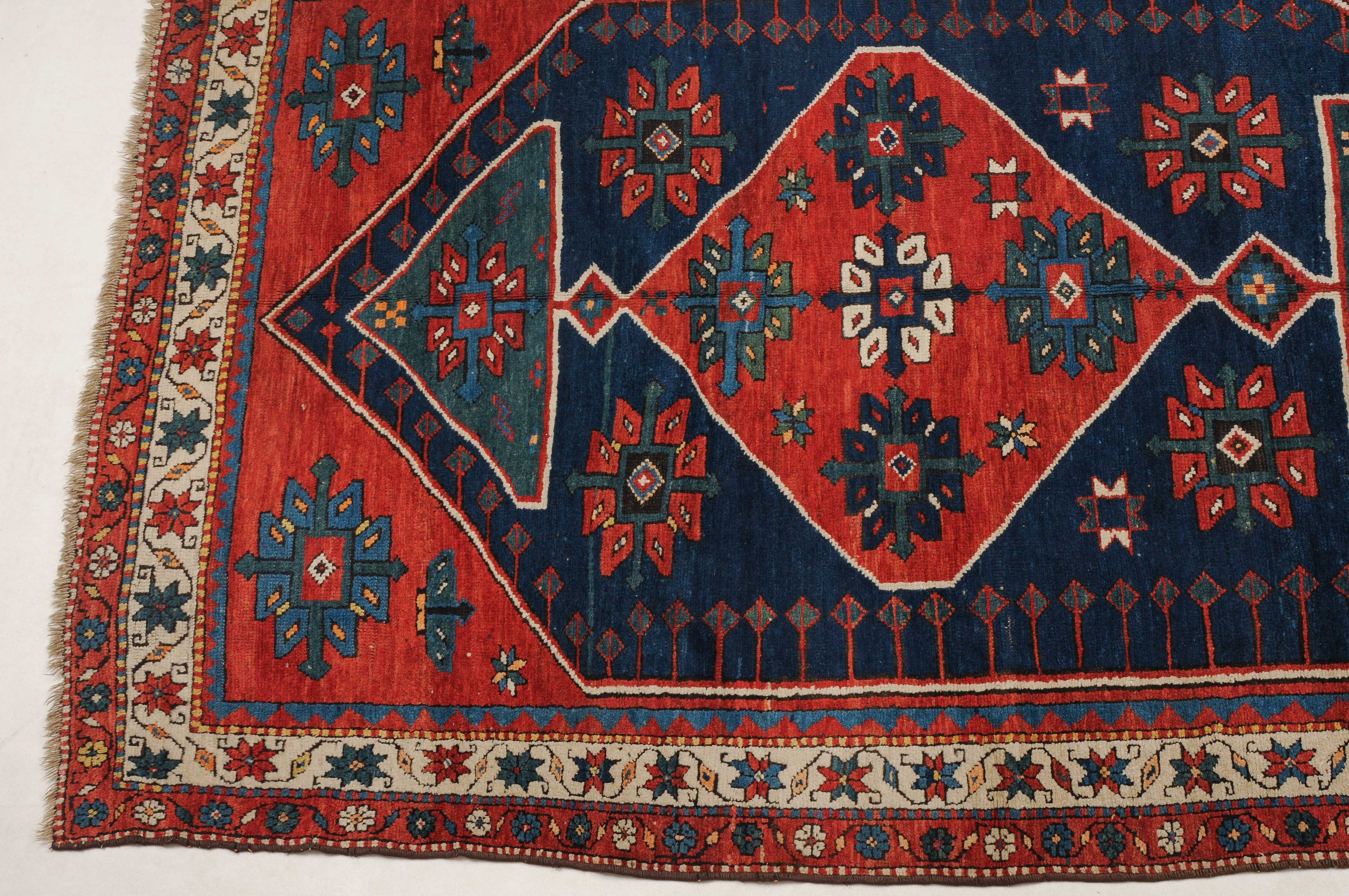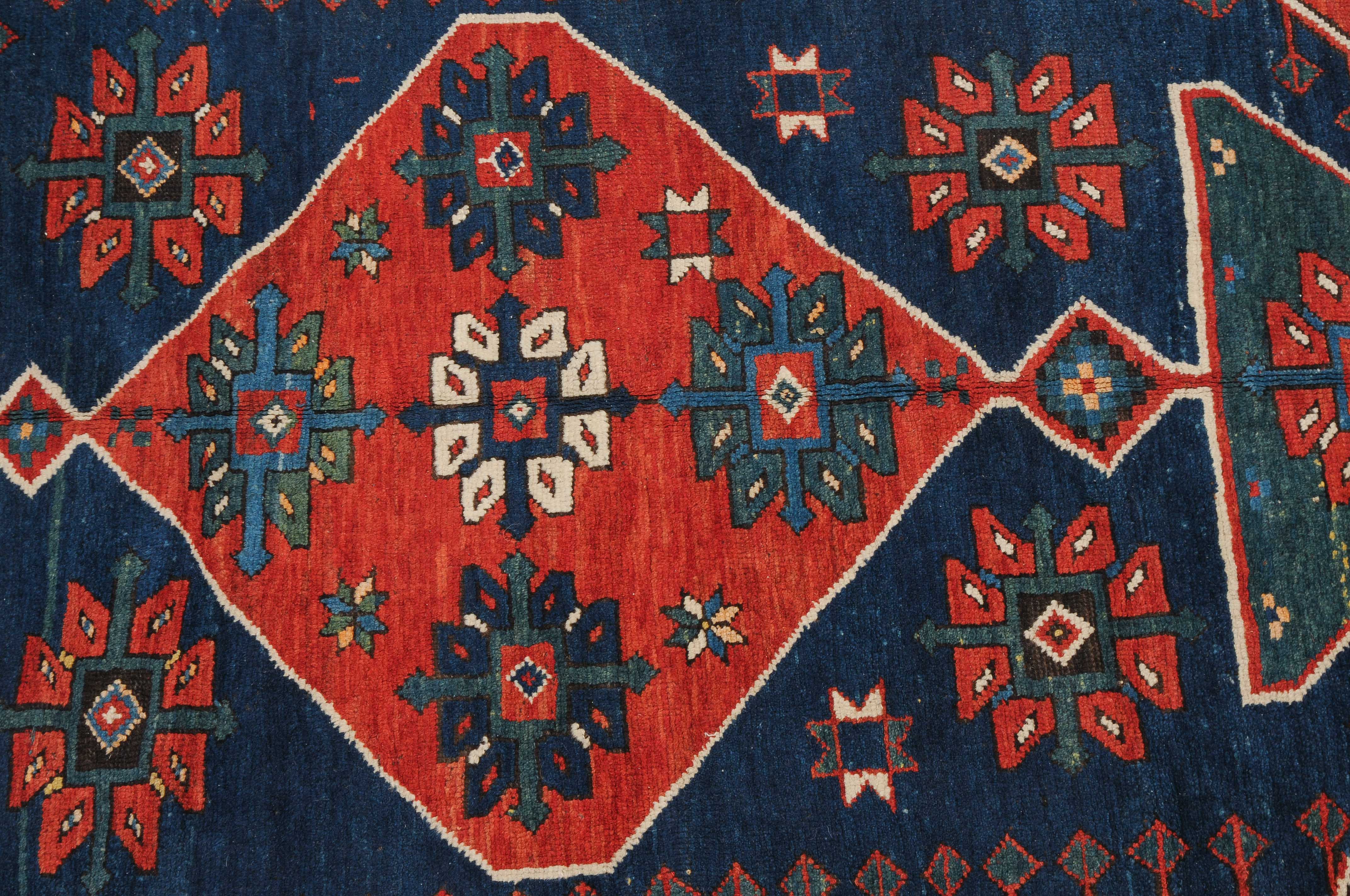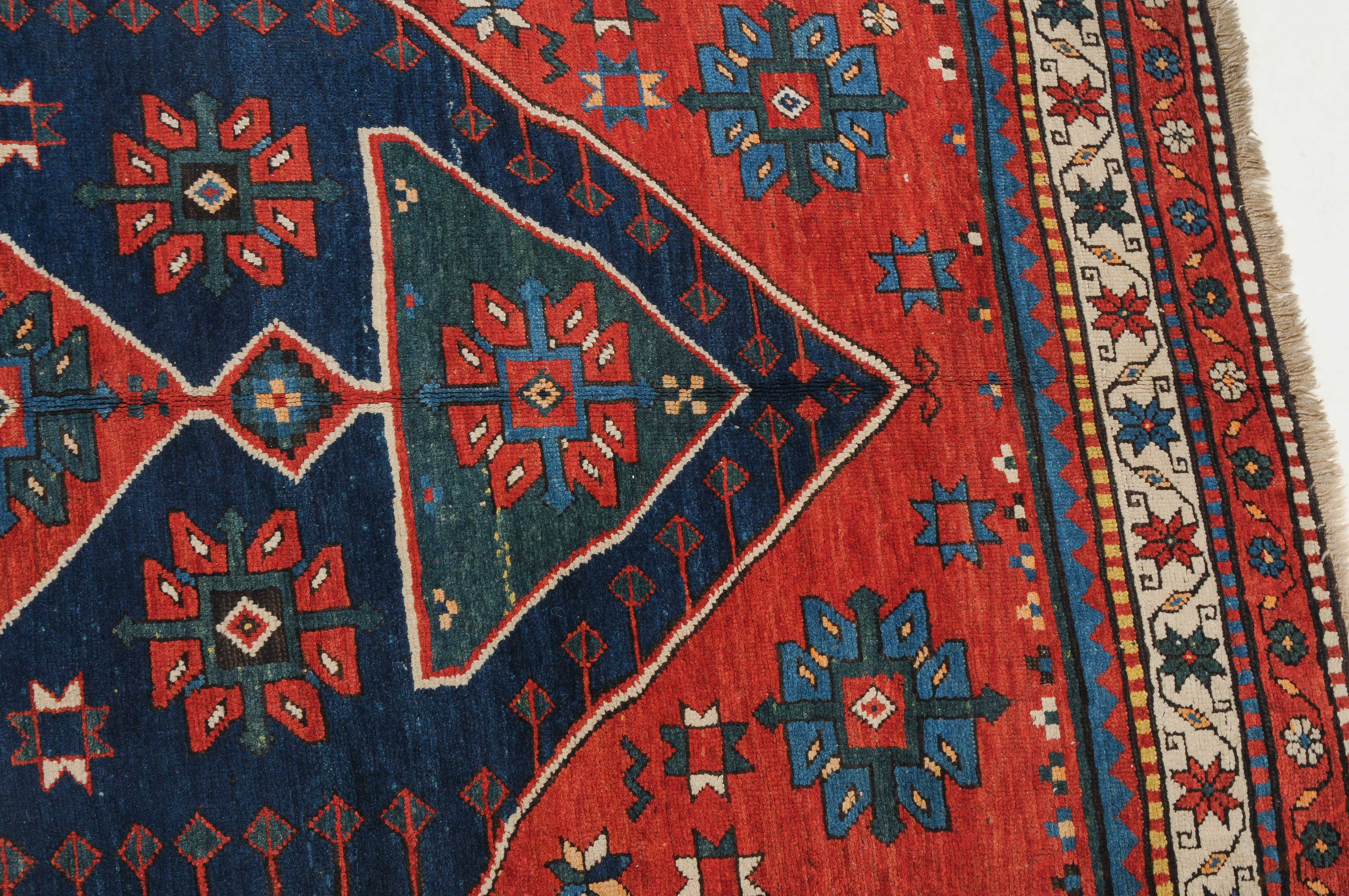W-Kaukasus, um 1910. Im hexagonalen blauen Mittelfeld ruht ein rotes Rautenmedaillon mit 2 grosszügig angelegten türkisen Halbrauten-Anhängern, umgeben von geometrisch gehaltenen Blüten, seitlich ins Feld ragenden Pfeilspitzen sowie roten, miteinander verbundenen Eckzwickeln. Die weisse Sternblütenbordüre bildet einen schönen farblichen Kontrast zum Feld. Gebrauchsspuren. 154x286 cm (ft. 5.1x9.4).
