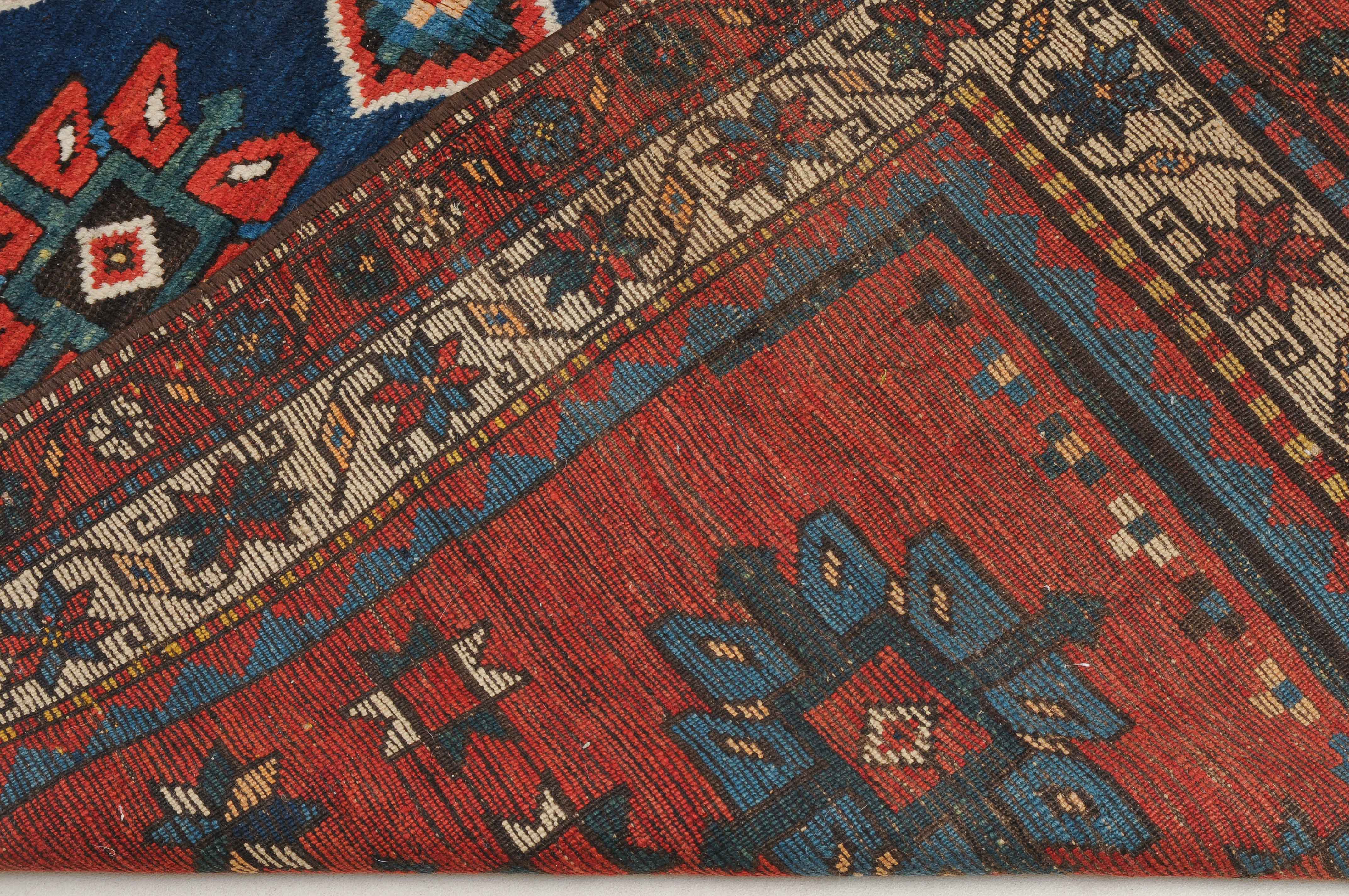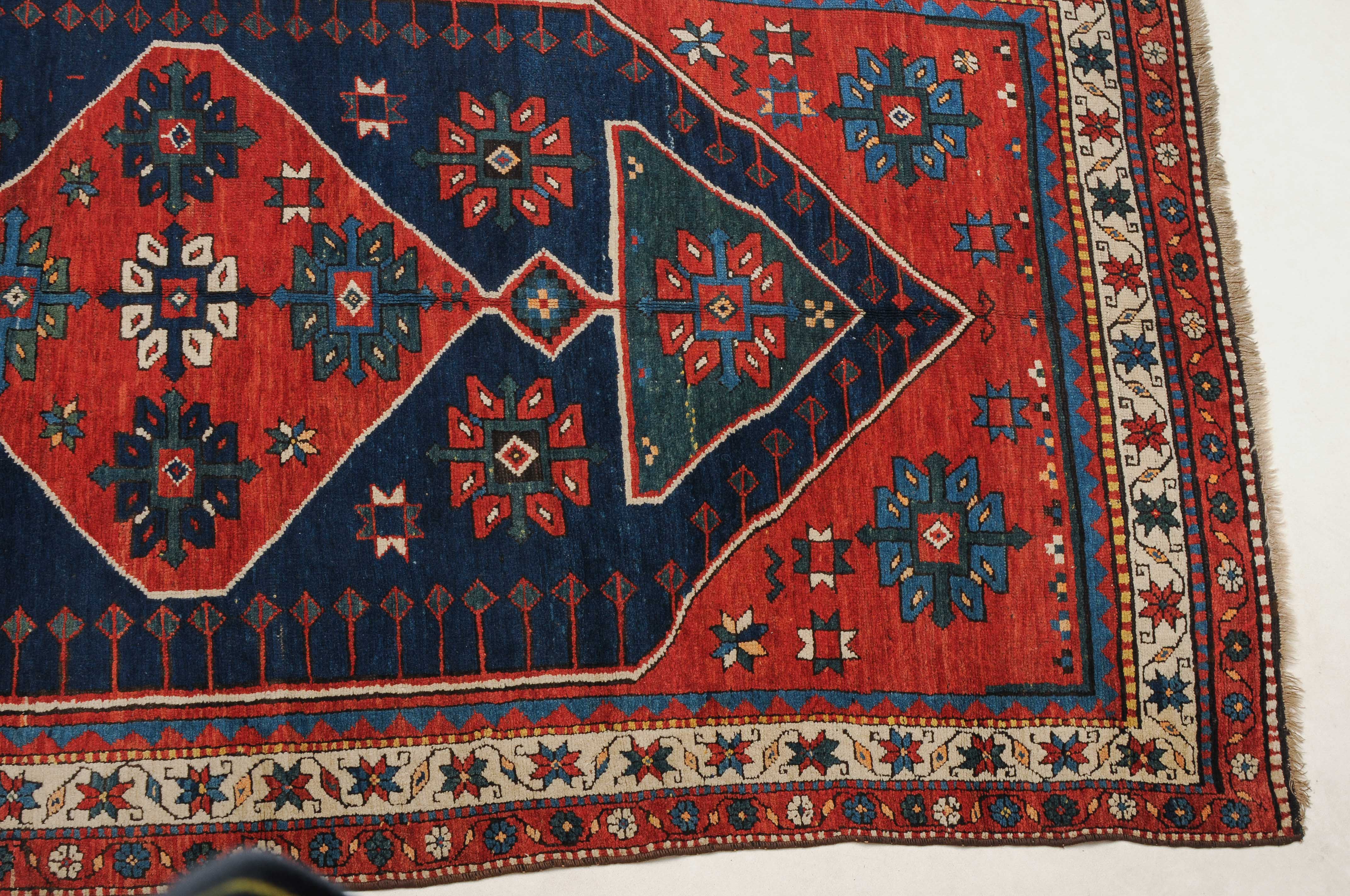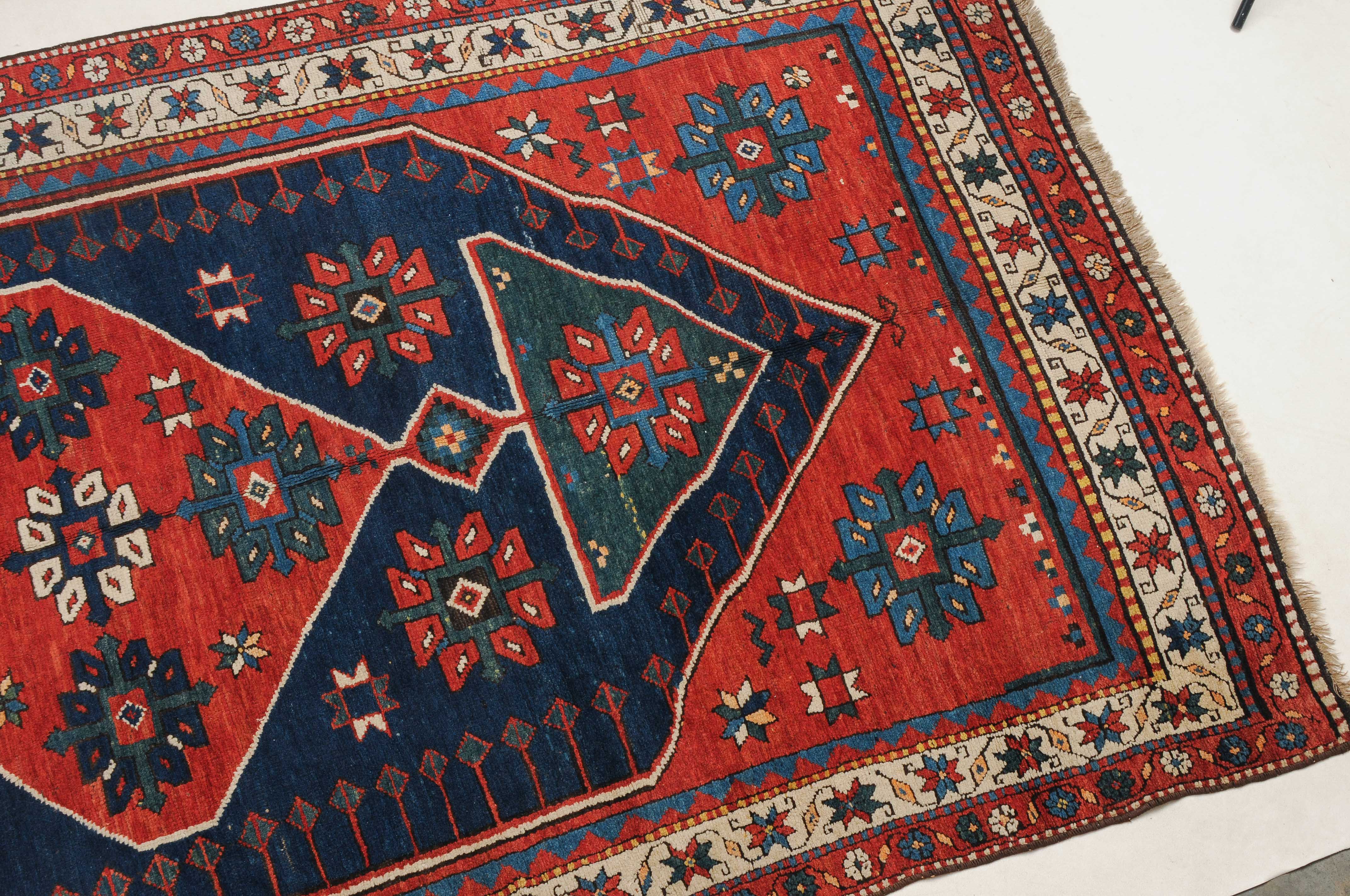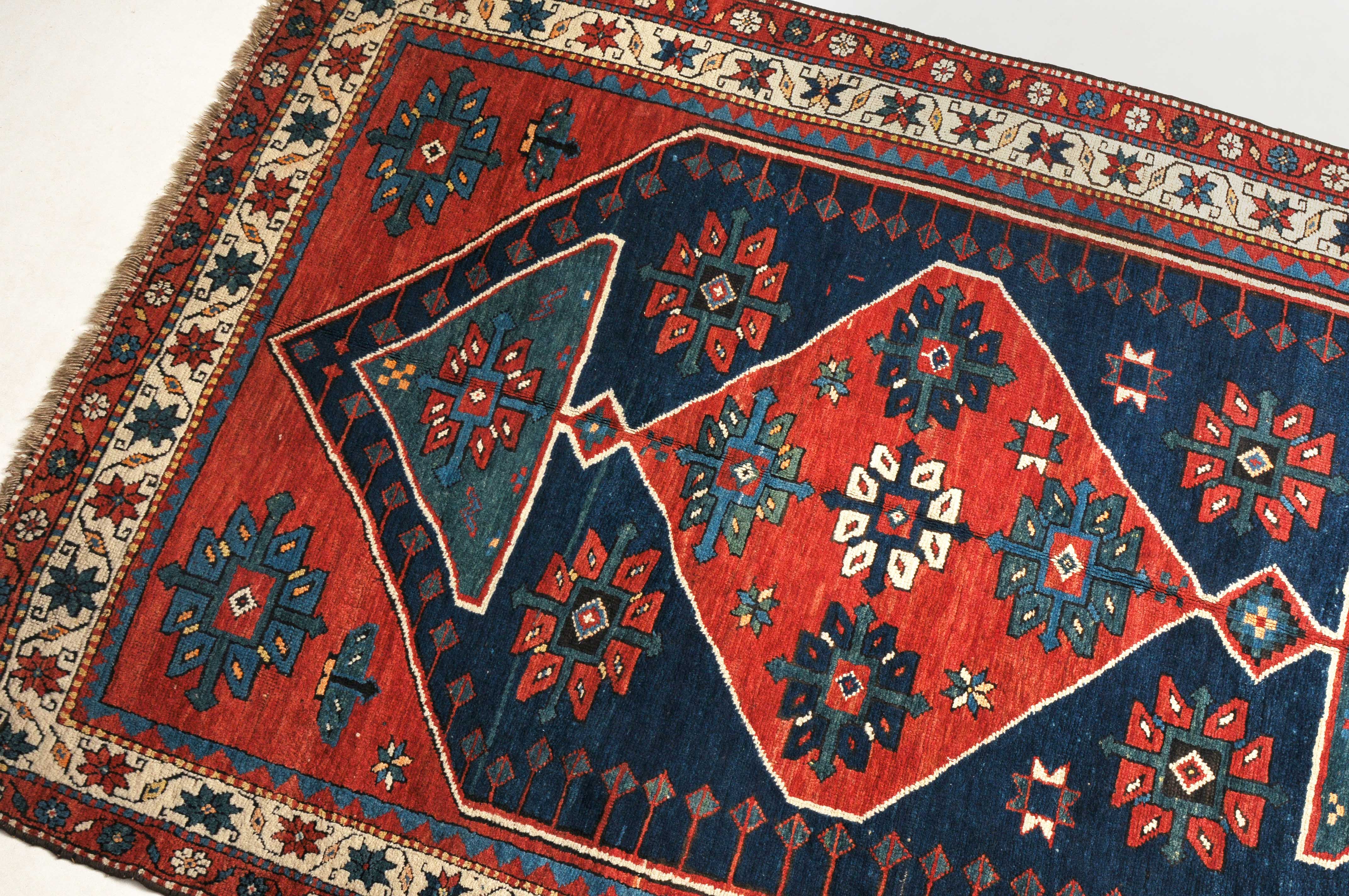 W-Kaukasus, um 1910. Im hexagonalen blauen Mittelfeld ruht ein rotes Rautenmedaillon mit 2 grosszügig angelegten türkisen Halbrauten-Anhängern, umgeben von geometrisch gehaltenen Blüten, seitlich ins Feld ragenden Pfeilspitzen sowie roten, miteinander verbundenen Eckzwickeln. Die weisse Sternblütenbordüre bildet einen schönen farblichen Kontrast zum Feld. Gebrauchsspuren. 154x286 cm (ft. 5.1x9.4).