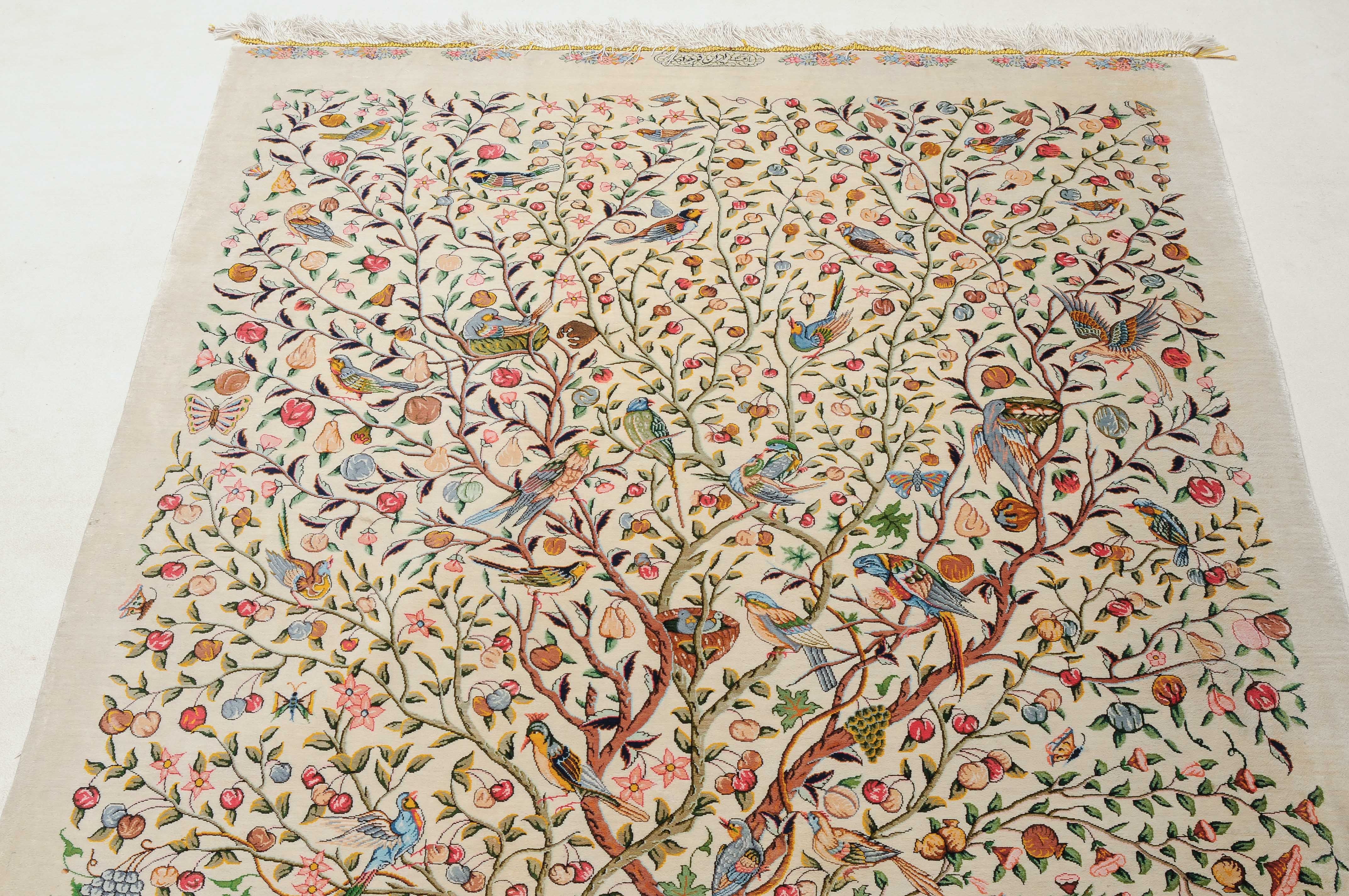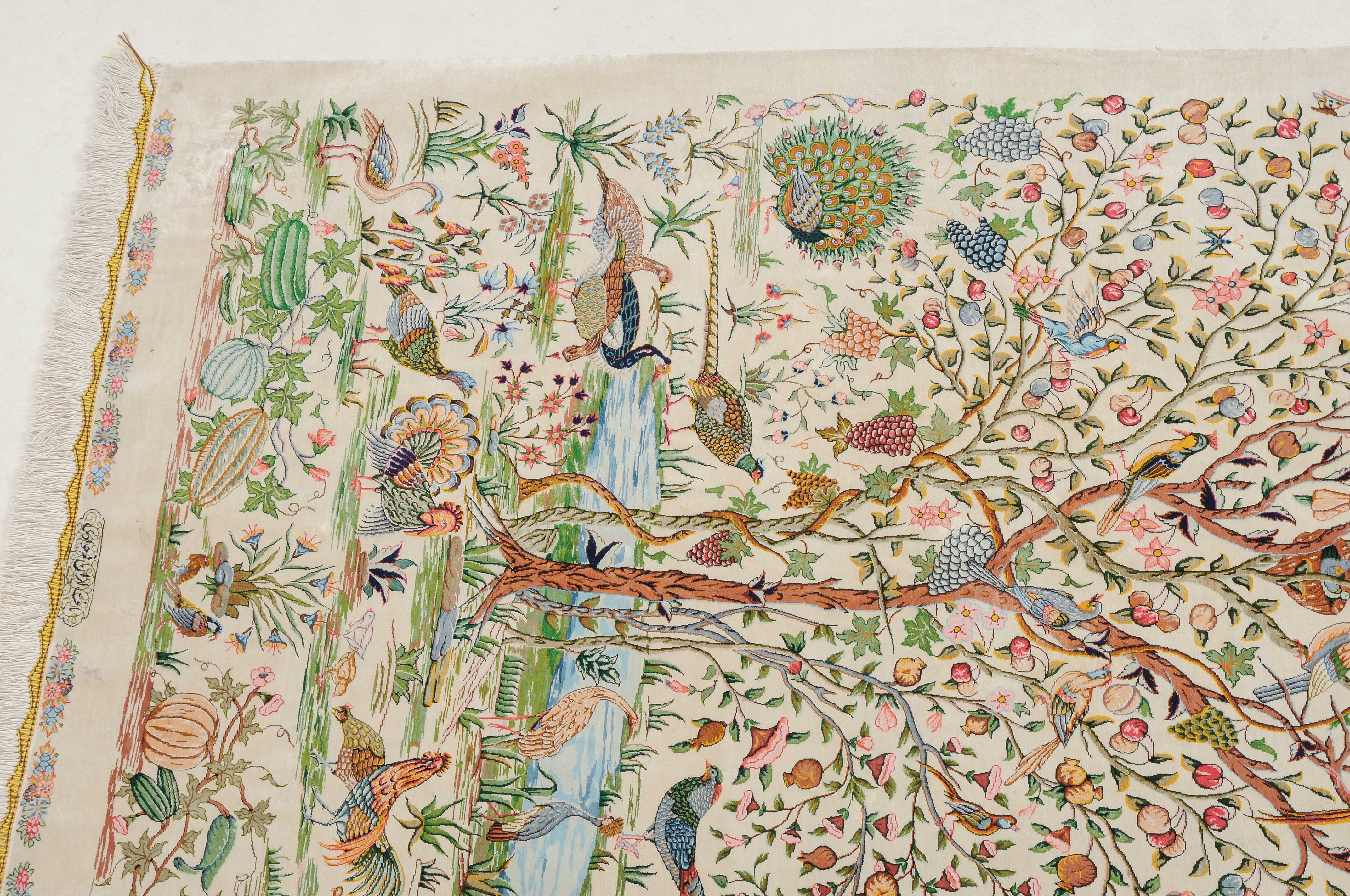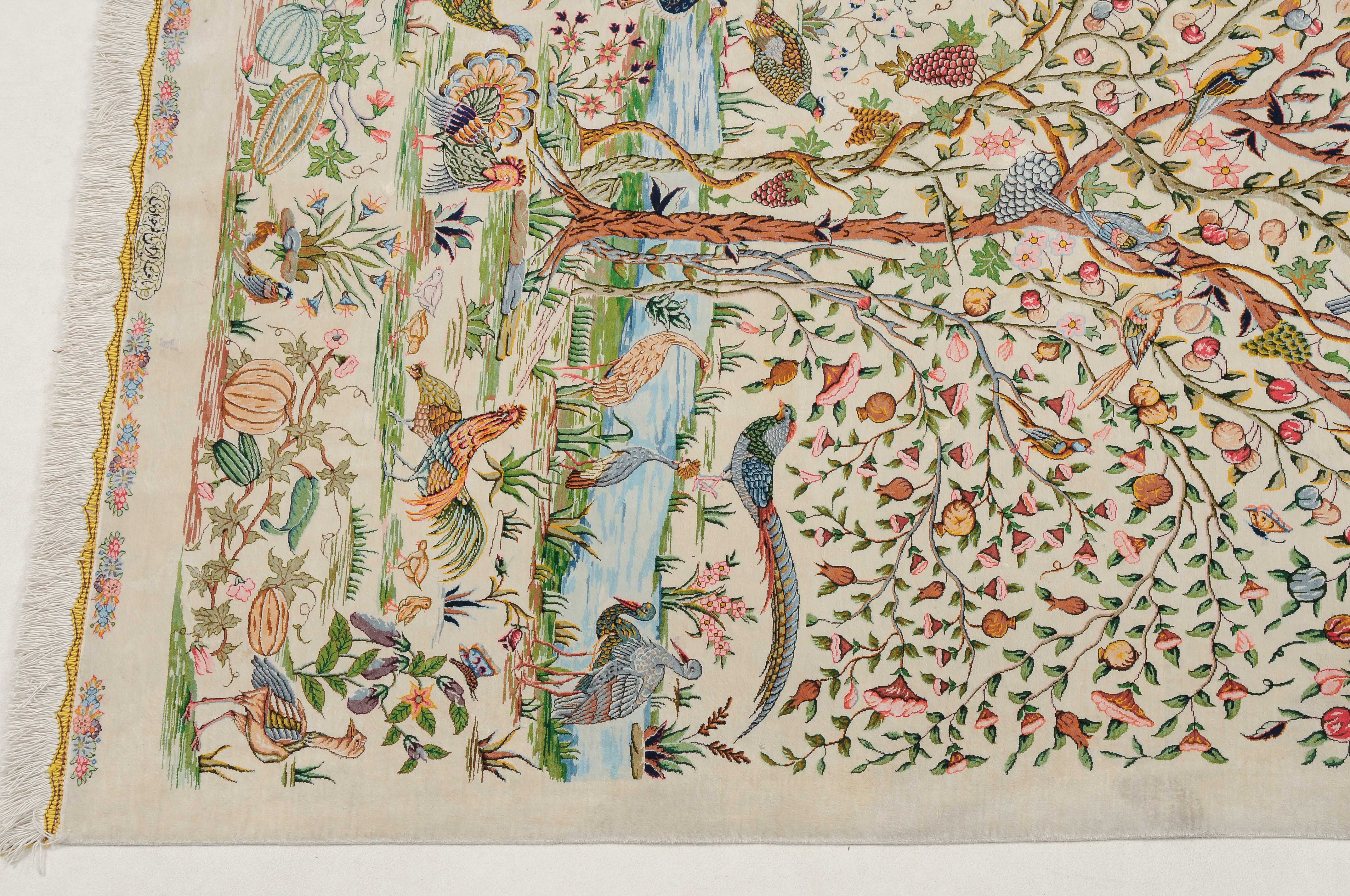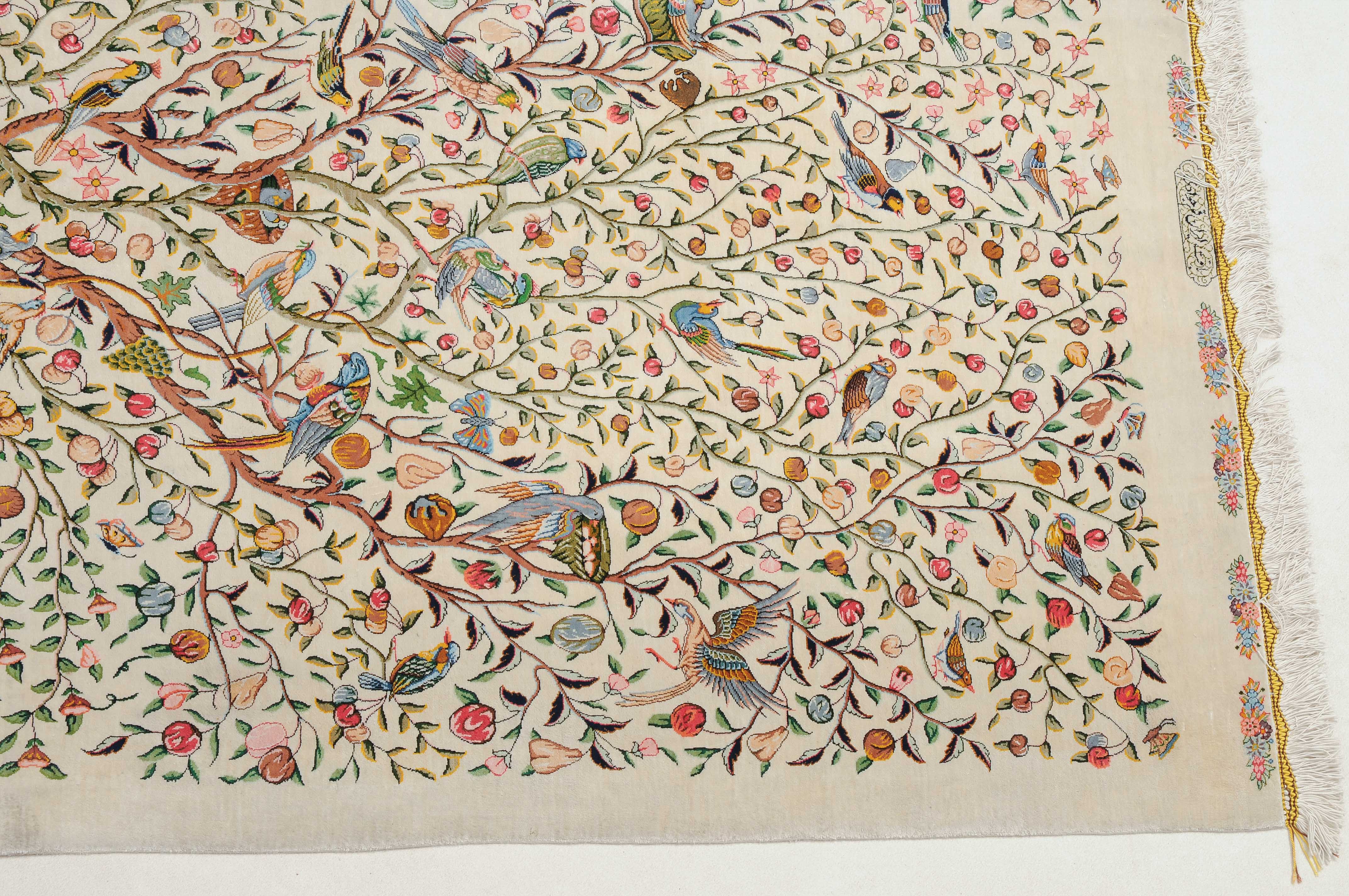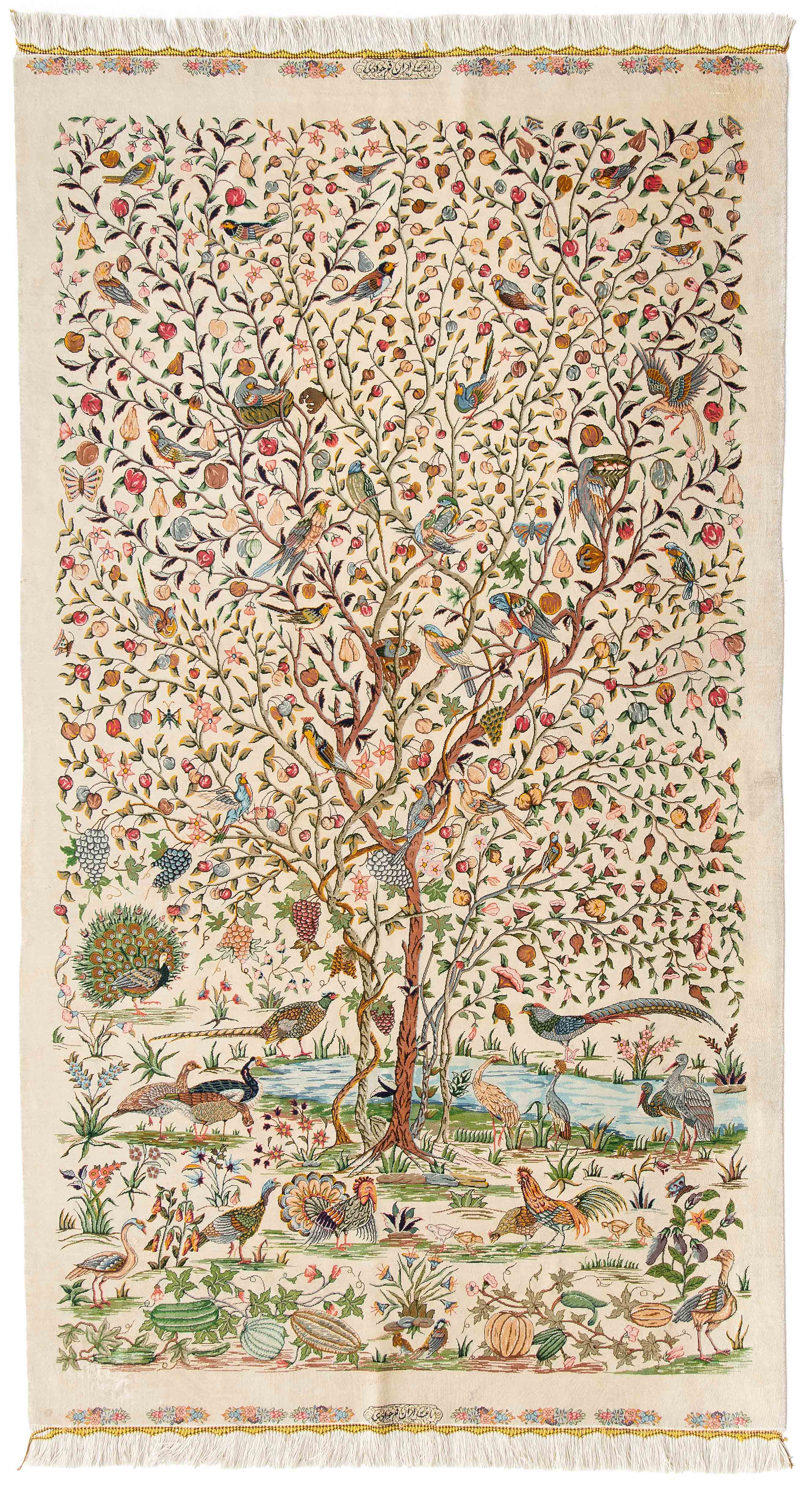 Z-Persien, um 1990. Oben und unten signiert mit "Ghom Djavadi". Sehr ausgefallene und schöne "Lebensbaum"-Musterung. Auf beigem Grund figuriert ein sich über das gesamte Feld erstreckender blühender Baum, auf dessen Ästen eine Vielzahl von Vögeln sitzen und der über und über mit Blüten und Früchten behangen ist. Am Fusse des Baums figuriert ein Teich mit einer Vielzahl von Hühnern und Fasanen. Leicht fleckig, ansonsten sehr gute Erhaltung. 105x190 cm (ft. 3.5x6.3).