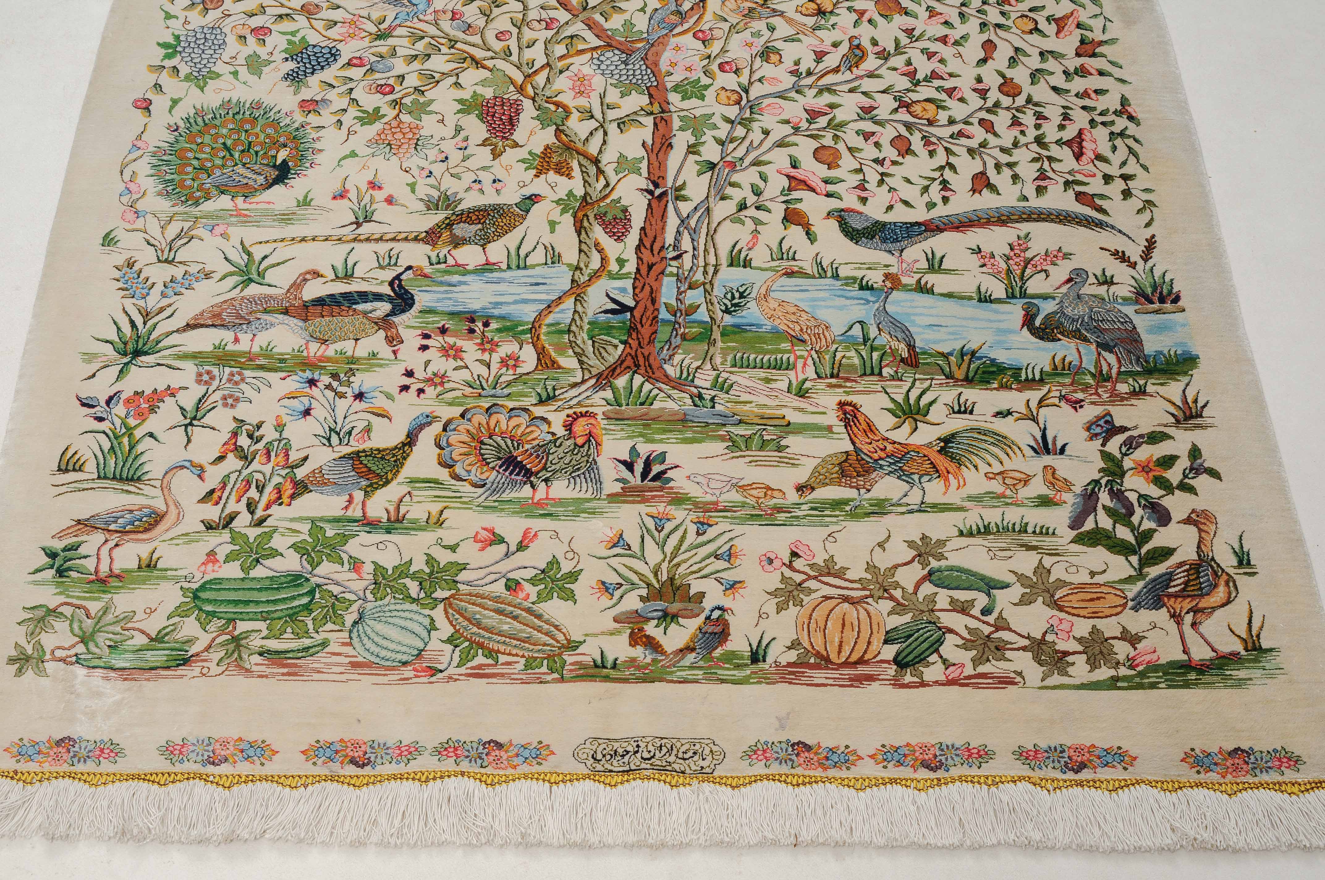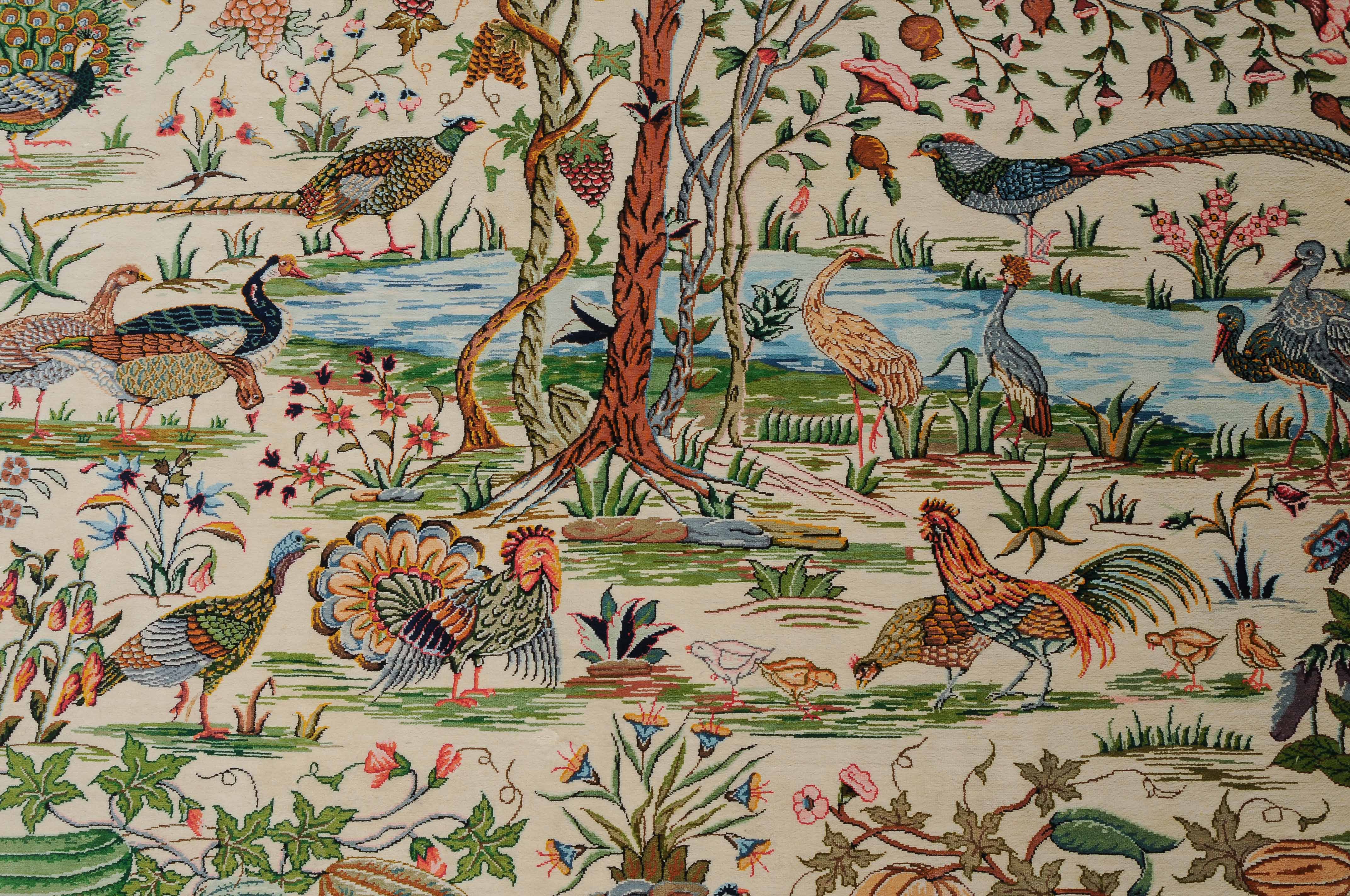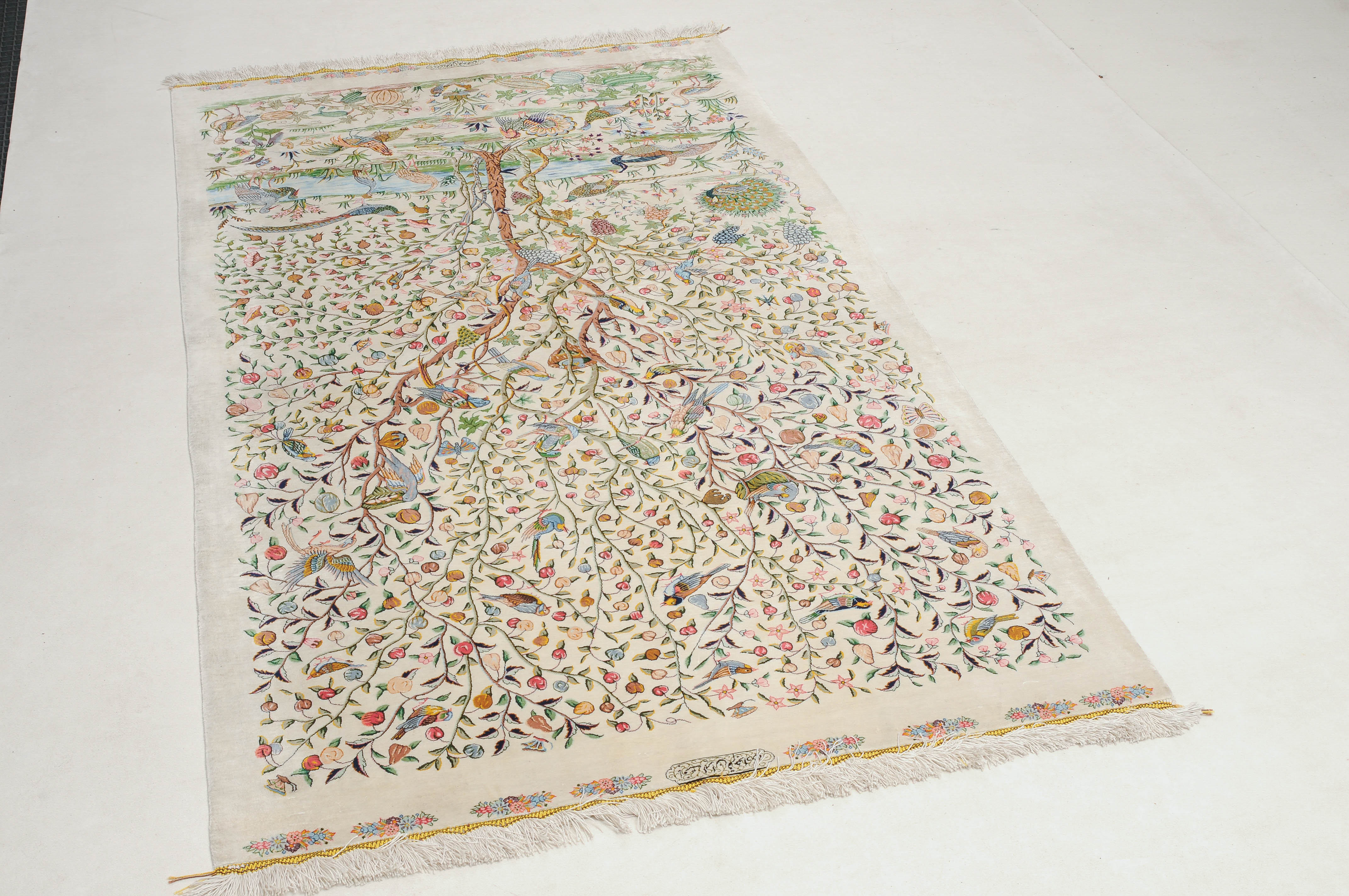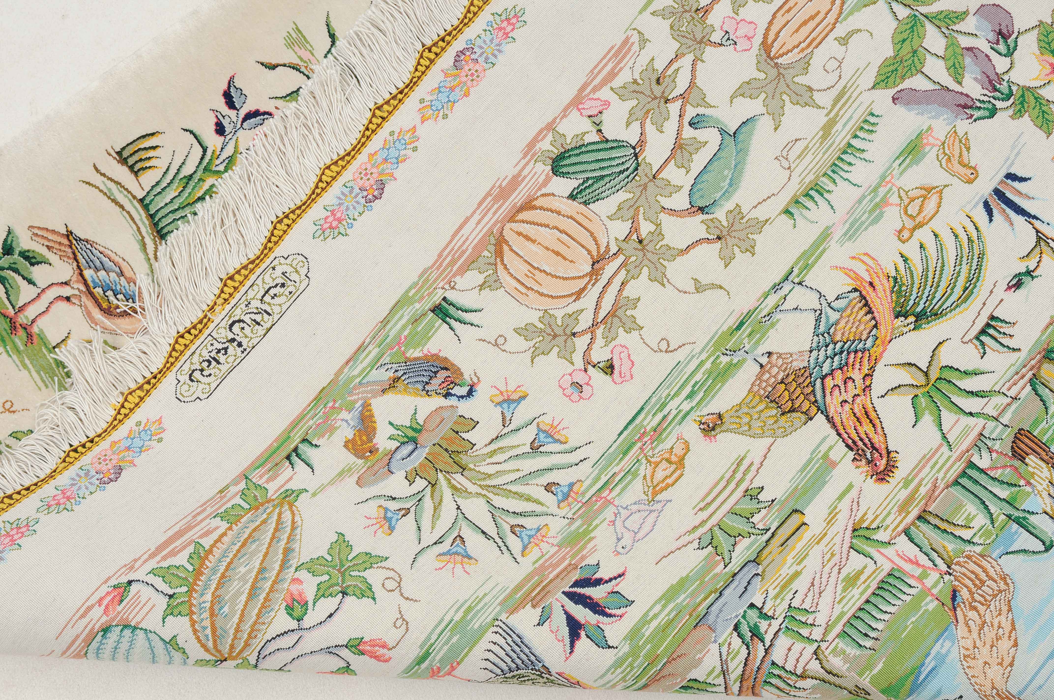 Z-Persien, um 1990. Oben und unten signiert mit "Ghom Djavadi". Sehr ausgefallene und schöne "Lebensbaum"-Musterung. Auf beigem Grund figuriert ein sich über das gesamte Feld erstreckender blühender Baum, auf dessen Ästen eine Vielzahl von Vögeln sitzen und der über und über mit Blüten und Früchten behangen ist. Am Fusse des Baums figuriert ein Teich mit einer Vielzahl von Hühnern und Fasanen. Leicht fleckig, ansonsten sehr gute Erhaltung. 105x190 cm (ft. 3.5x6.3).