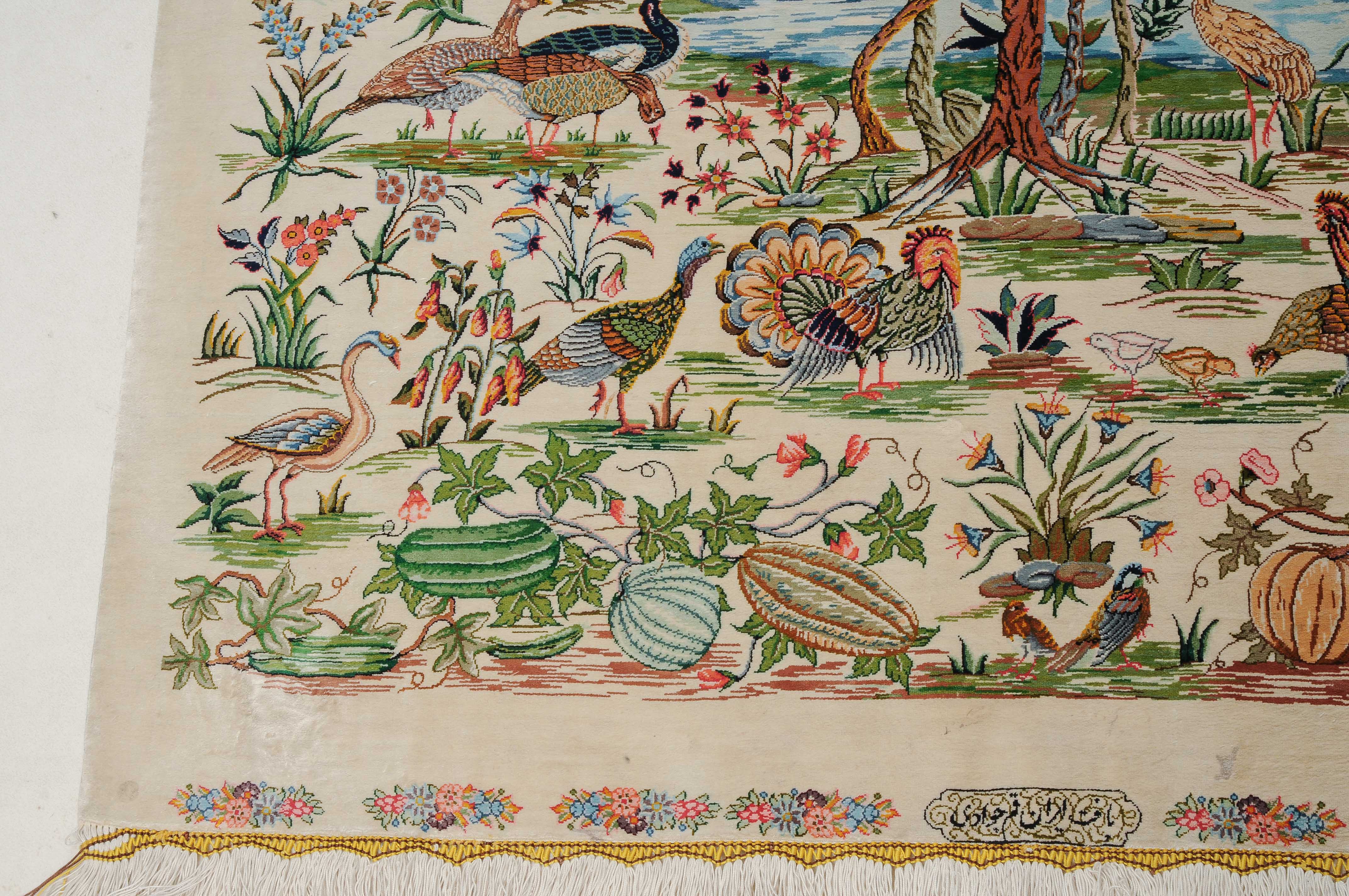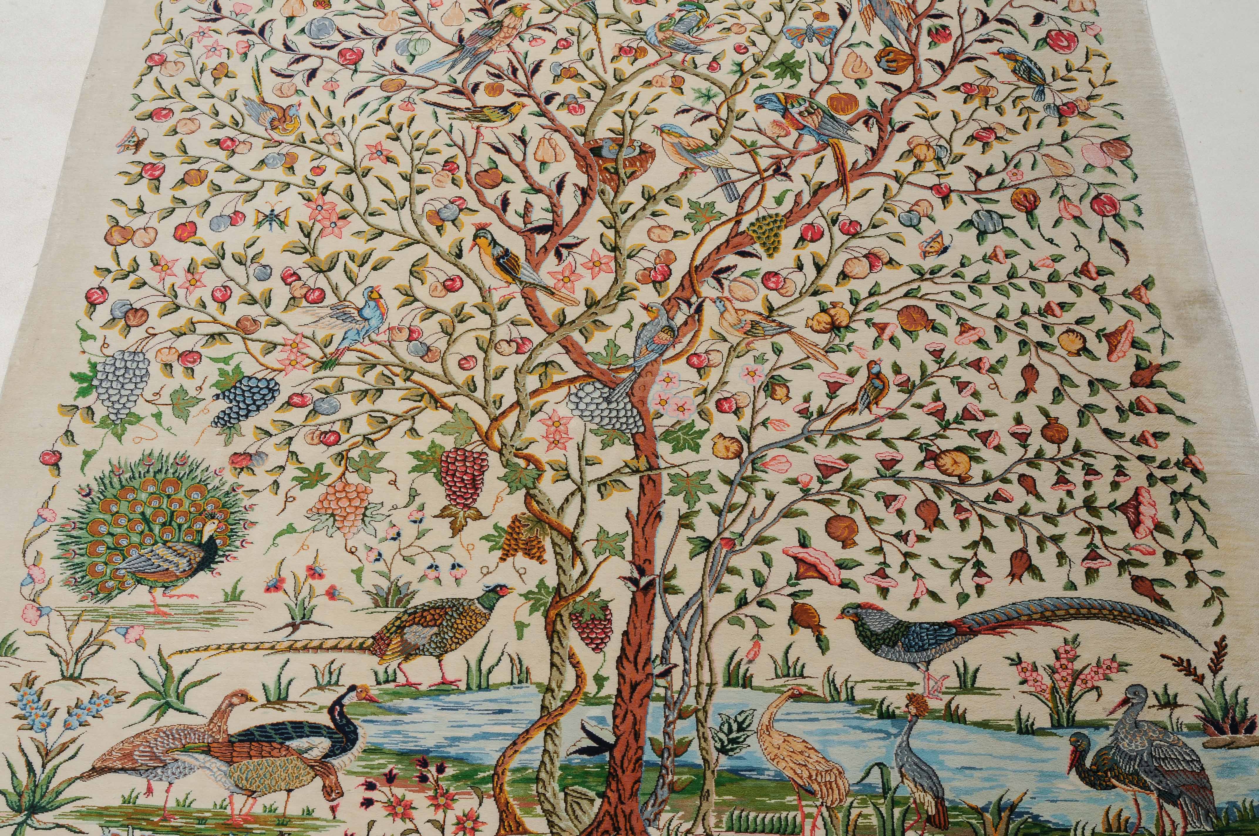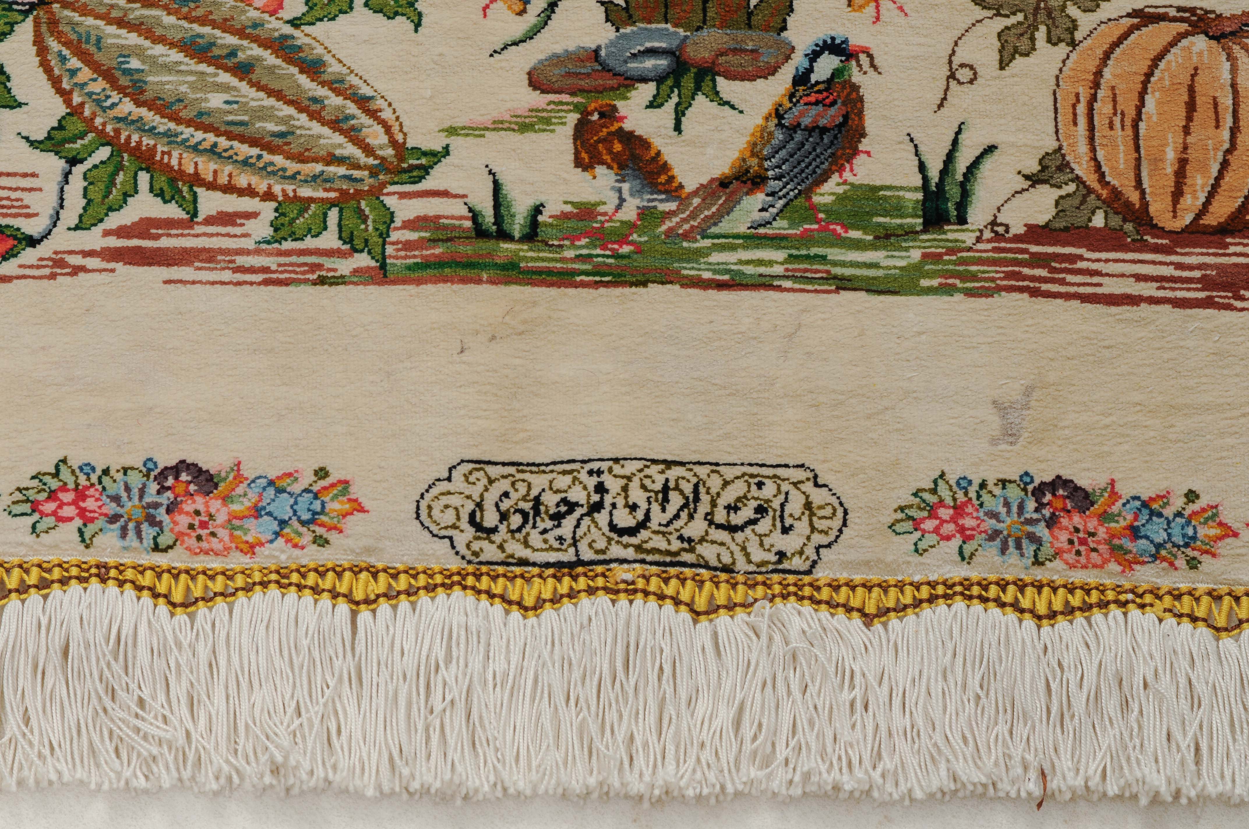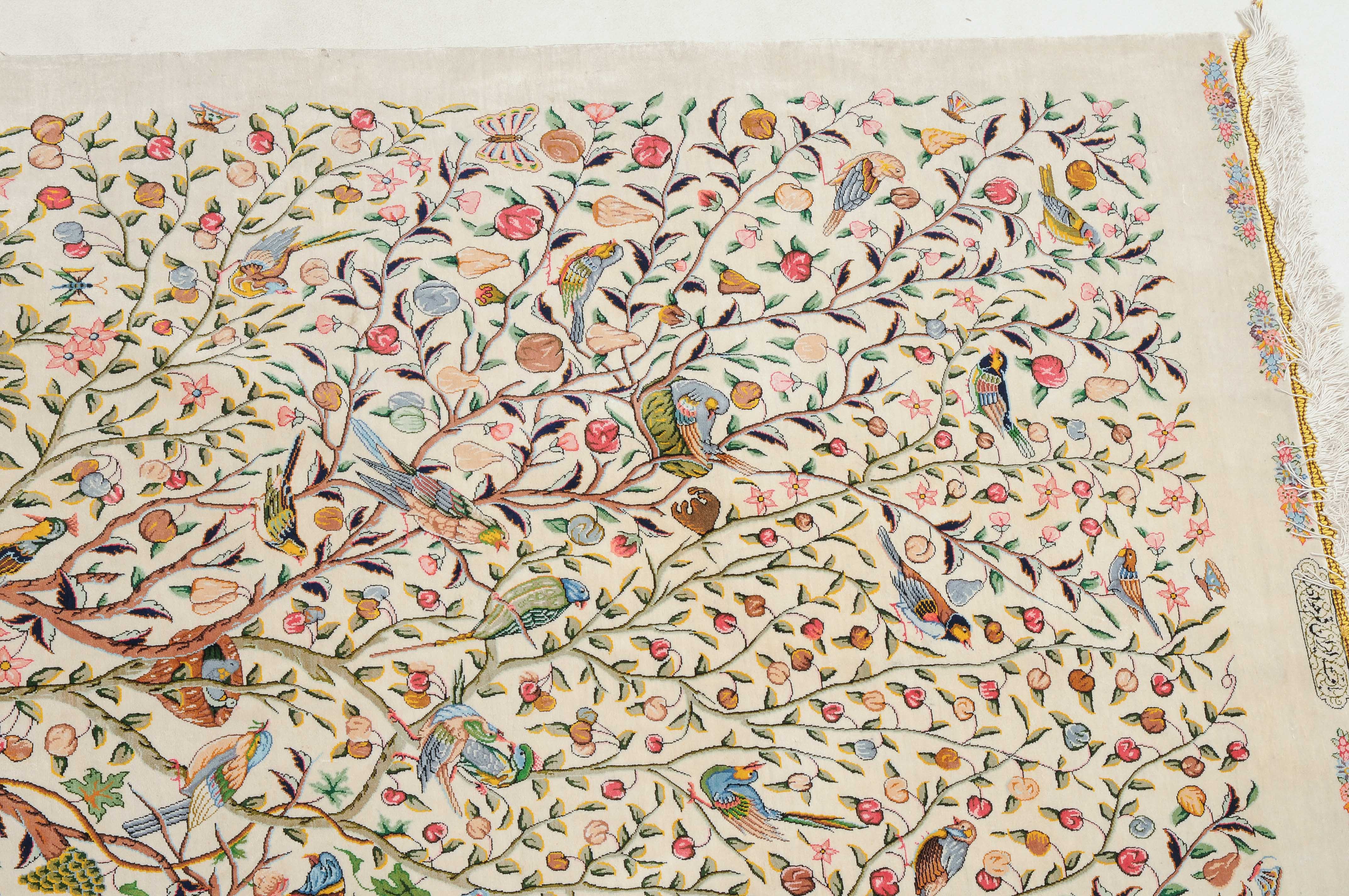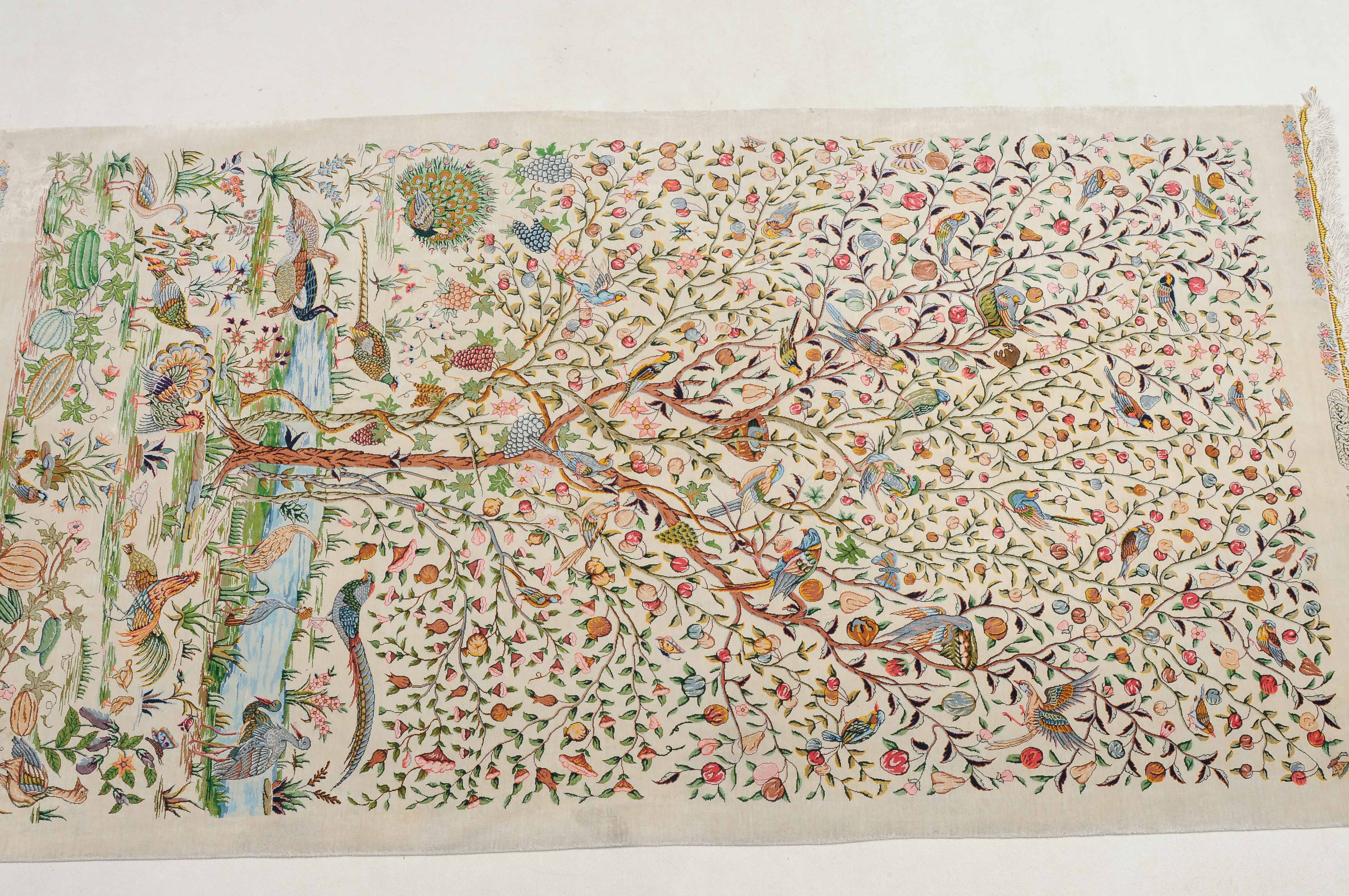 Z-Persien, um 1990. Oben und unten signiert mit "Ghom Djavadi". Sehr ausgefallene und schöne "Lebensbaum"-Musterung. Auf beigem Grund figuriert ein sich über das gesamte Feld erstreckender blühender Baum, auf dessen Ästen eine Vielzahl von Vögeln sitzen und der über und über mit Blüten und Früchten behangen ist. Am Fusse des Baums figuriert ein Teich mit einer Vielzahl von Hühnern und Fasanen. Leicht fleckig, ansonsten sehr gute Erhaltung. 105x190 cm (ft. 3.5x6.3).