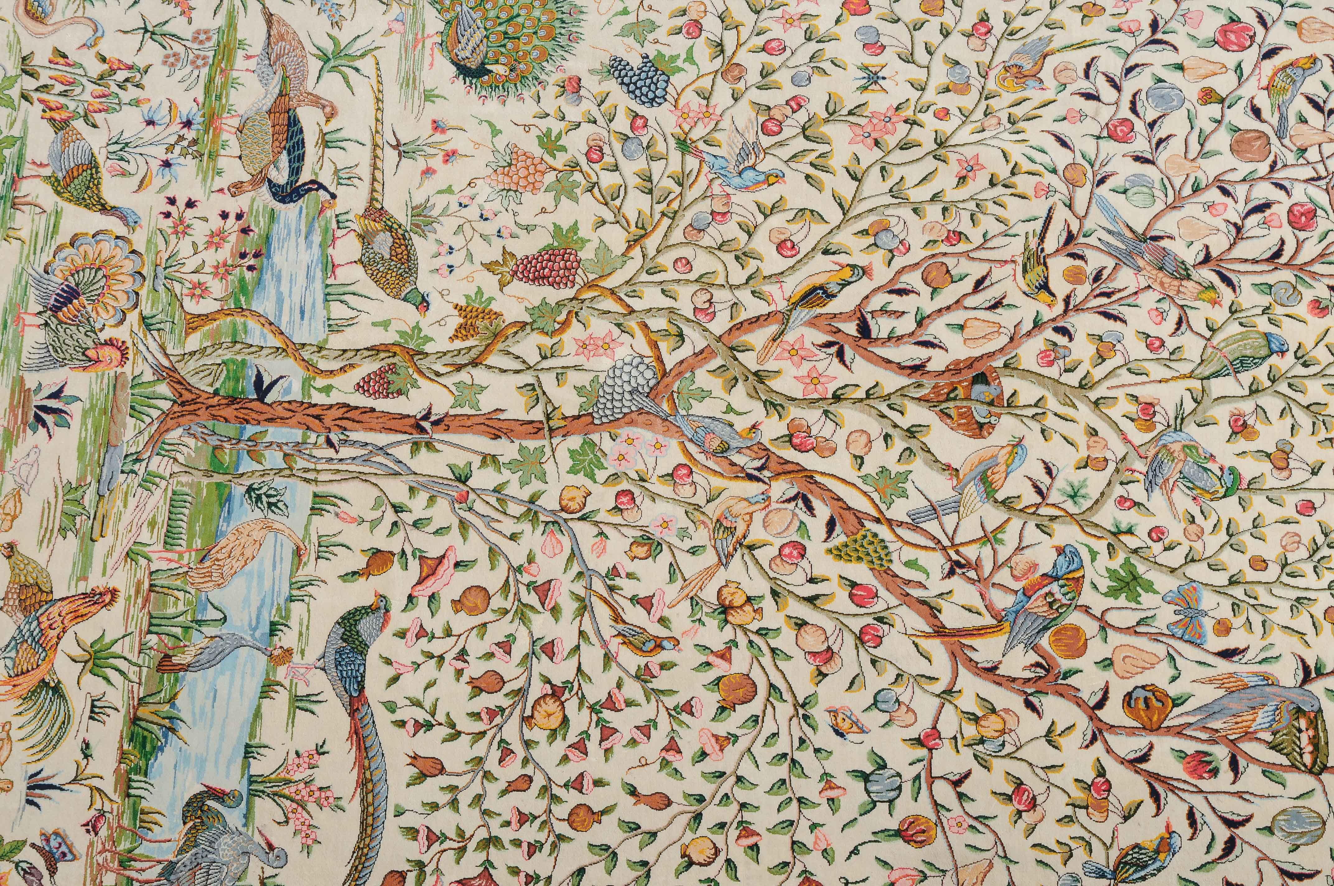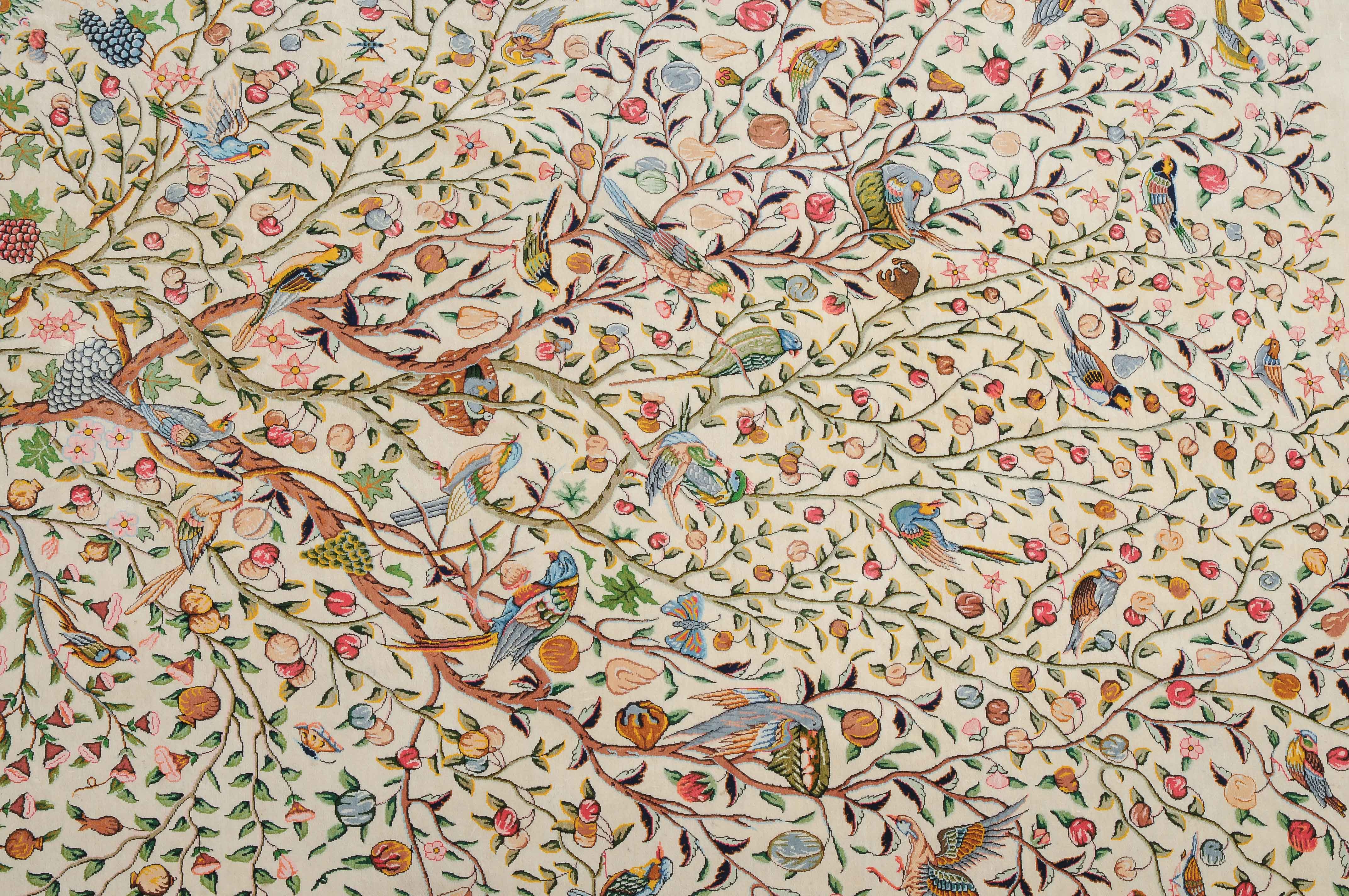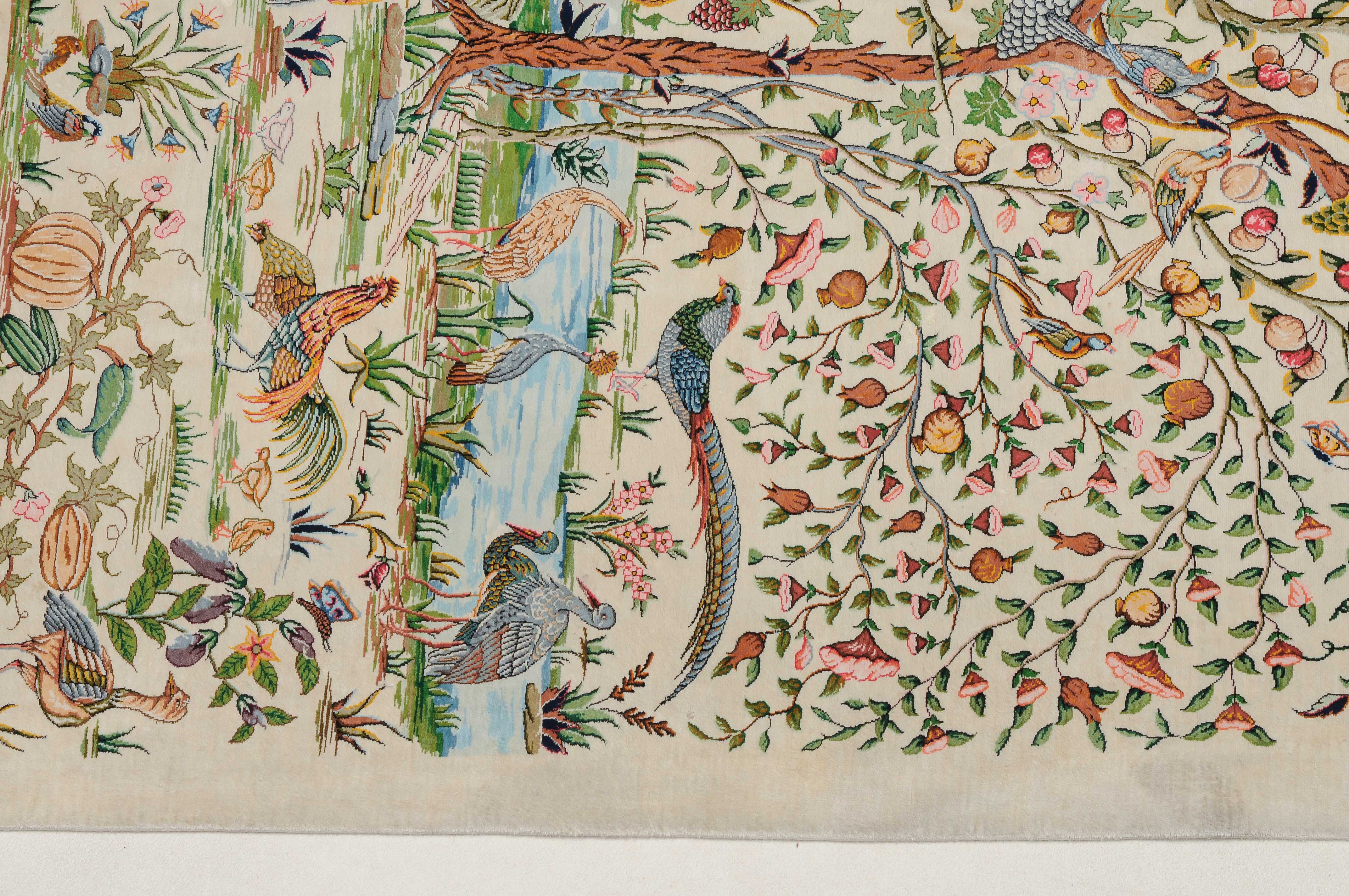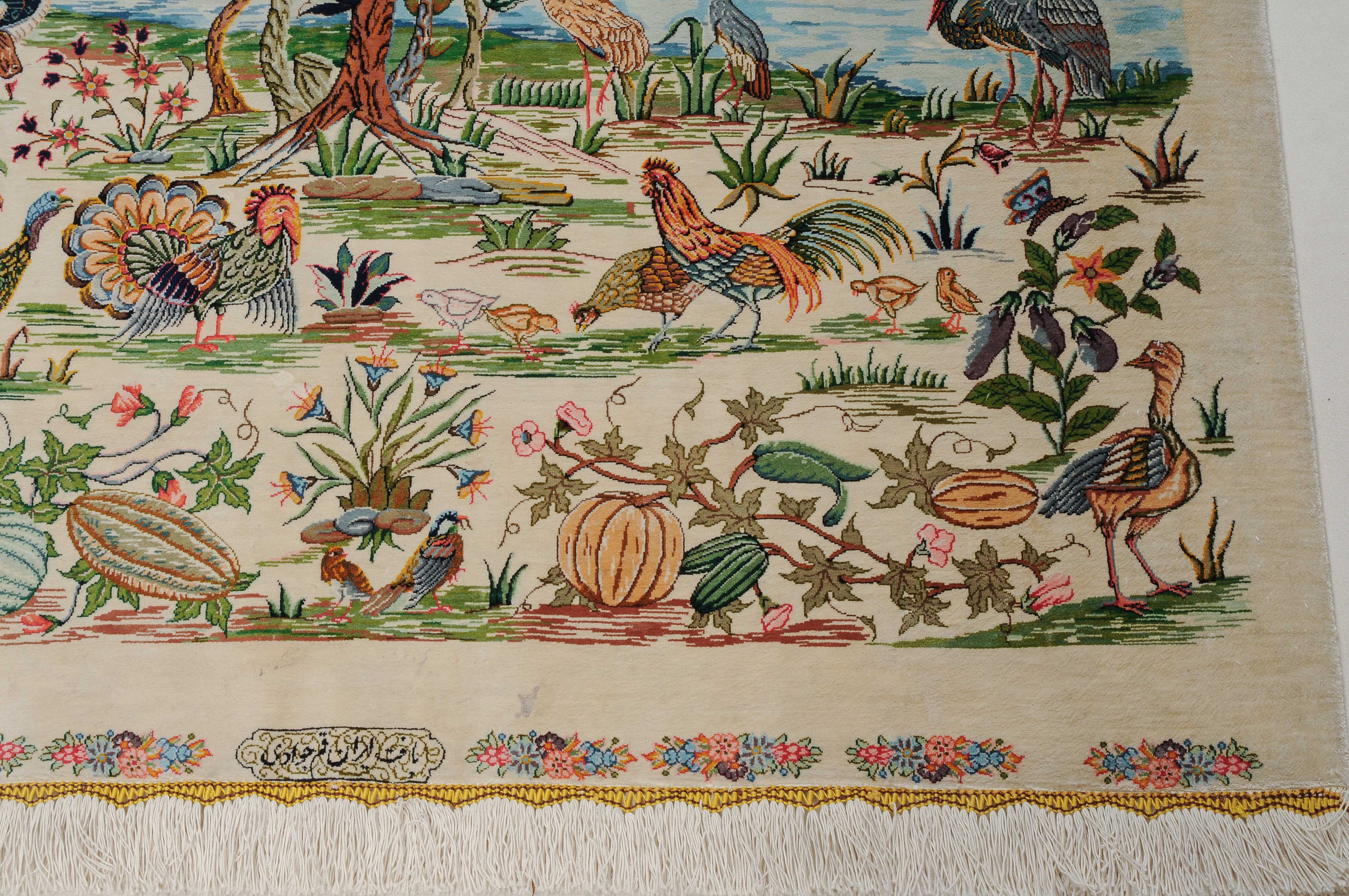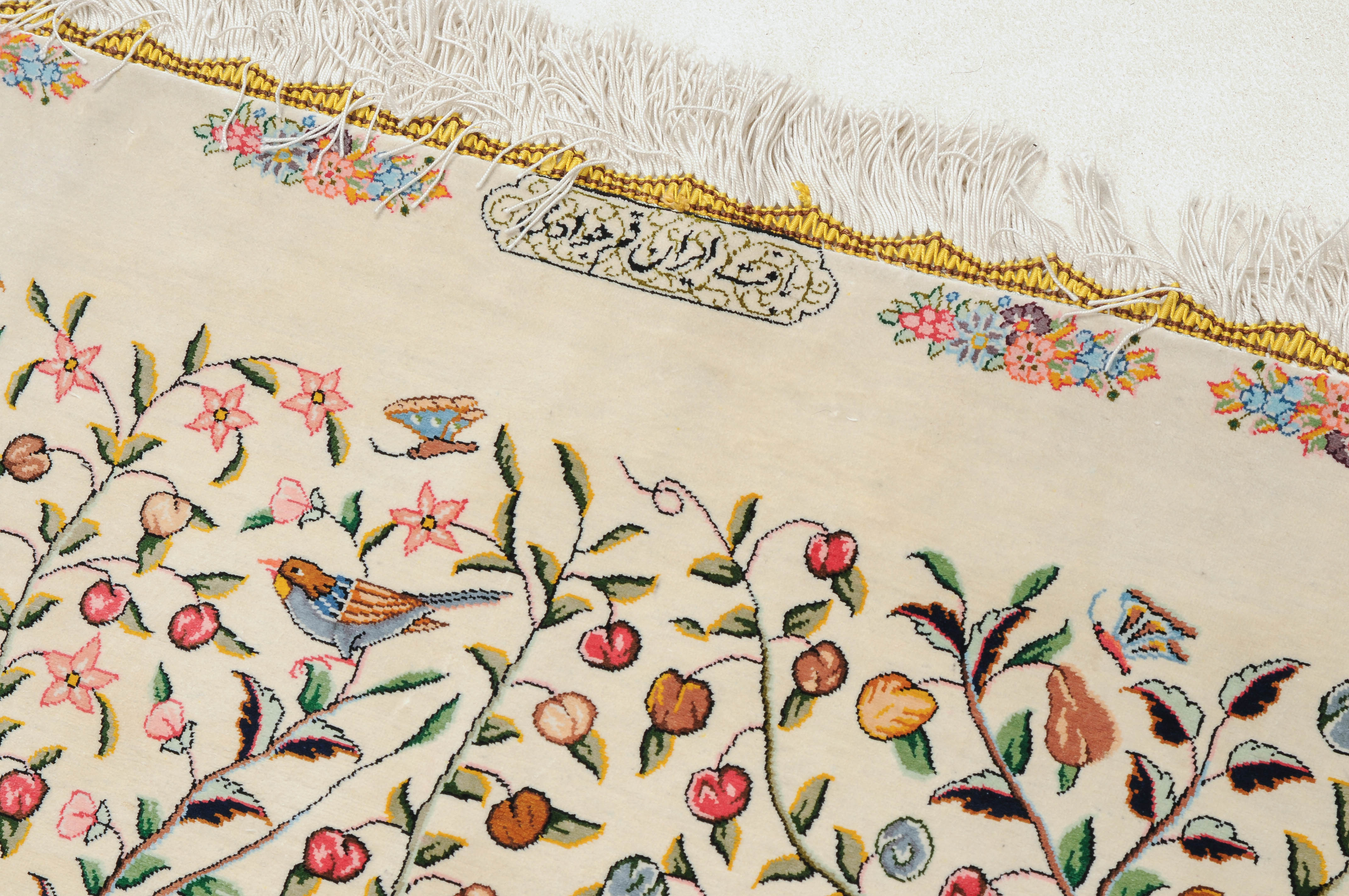 Z-Persien, um 1990. Oben und unten signiert mit "Ghom Djavadi". Sehr ausgefallene und schöne "Lebensbaum"-Musterung. Auf beigem Grund figuriert ein sich über das gesamte Feld erstreckender blühender Baum, auf dessen Ästen eine Vielzahl von Vögeln sitzen und der über und über mit Blüten und Früchten behangen ist. Am Fusse des Baums figuriert ein Teich mit einer Vielzahl von Hühnern und Fasanen. Leicht fleckig, ansonsten sehr gute Erhaltung. 105x190 cm (ft. 3.5x6.3).