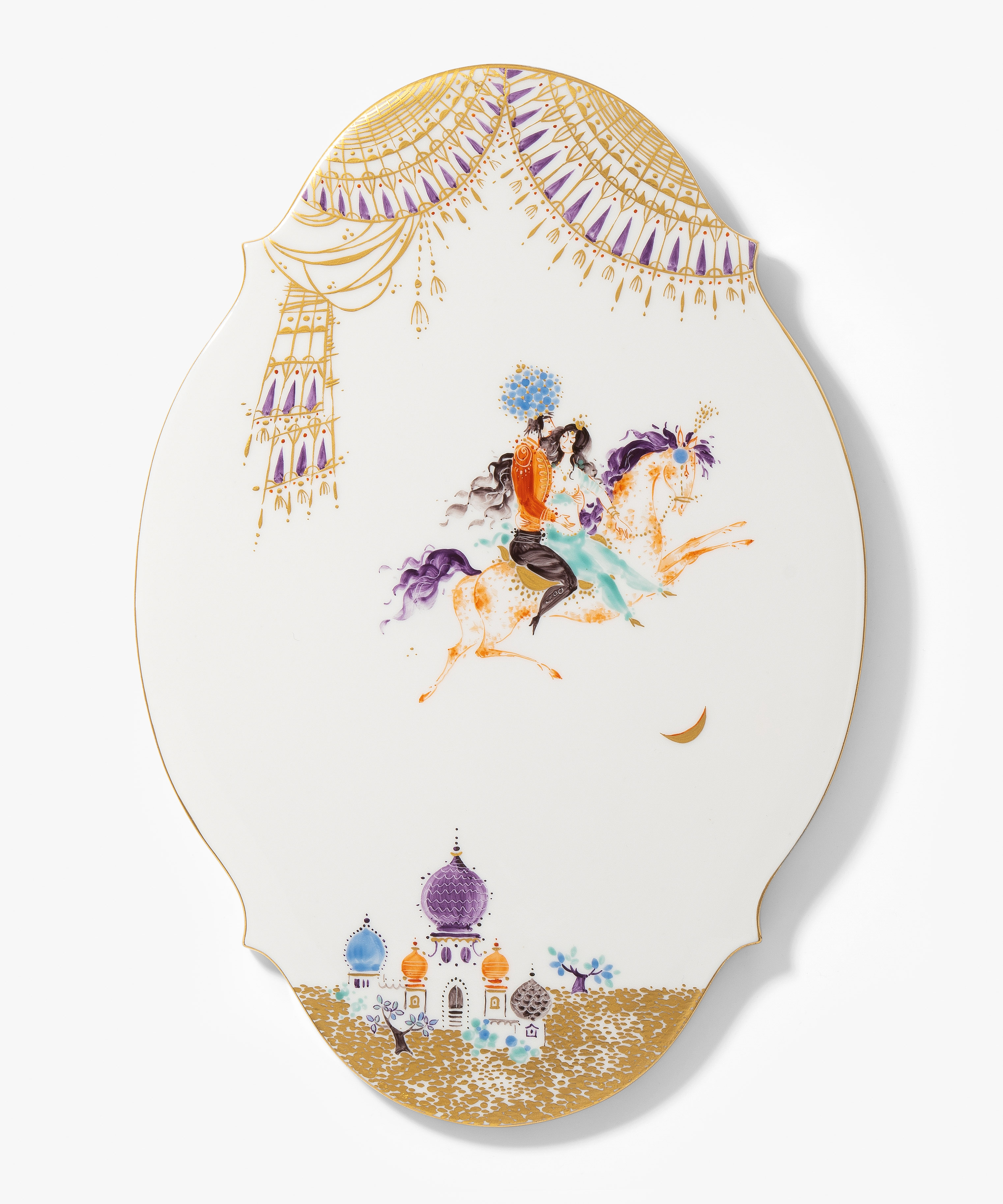 Um 1975. Porzellan, polychrom bemalt. Goldstaffierung. Dekor von Heinz Werner, "Tausendundeine Nacht", 1973. Bezeichnet: Unterglasurblaue Schwertermarke. L 29 cm.