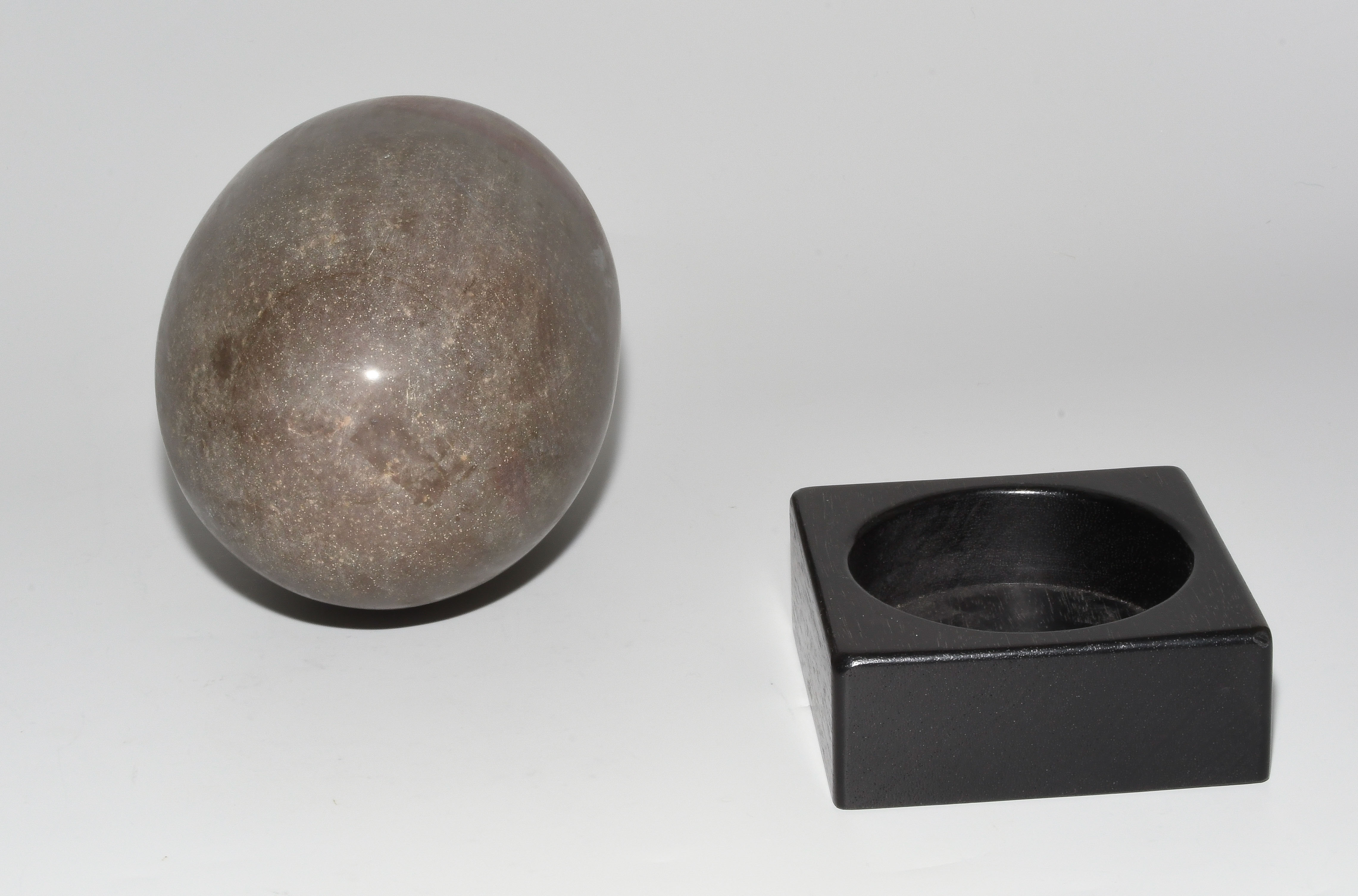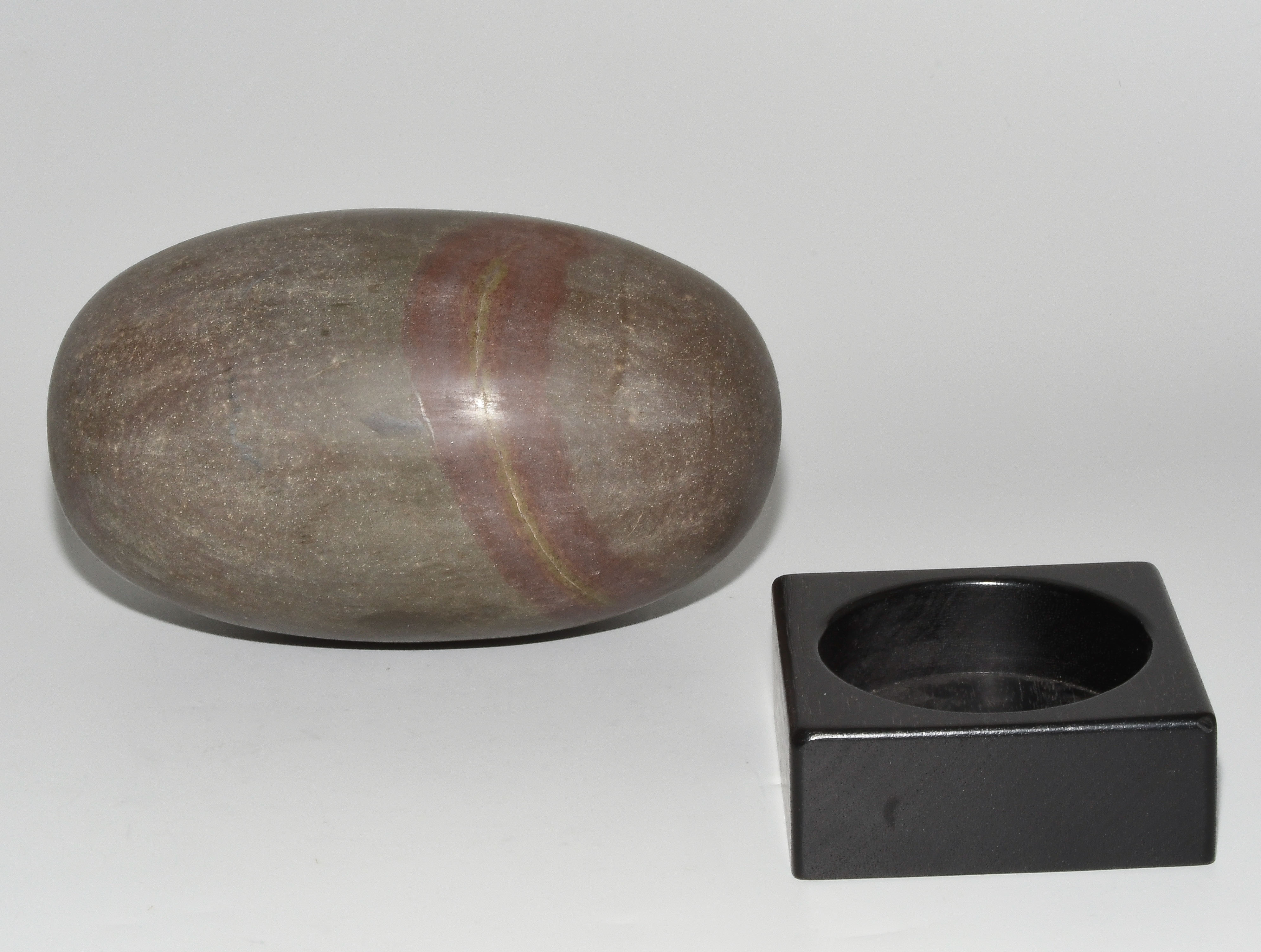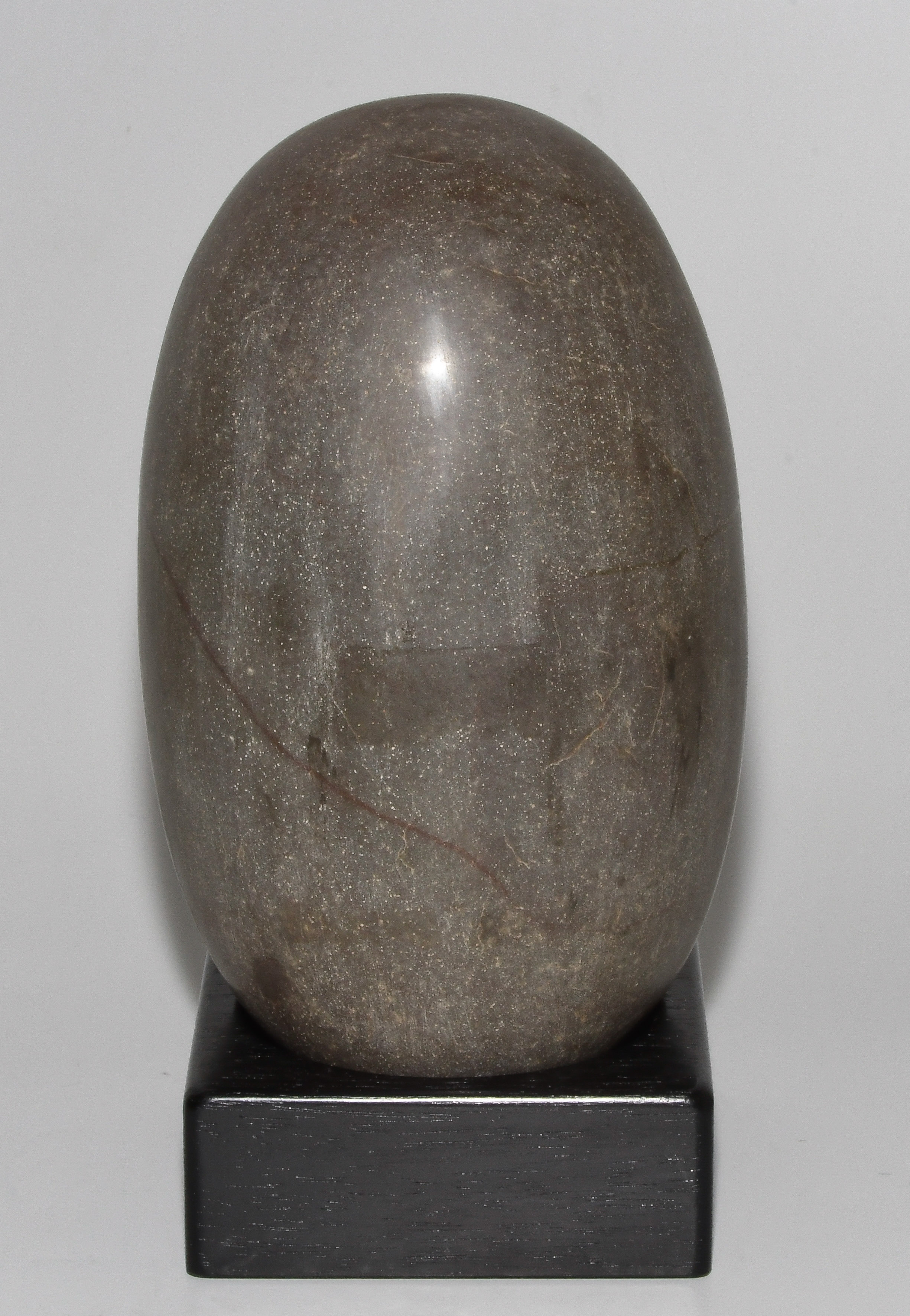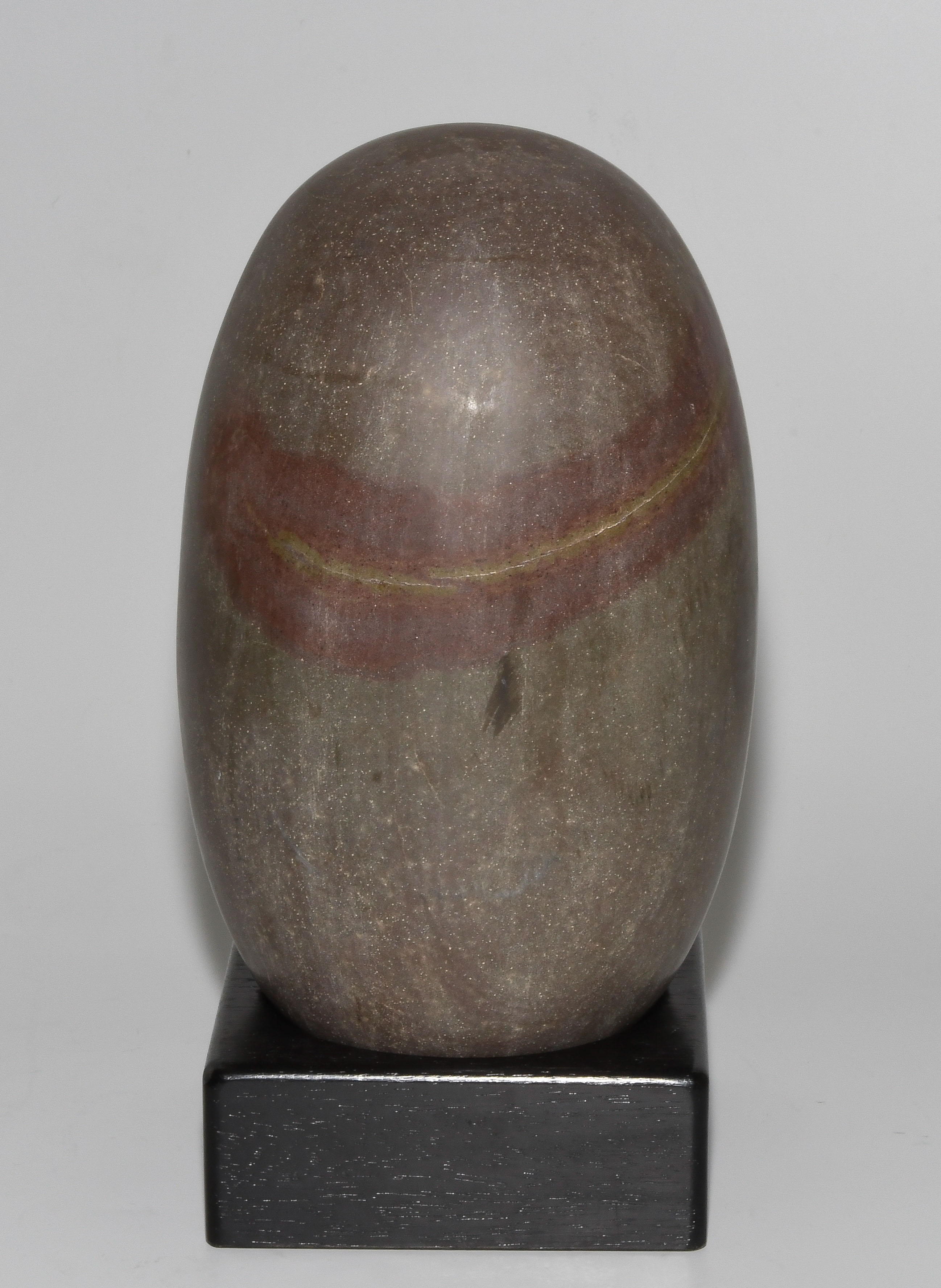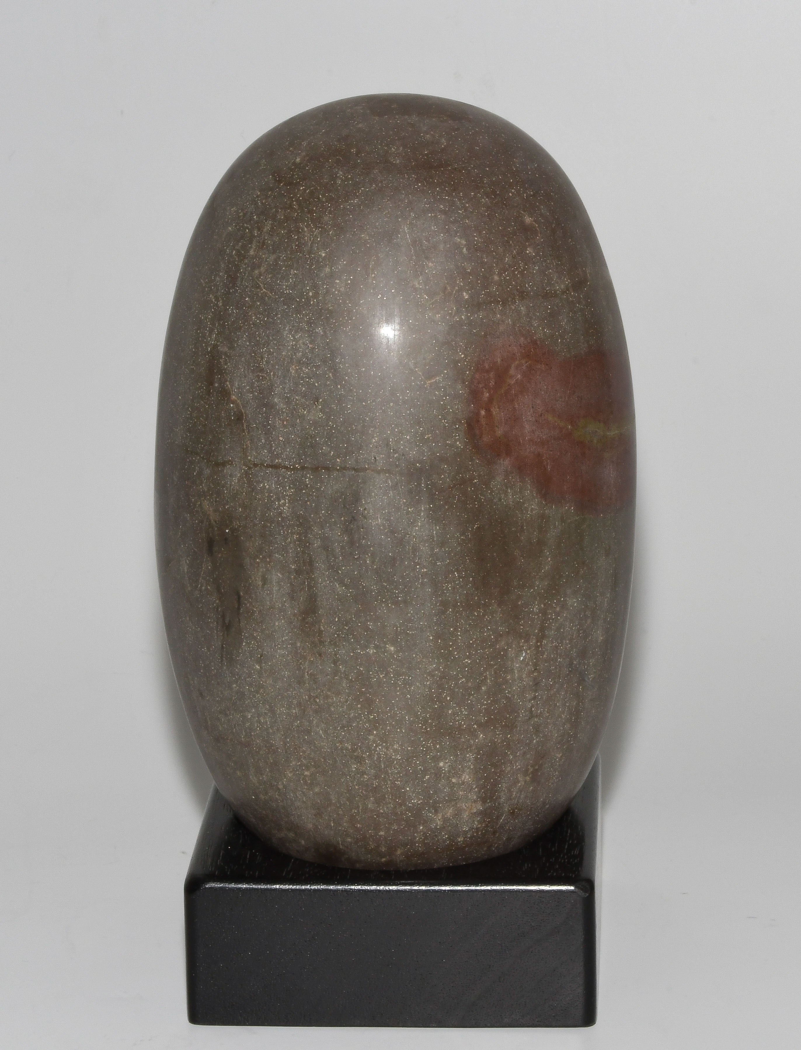 Indien, wohl 1.Hälfte 20.Jh. Graubrauner, polierter Stein mit rotem Einschluss. Der Shiva-Lingam ist das Symbol des hinduistischen Gottes Shiva. H 21 cm. Mit Holzstand.