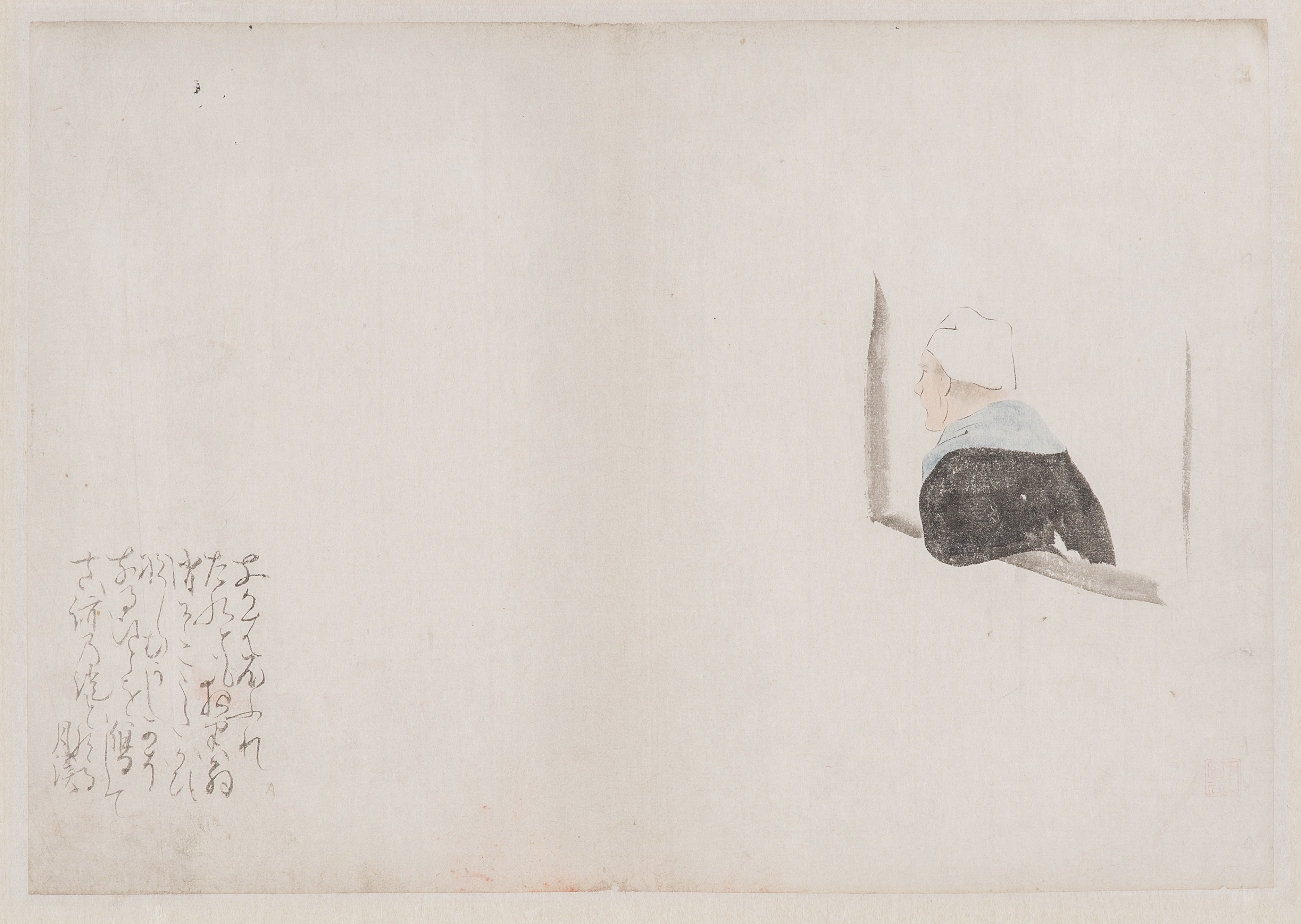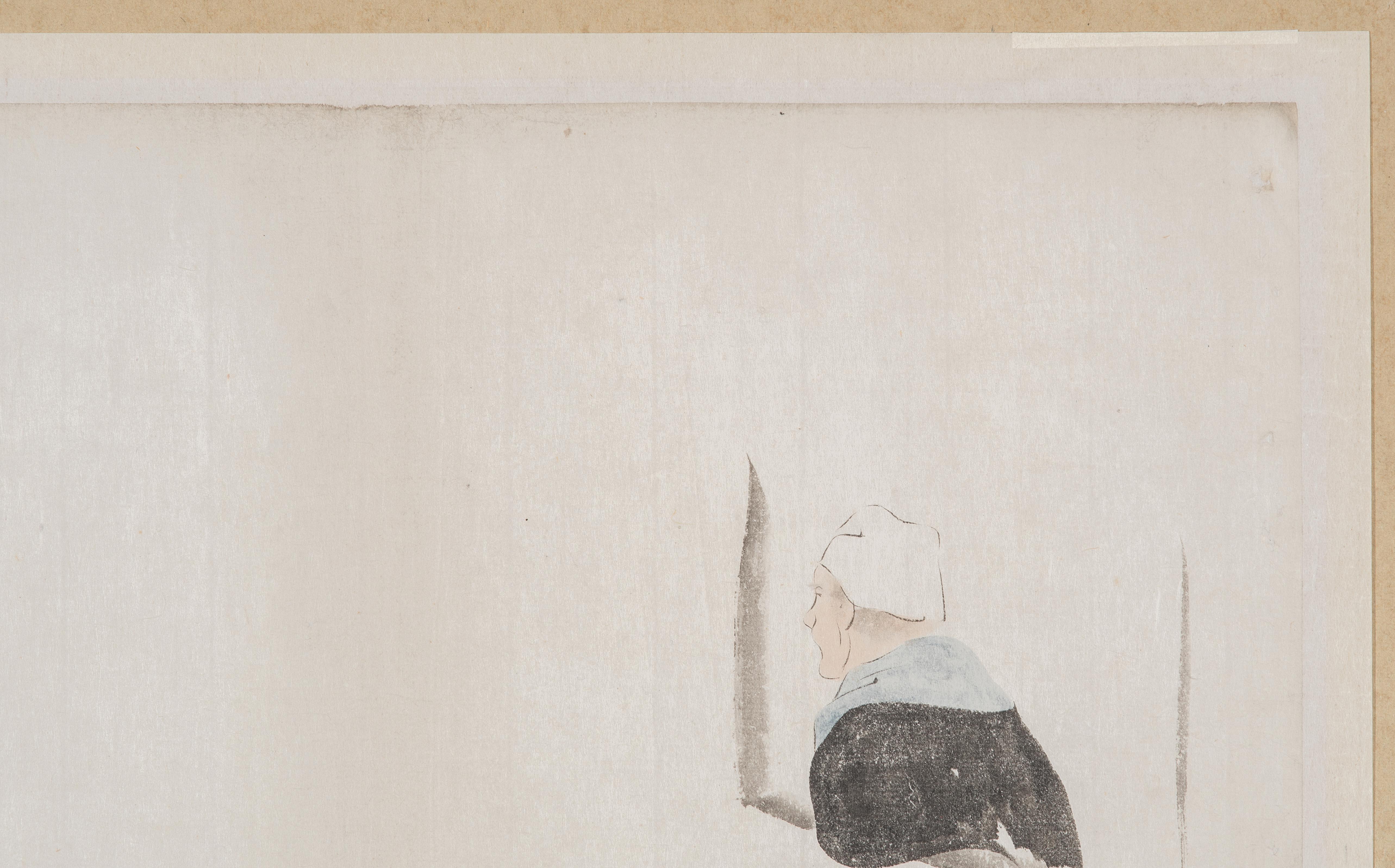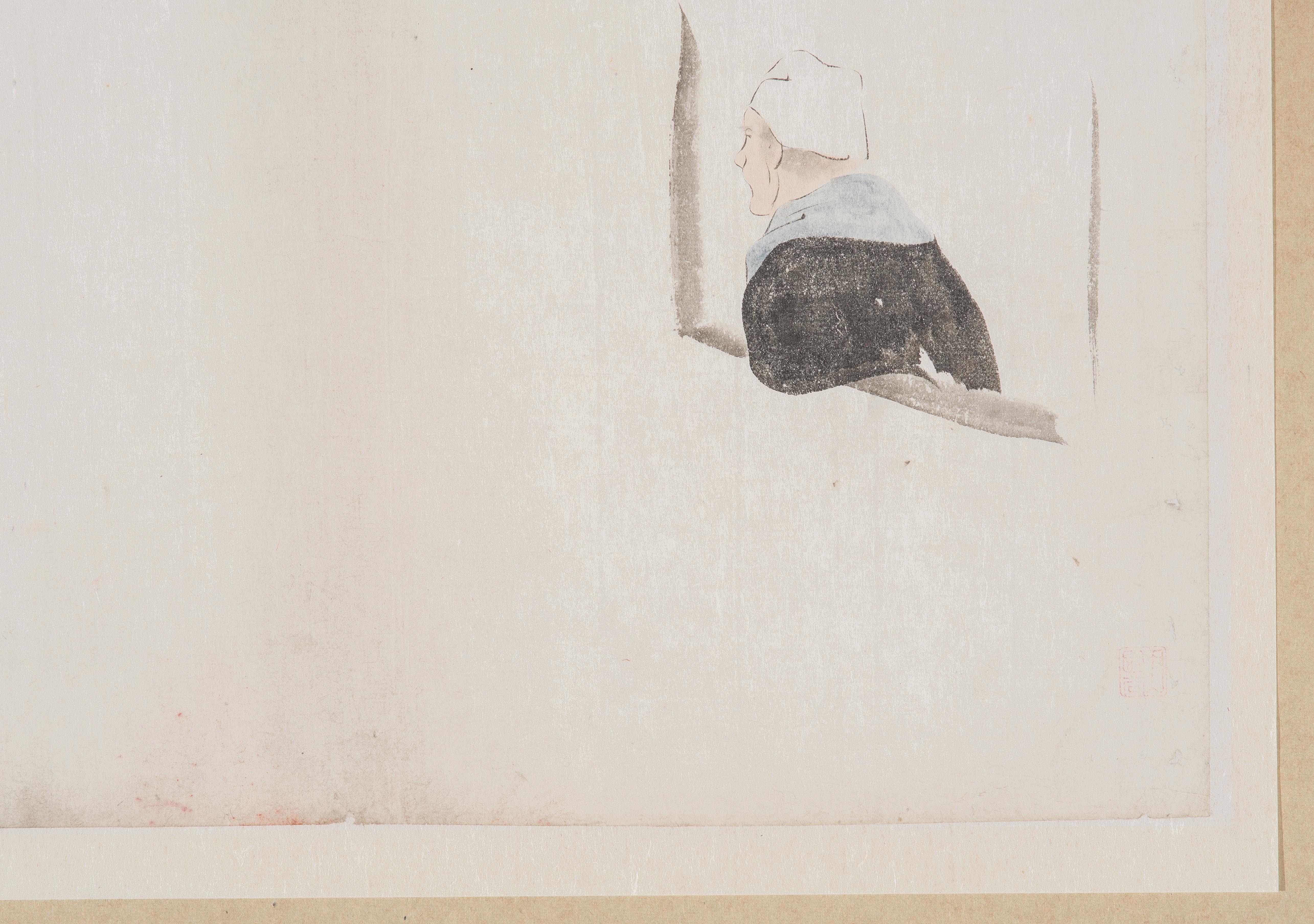 Tusche und Farbe auf Papier. Ein Teemeister, der seinen Kopf aus der Öffnung hält. Unten Links Tanka-Gedicht und signiert Gekkei. Rechts mit rotem Stempel. 28x40cm. - Oben montiert. Auf Papier hinterlegt.