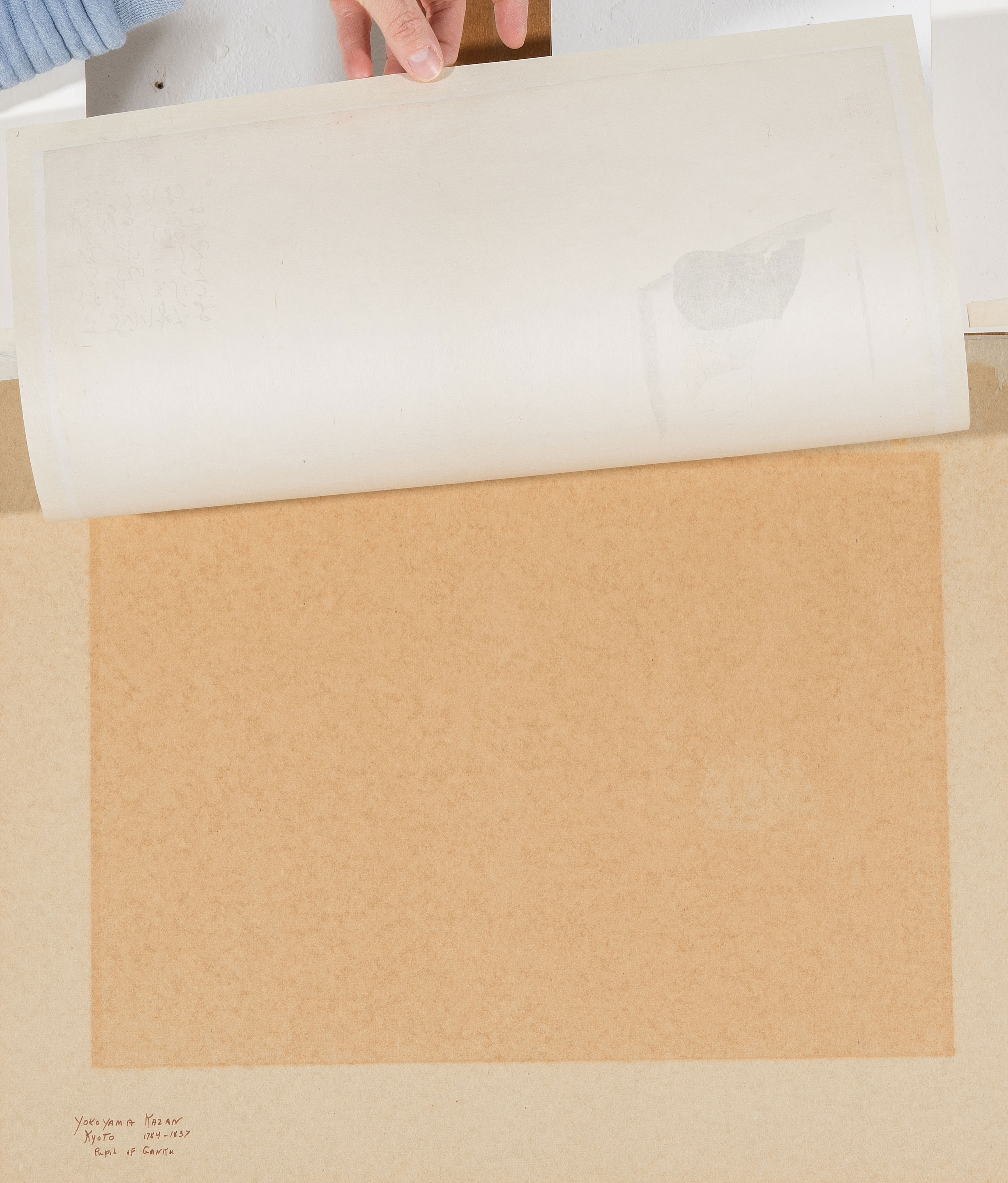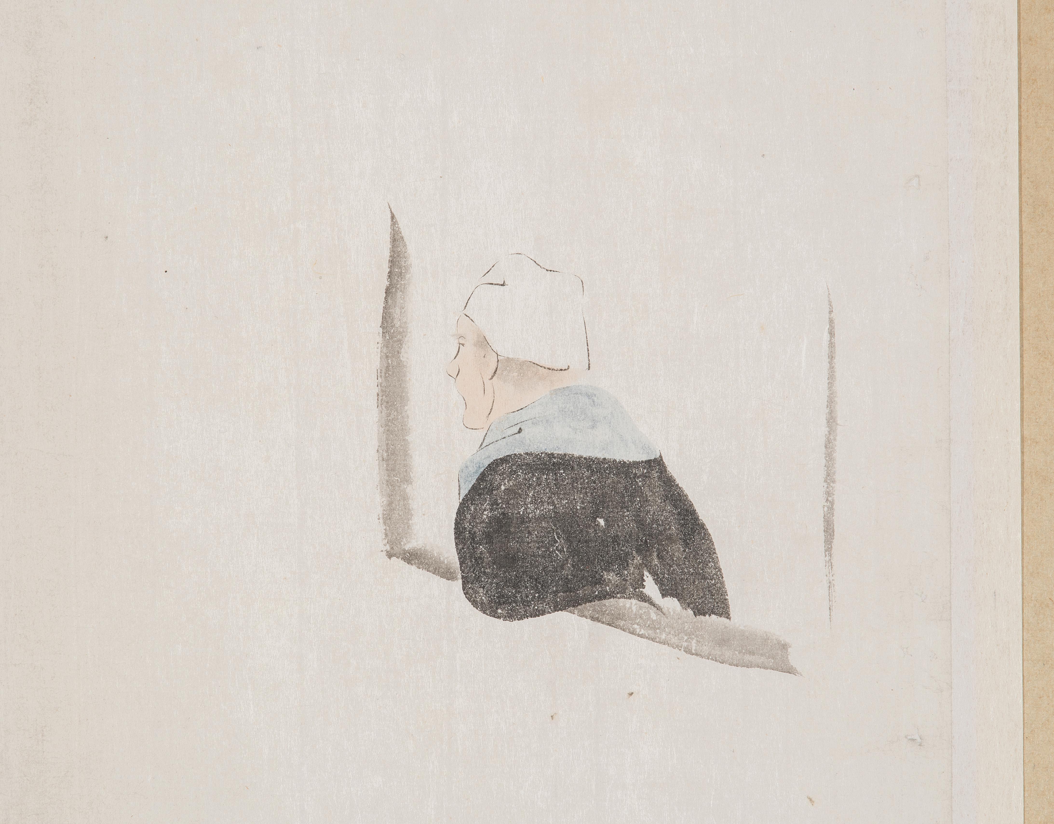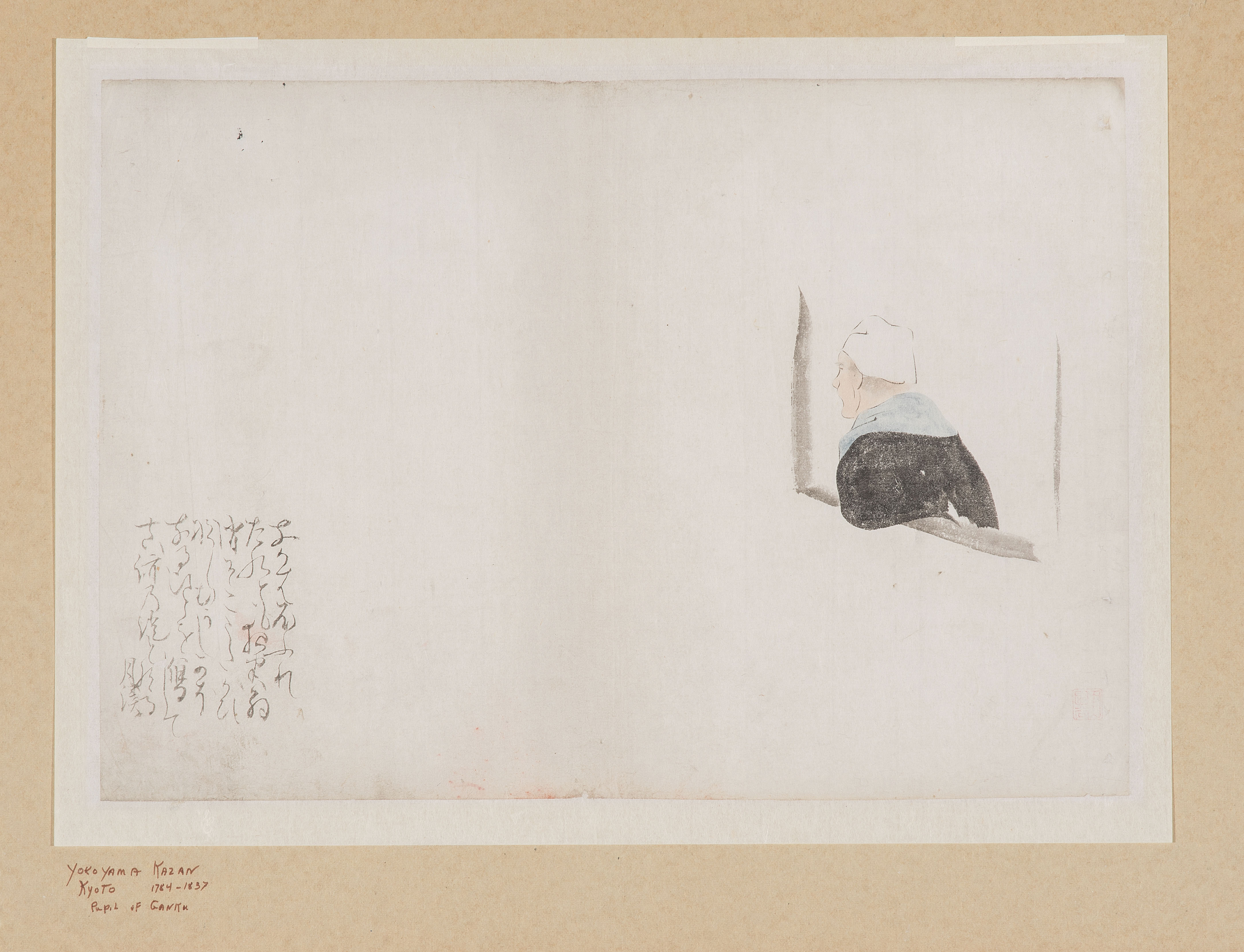 Tusche und Farbe auf Papier. Ein Teemeister, der seinen Kopf aus der Öffnung hält. Unten Links Tanka-Gedicht und signiert Gekkei. Rechts mit rotem Stempel. 28x40cm. - Oben montiert. Auf Papier hinterlegt.