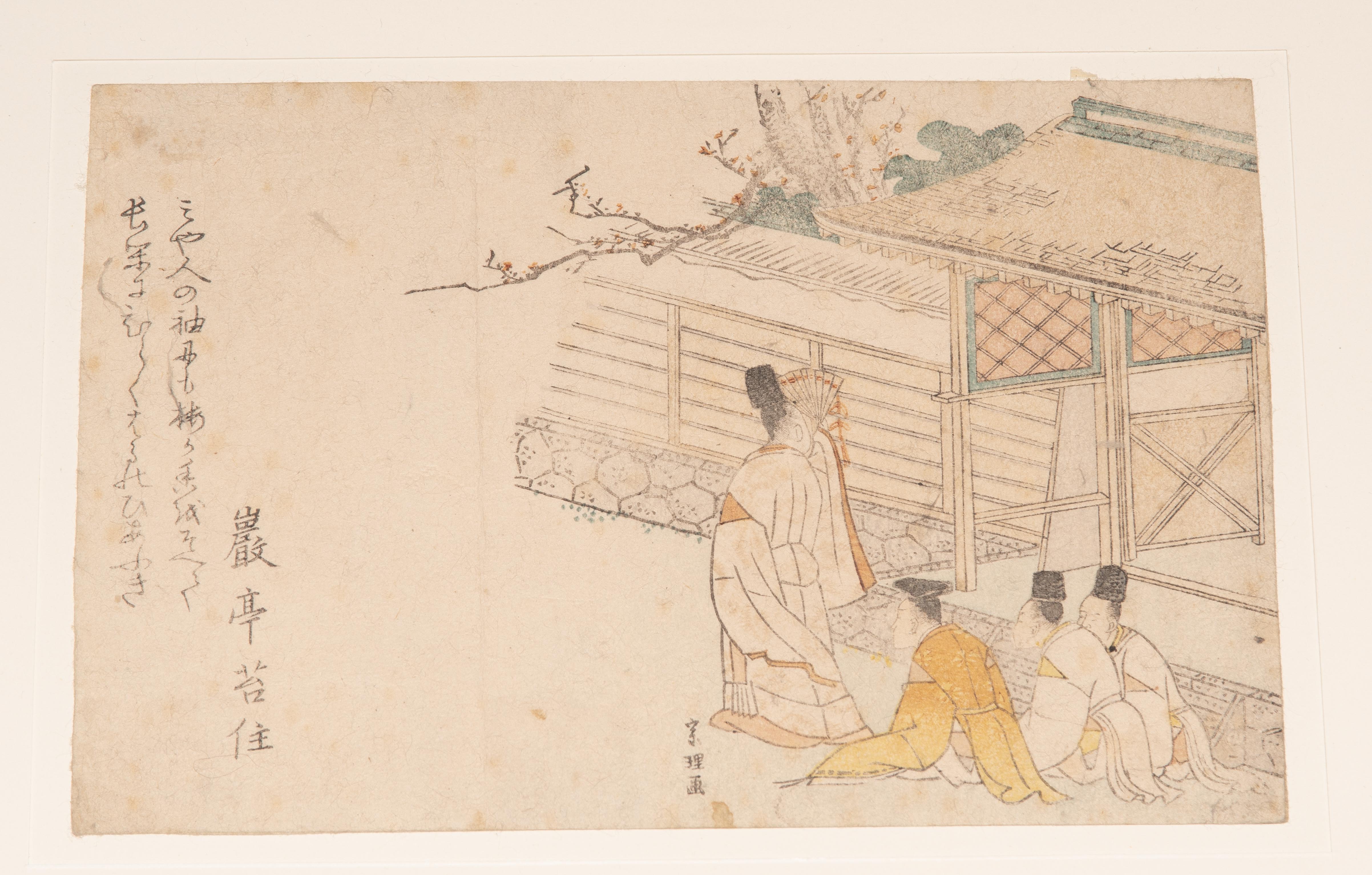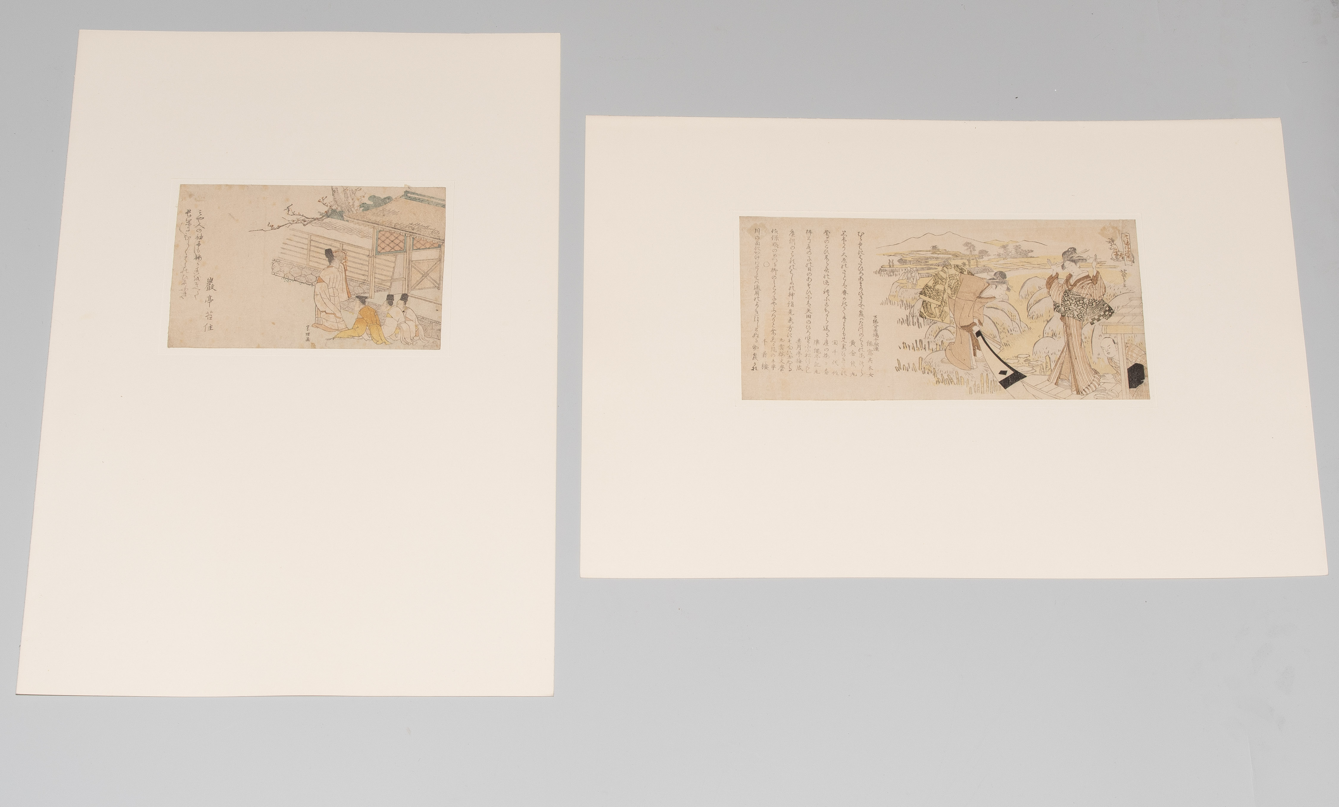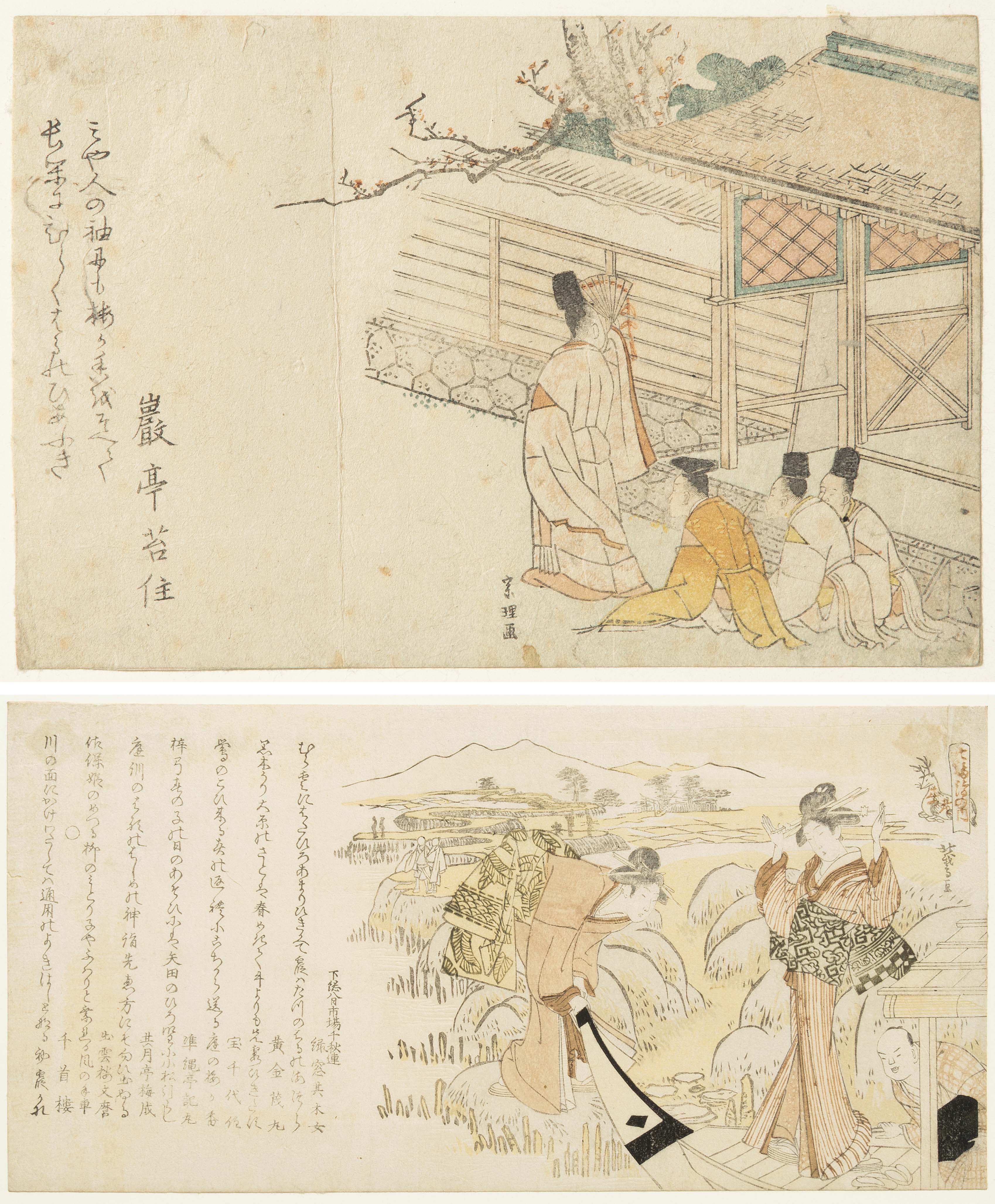 Japan, 19.Jh. Heimliche Besuchsszene mit Haiku von Gantei. Signiert. 19x13 cm. - Oben montiert, Farbverlust, stockfleckig. / Kurtisane auf Boot. Signiert.14x28 cm. - Oben montiert, Farbverlust, vergilbt.
