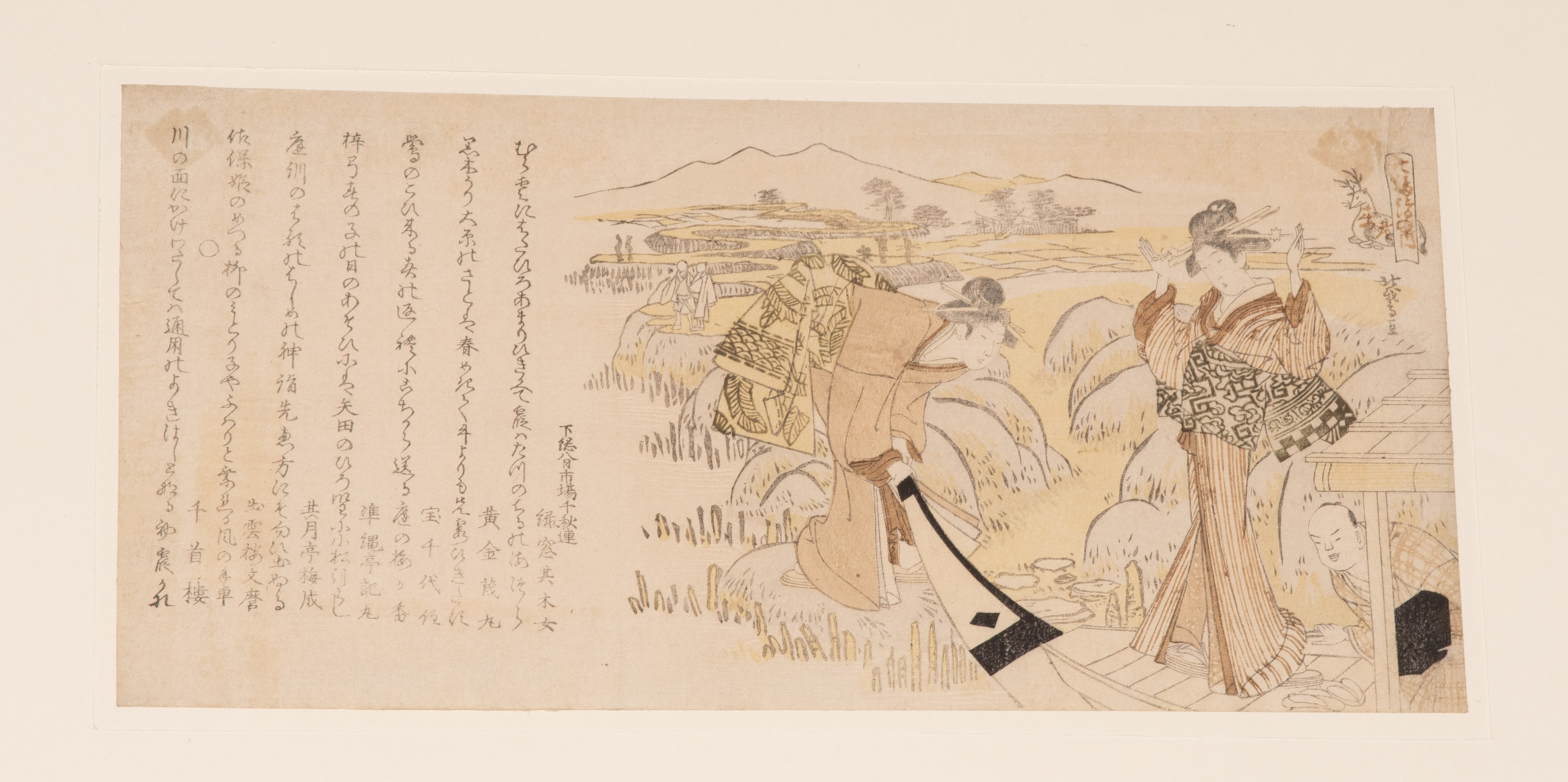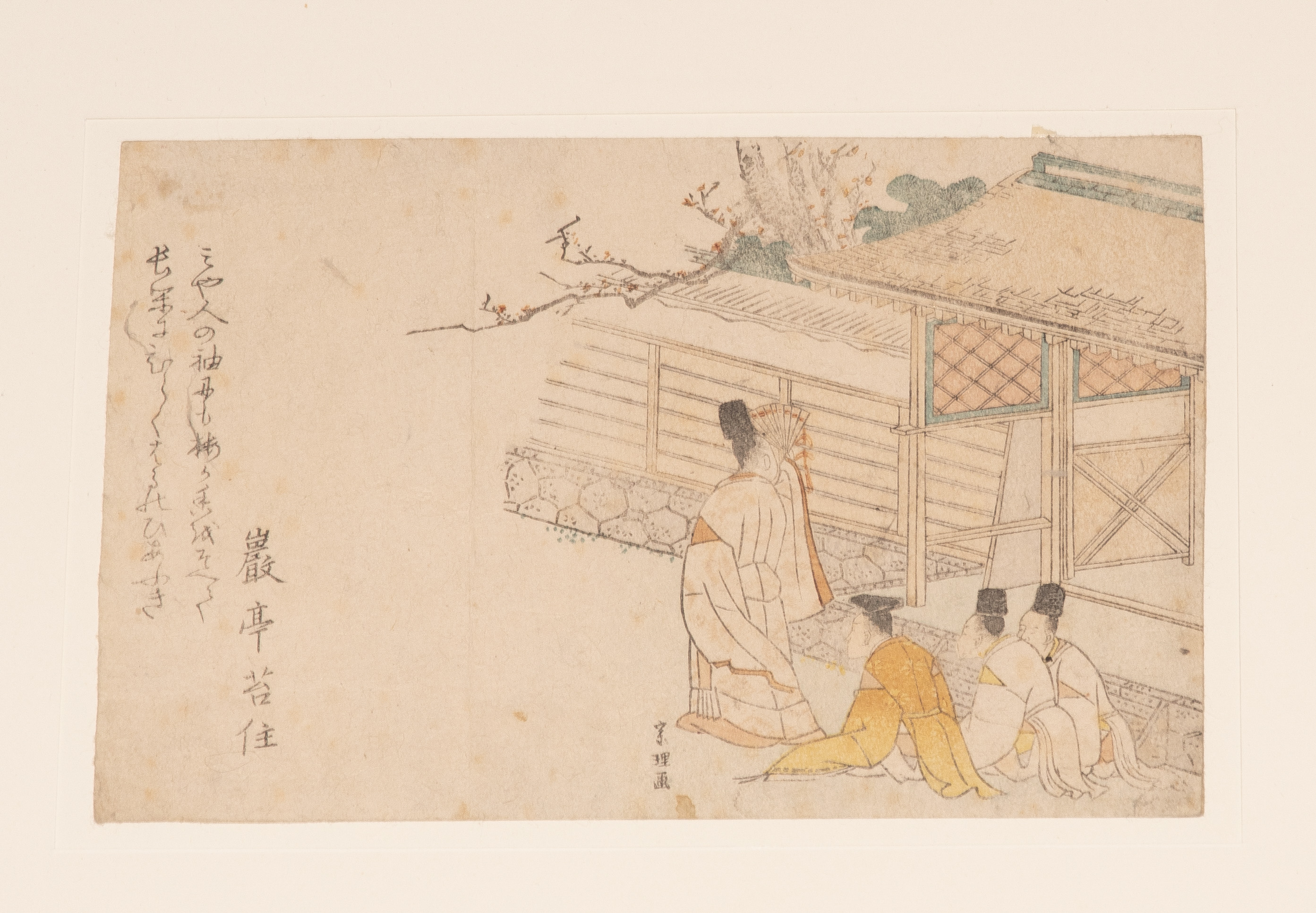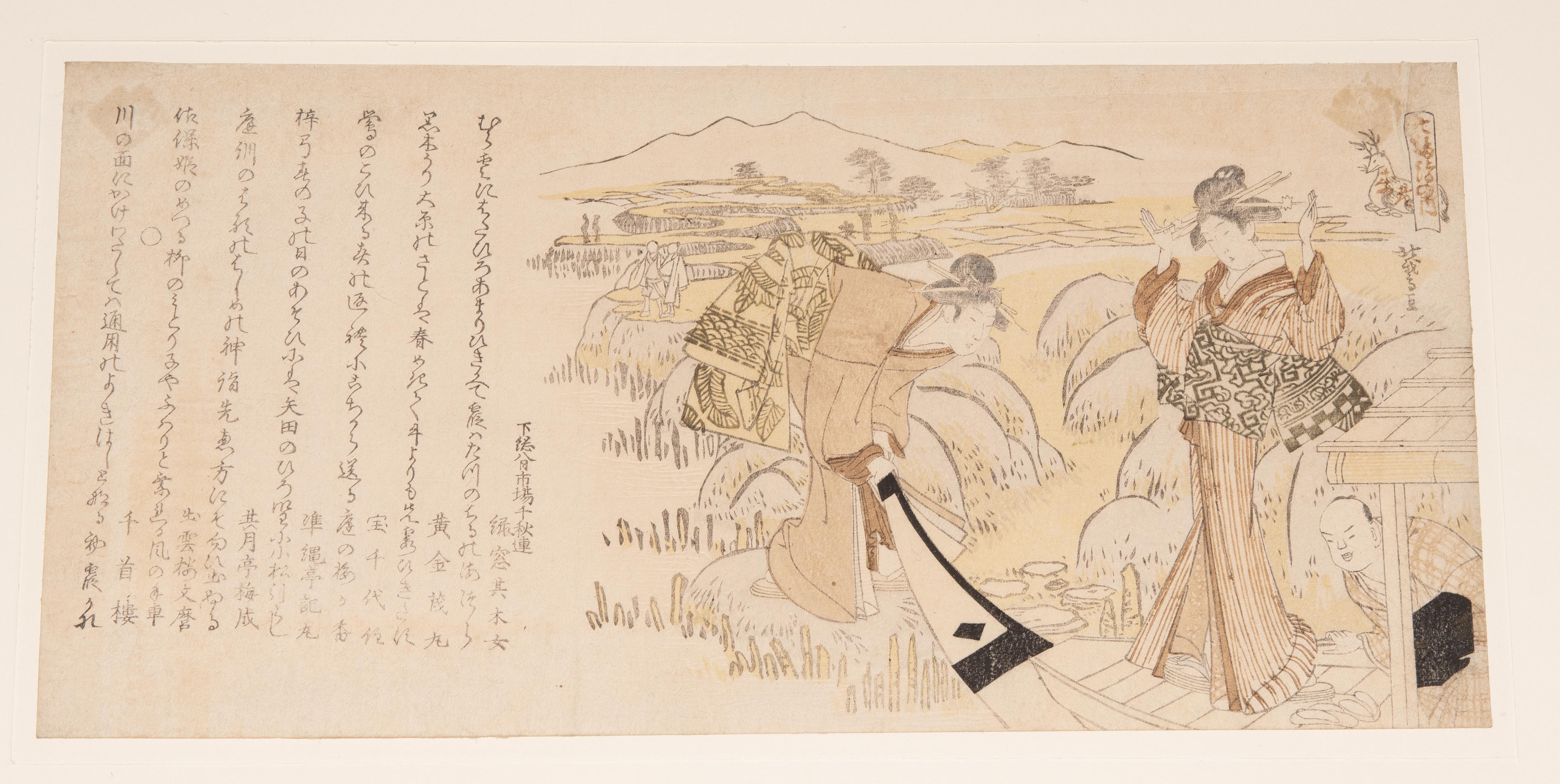 Japan, 19.Jh. Heimliche Besuchsszene mit Haiku von Gantei. Signiert. 19x13 cm. - Oben montiert, Farbverlust, stockfleckig. / Kurtisane auf Boot. Signiert.14x28 cm. - Oben montiert, Farbverlust, vergilbt.