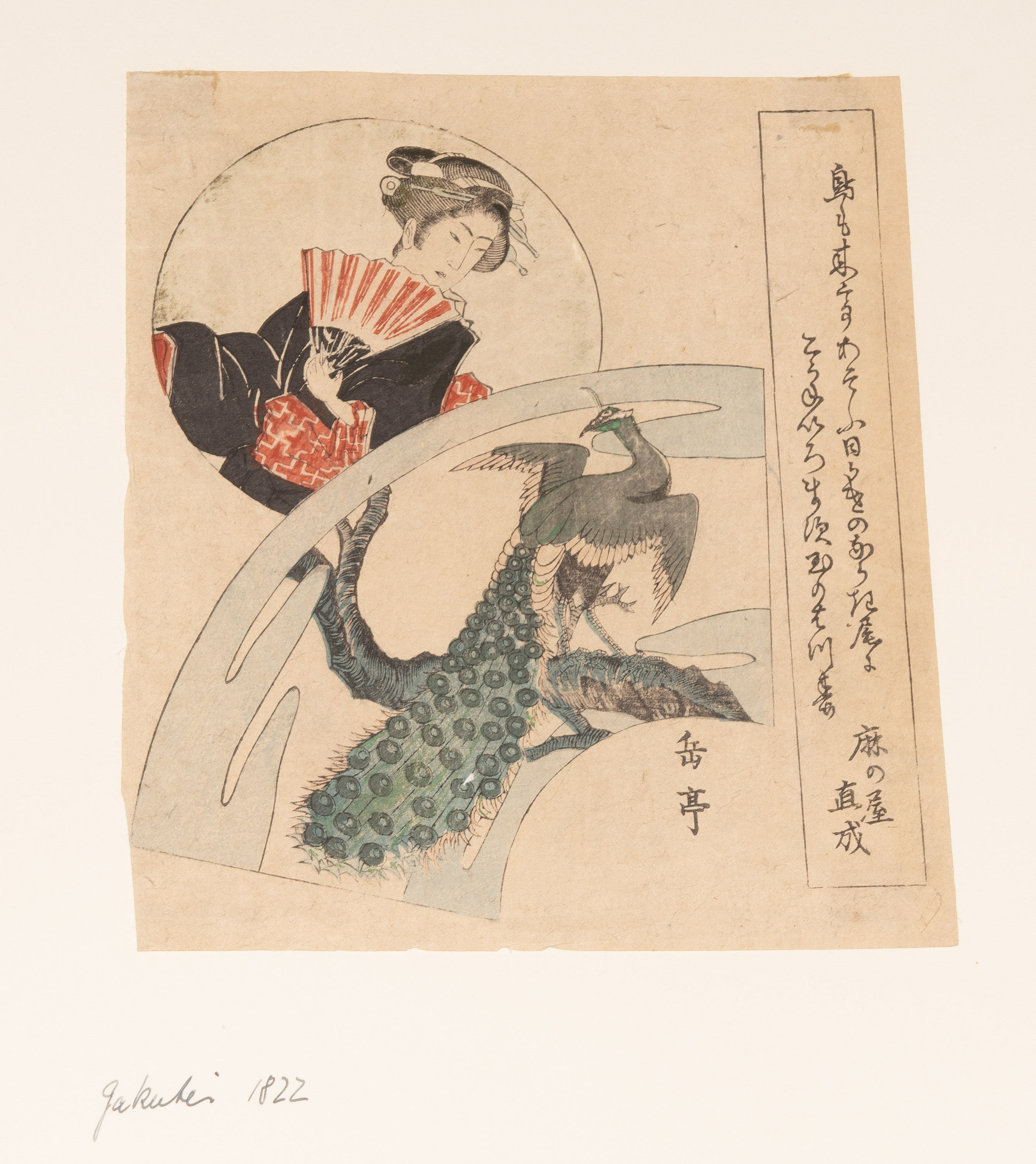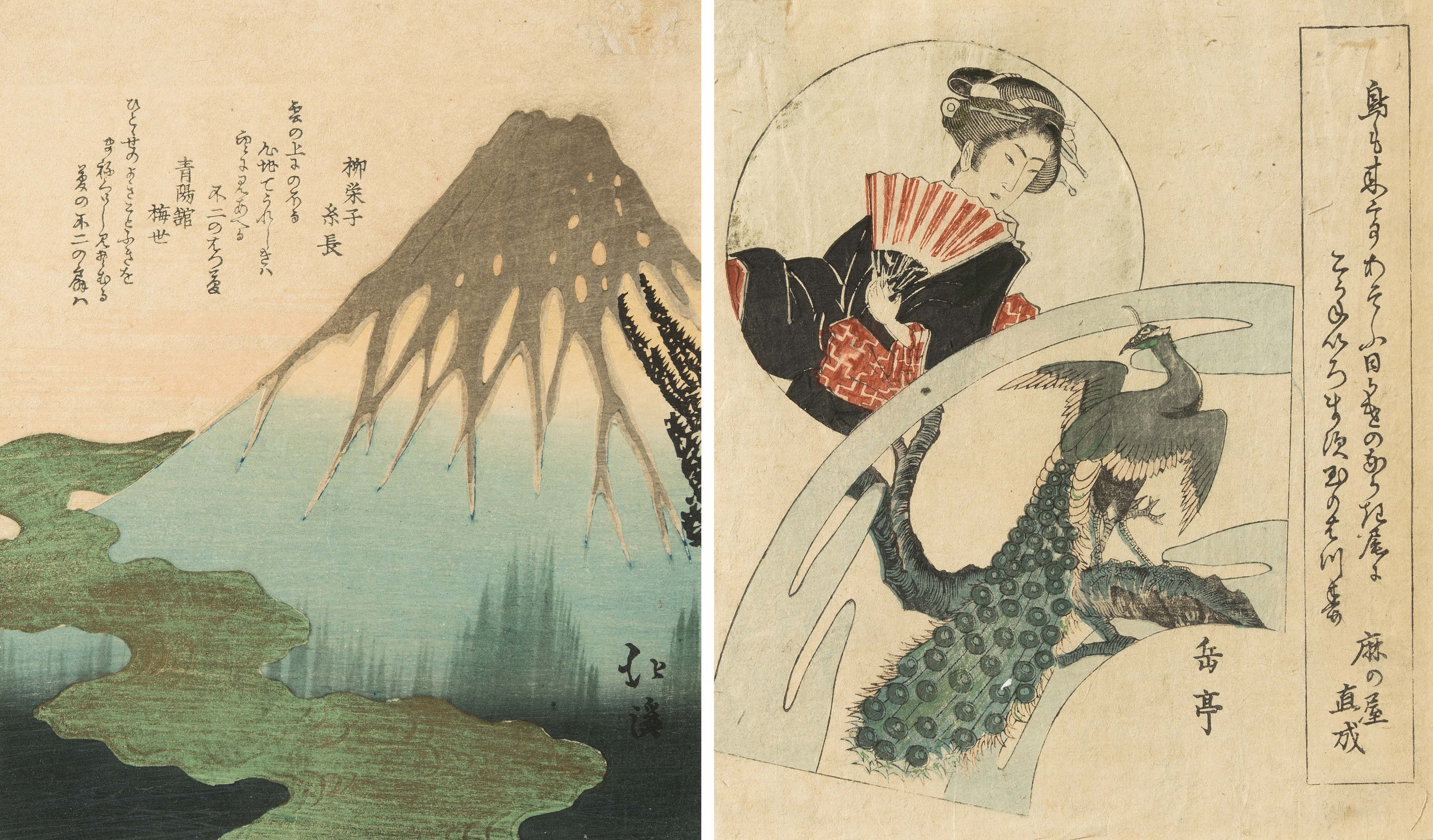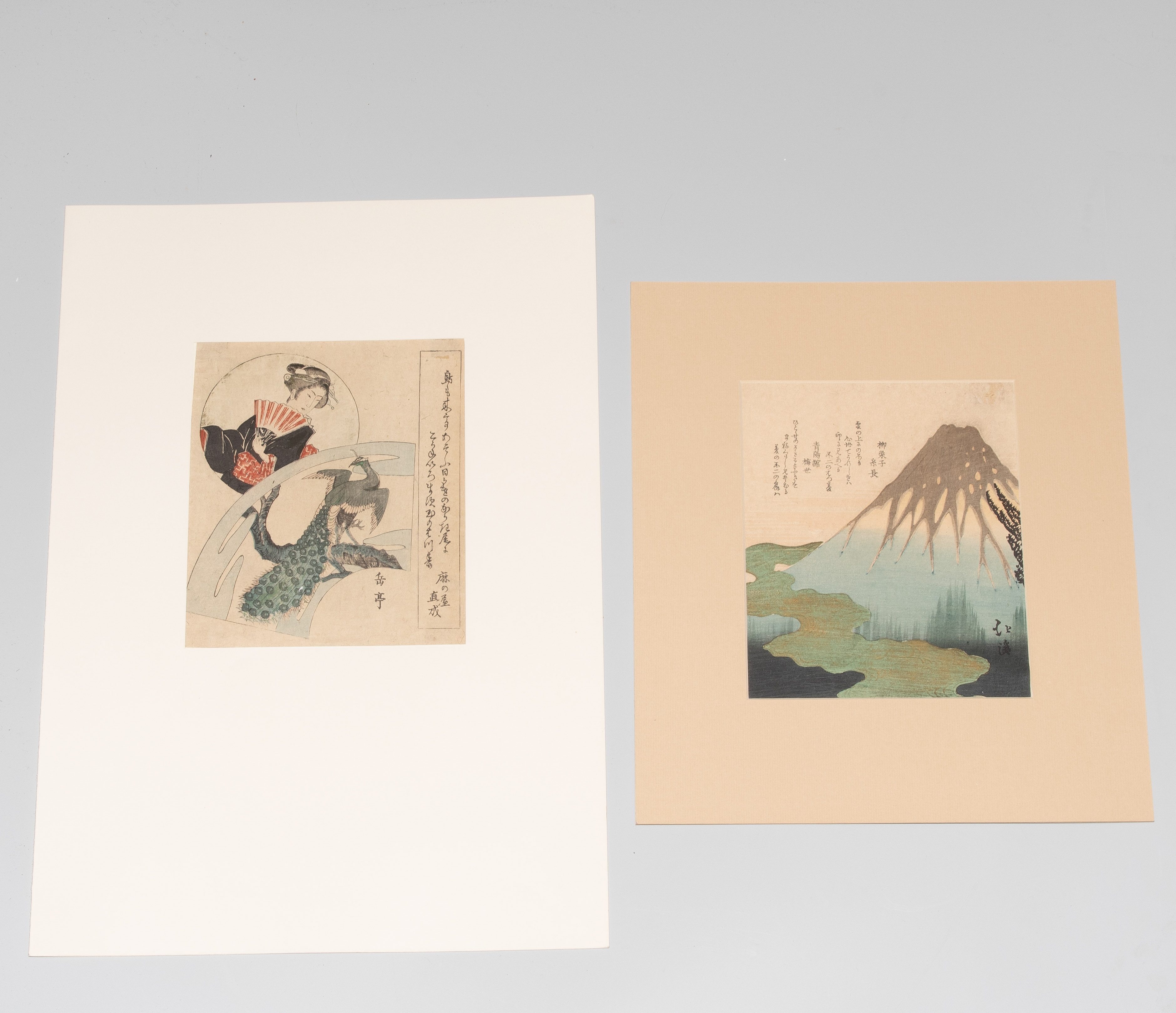 Totoya Hokkei (1780–1850), Nach. Ende 19.Jh. Neujahrs-surimono. Fuji-Berg über den Wolken. 21,6x17,9 cm. - Oben montiert. / Yashima Gakutei (1786–1868). Kurtisane und Pfau, aus der Serie Honchôren jûban tsuzuki mit dem Gedicht von Asanoya Naonari. Späte Ausgaben, wahrscheinlich Ende 19.Jh. - Montiert. 21x18 cm.